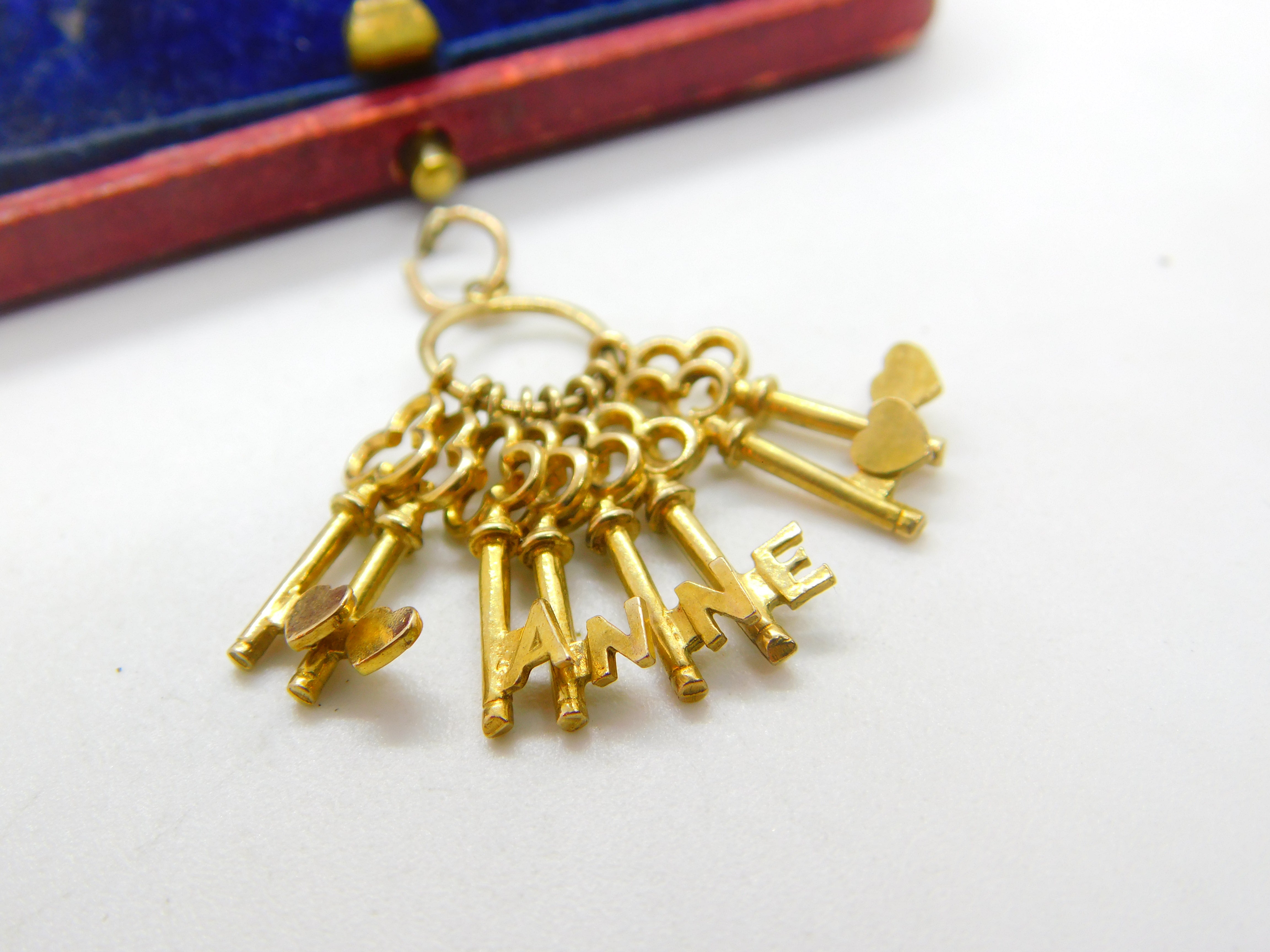 Details: A fantastic and wonderfully designed vintage 9ct yellow gold bunch of keys charm or pendant spelling the name Anne with hearts to the edges hallmarked Birmingham 1971. This is a wonderful item that would make a perfect gift or addition to any collection. The BOX pictured is for PRESENTATION ONLY and is NOT included in the listings but used to frame the pictures unless specifically stated otherwise.
