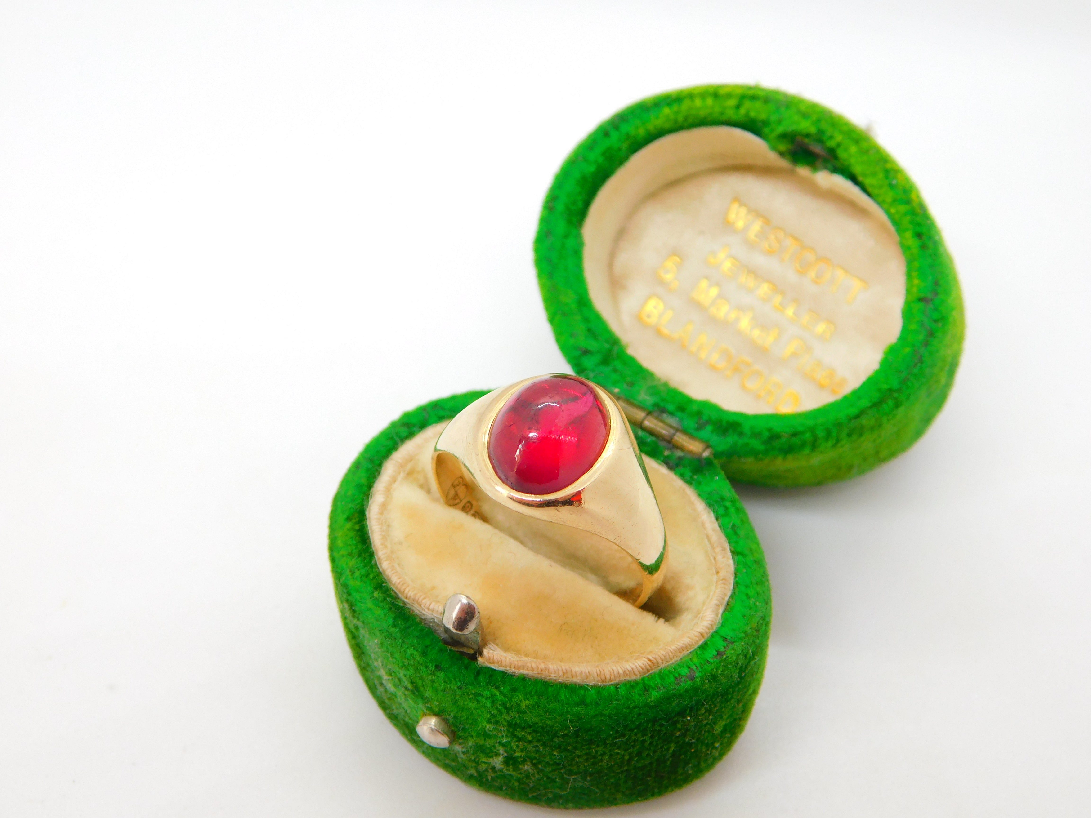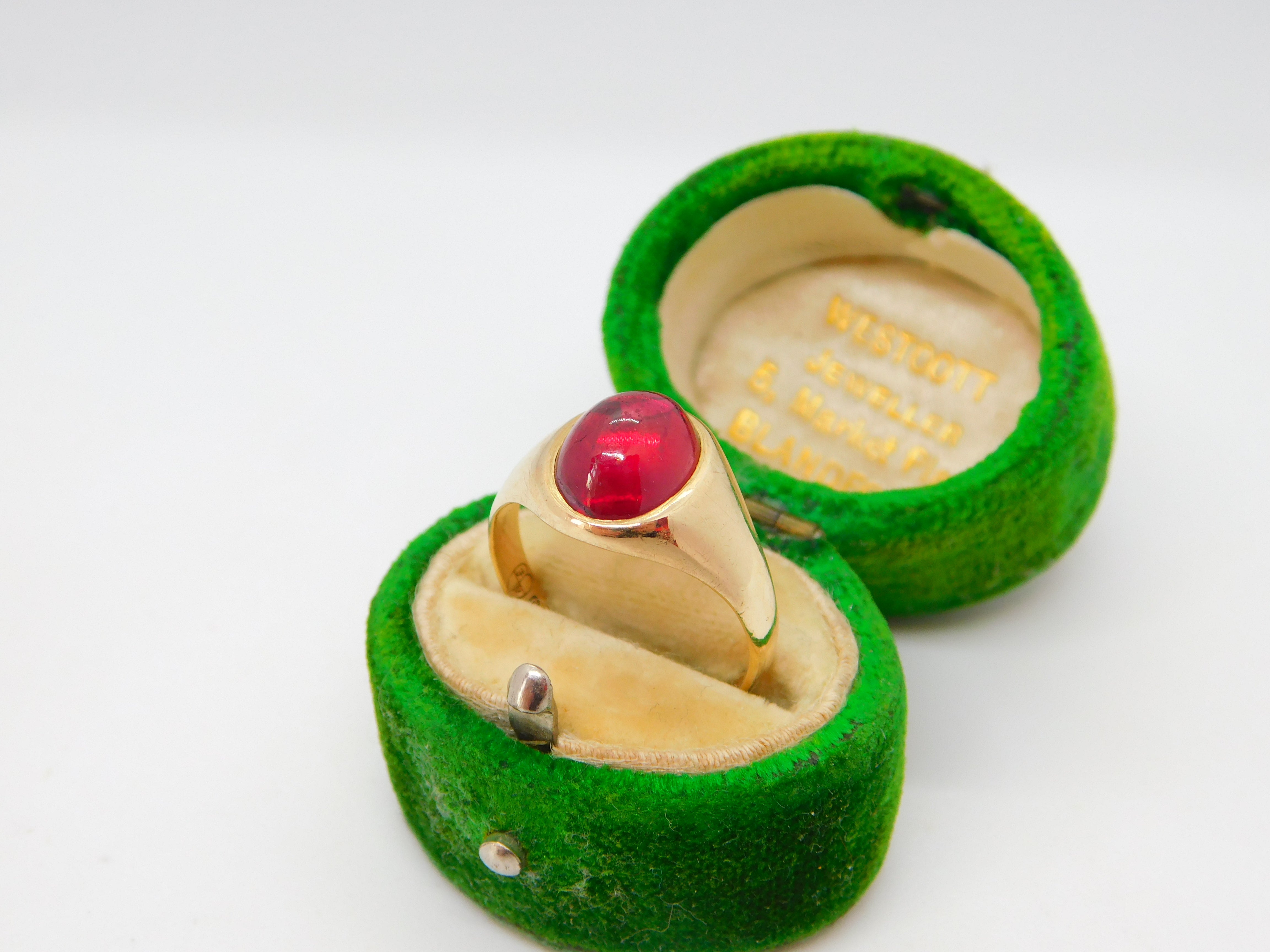 Details: A fantastic and wonderfully designed vintage 9ct yellow gold signet ring set with charming 2ct cabochon cut natural ruby stone hallmarked London 1964 to the interior. The ruby has been tested. This is a wonderful item that would make a perfect gift or addition to any collection. The BOX pictured is for PRESENTATION ONLY and is NOT included in the listings but used to frame the pictures unless specifically stated otherwise.