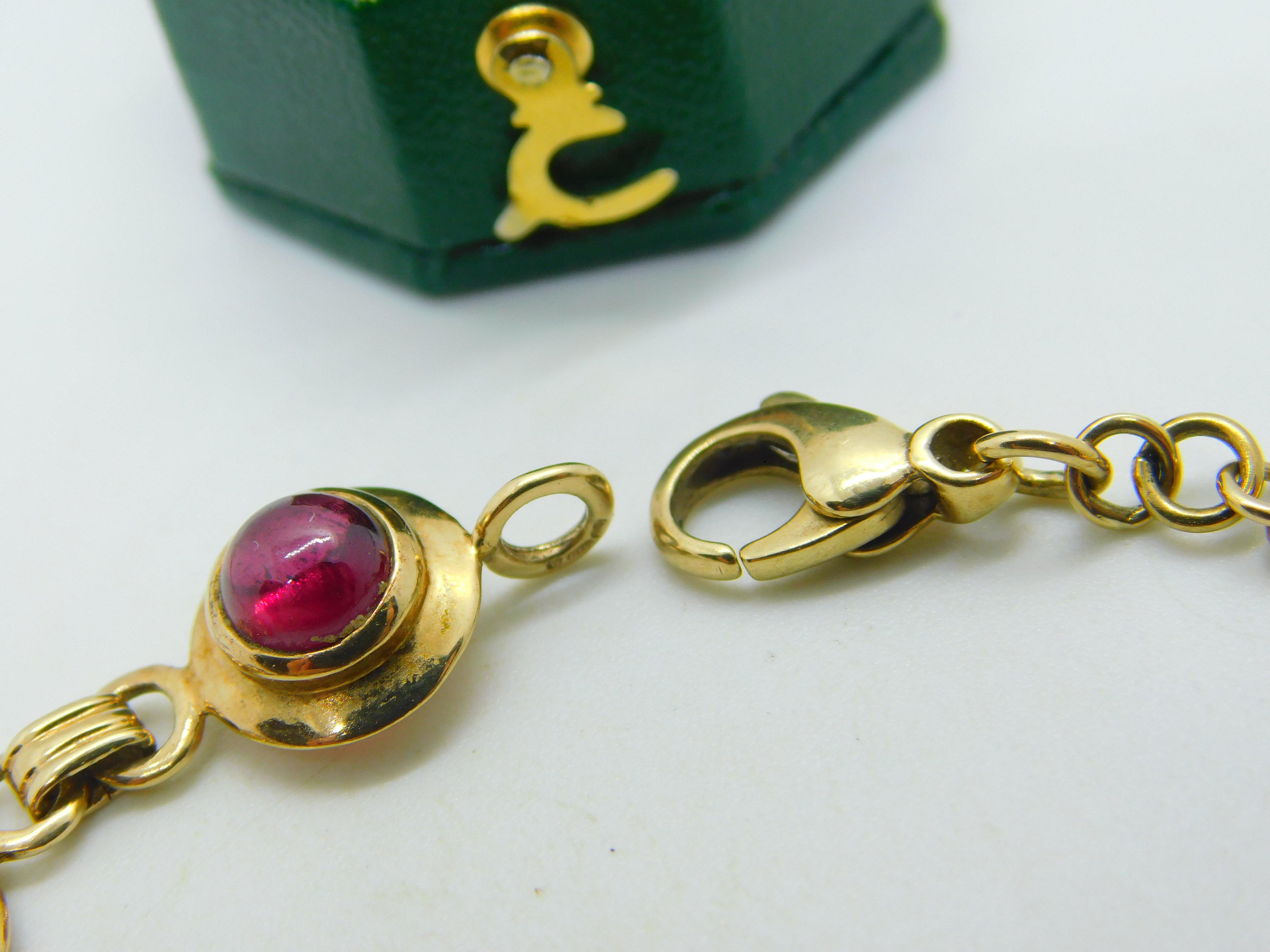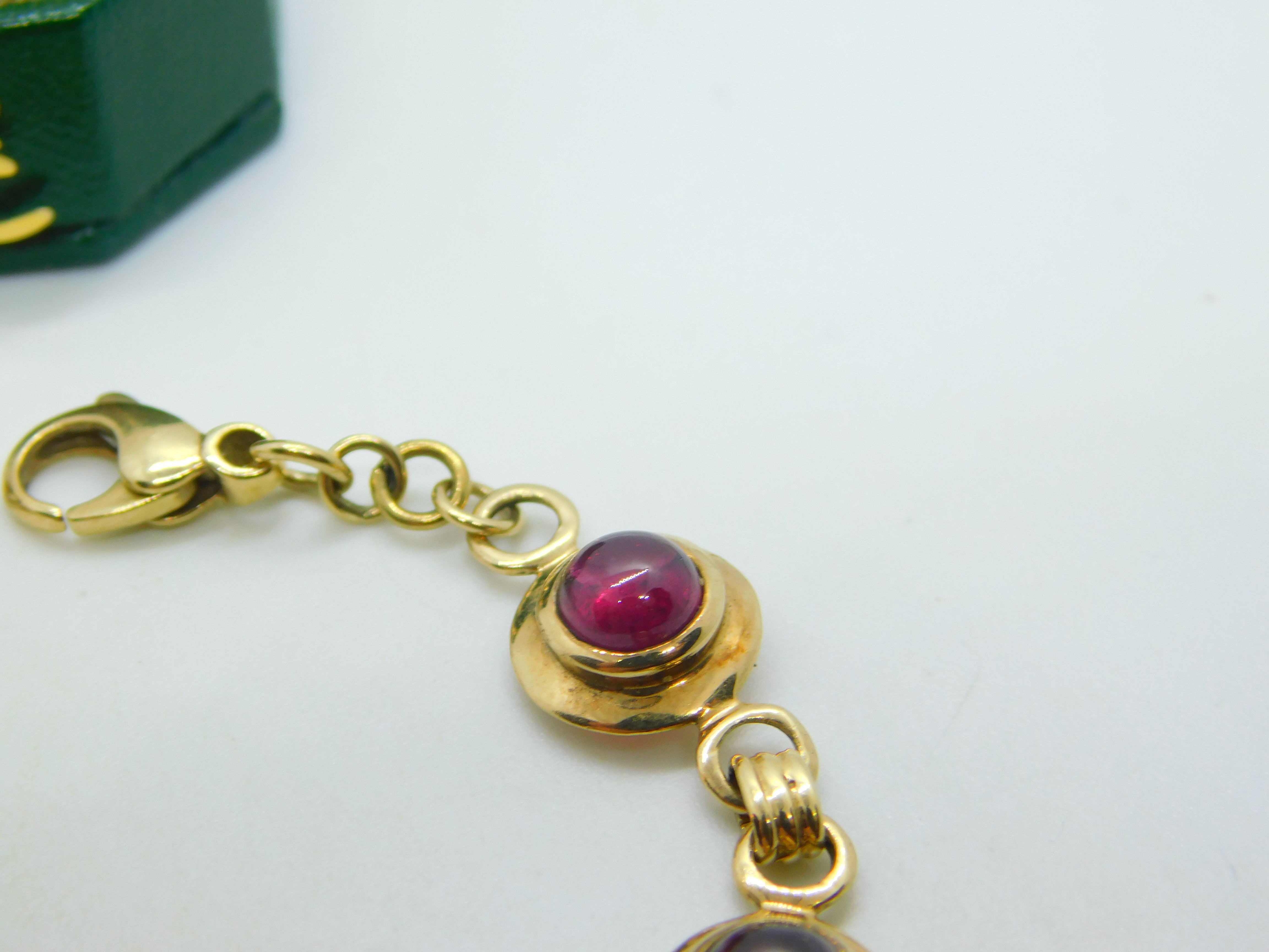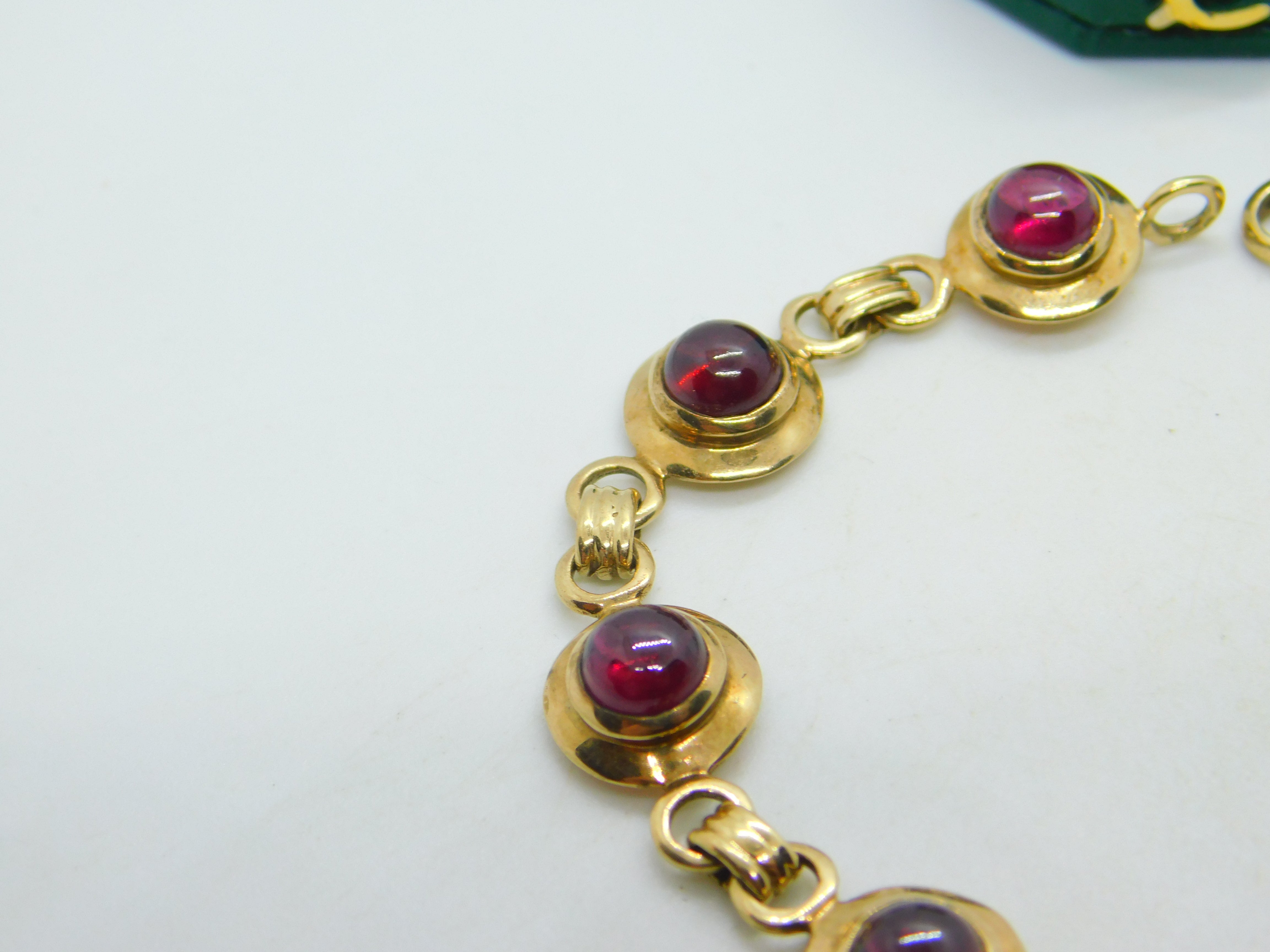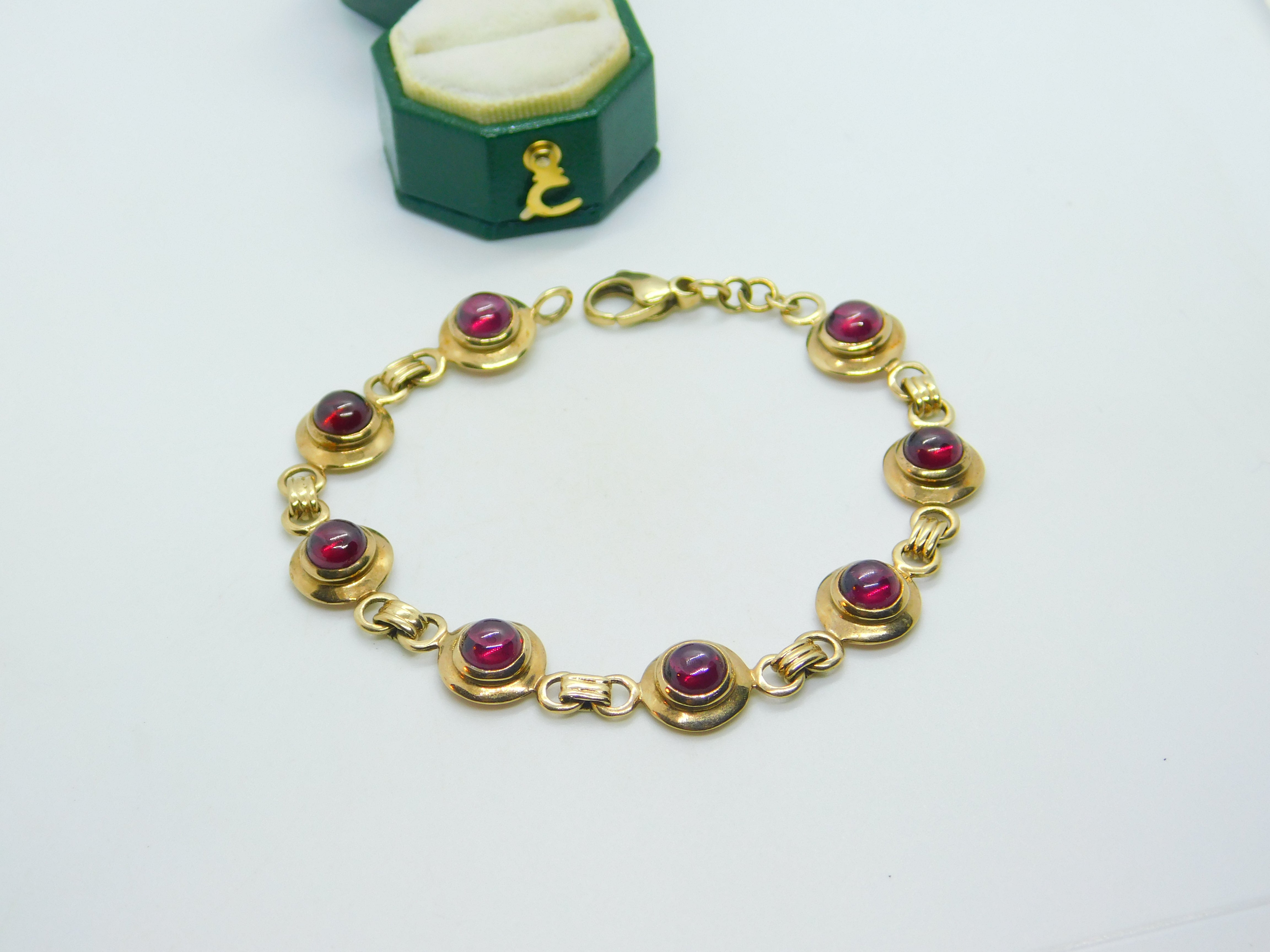 Details: A fantastic and wonderfully designed vintage 9ct yellow gold circular panel bracelet set with cabochon almandine garnet stones hallmarked to the bale c1970. This is a wonderful item that would make a perfect gift or addition to any collection. The BOX pictured is for PRESENTATION ONLY and is NOT included in the listings but used to frame the pictures unless specifically stated otherwise.