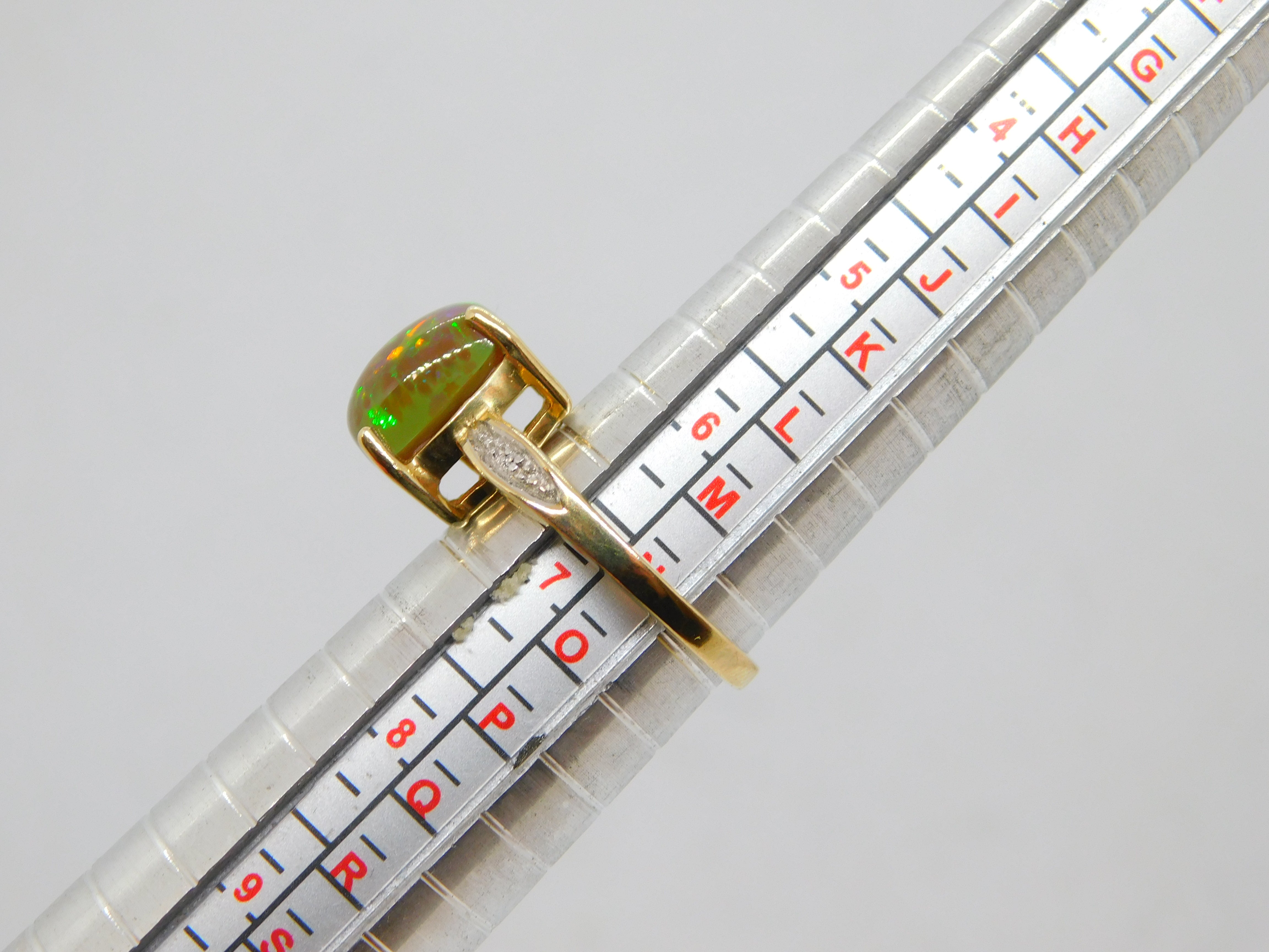 Details: A fantastic and wonderfully designed cabochon green boulder opal with flashes of green, orange and purple with two diamond accents on each shoulder. The diamonds have been tested. This is a wonderful item that would make a perfect gift or addition to any collection. We are more than happy to provide XRF reports for items upon request.