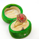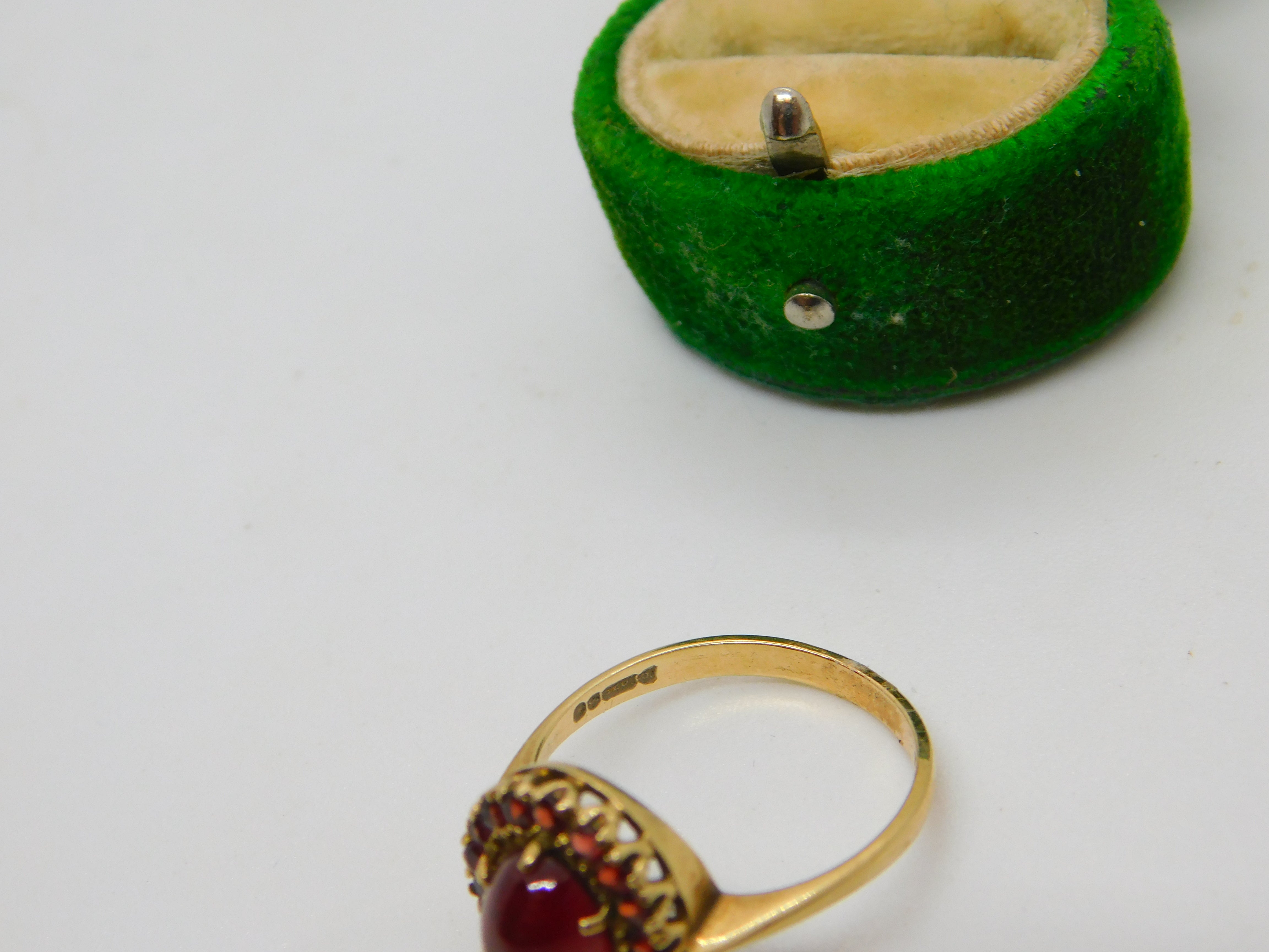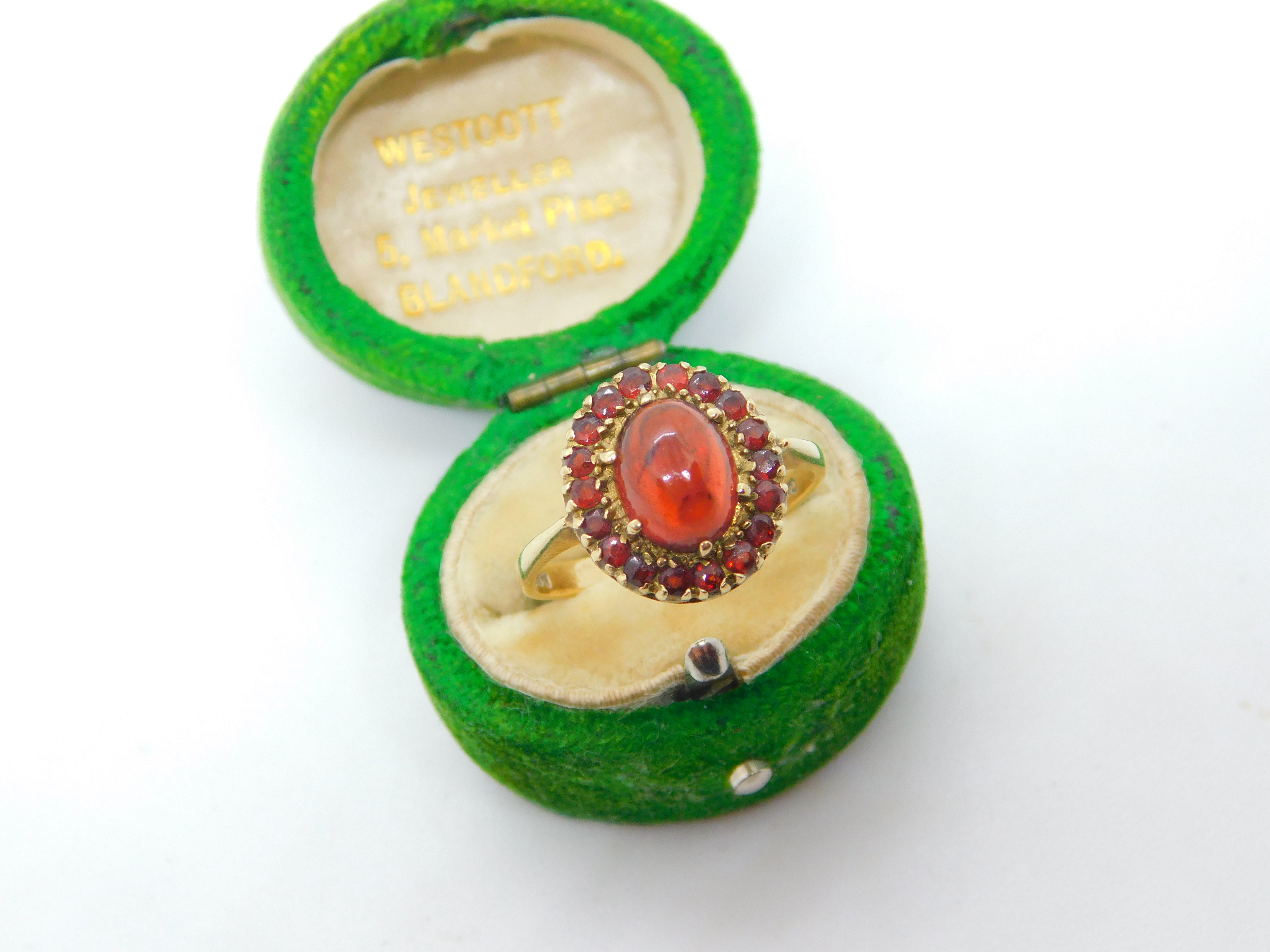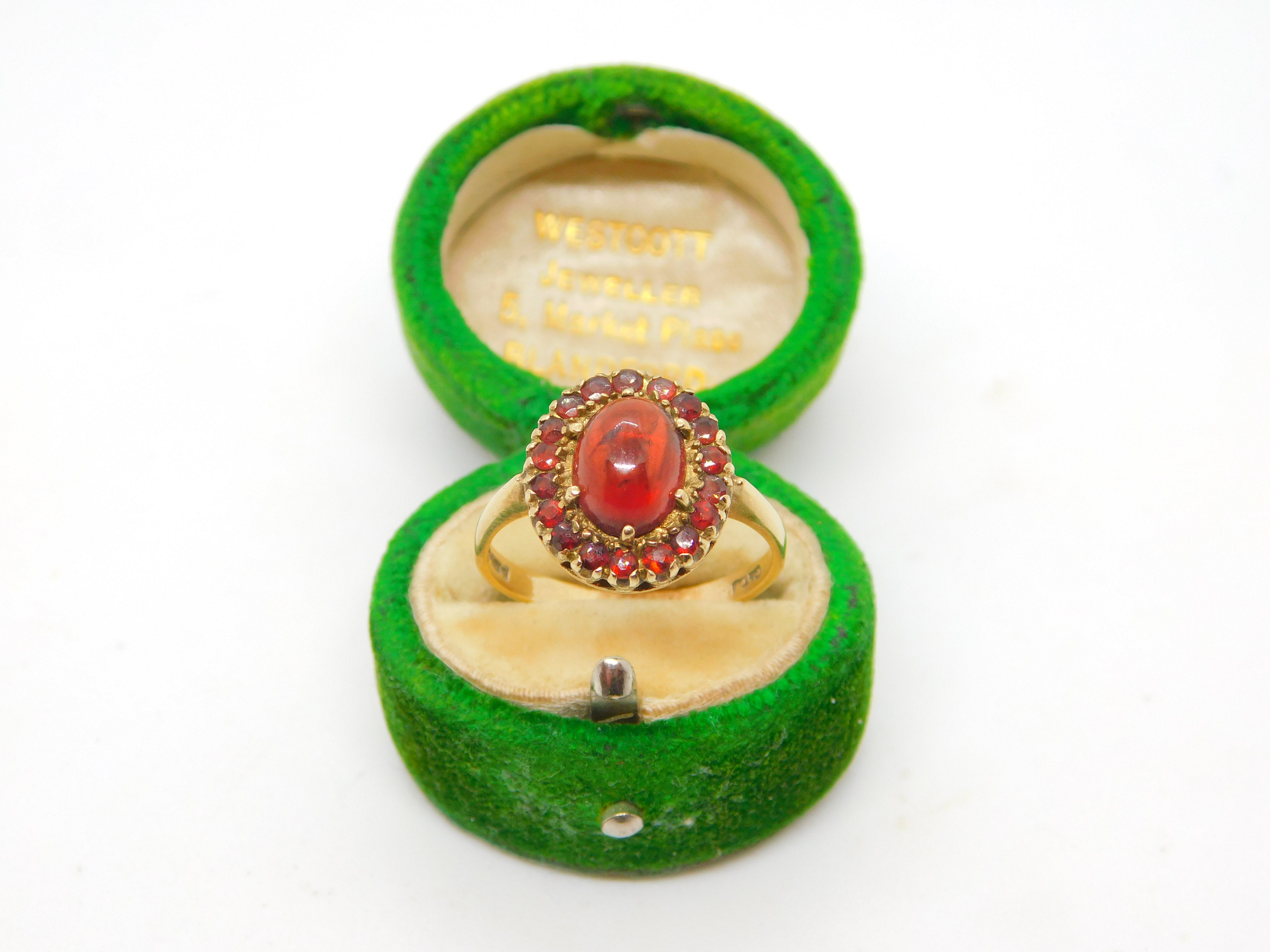 Details: A fantastic and wonderfully designed vintage 9ct yellow gold floral cluster ring set with central cabochon bohemian garnet stone hallmarked Birmingham c1970 to the interior. This is a wonderful item that would make a perfect gift or addition to any collection. The BOX pictured is for PRESENTATION ONLY and is NOT included in the listings but used to frame the pictures unless specifically stated otherwise.