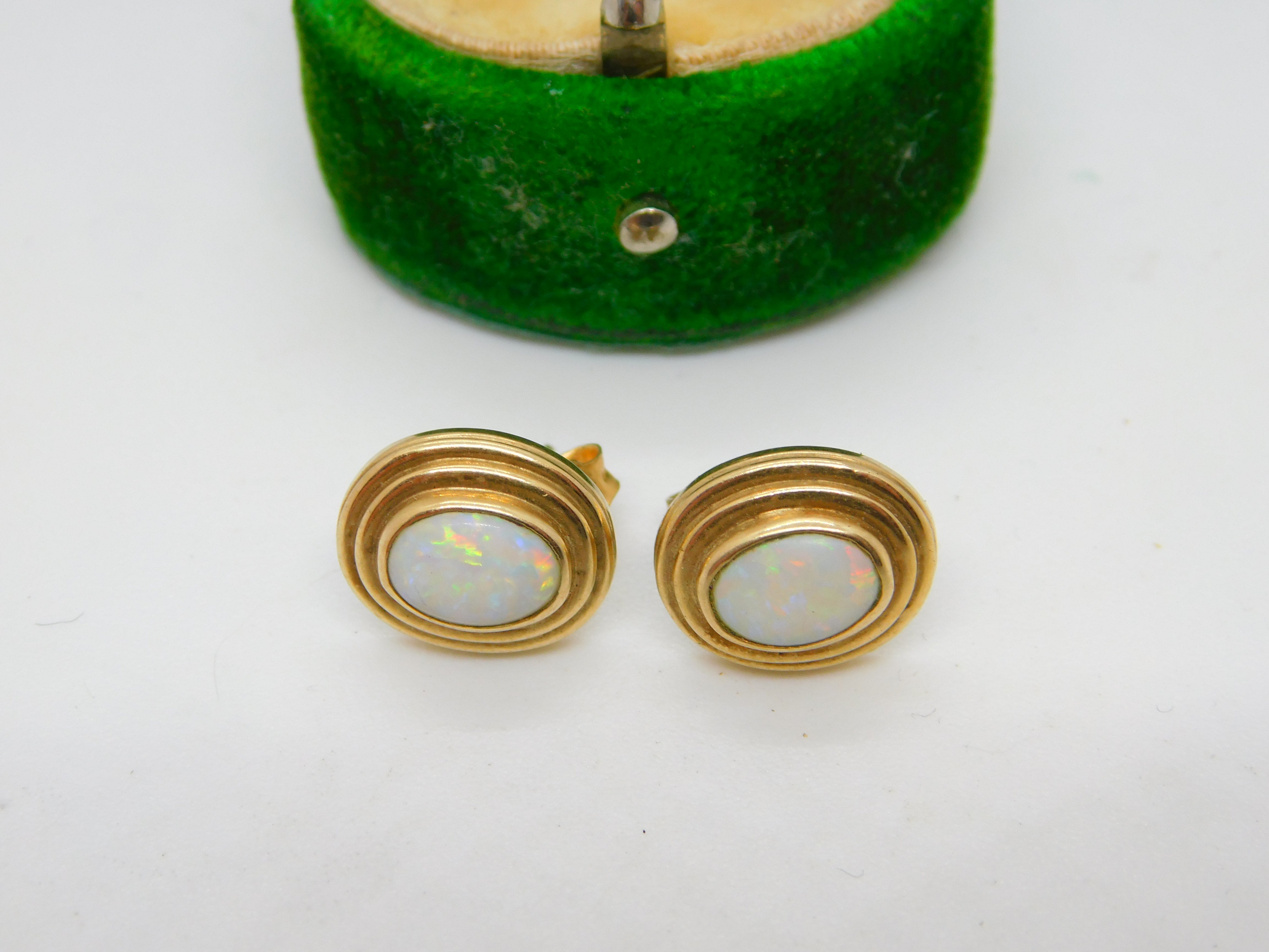 Details: A fantastic and wonderfully designed vintage 9ct yellow gold stud earrings set with cabochon cut opals hallmarked Birmingham c1980 to the edge. This is a wonderful item that would make a perfect gift or addition to any collection. The BOX pictured is for PRESENTATION ONLY and is NOT included in the listings but used to frame the pictures unless specifically stated otherwise.