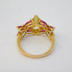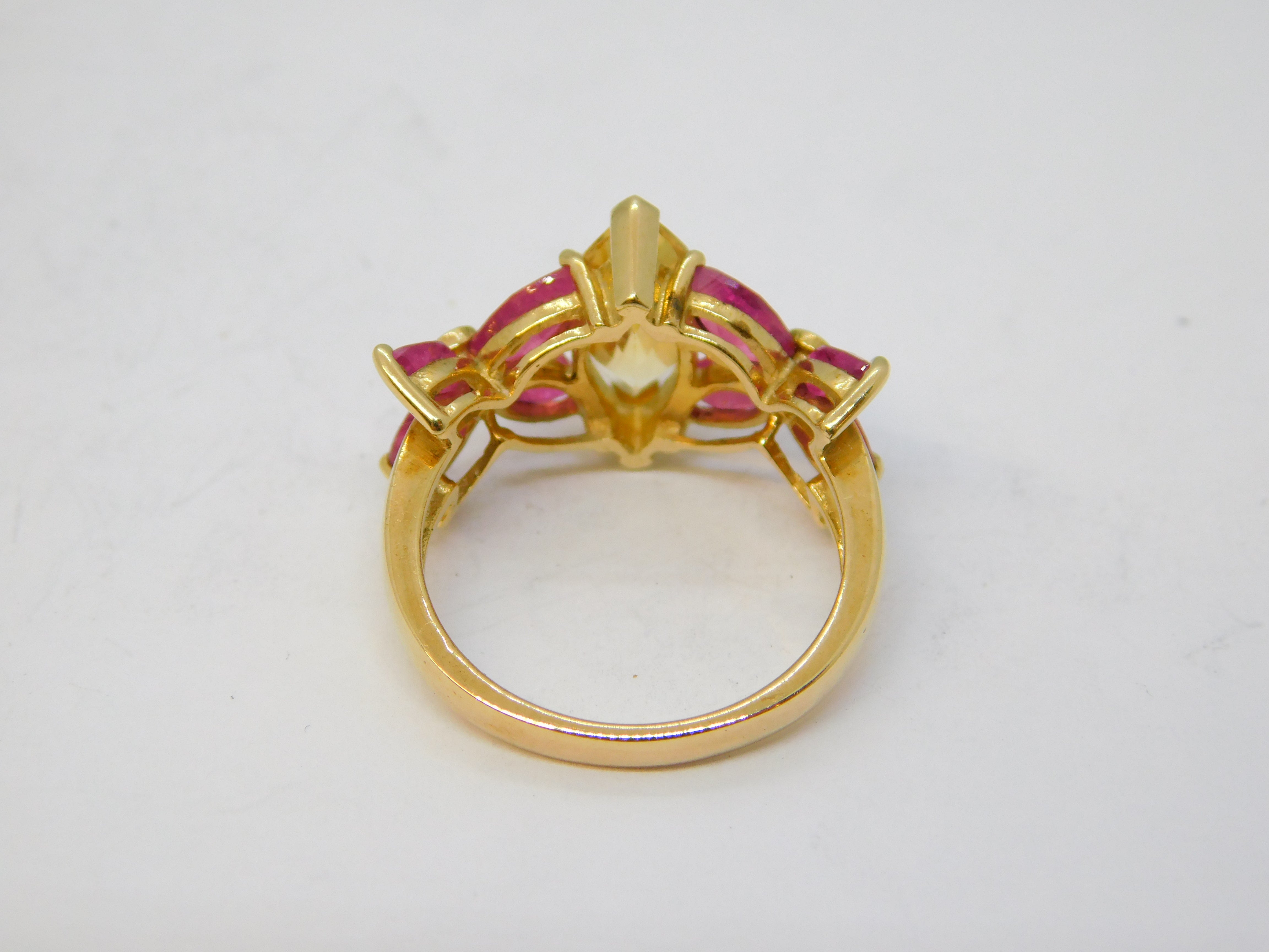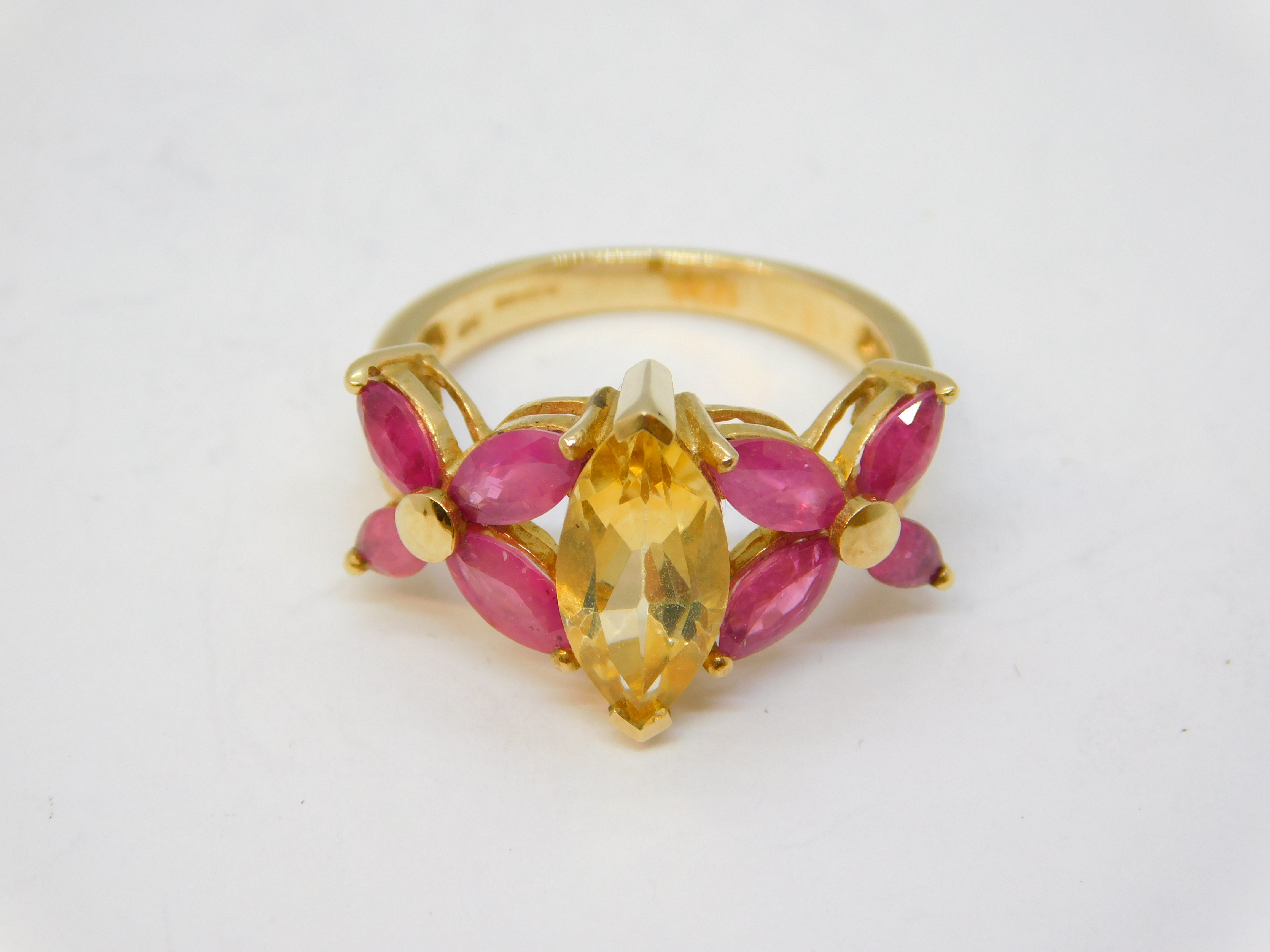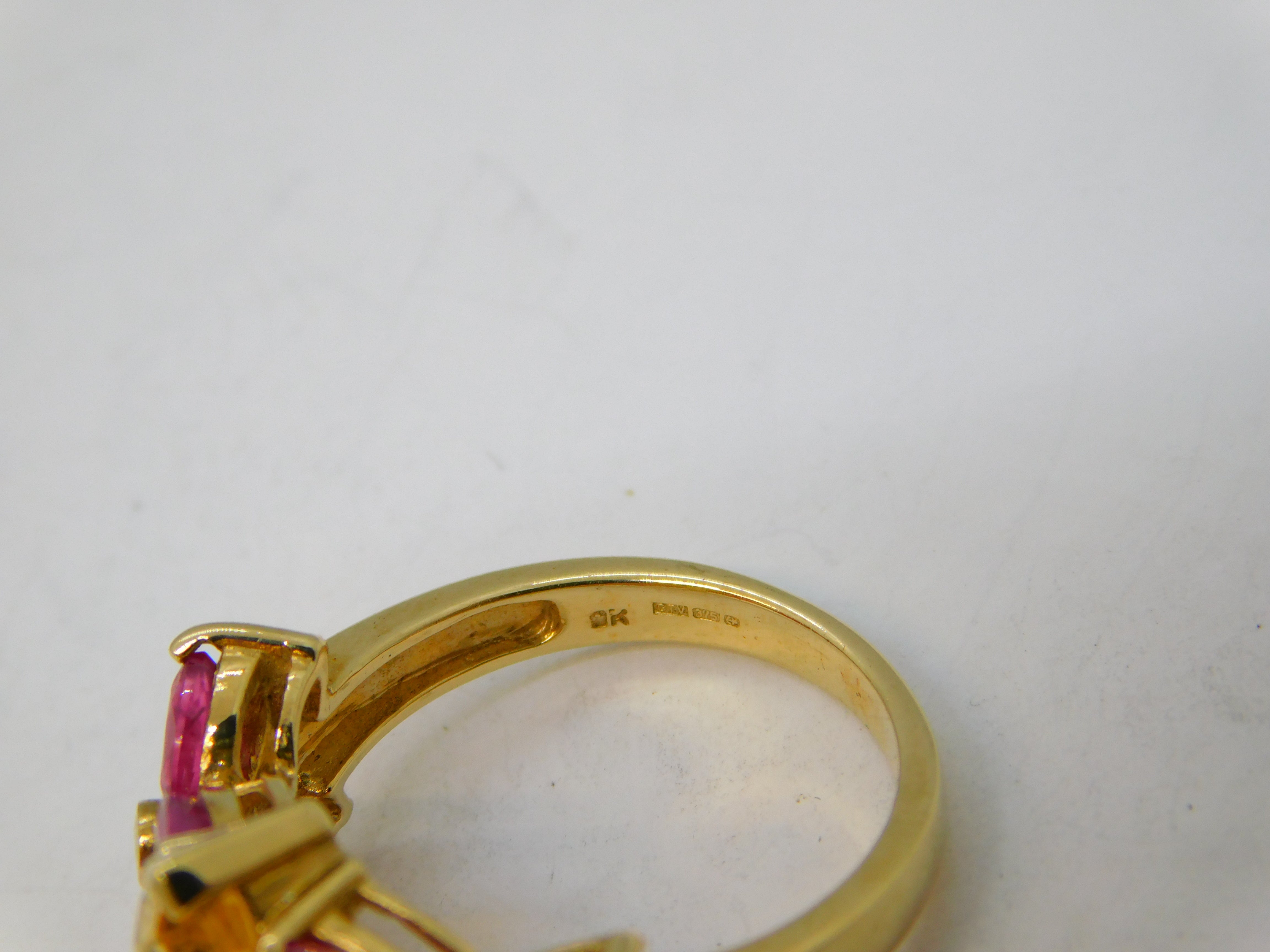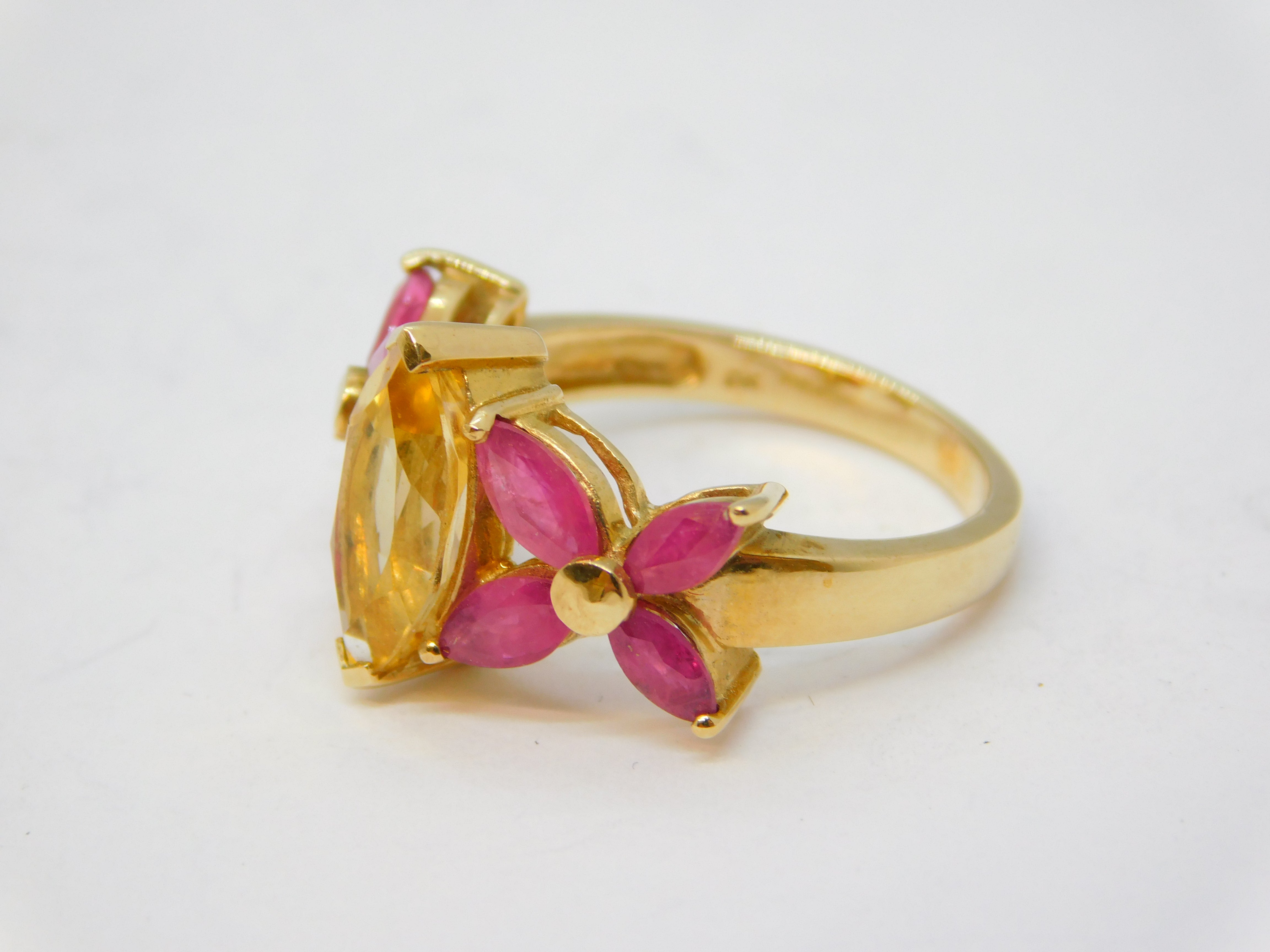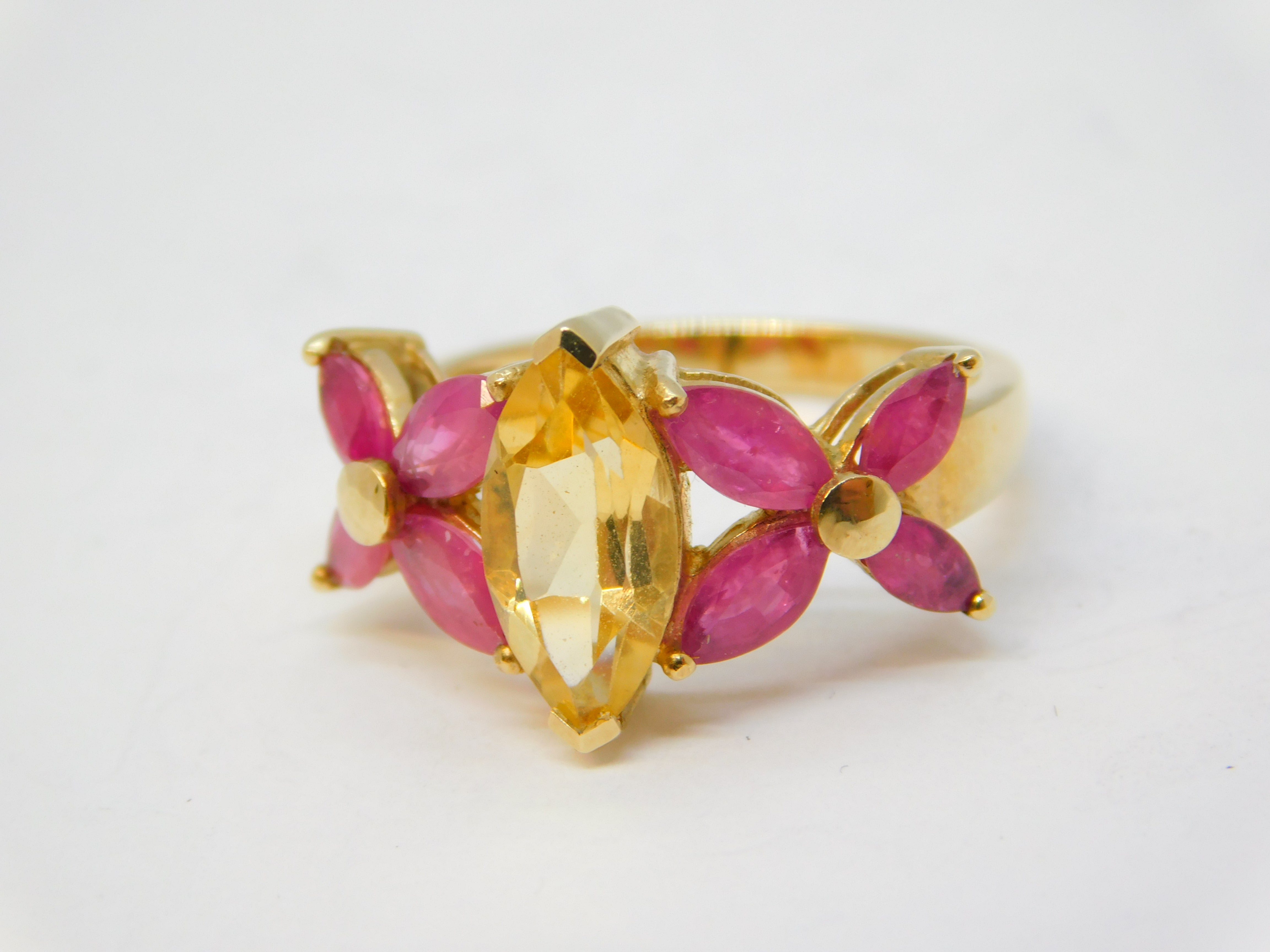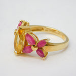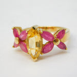 9ct Yellow Gold, Citrine & Ruby Set Floral Dress Ring Vintage c1990 Birmingham