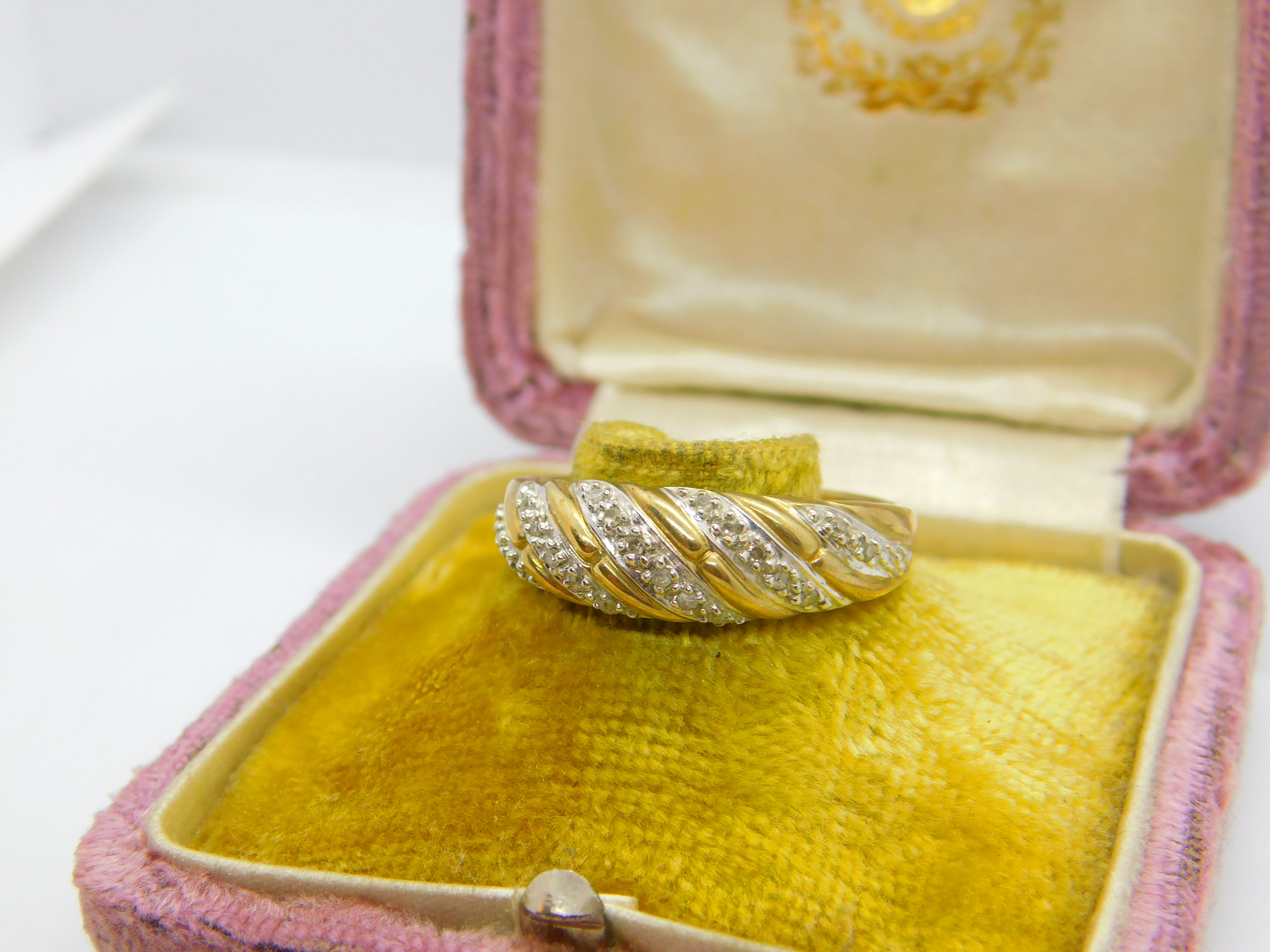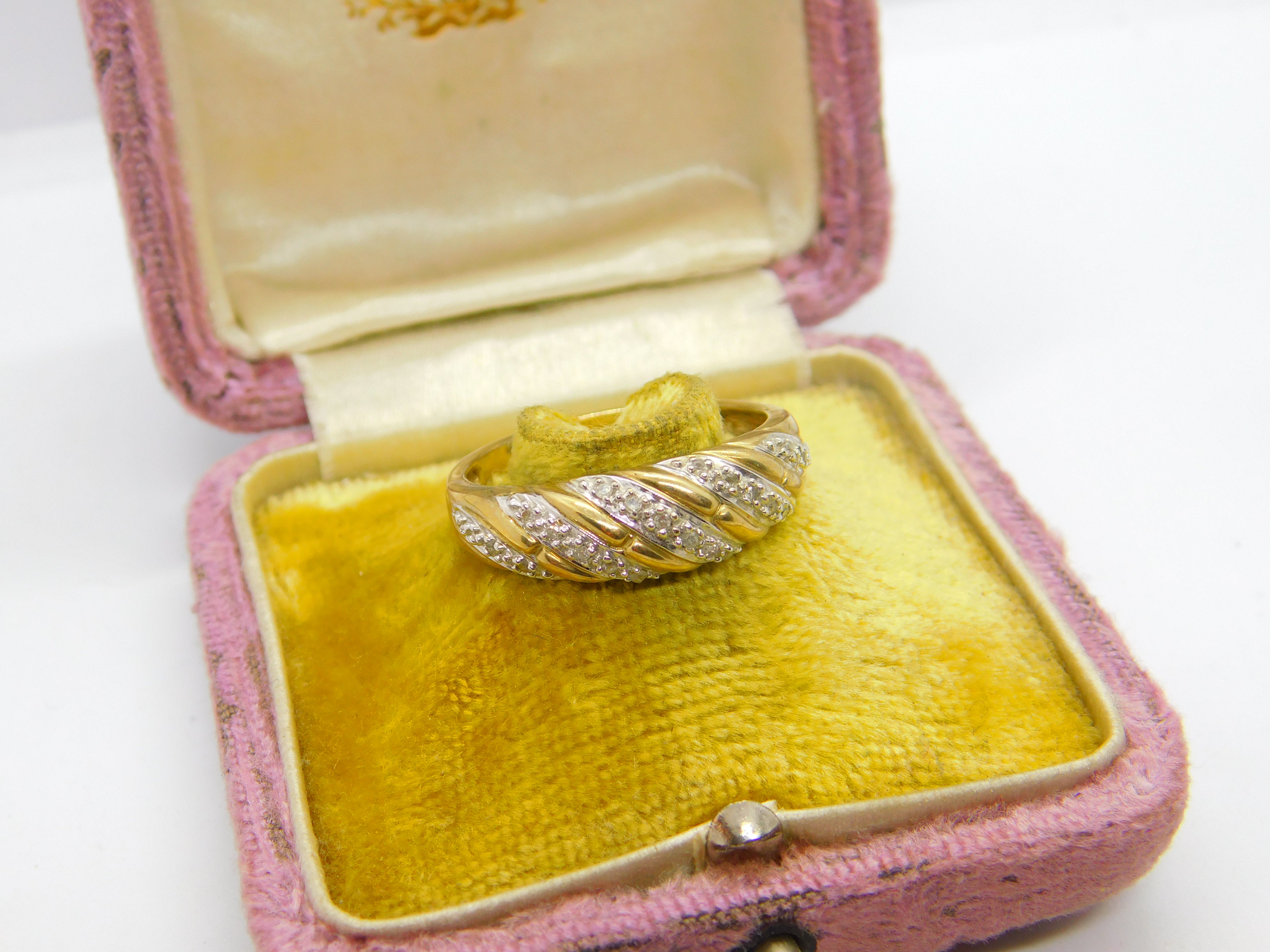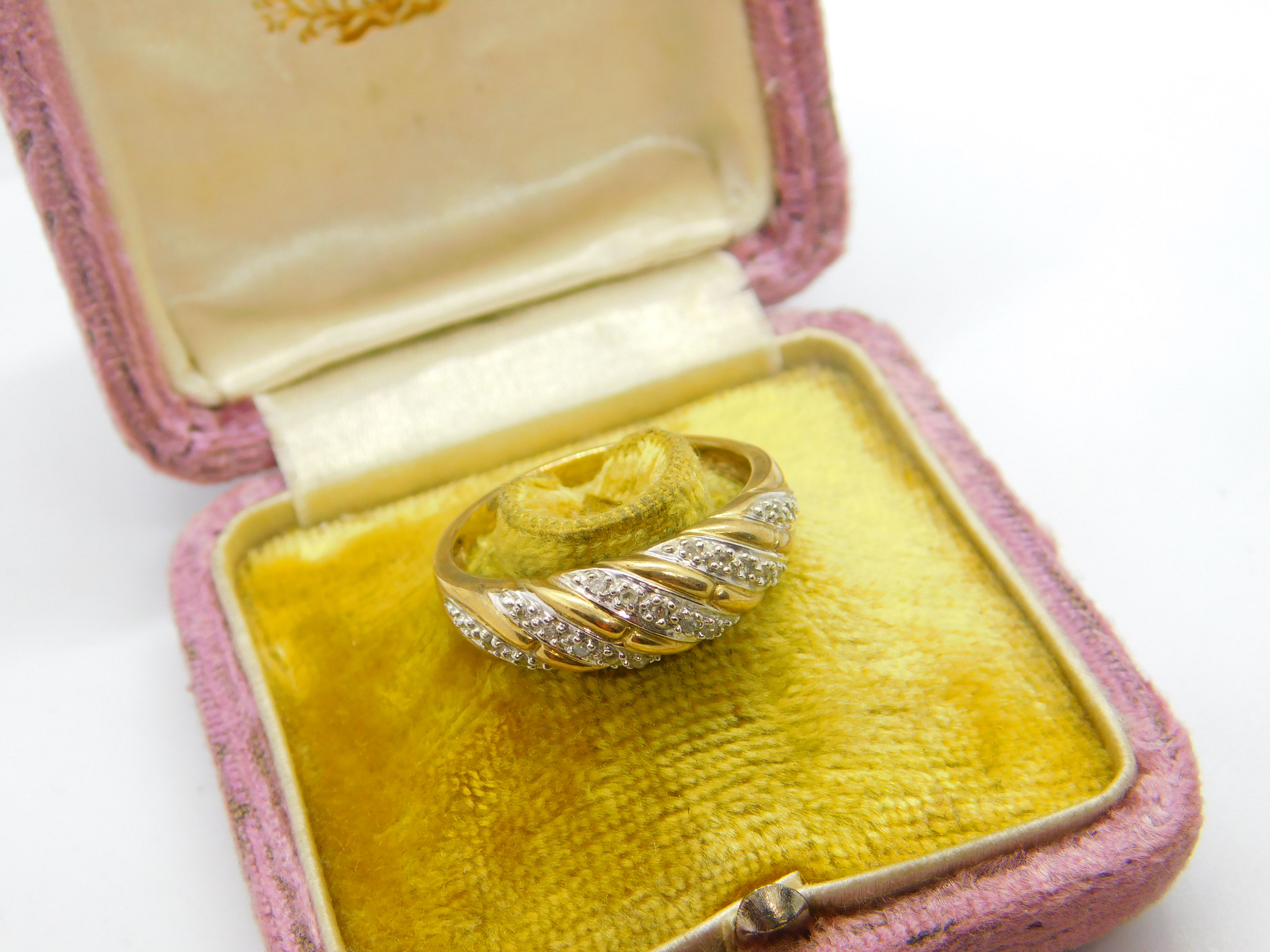 Details: A fantastic and wonderfully designed vintage 9ct yellow gold and diamond set swirl form band ring with lovely detail hallmarked Sheffield c1970 to the interior. This is a wonderful item that would make a perfect gift or addition to any collection. The BOX pictured is for PRESENTATION ONLY and is NOT included in the listings but used to frame the pictures unless specifically stated otherwise.
