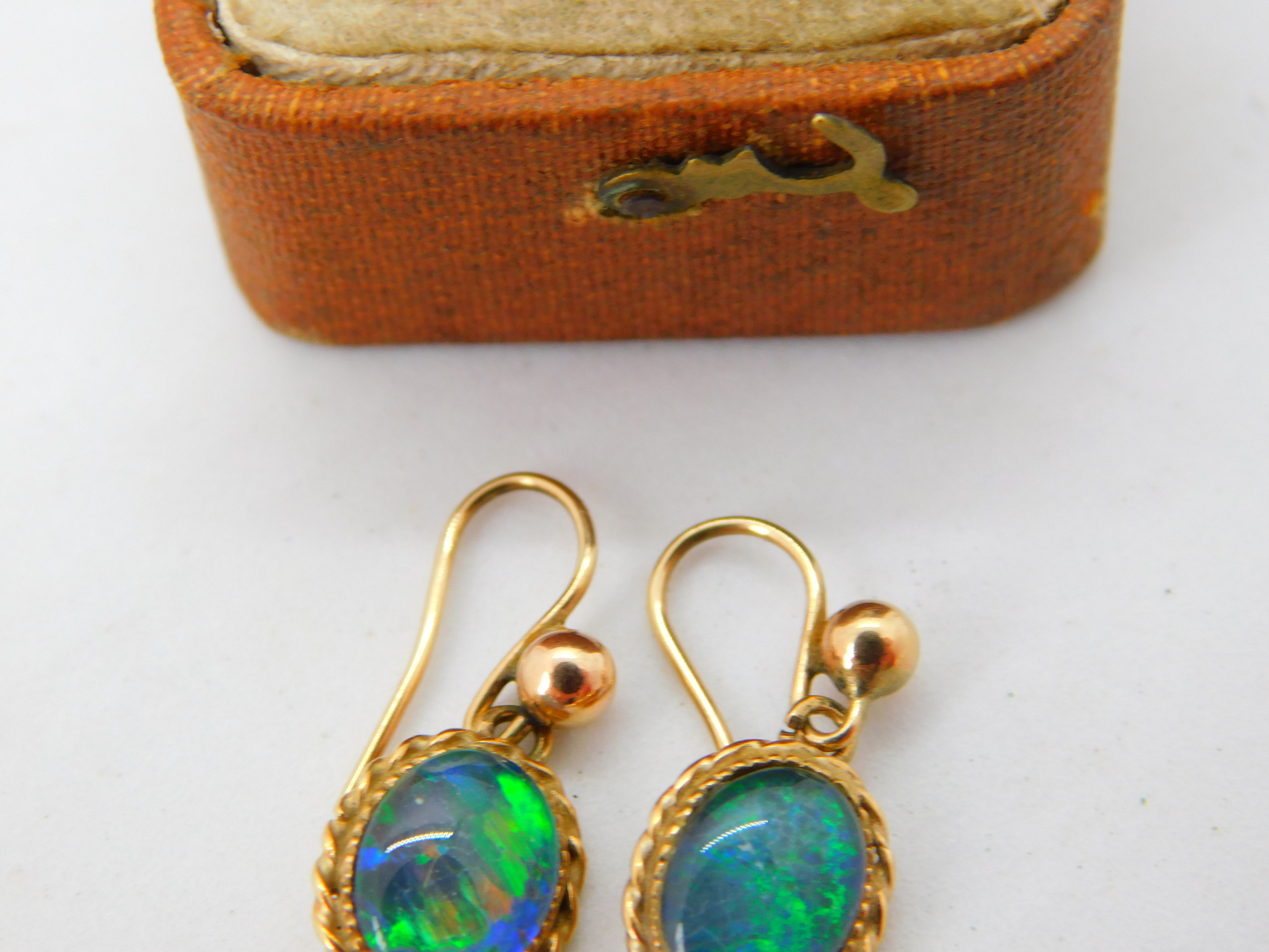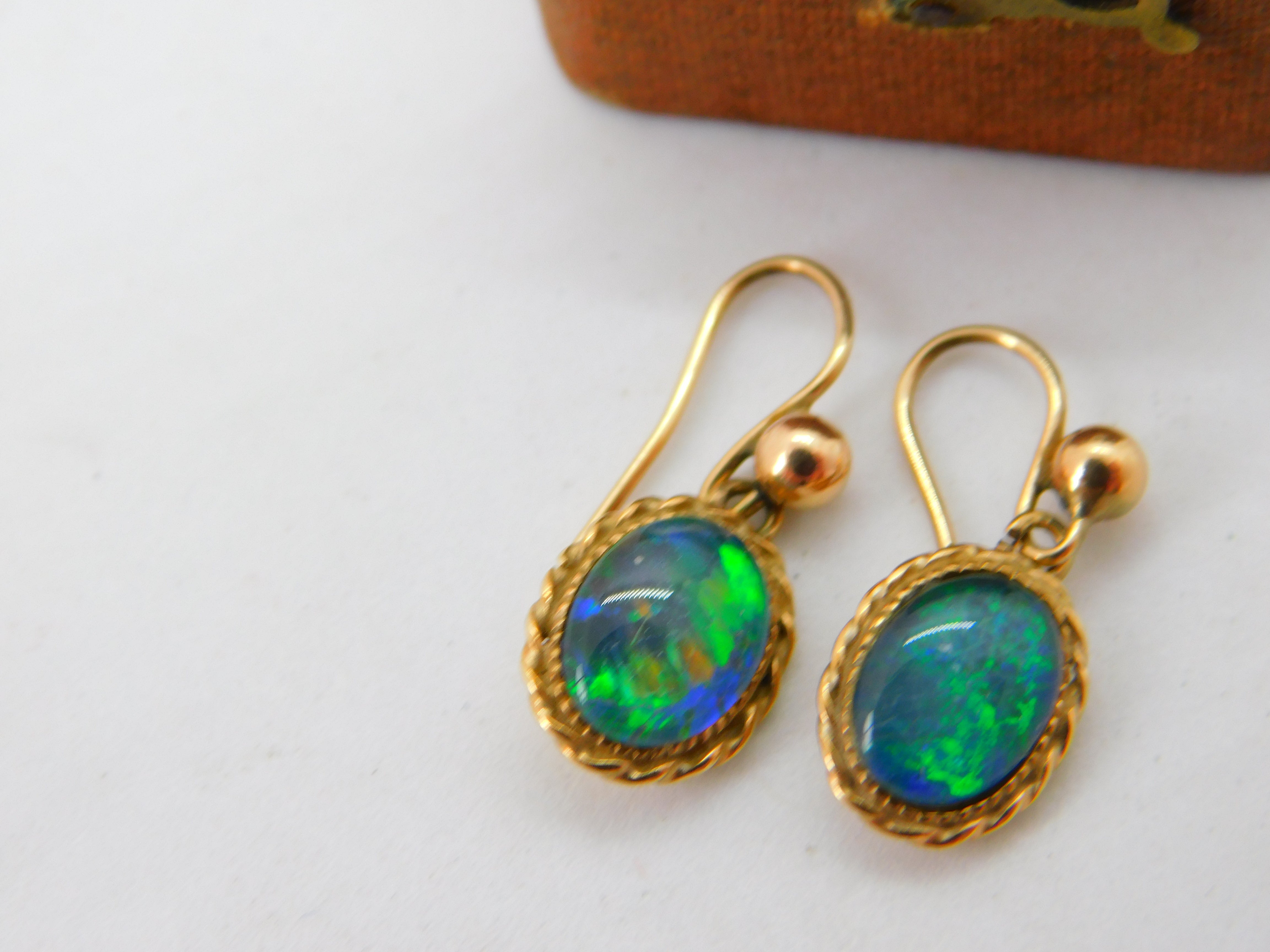 Details: A fantastic and wonderfully designed antique art deco 9ct yellow gold drop earrings set with doublet opals hallmarked to the reverse c1920. This is a wonderful item that would make a perfect gift or addition to any collection. The BOX pictured is for PRESENTATION ONLY and is NOT included in the listings but used to frame the pictures unless specifically stated otherwise.