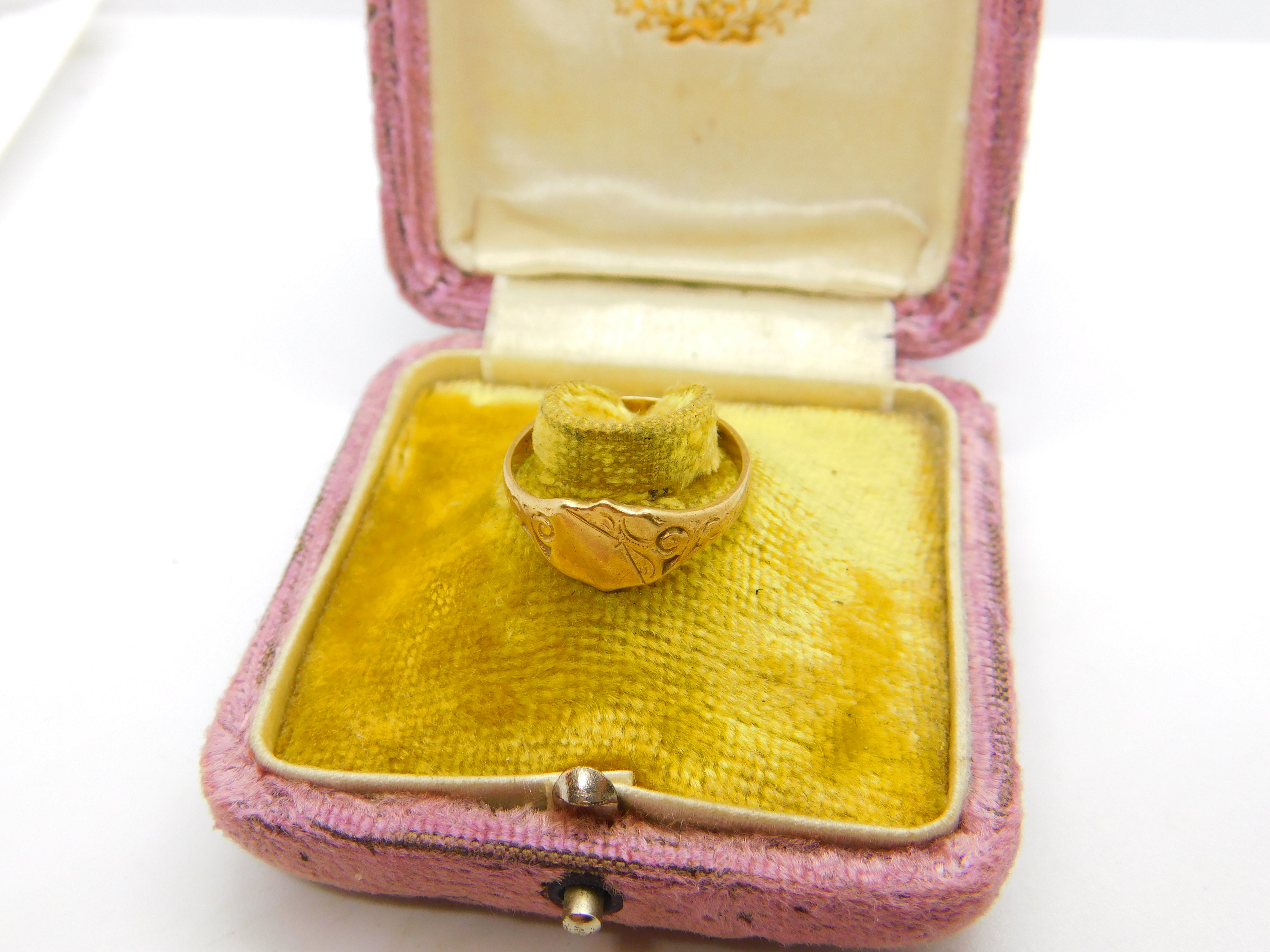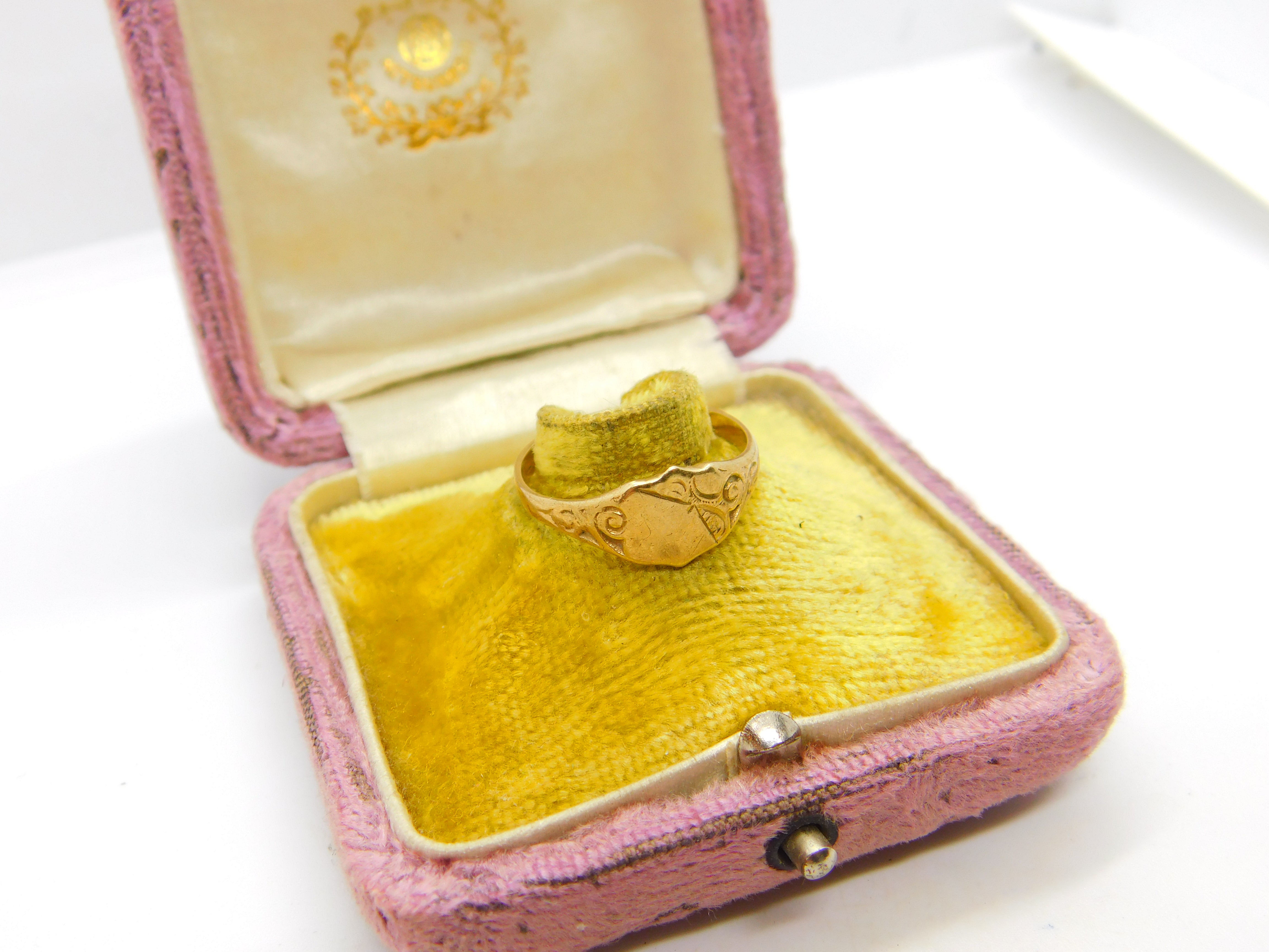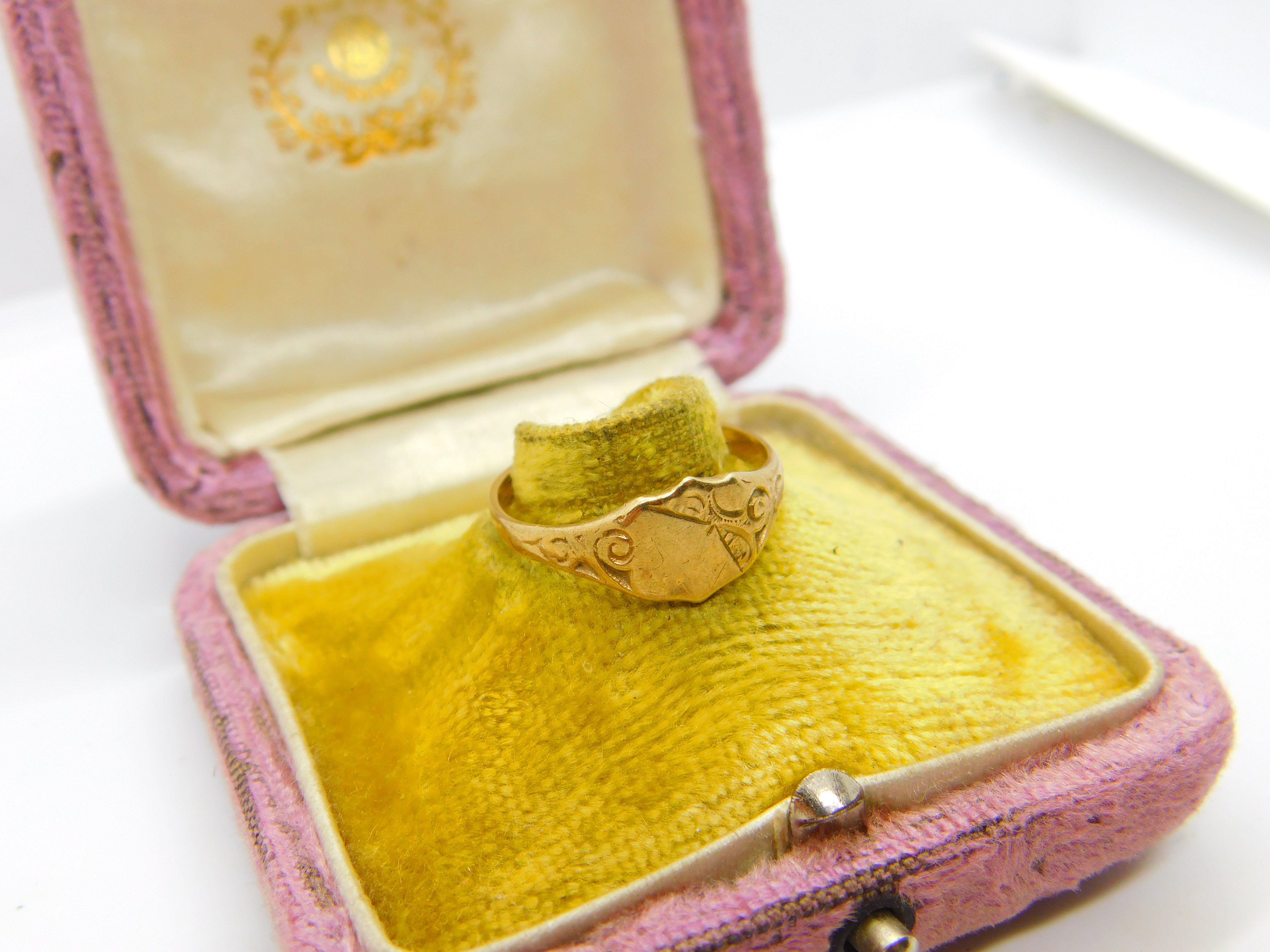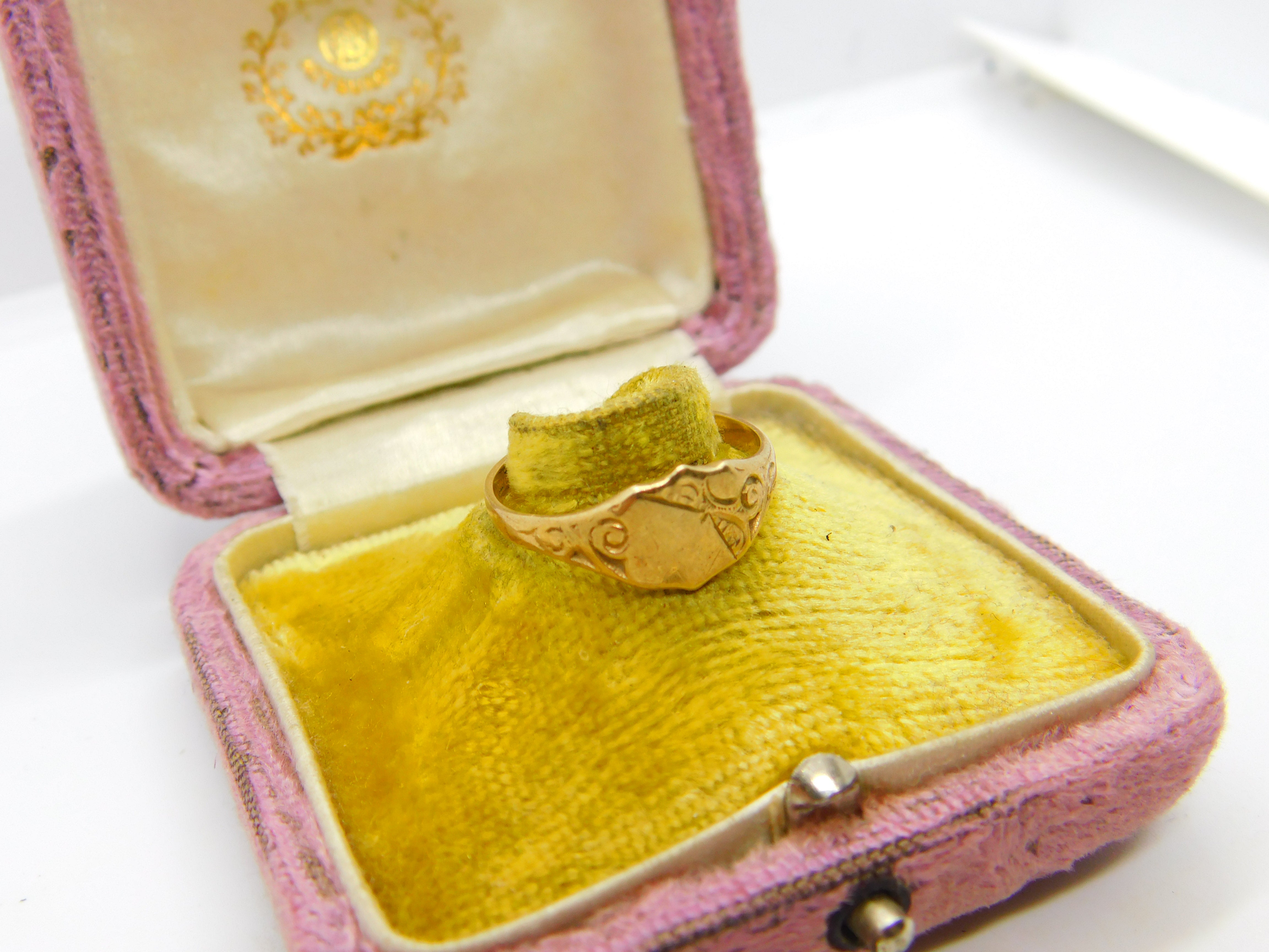 Details: A fantastic and wonderfully designed vintage 9ct yellow gold essential gents signet ring with floral detailing hallmarked Birmingham 1977 to the interior. This is a wonderful item that would make a perfect gift or addition to any collection. The BOX pictured is for PRESENTATION ONLY and is NOT included in the listings but used to frame the pictures unless specifically stated otherwise.
