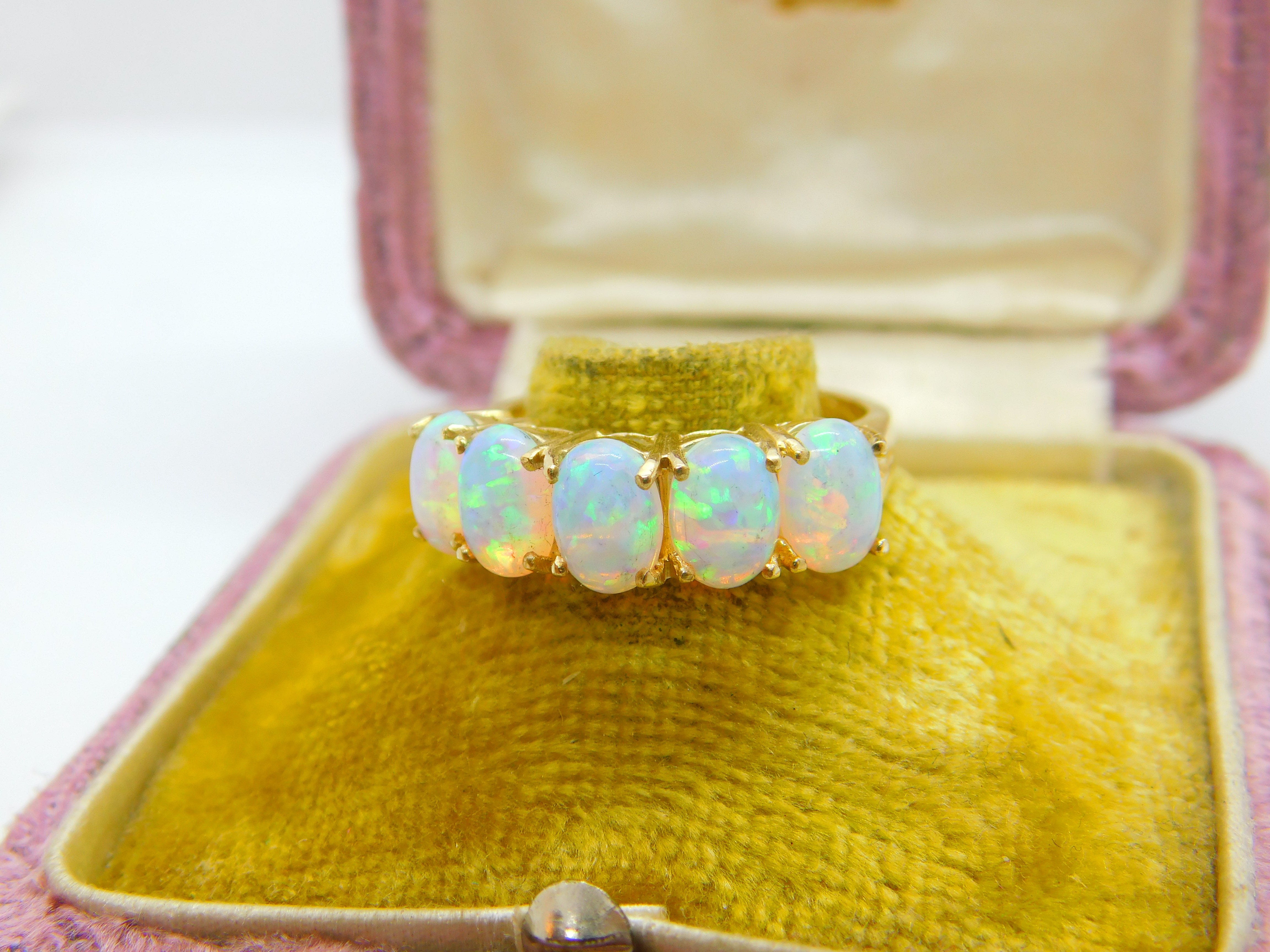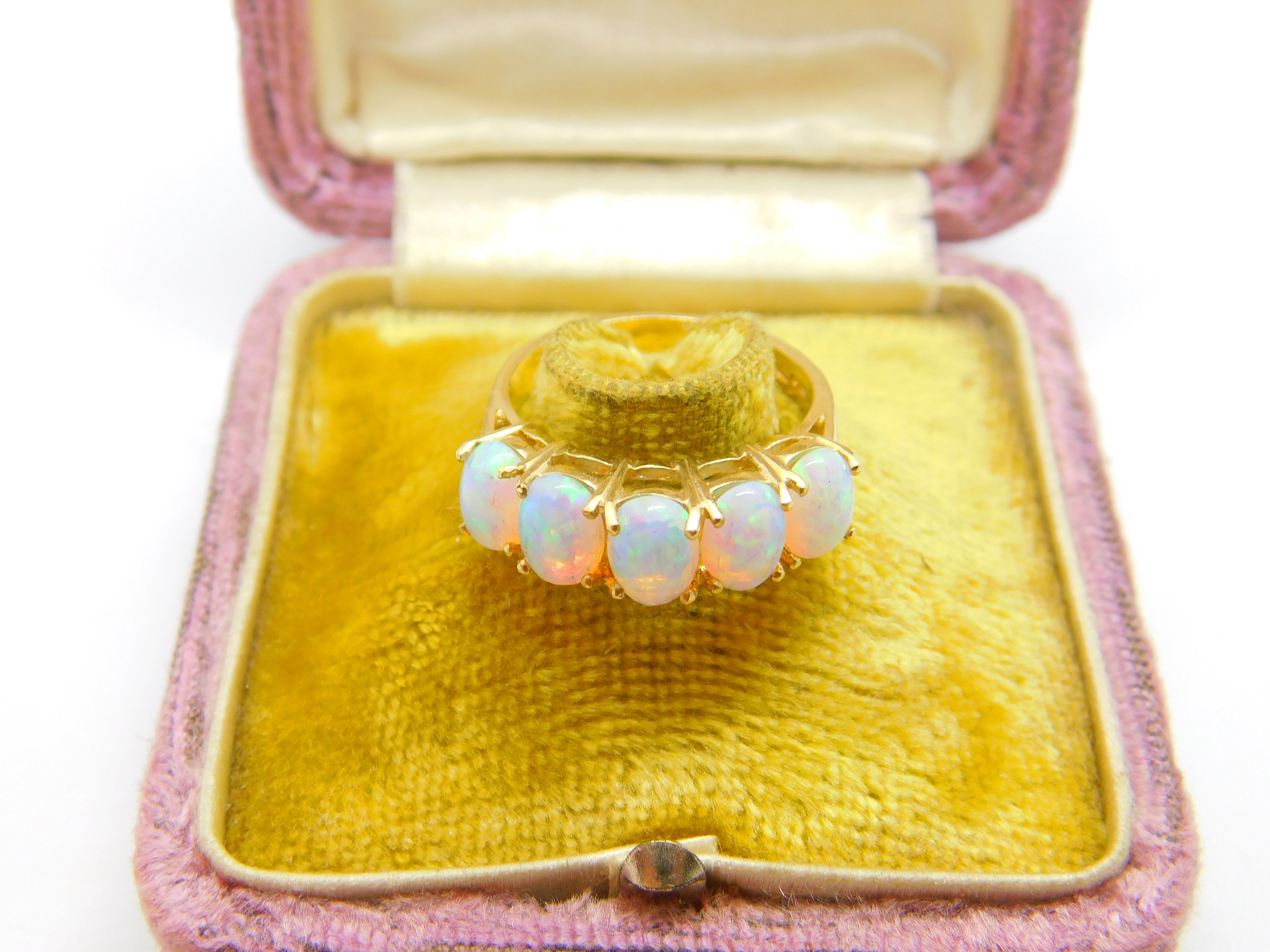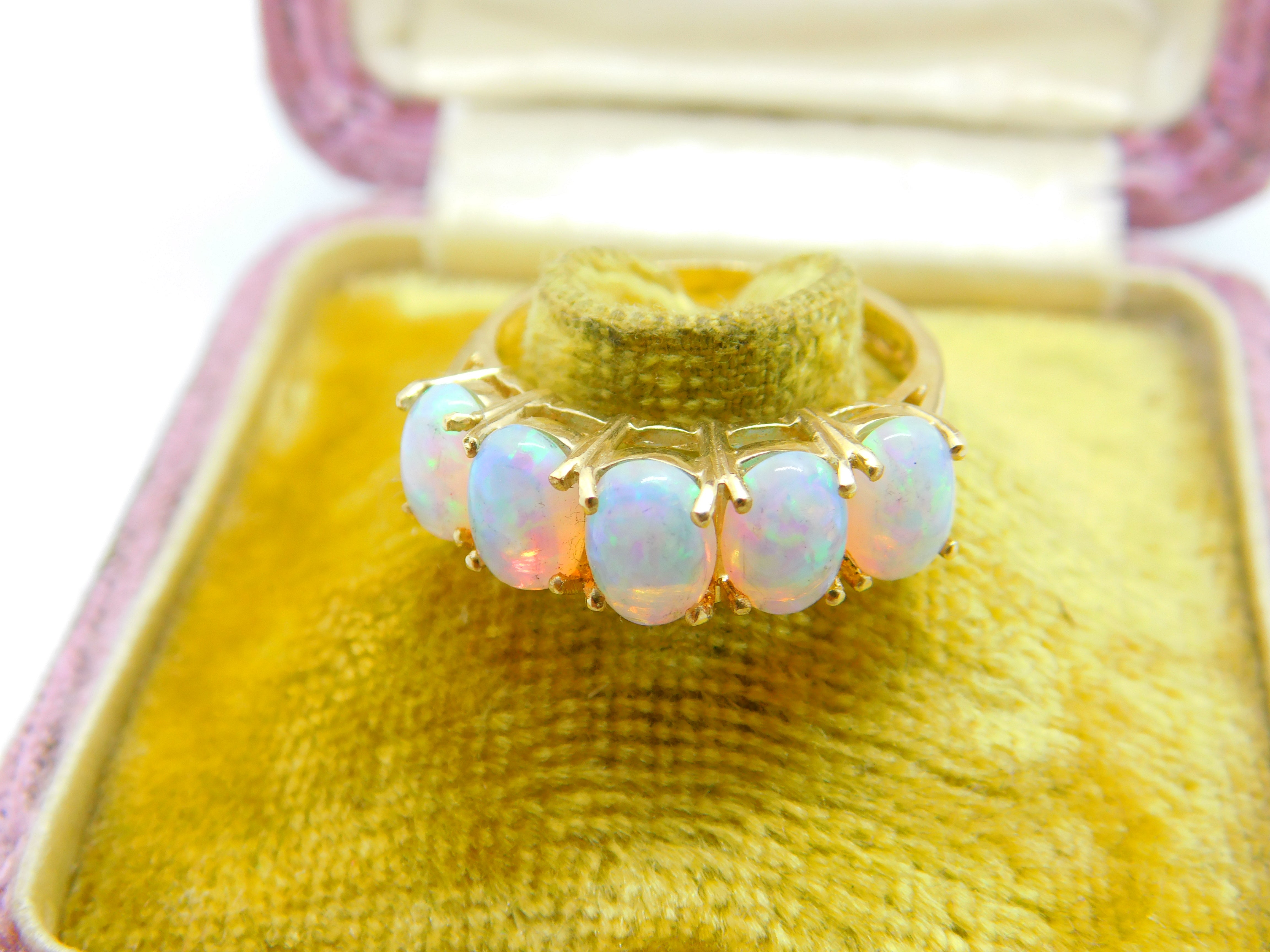 Details: A fantastic and wonderfully designed vintage 9ct yellow gold five stone band ring set with five gorgeous cabochon opal stones hallmarked to the interior band c1980 Birmingham. This is a wonderful item that would make a perfect gift or addition to any collection. The BOX pictured is for PRESENTATION ONLY and is NOT included in the listings but used to frame the pictures unless specifically stated otherwise.