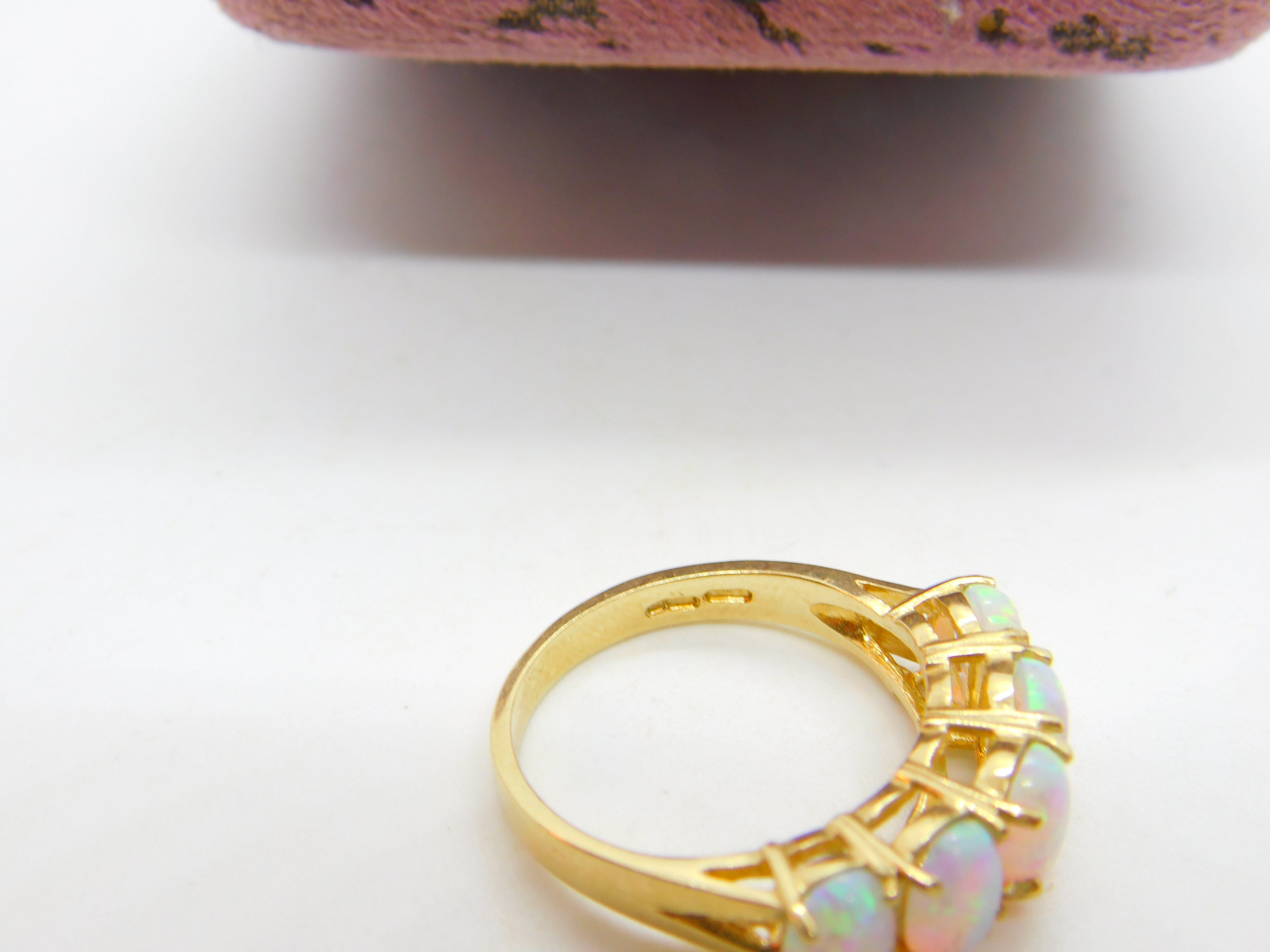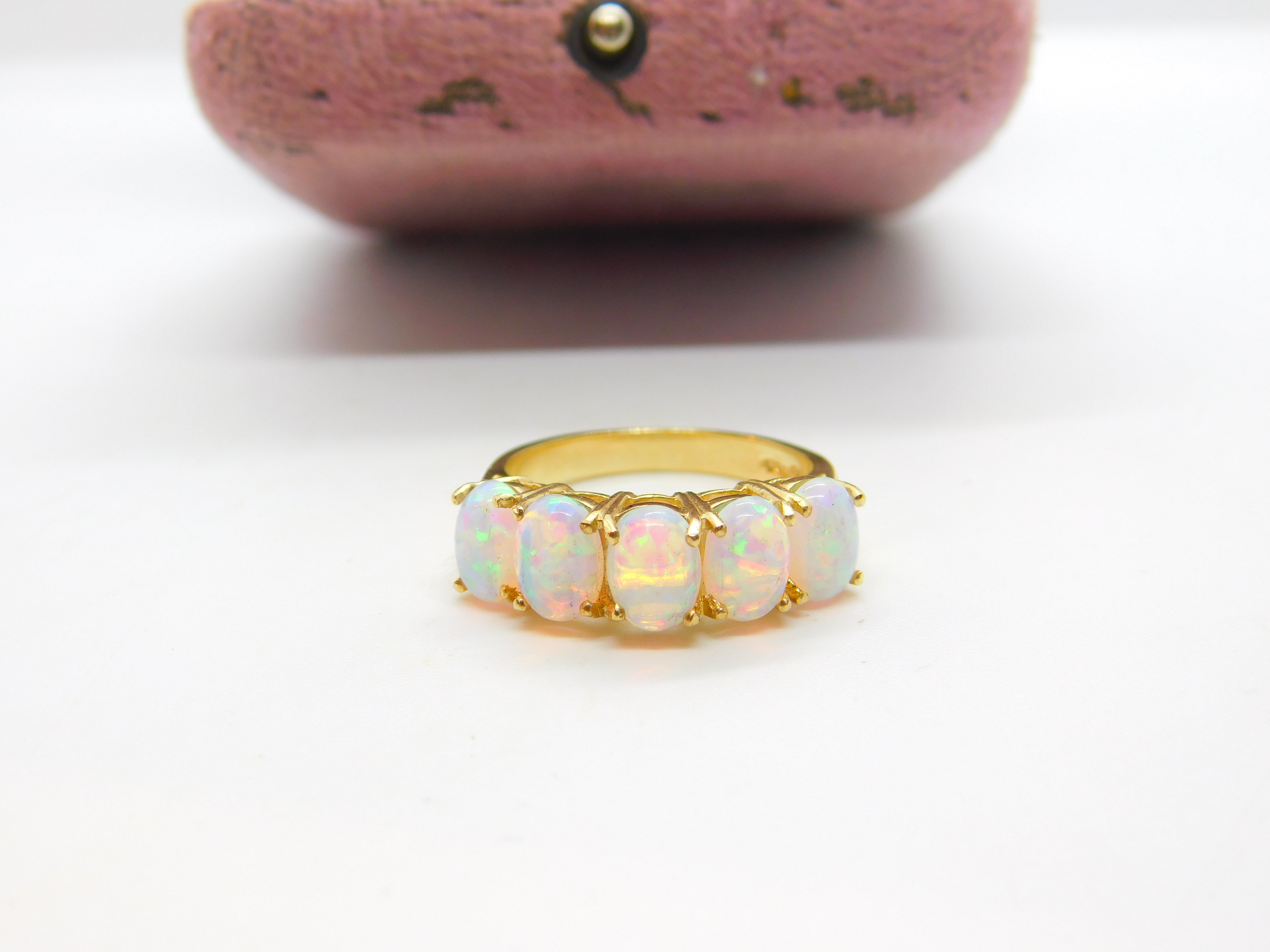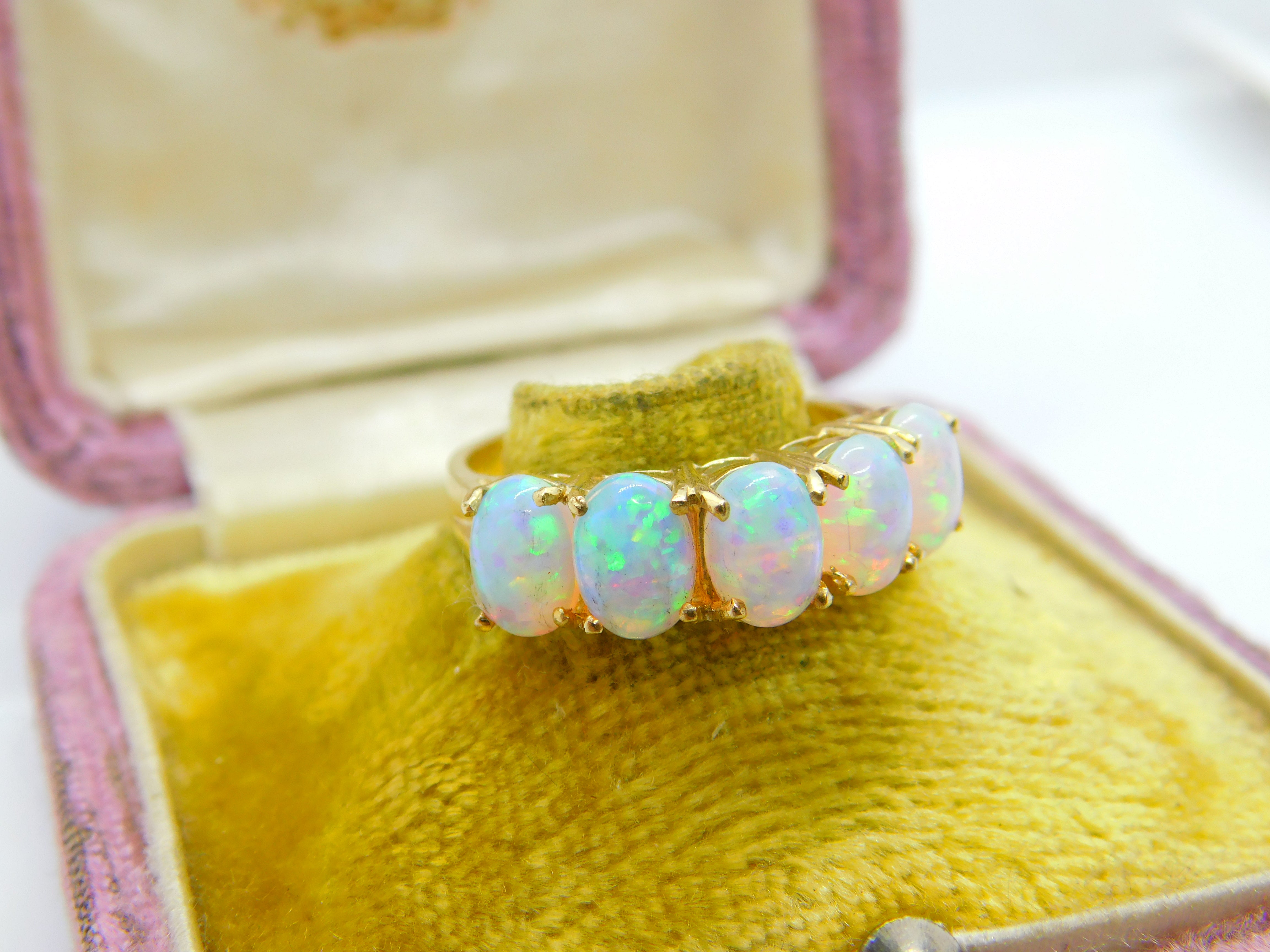 Details: A fantastic and wonderfully designed vintage 9ct yellow gold five stone band ring set with five gorgeous cabochon opal stones hallmarked to the interior band c1980 Birmingham. This is a wonderful item that would make a perfect gift or addition to any collection. The BOX pictured is for PRESENTATION ONLY and is NOT included in the listings but used to frame the pictures unless specifically stated otherwise.