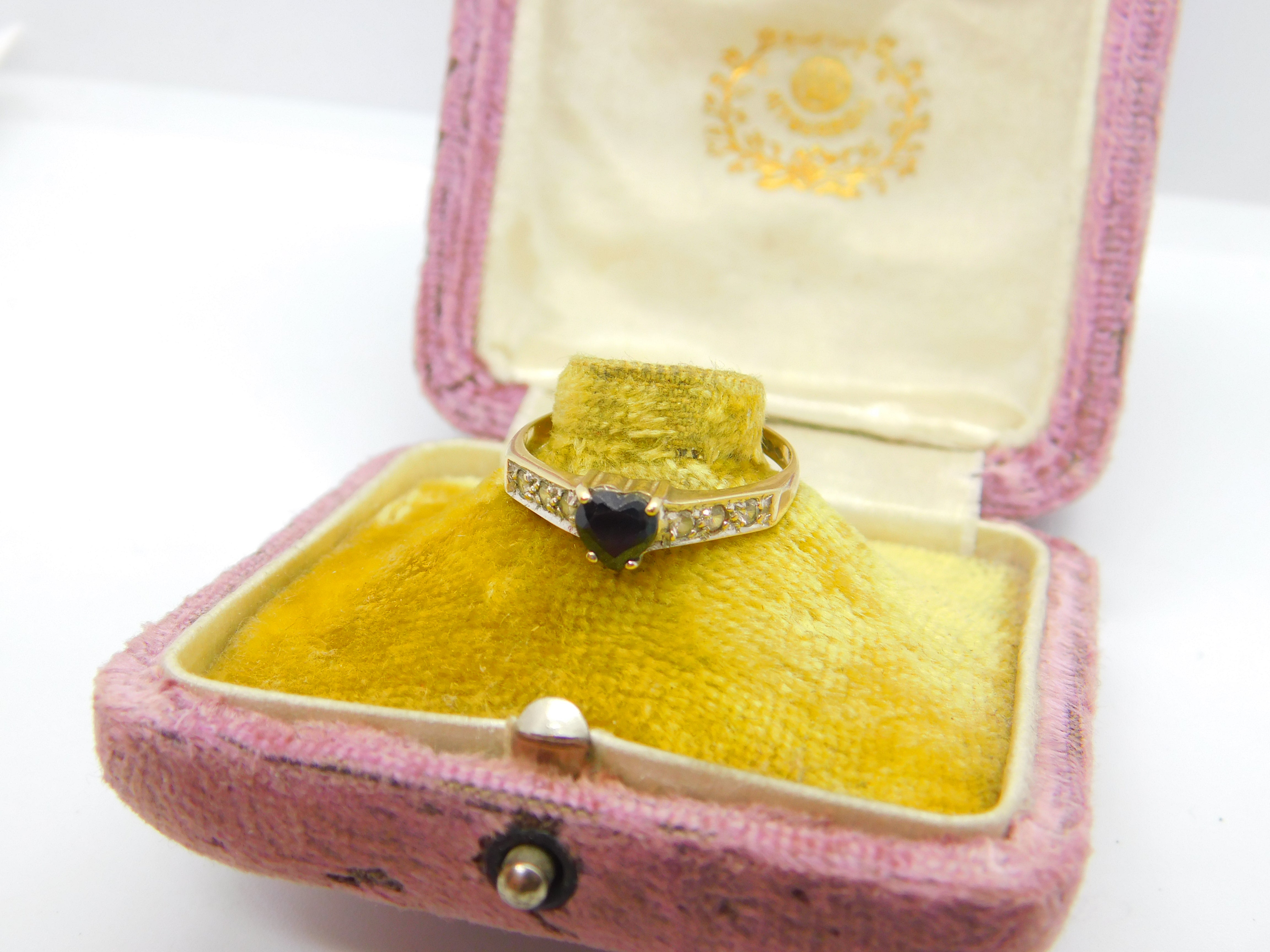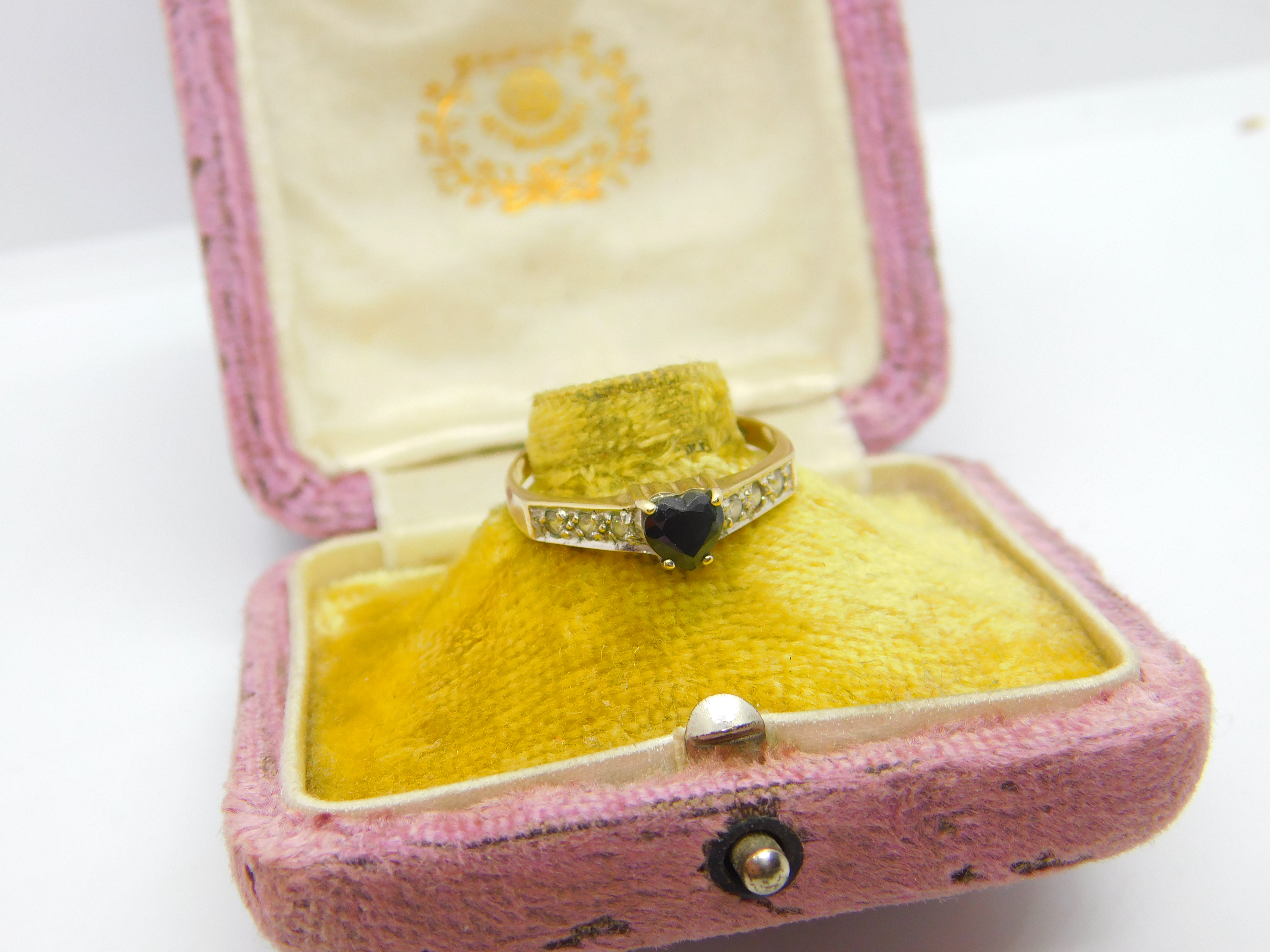 Details: A fantastic and wonderfully designed vintage 9ct yellow gold band ring with lovely heart cut sapphire with diamond paste stone surround hallmarked Birmingham 1986. This is a wonderful item that would make a perfect gift or addition to any collection. The BOX pictured is for PRESENTATION ONLY and is NOT included in the listings but used to frame the pictures unless specifically stated otherwise.