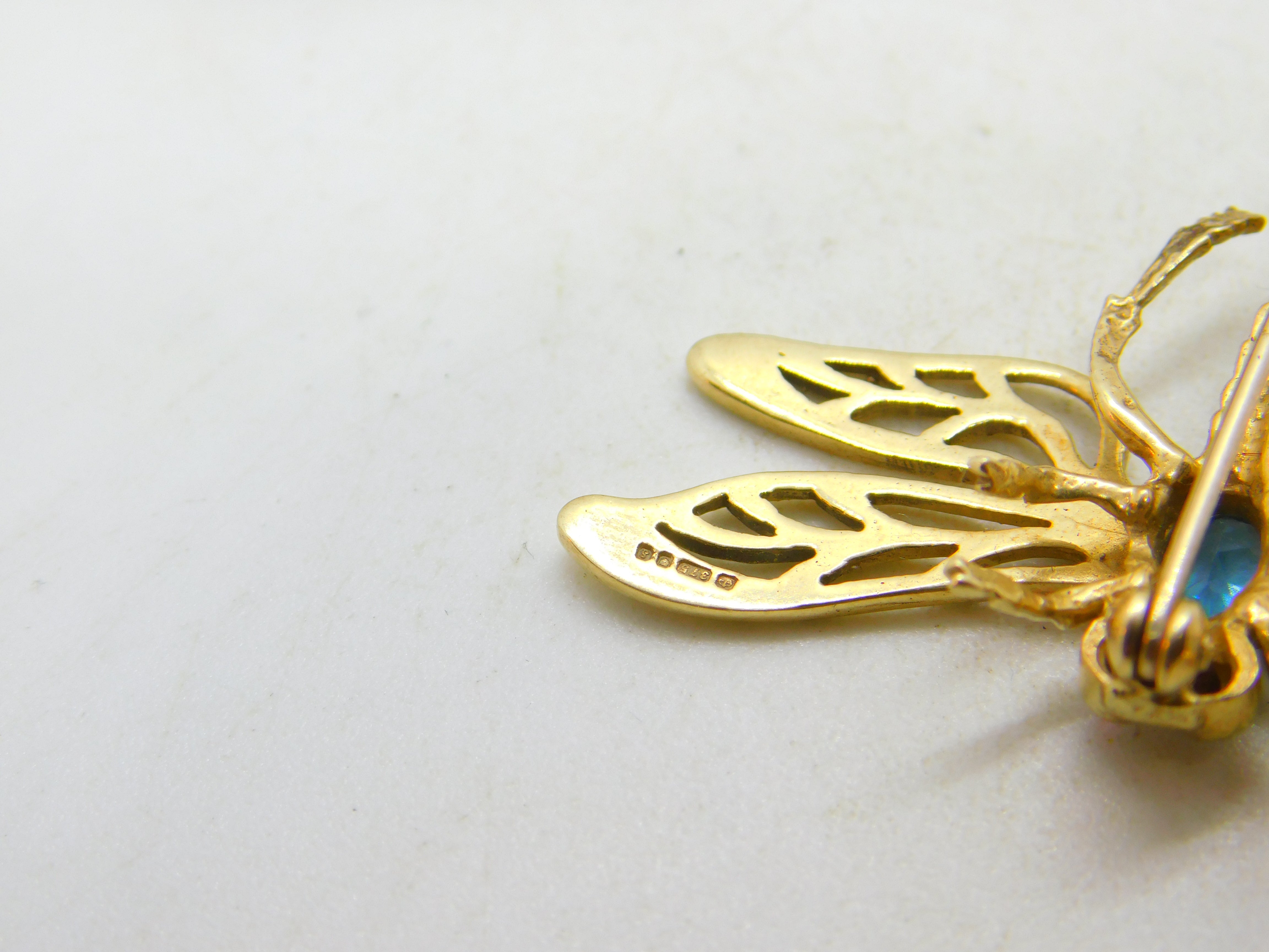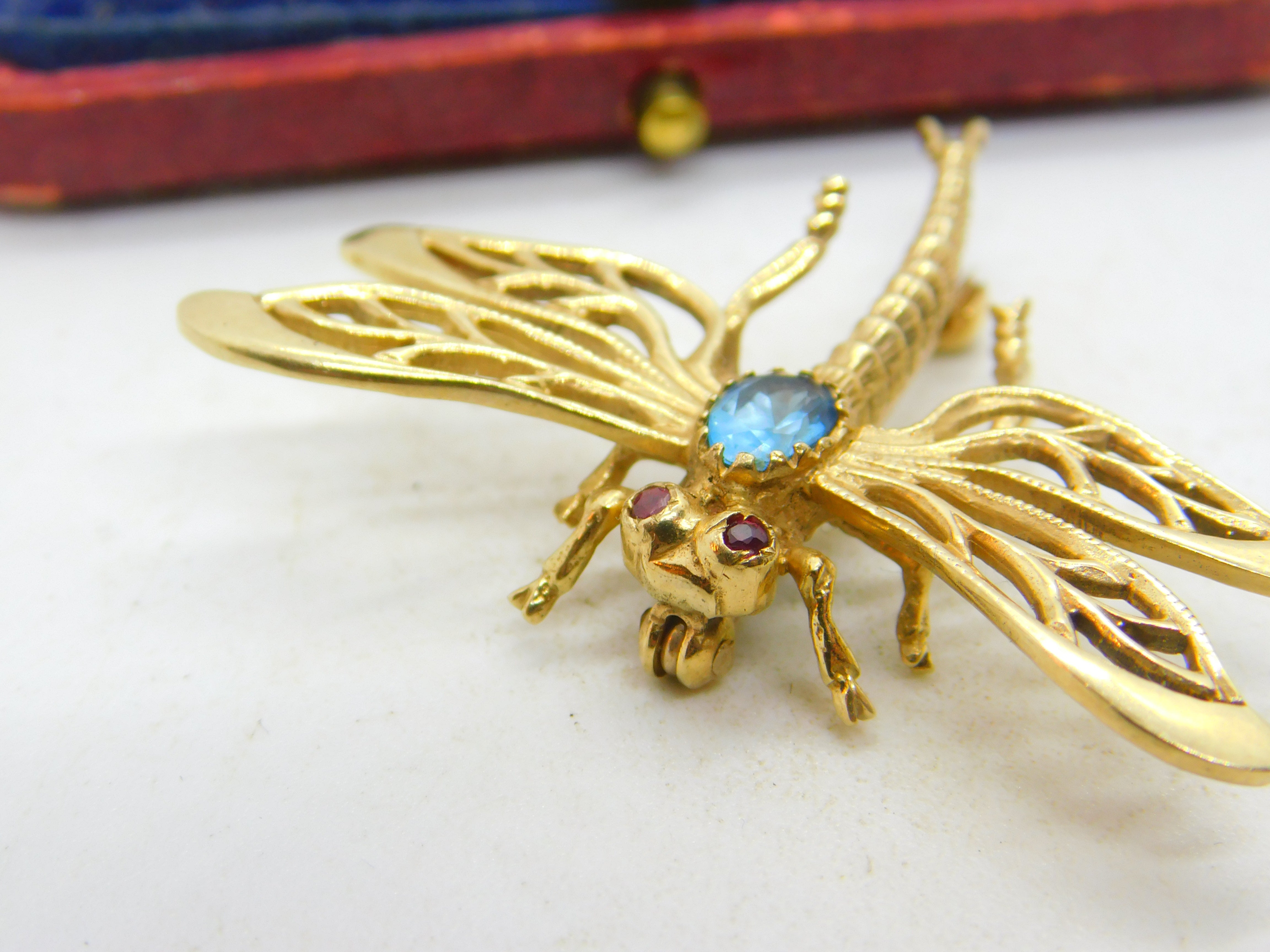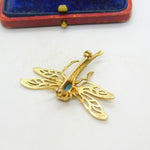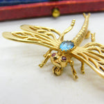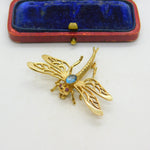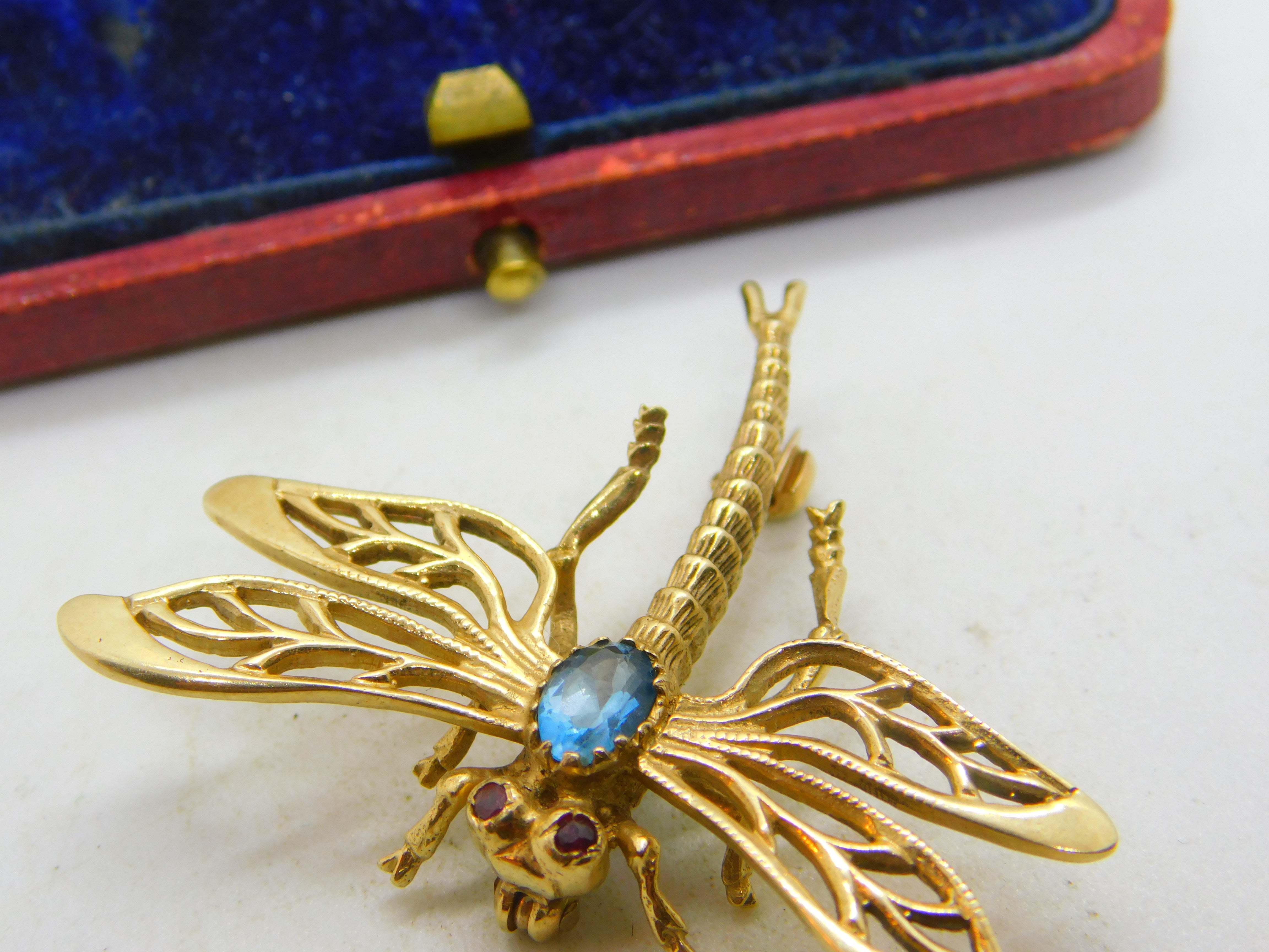 Details: A fantastic and wonderfully designed vintage 9ct yellow gold insect dragonfly brooch pin set with blue imperial topaz & ruby eyes hallmarked London 1973. This is a wonderful item that would make a perfect gift or addition to any collection. The BOX pictured is for PRESENTATION ONLY and is NOT included in the listings but used to frame the pictures unless specifically stated otherwise.
