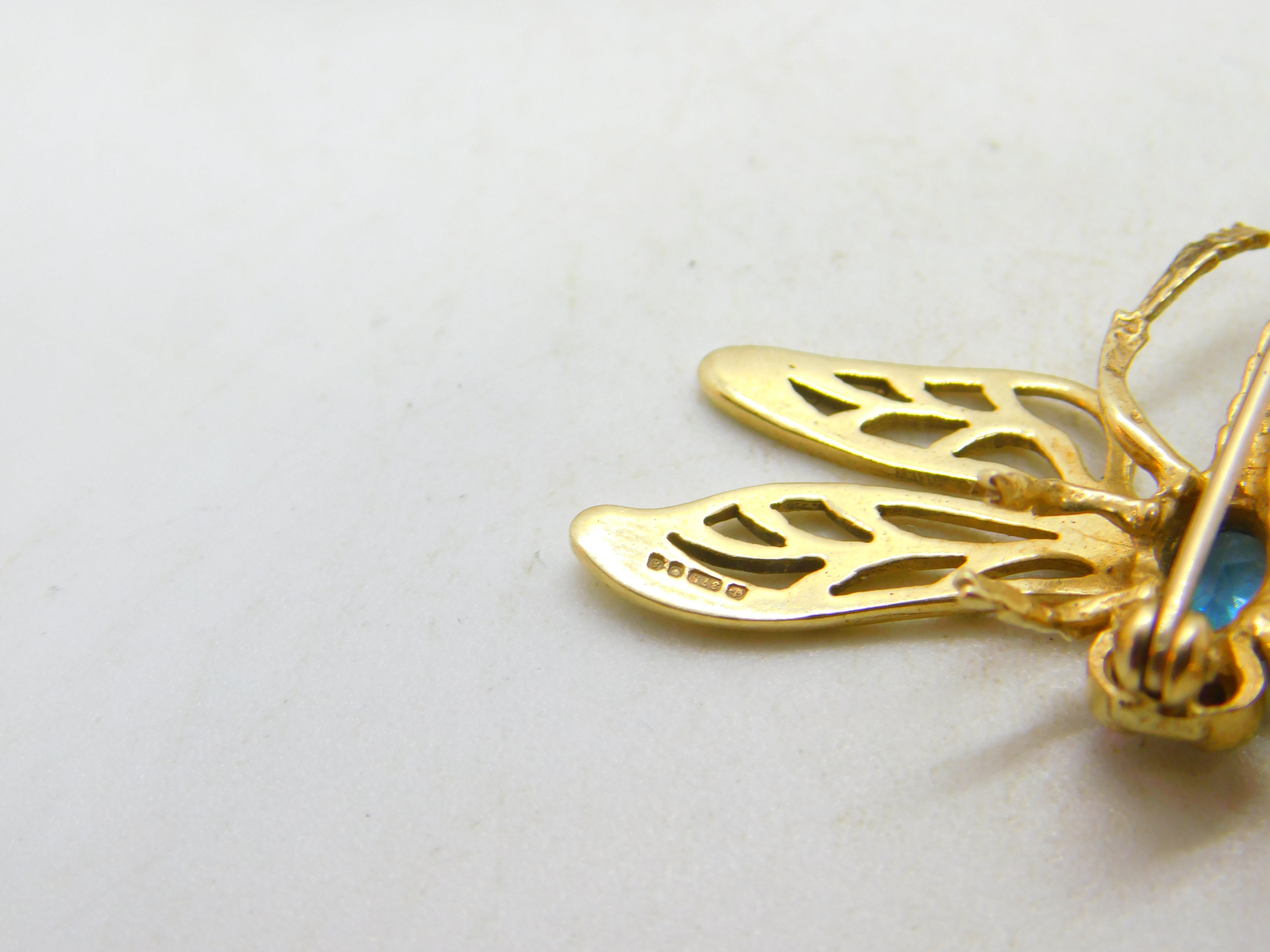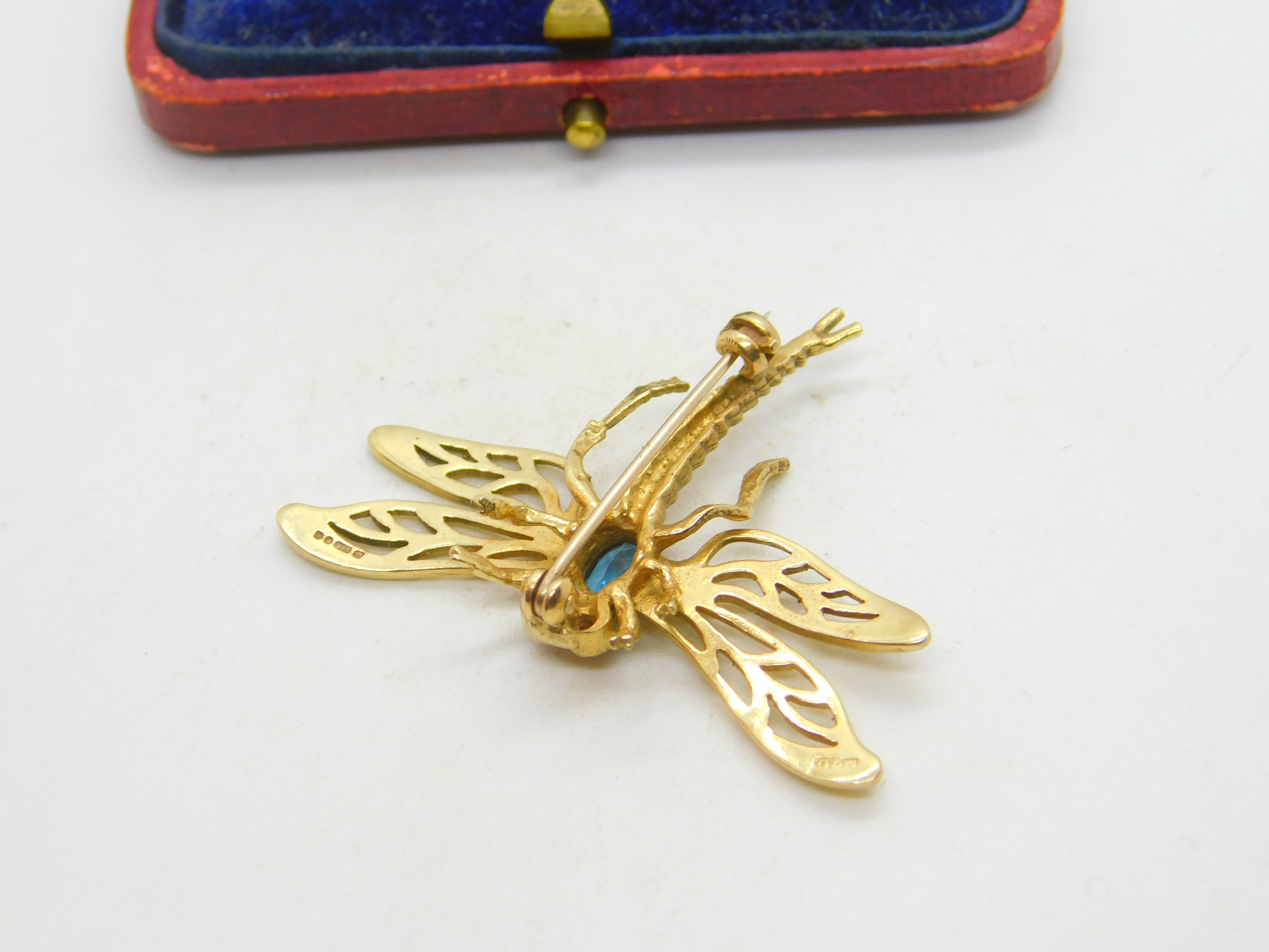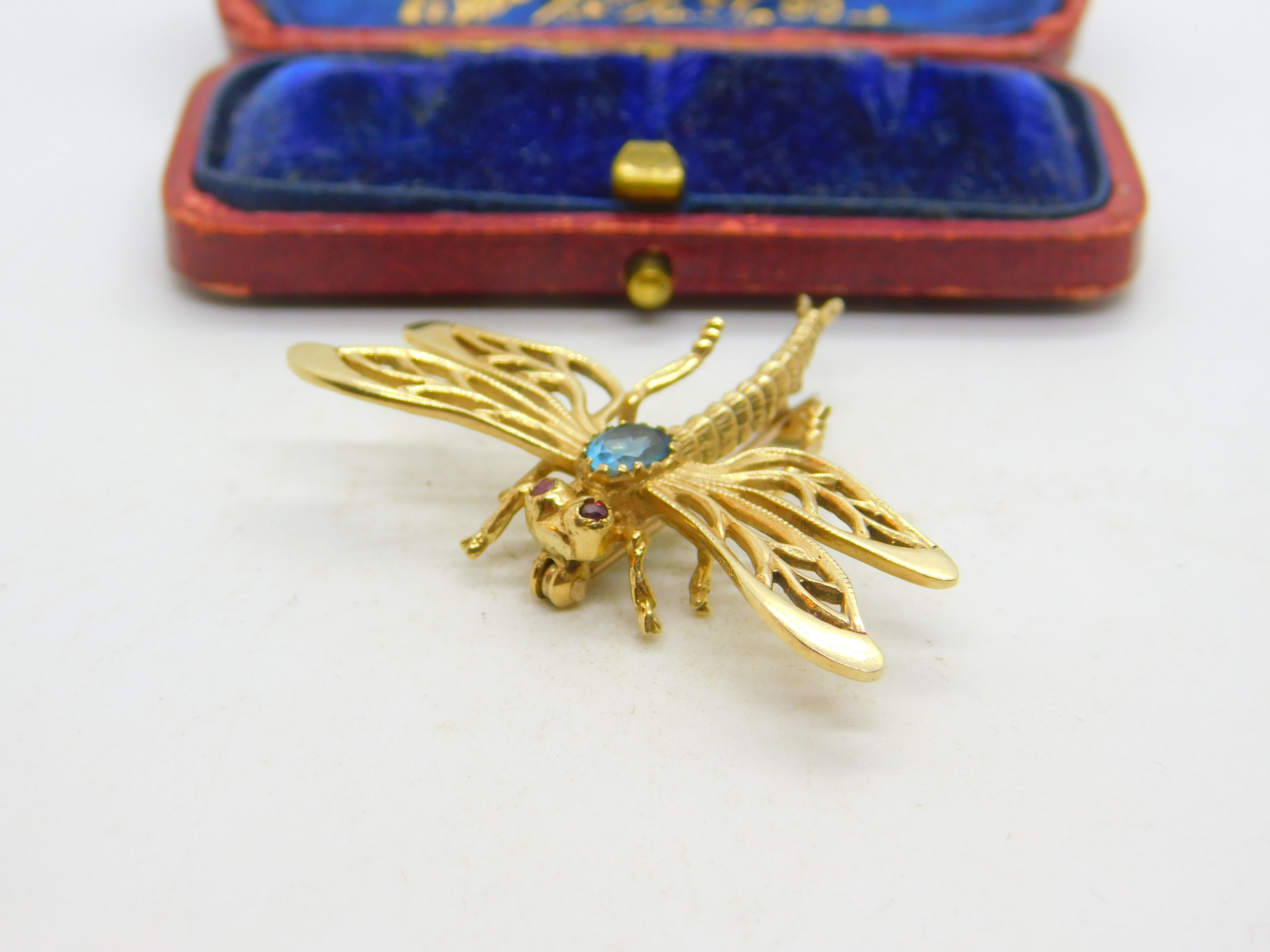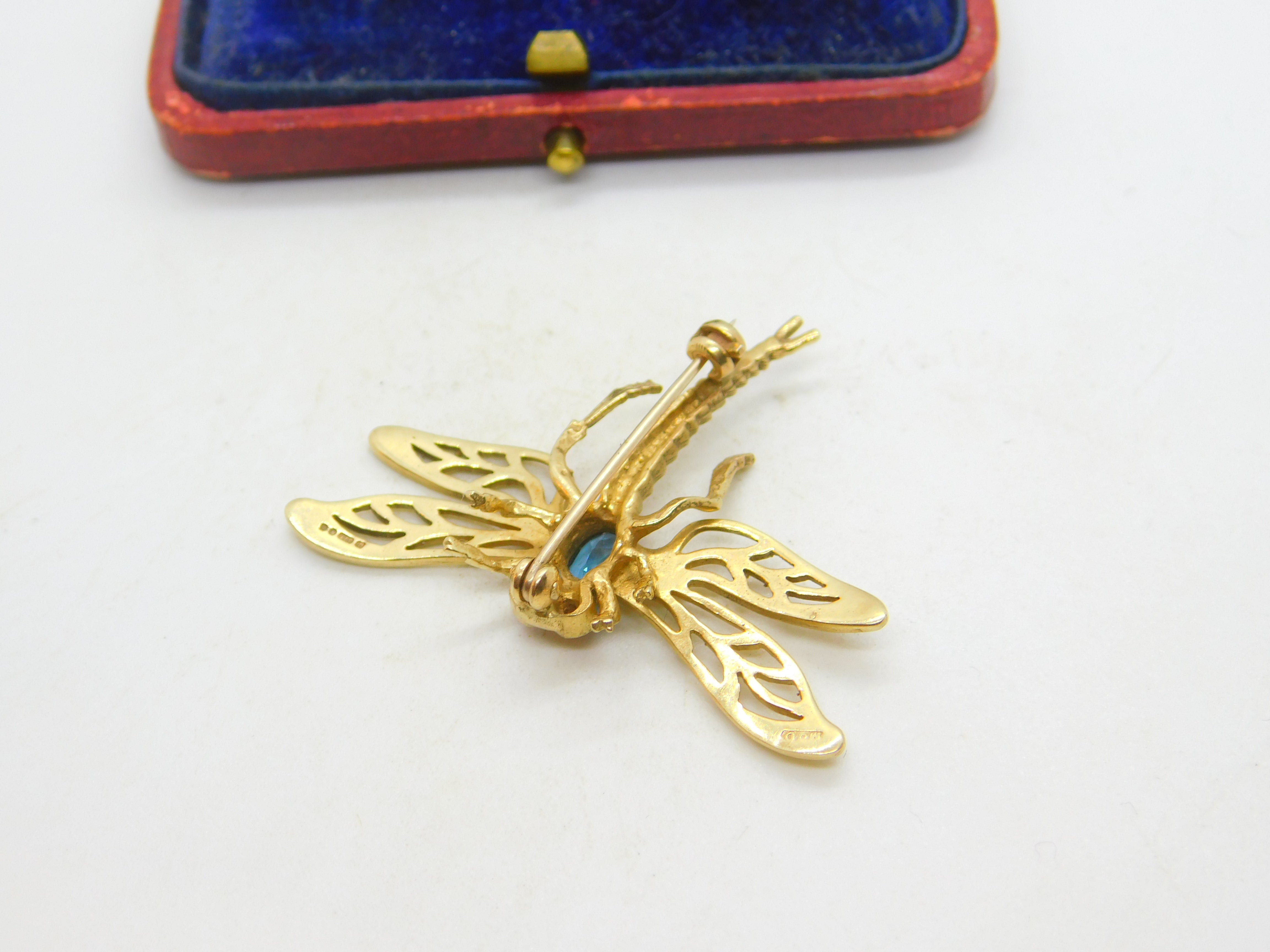 Details: A fantastic and wonderfully designed vintage 9ct yellow gold insect dragonfly brooch pin set with blue imperial topaz & ruby eyes hallmarked London 1973. This is a wonderful item that would make a perfect gift or addition to any collection. The BOX pictured is for PRESENTATION ONLY and is NOT included in the listings but used to frame the pictures unless specifically stated otherwise.