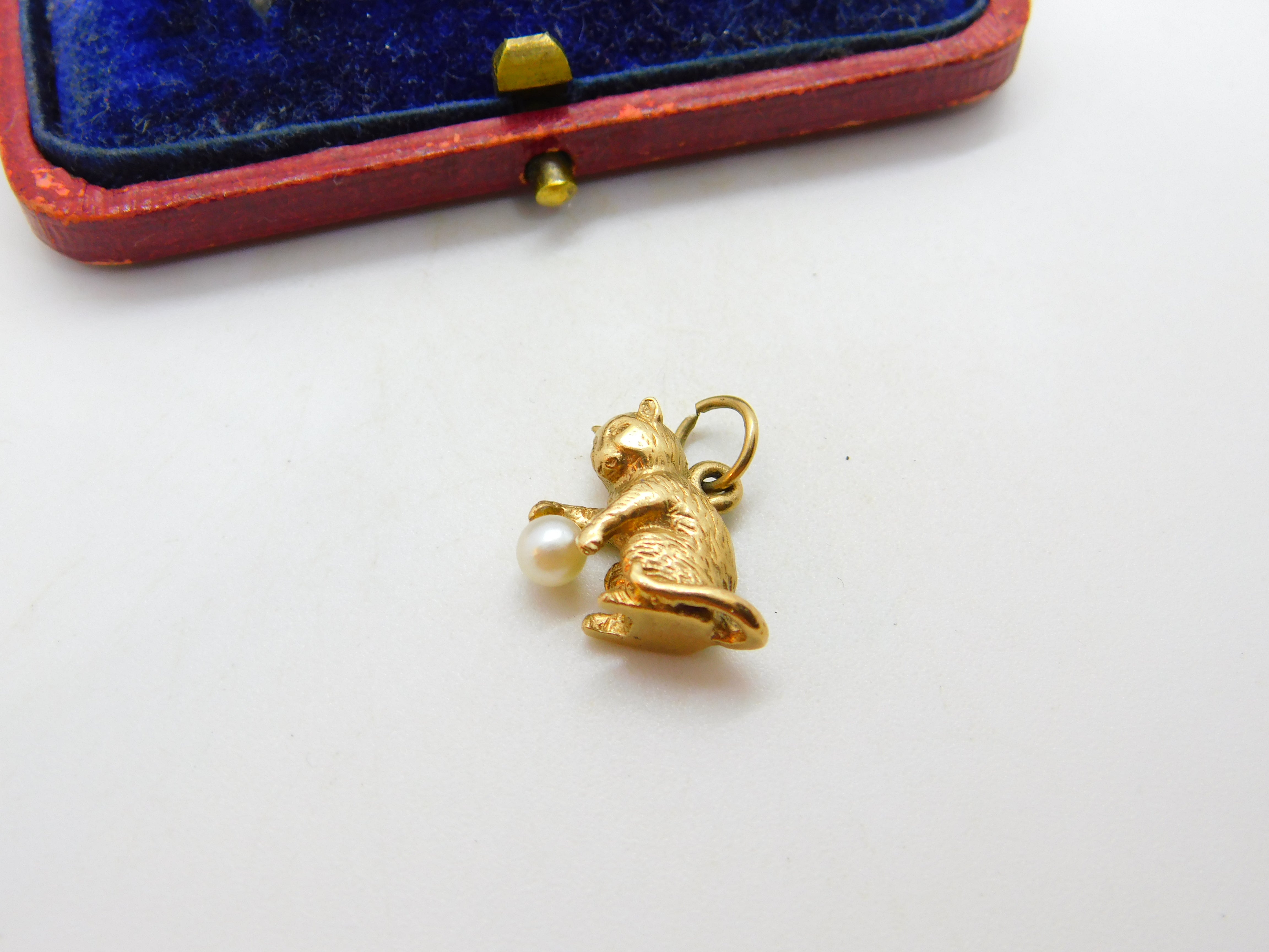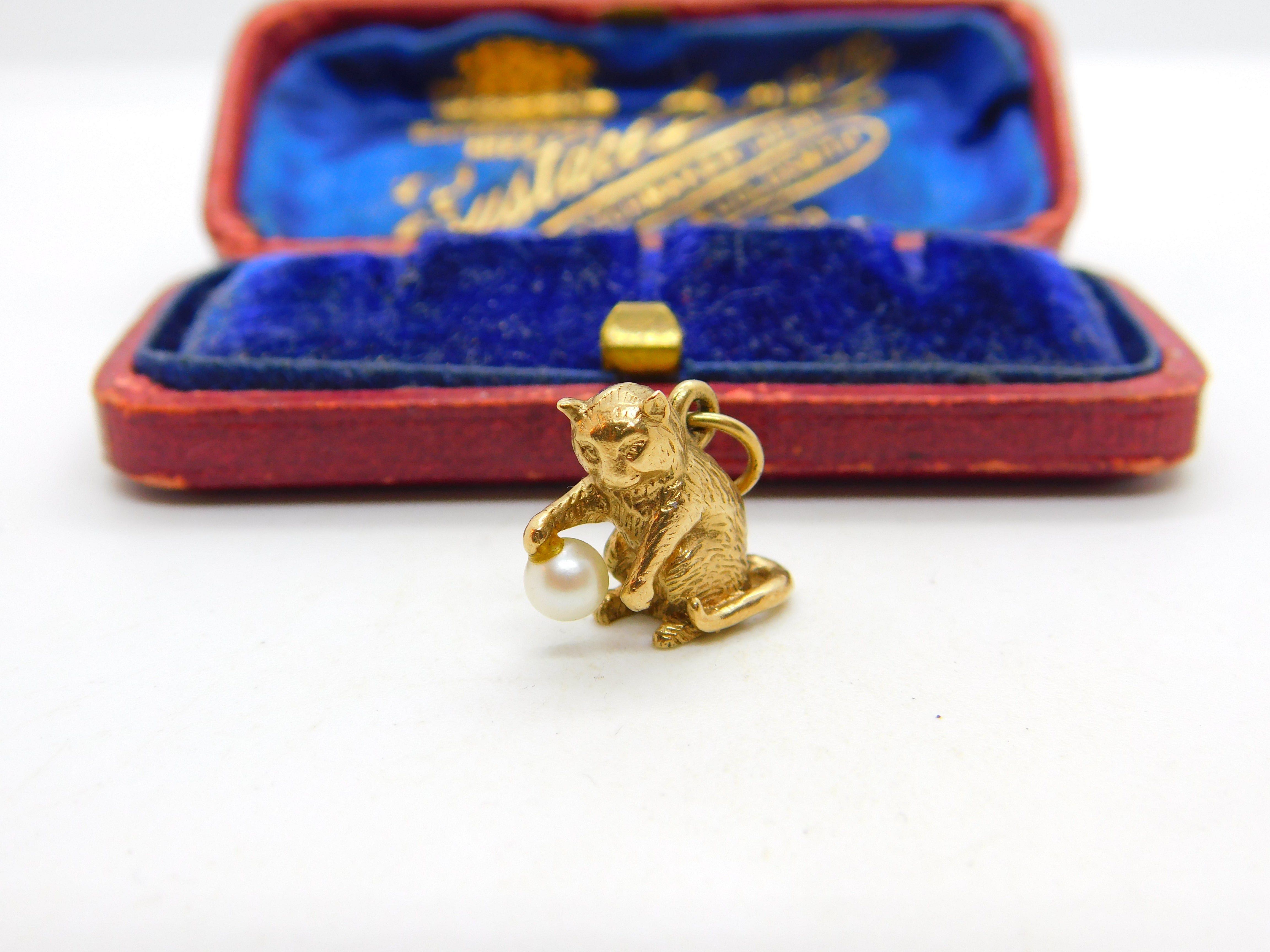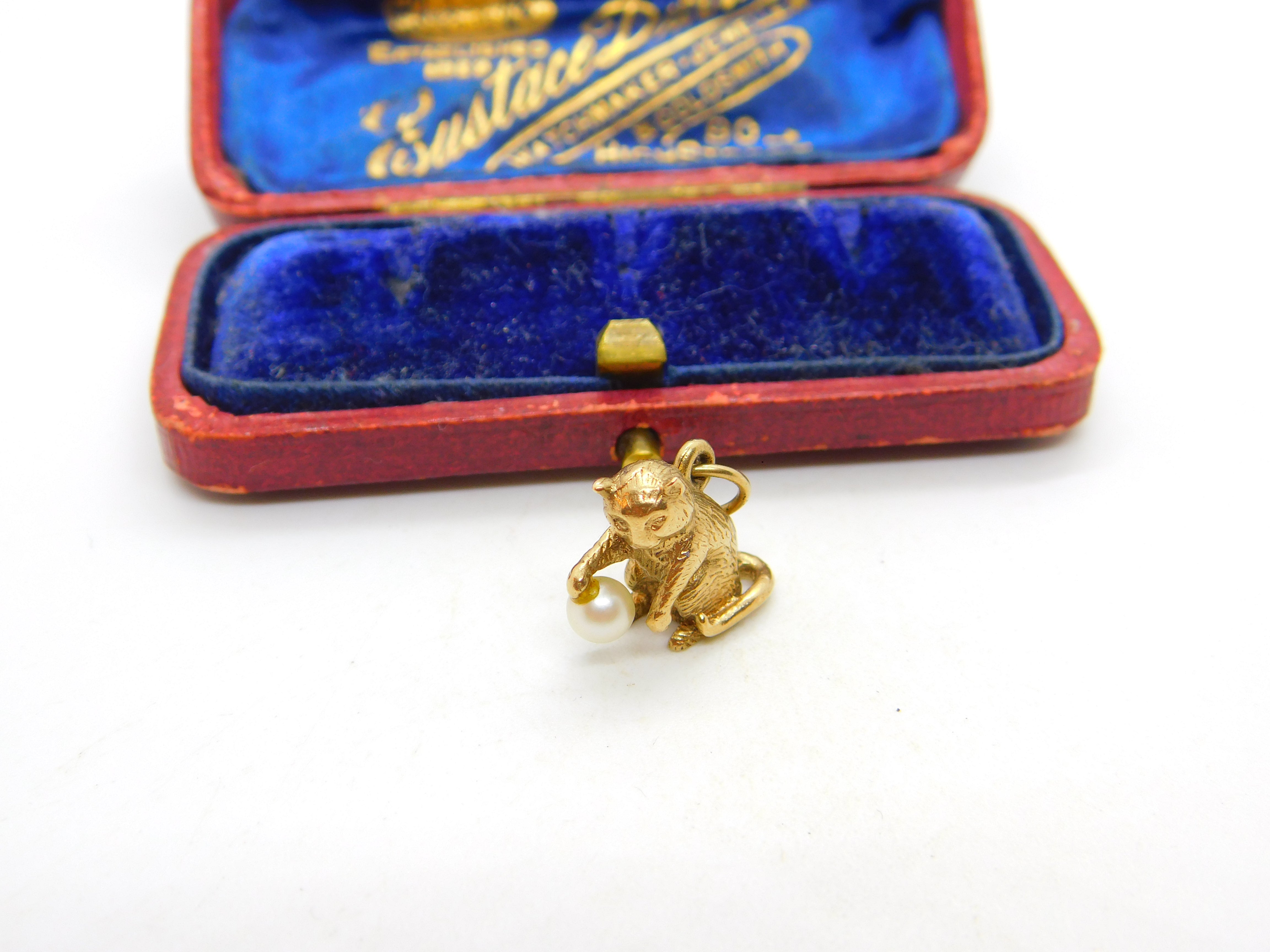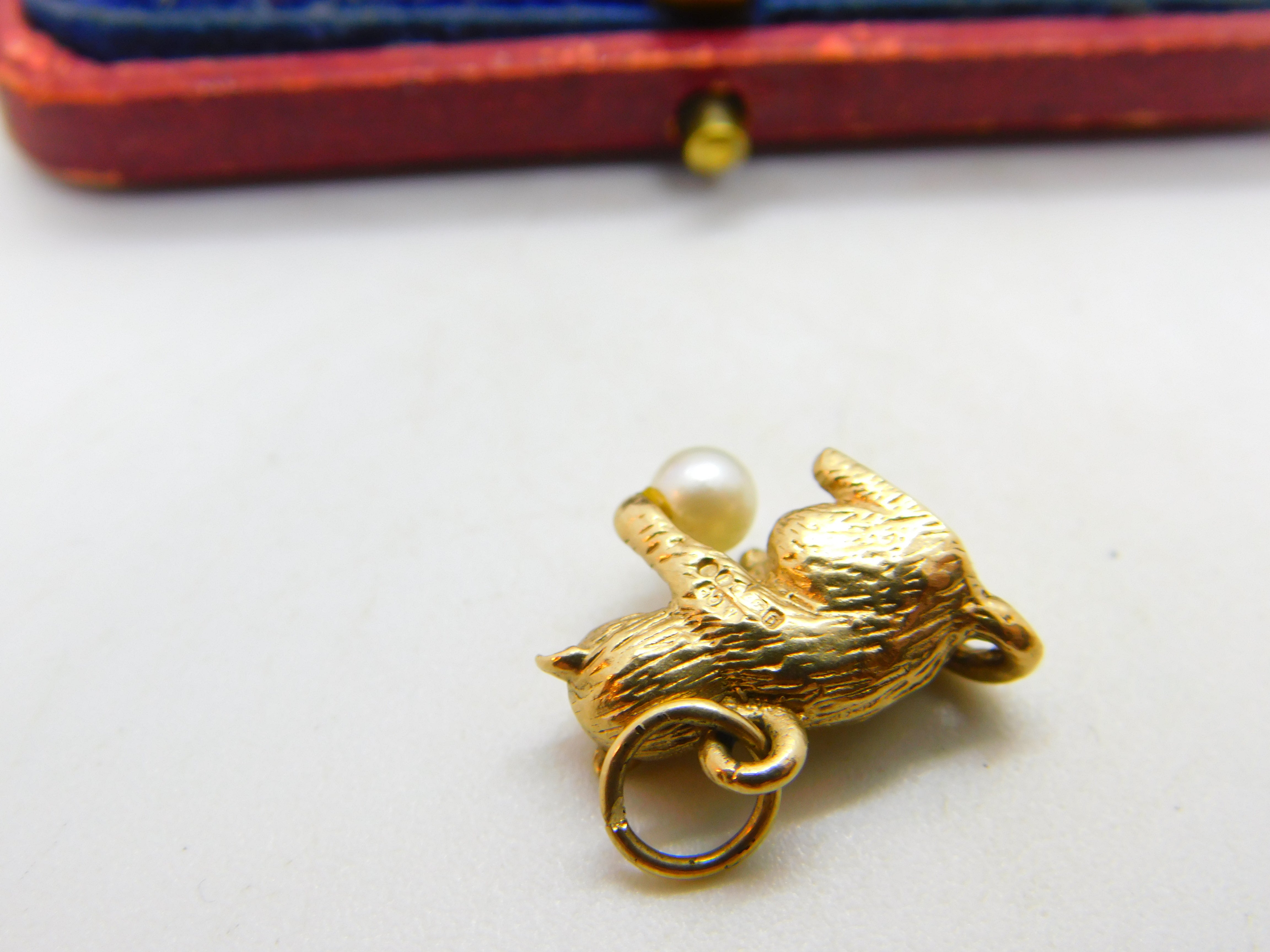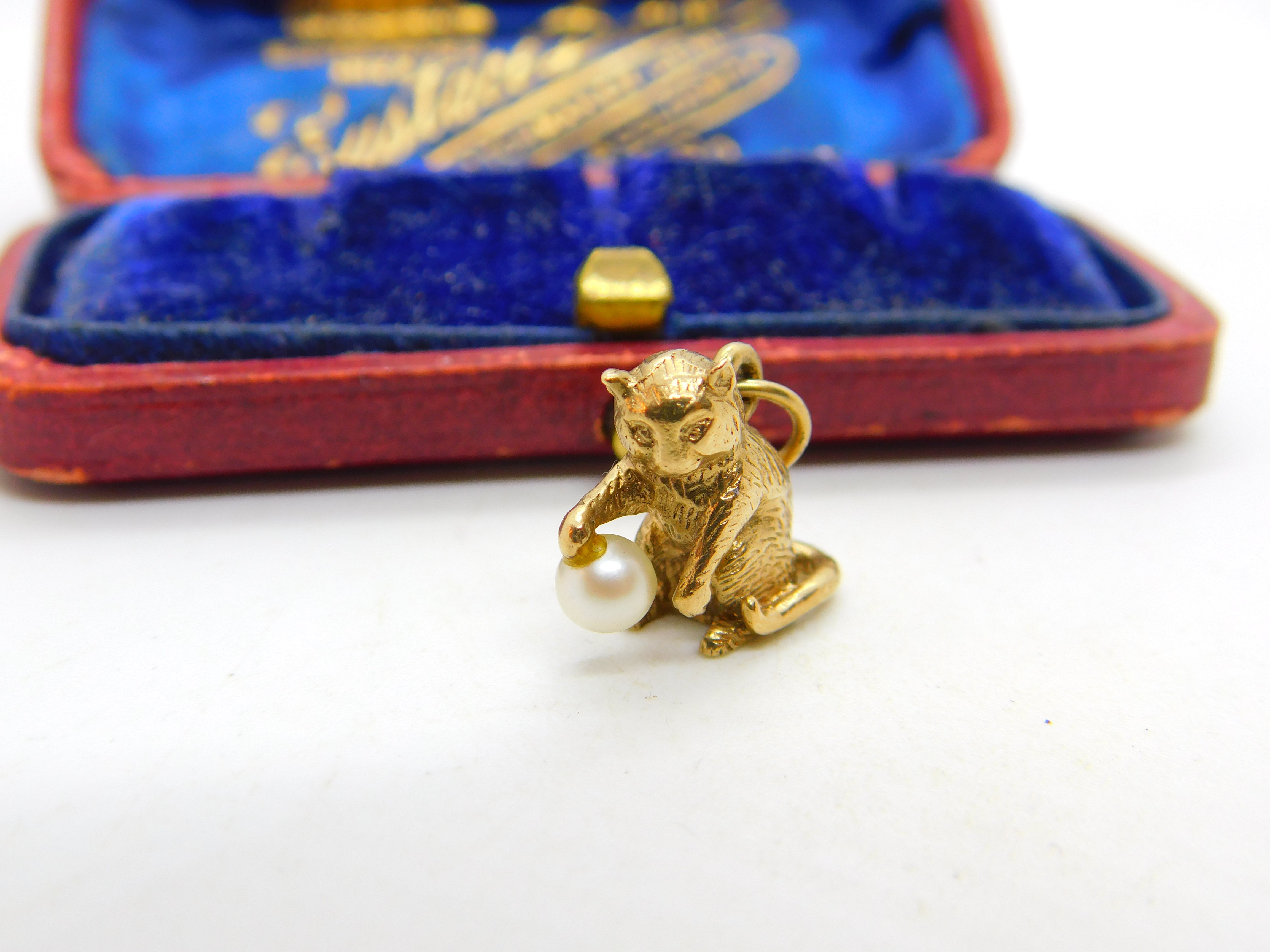 Details: A fantastic and wonderfully designed vintage 9ct yellow gold kitten playing with the ball pearl charm or pendant hallmarked 1966 London. This is a wonderful item that would make a perfect gift or addition to any collection. The BOX pictured is for PRESENTATION ONLY and is NOT included in the listings but used to frame the pictures unless specifically stated otherwise.