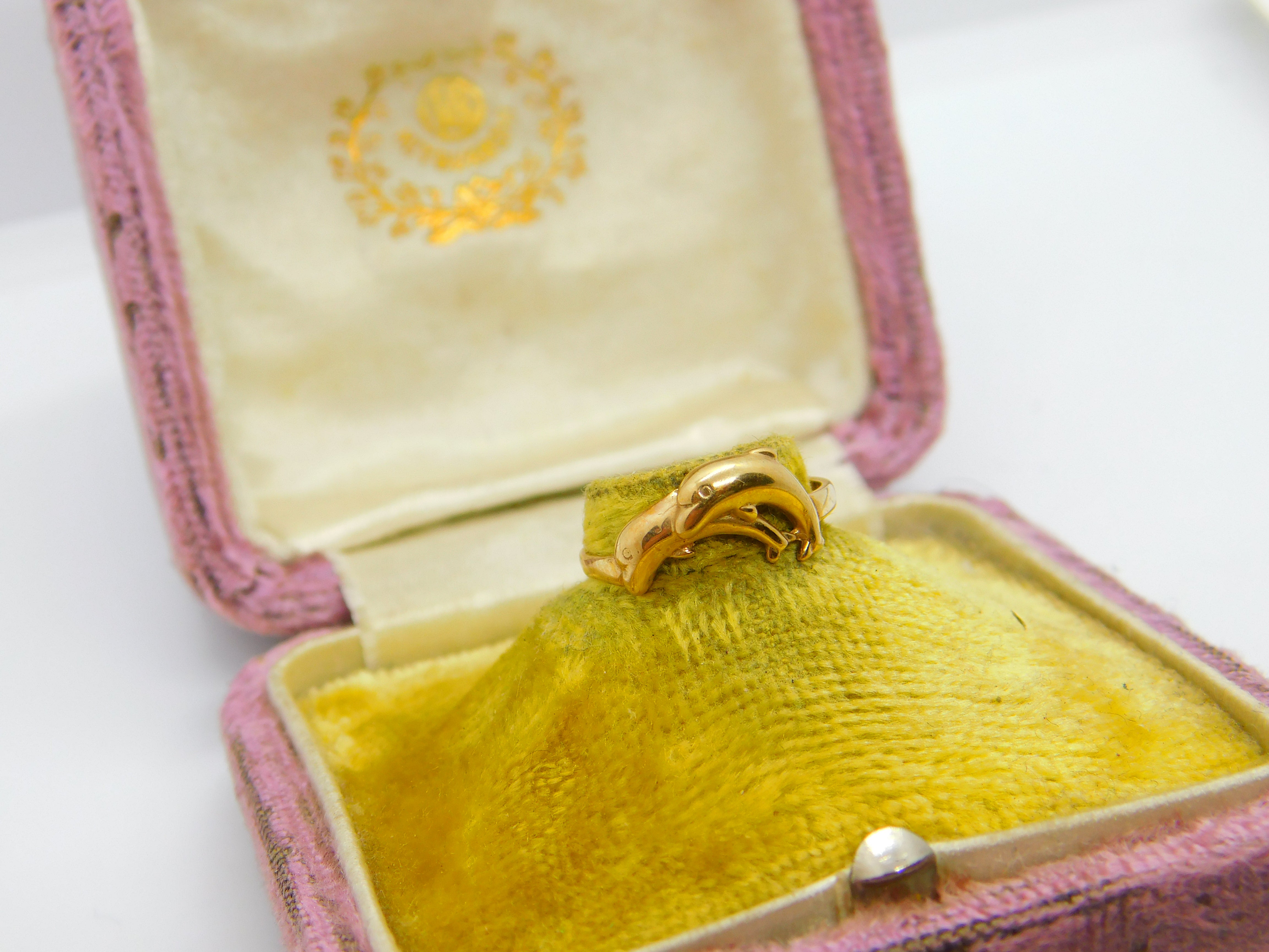 Details: A fantastic and wonderfully designed vintage 9ct yellow gold double dolphin band ring hallmarked Birmingham c1970 to the interior band c1970. This is a wonderful item that would make a perfect gift or addition to any collection. The BOX pictured is for PRESENTATION ONLY and is NOT included in the listings but used to frame the pictures unless specifically stated otherwise.