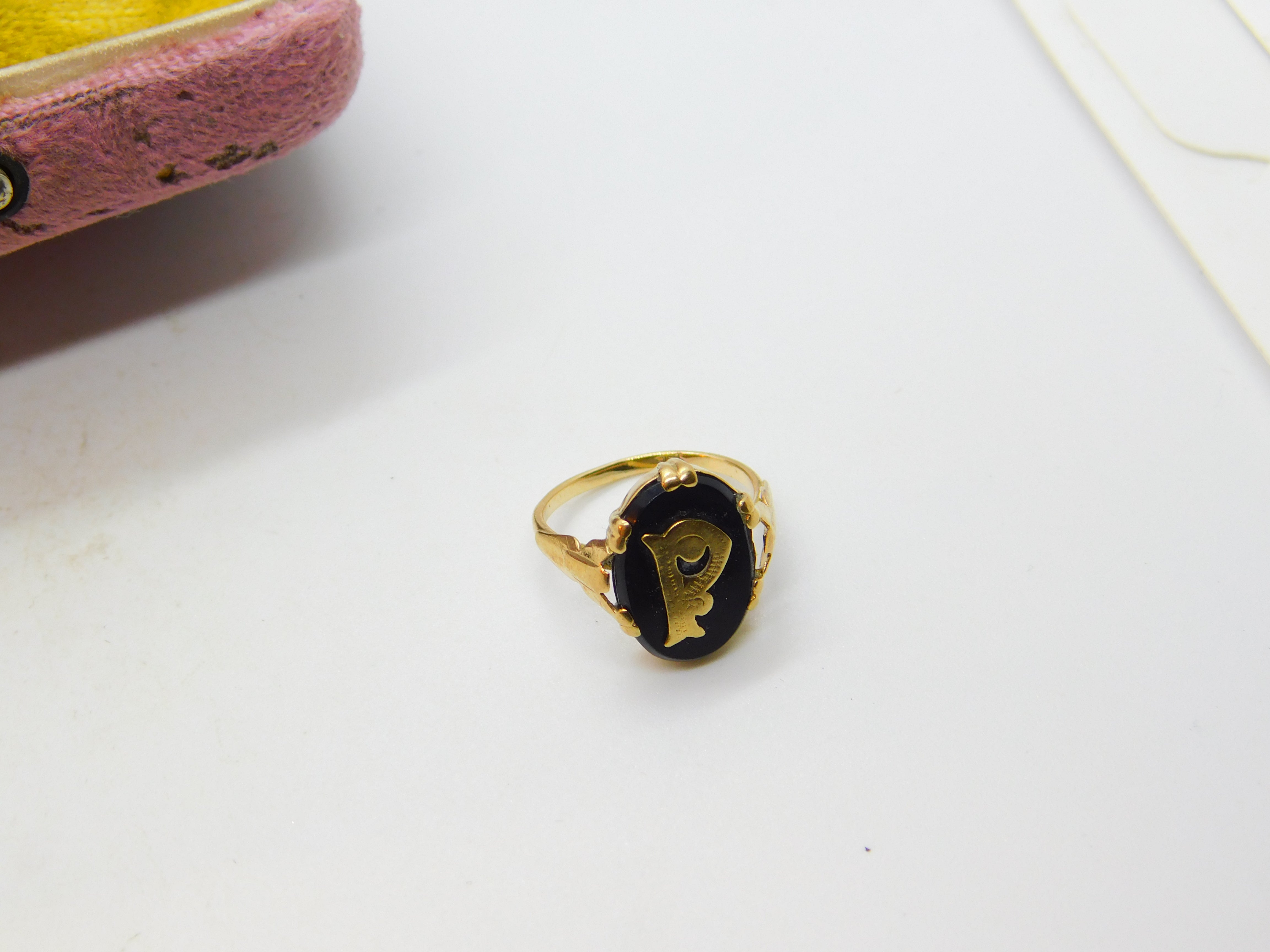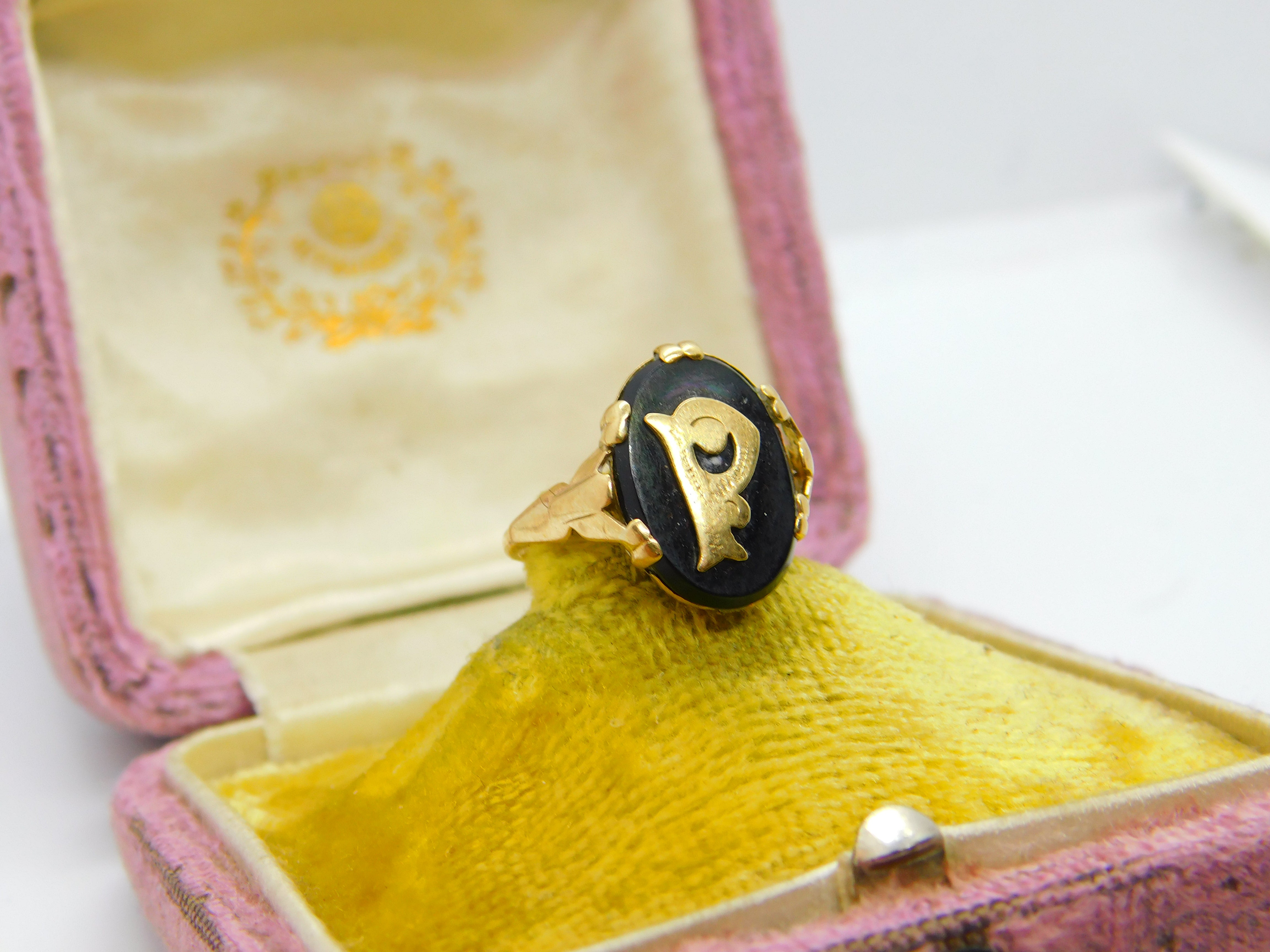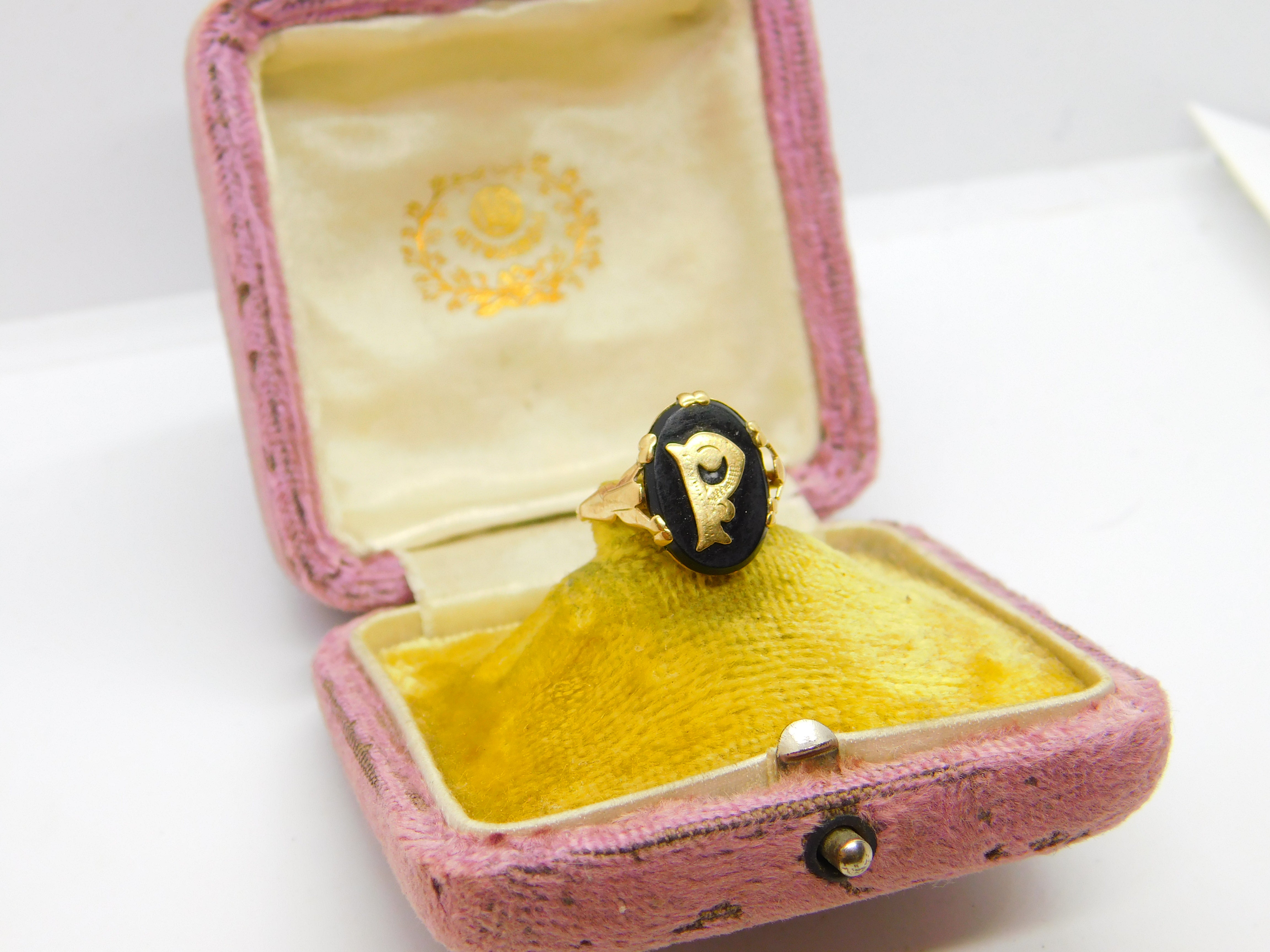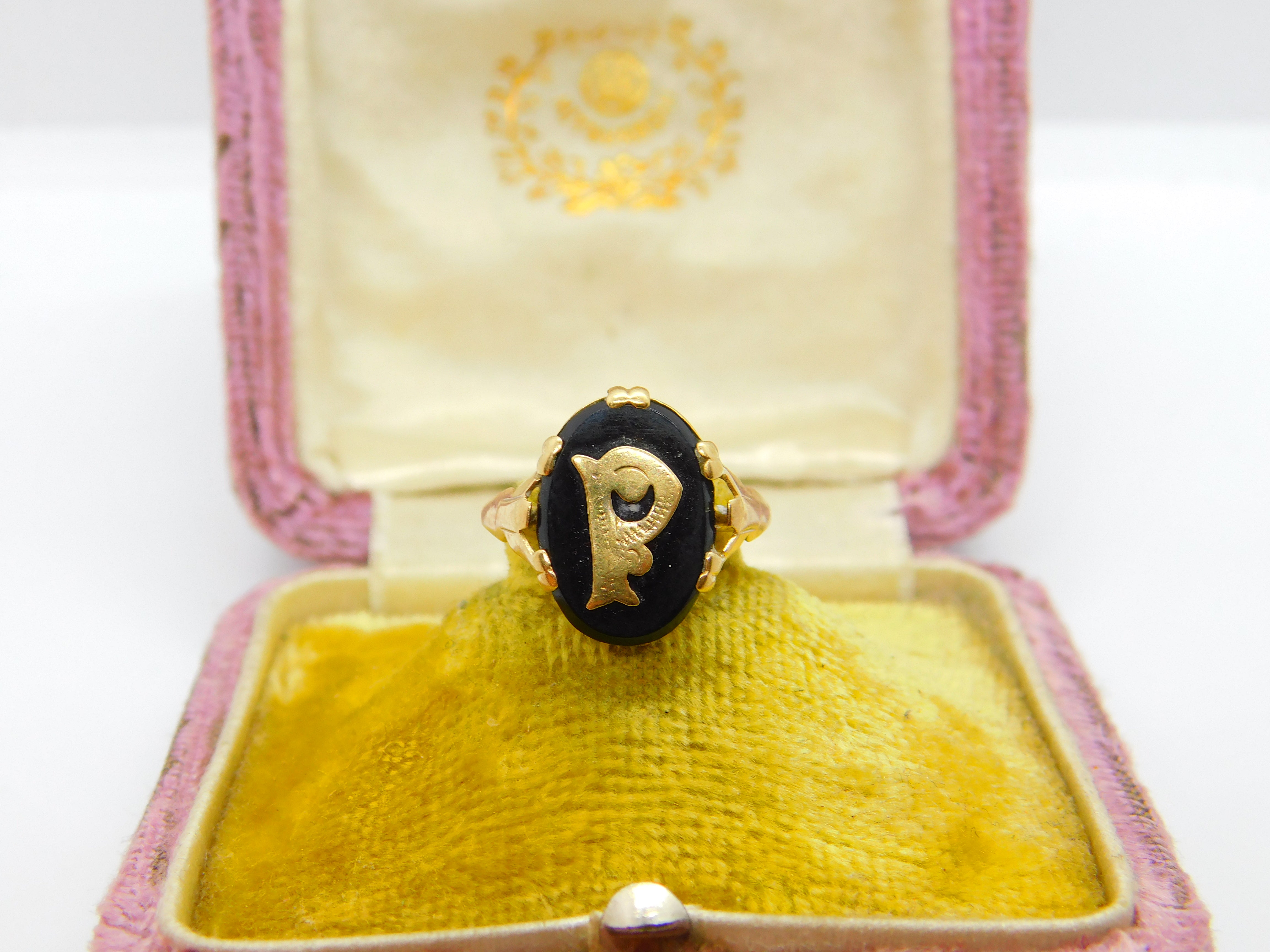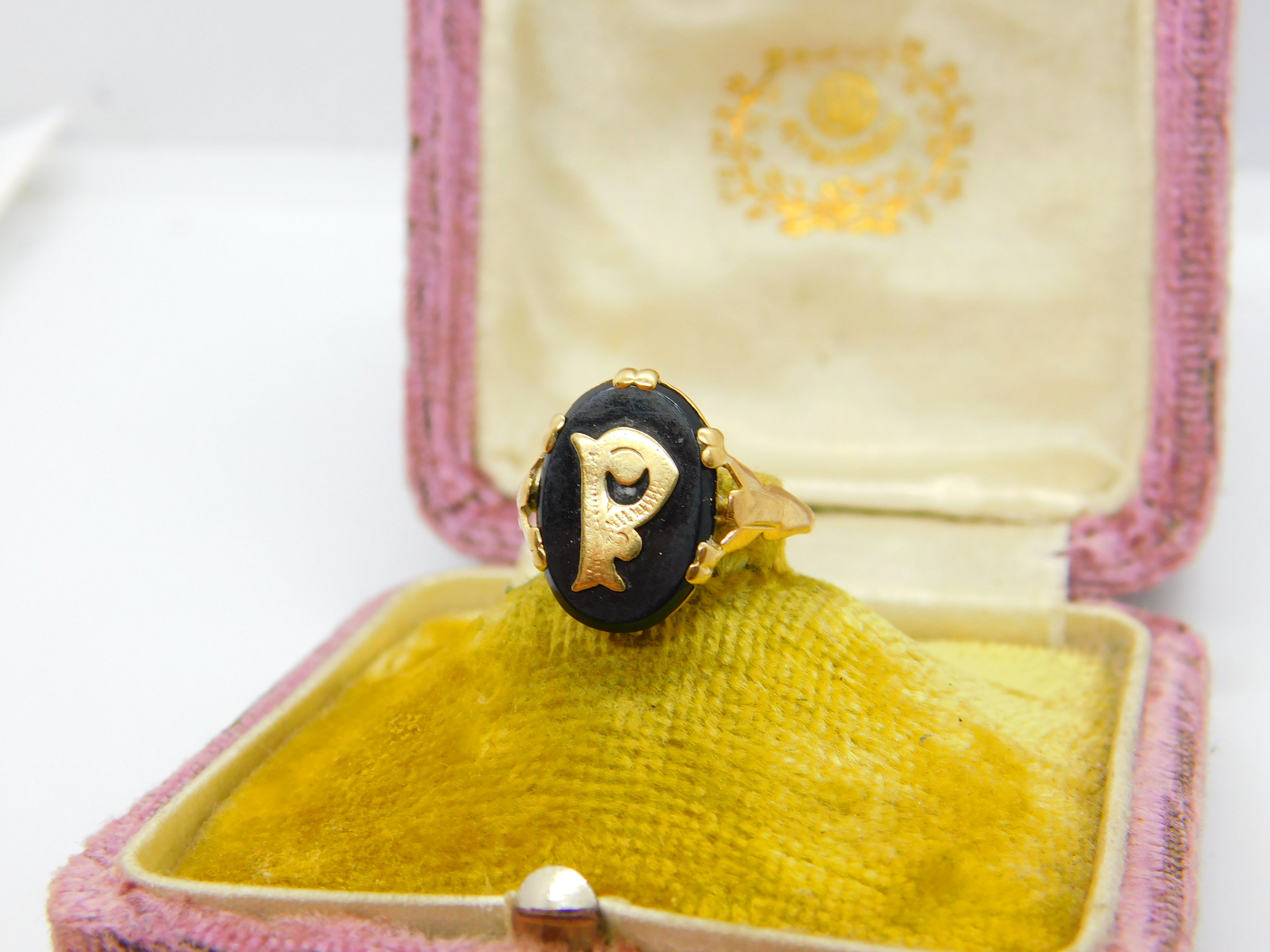 Details: A fantastic and wonderfully designed antique art deco 9ct yellow gold and onyx 'P' initial signet ring hallmarked to the interior band c1920. This is a wonderful item that would make a perfect gift or addition to any collection. The BOX pictured is for PRESENTATION ONLY and is NOT included in the listings but used to frame the pictures unless specifically stated otherwise.