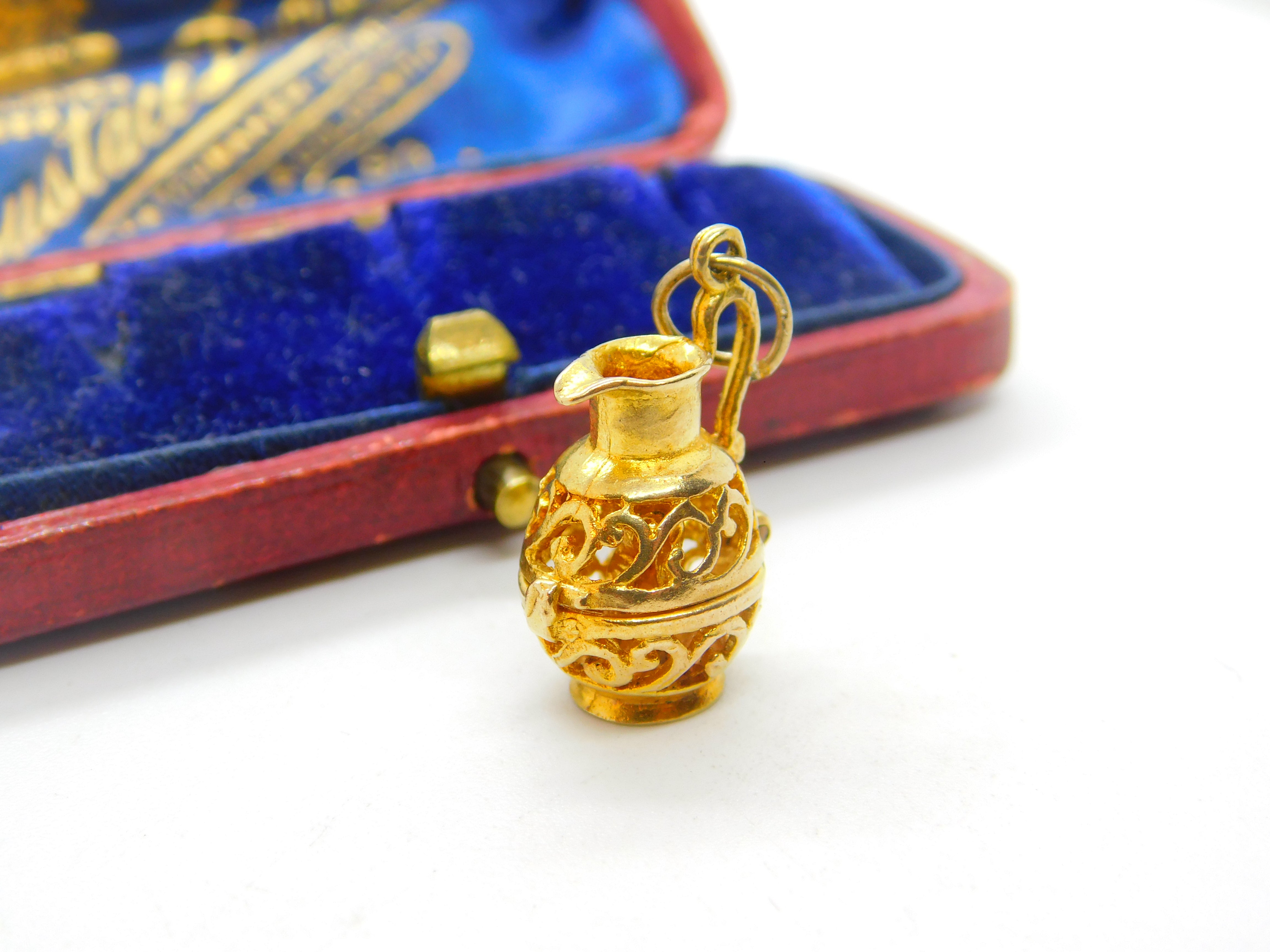 Details: A fantastic and wonderfully designed vintage 9ct yellow gold opening wine jug charm or pendant revealing a lady to the inside hallmarked Birmingham 1977 to the edge. This is a wonderful item that would make a perfect gift or addition to any collection. The BOX pictured is for PRESENTATION ONLY and is NOT included in the listings but used to frame the pictures unless specifically stated otherwise.