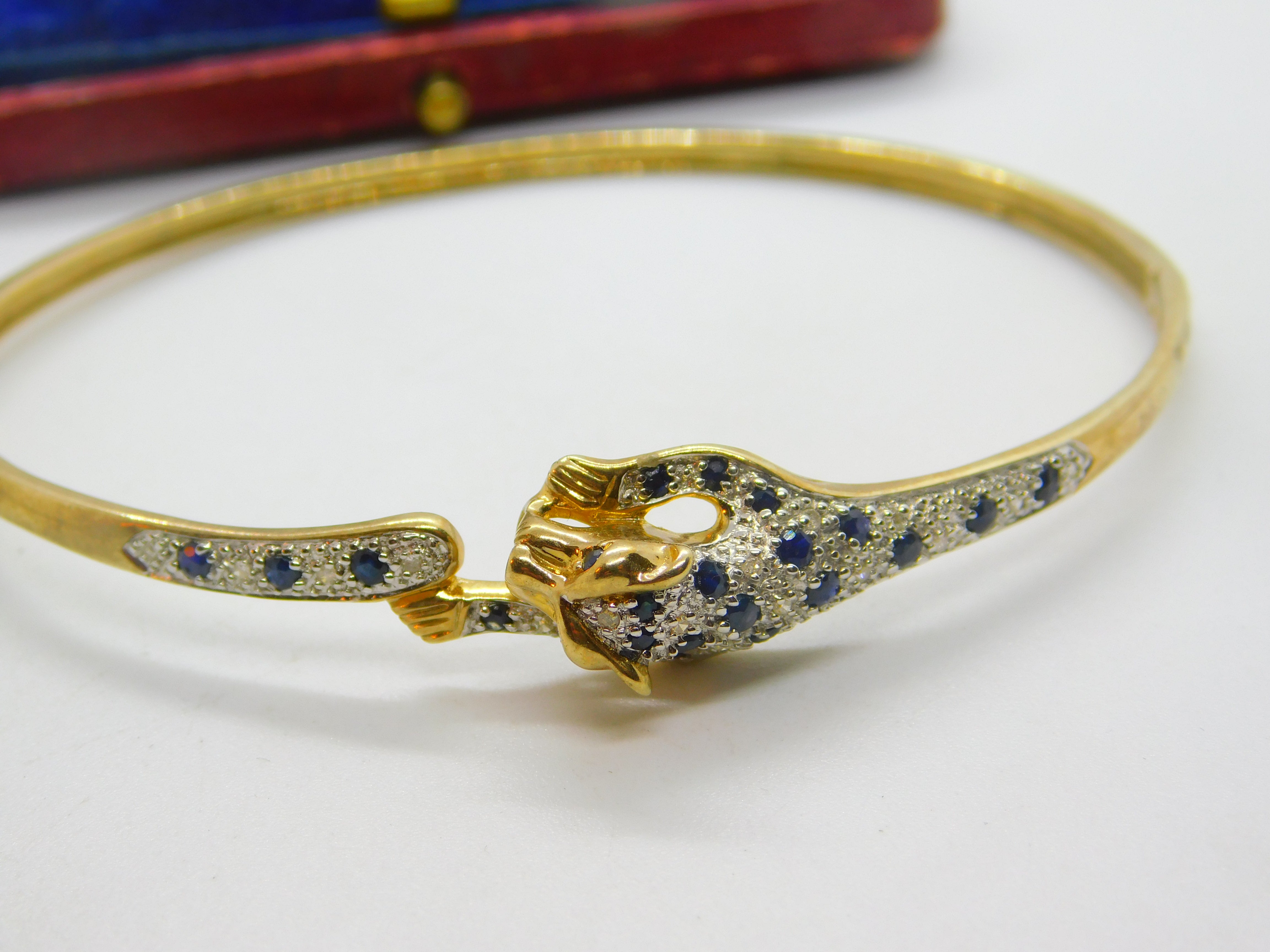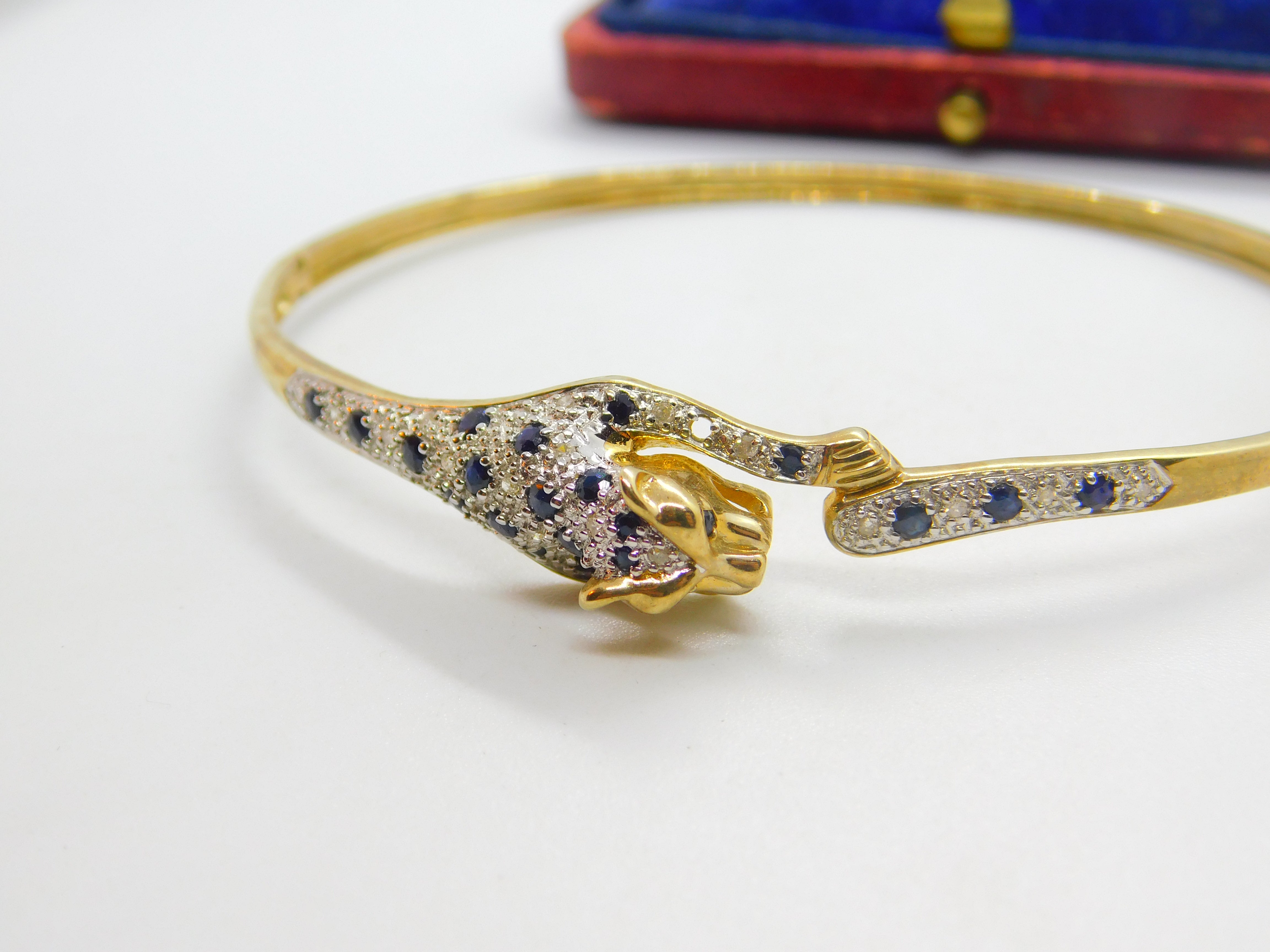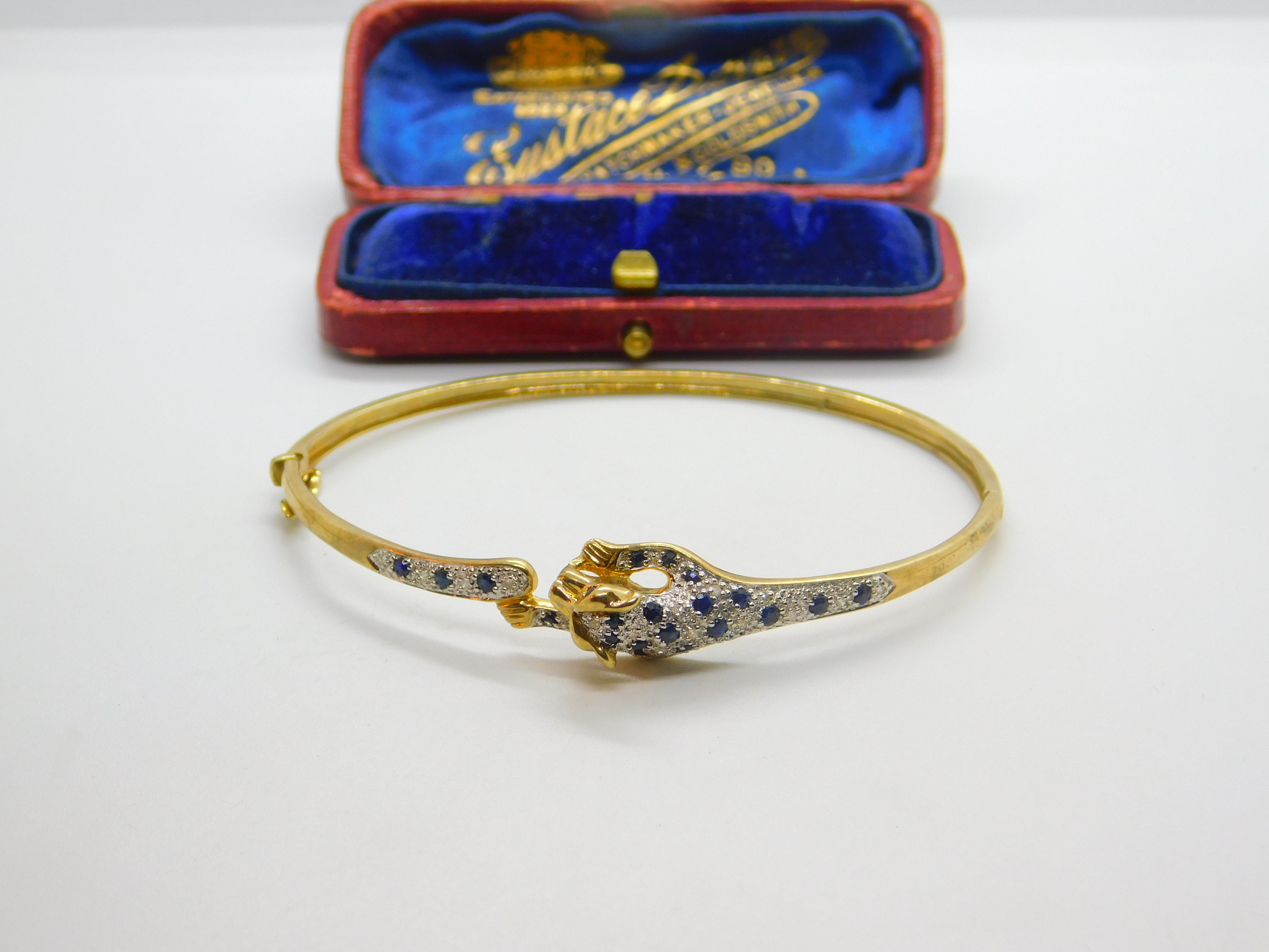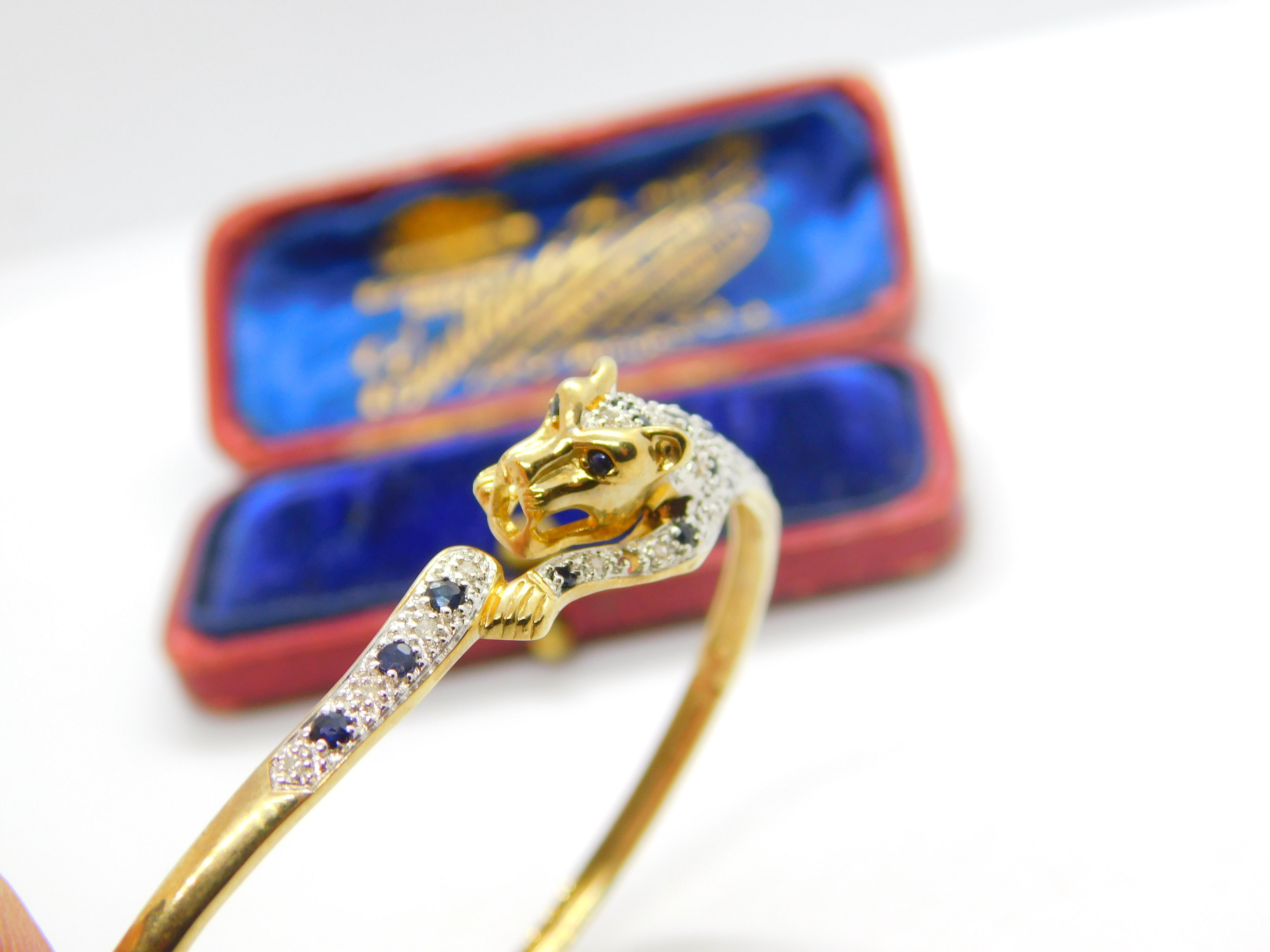9ct Yellow Gold, Pave Set Sapphire & Diamond Leaping Panther Bangle Bracelet