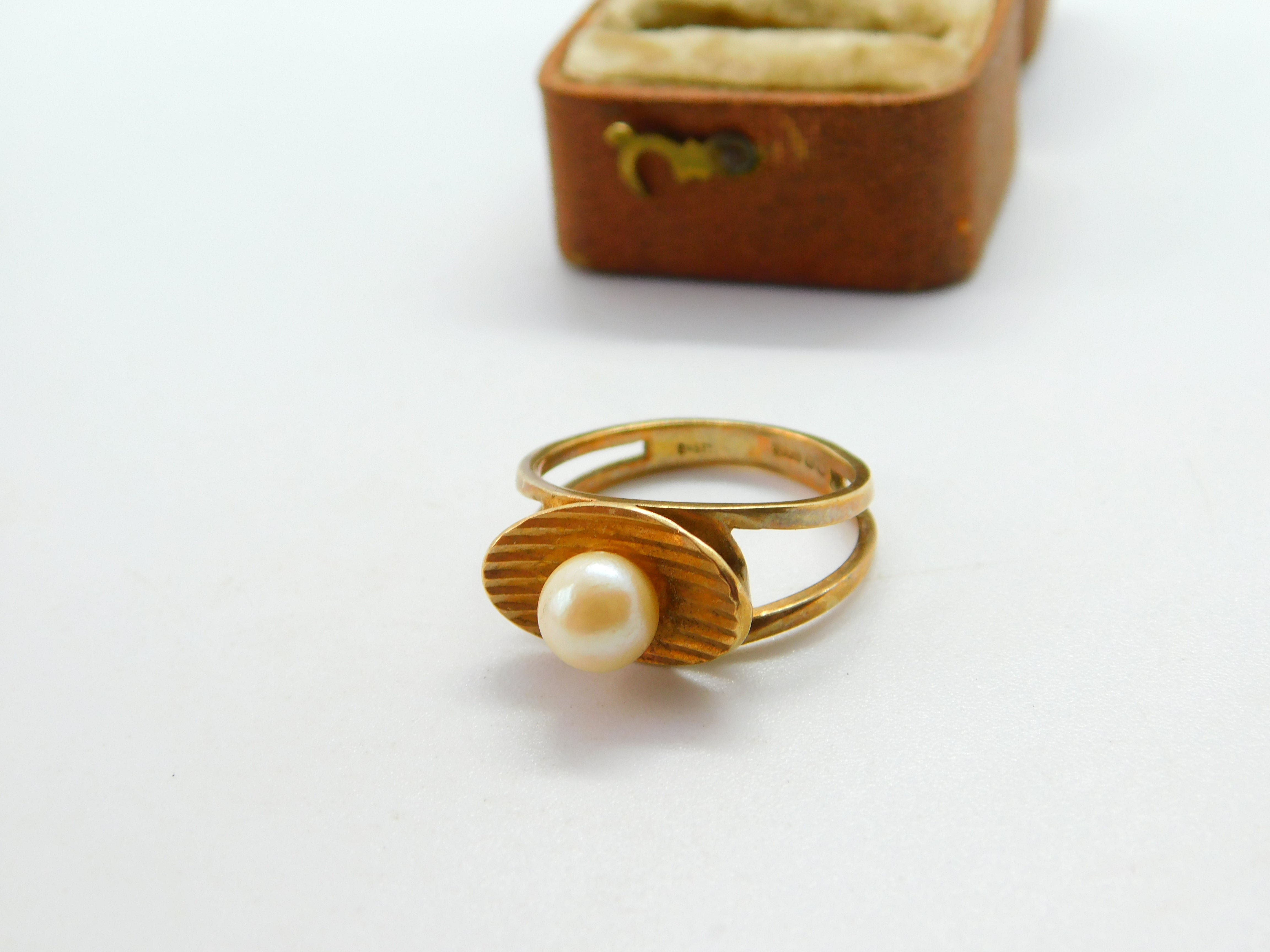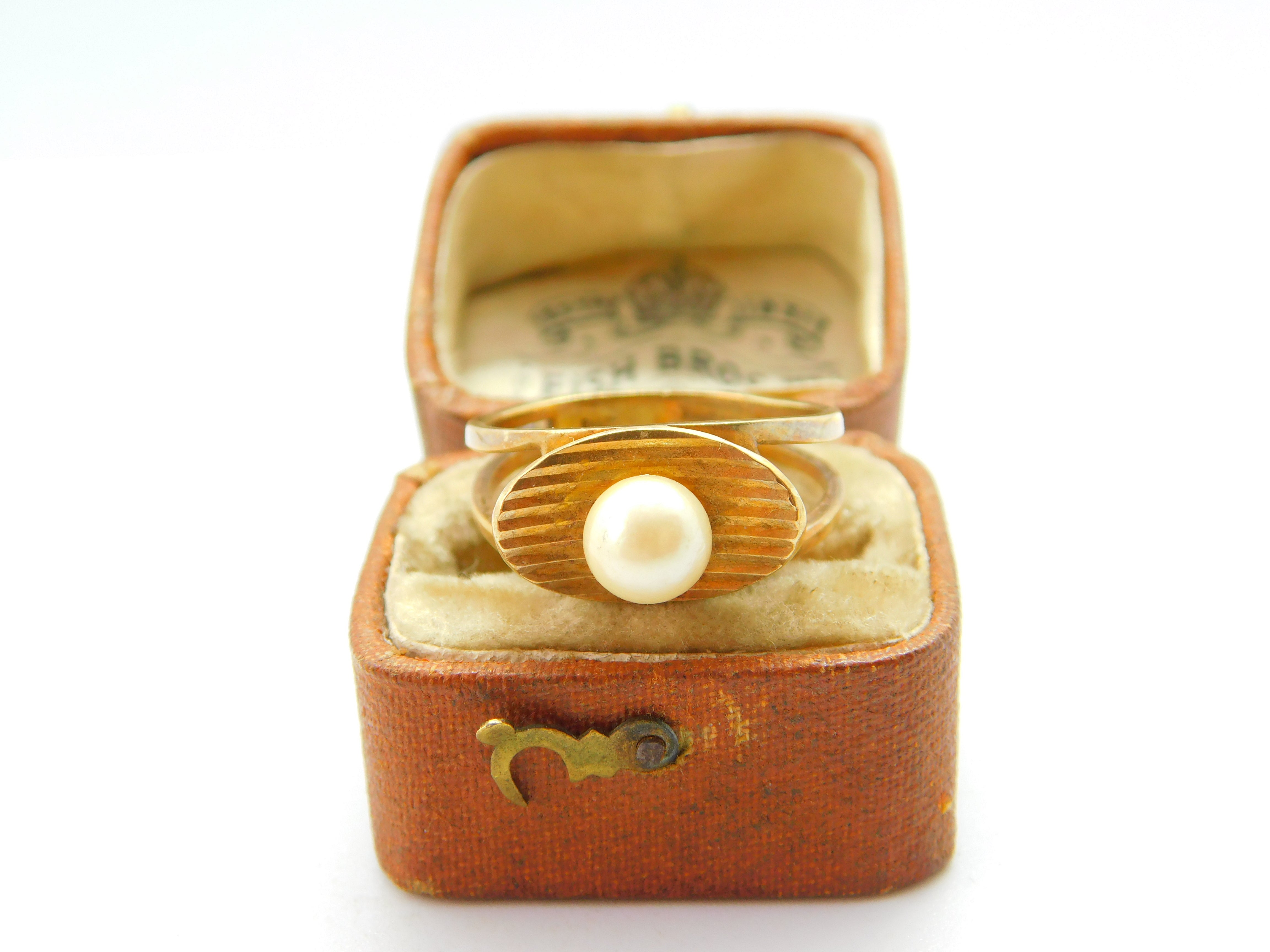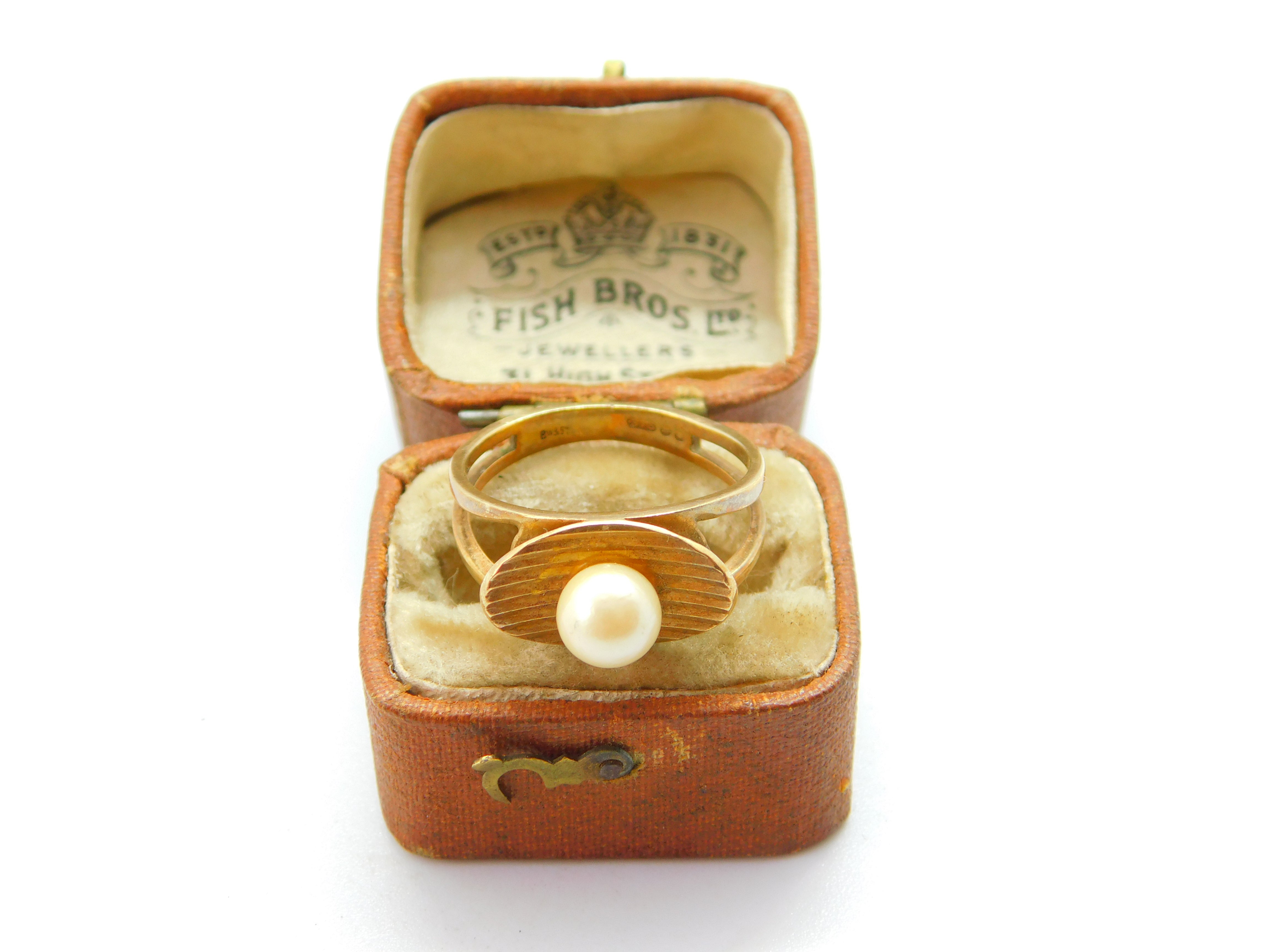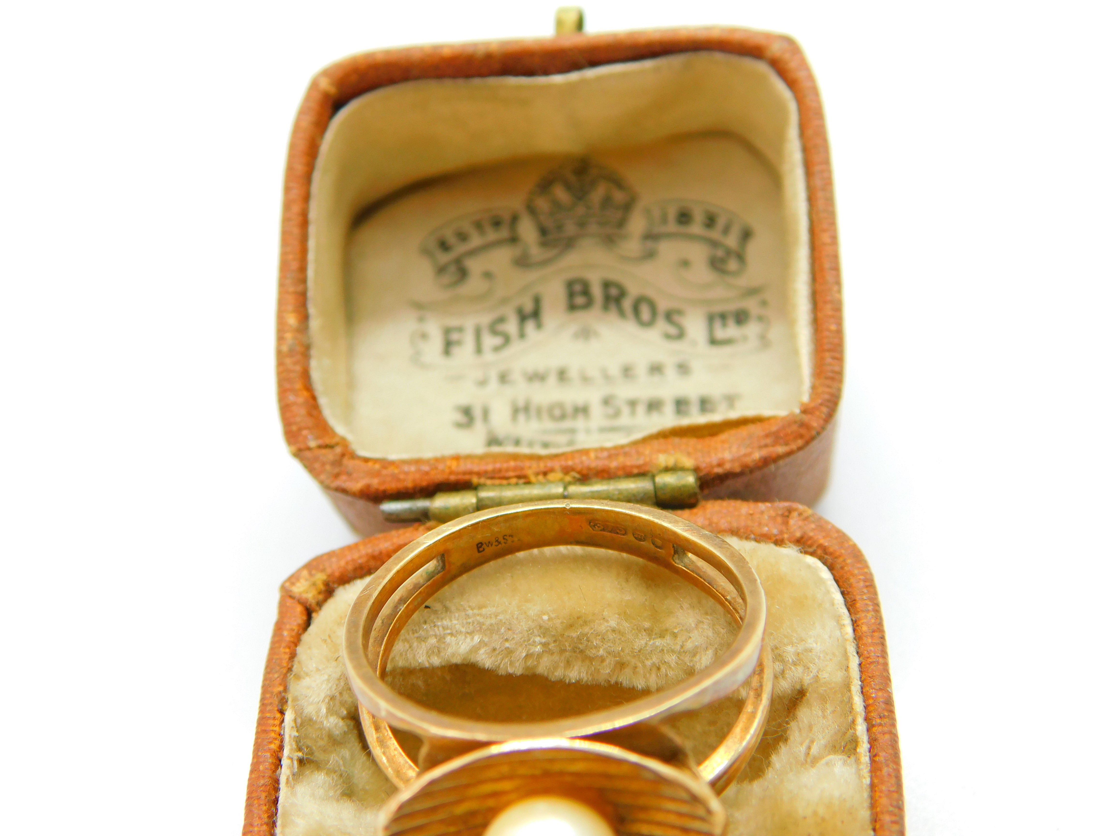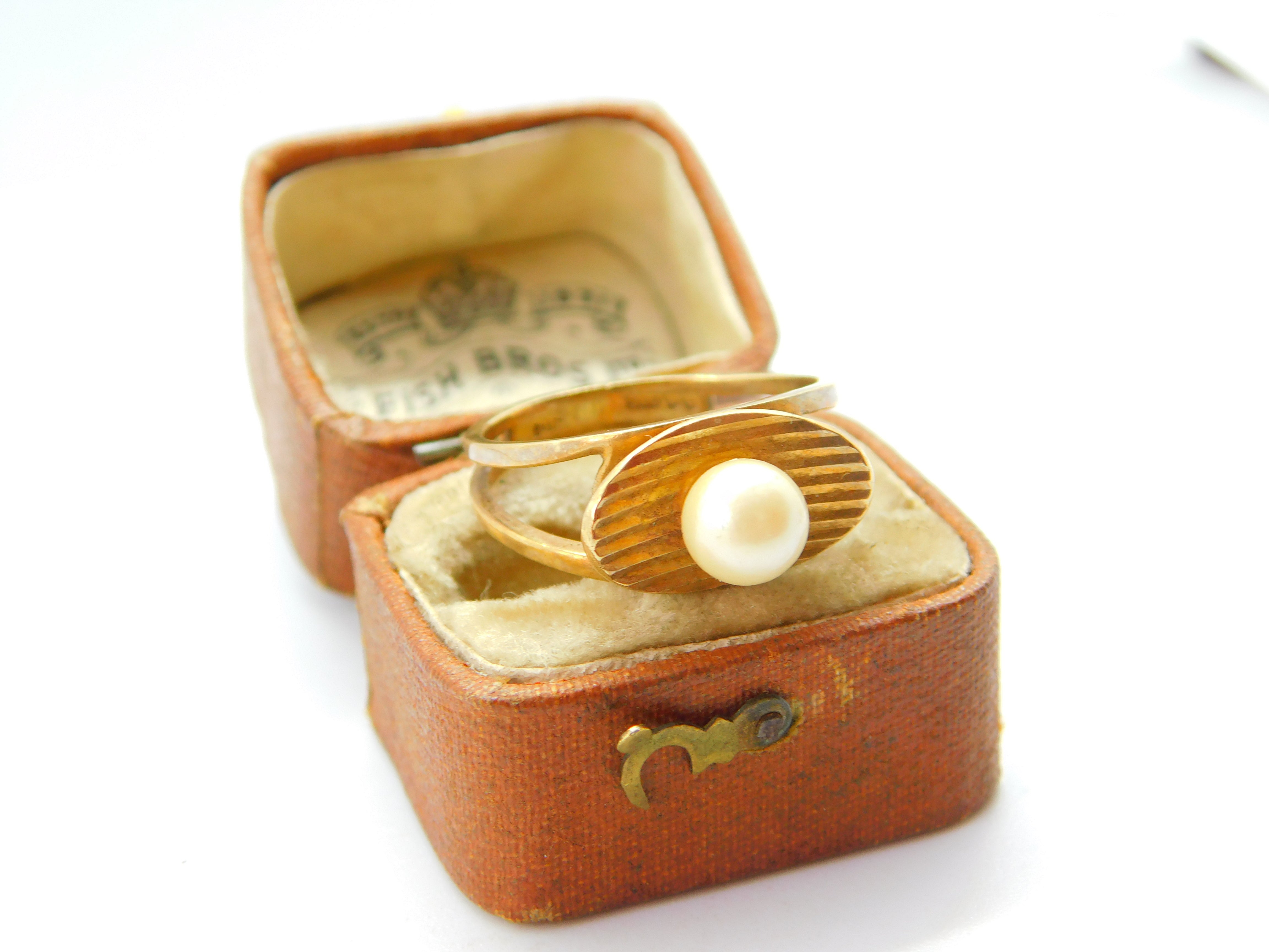 Details: A fantastic and wonderfully designed vintage 9ct yellow gold modernist statement style ring set with pearl to the centre hallmarked London 1967 to the interior band. This is a wonderful item that would make a perfect gift or addition to any collection. The BOX pictured is for PRESENTATION ONLY and is NOT included in the listings but used to frame the pictures unless specifically stated otherwise.