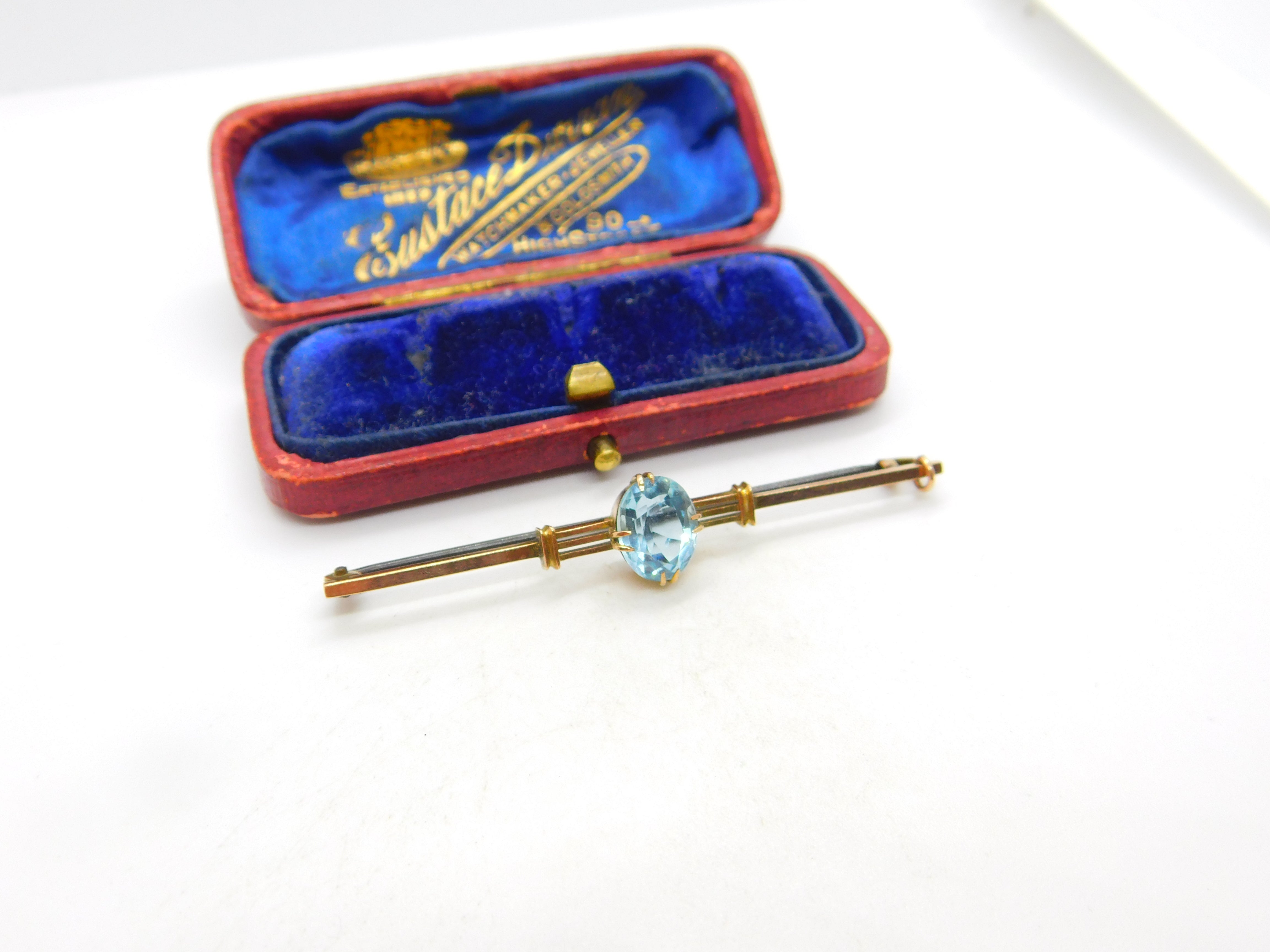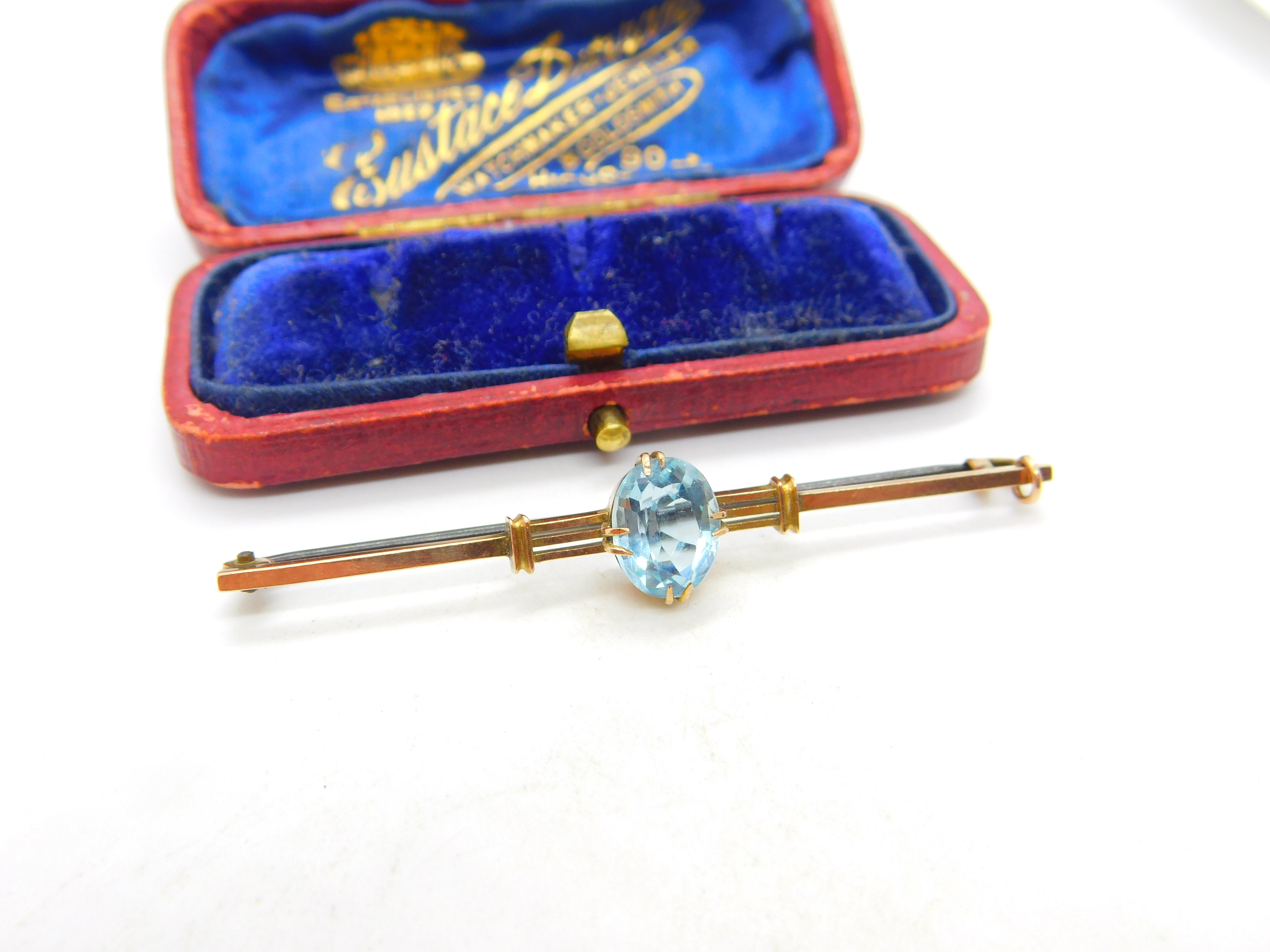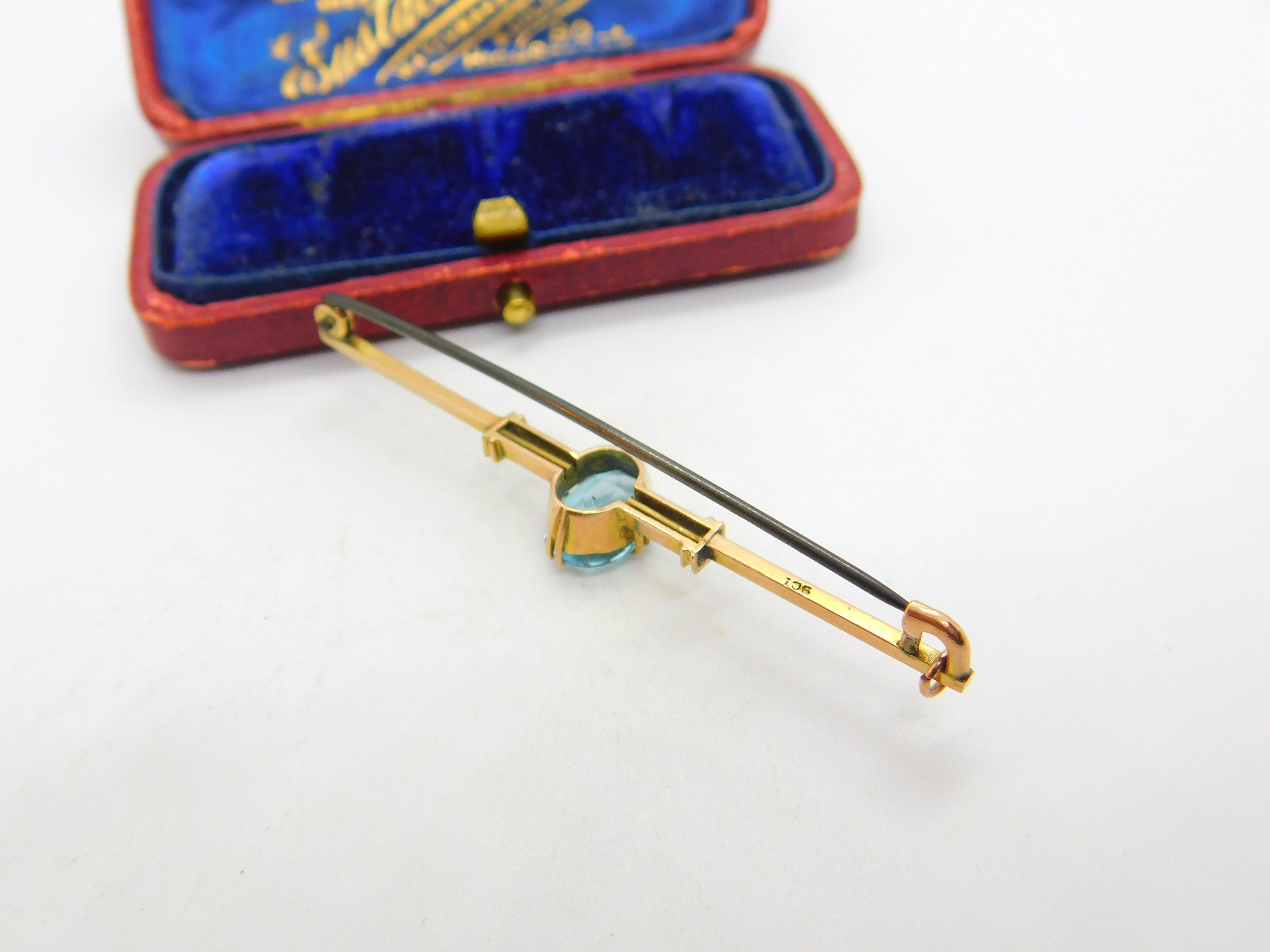 9ct Yellow Gold & Royal Blue Topaz Set Bar Brooch Antique c1920 Art Deco