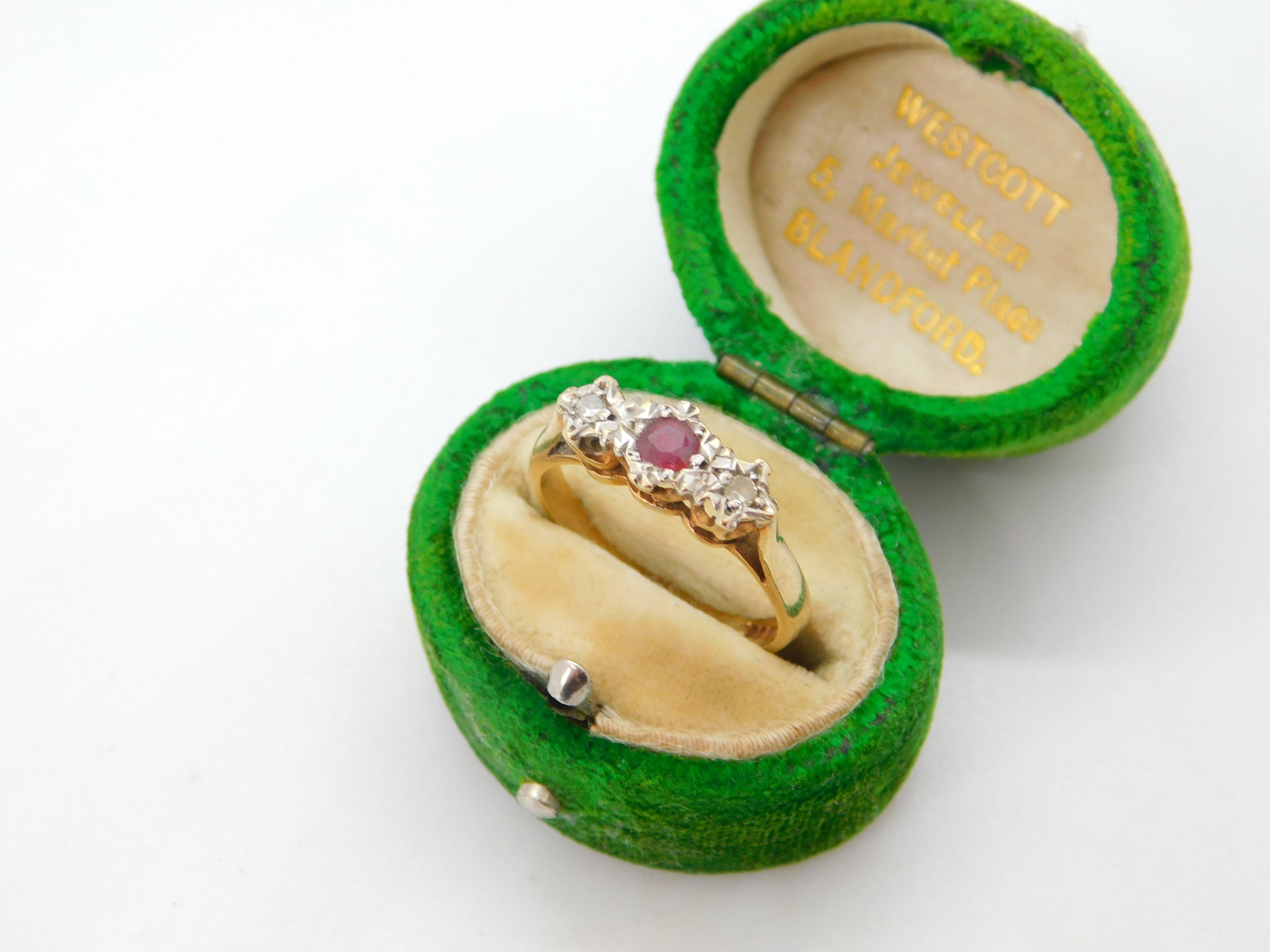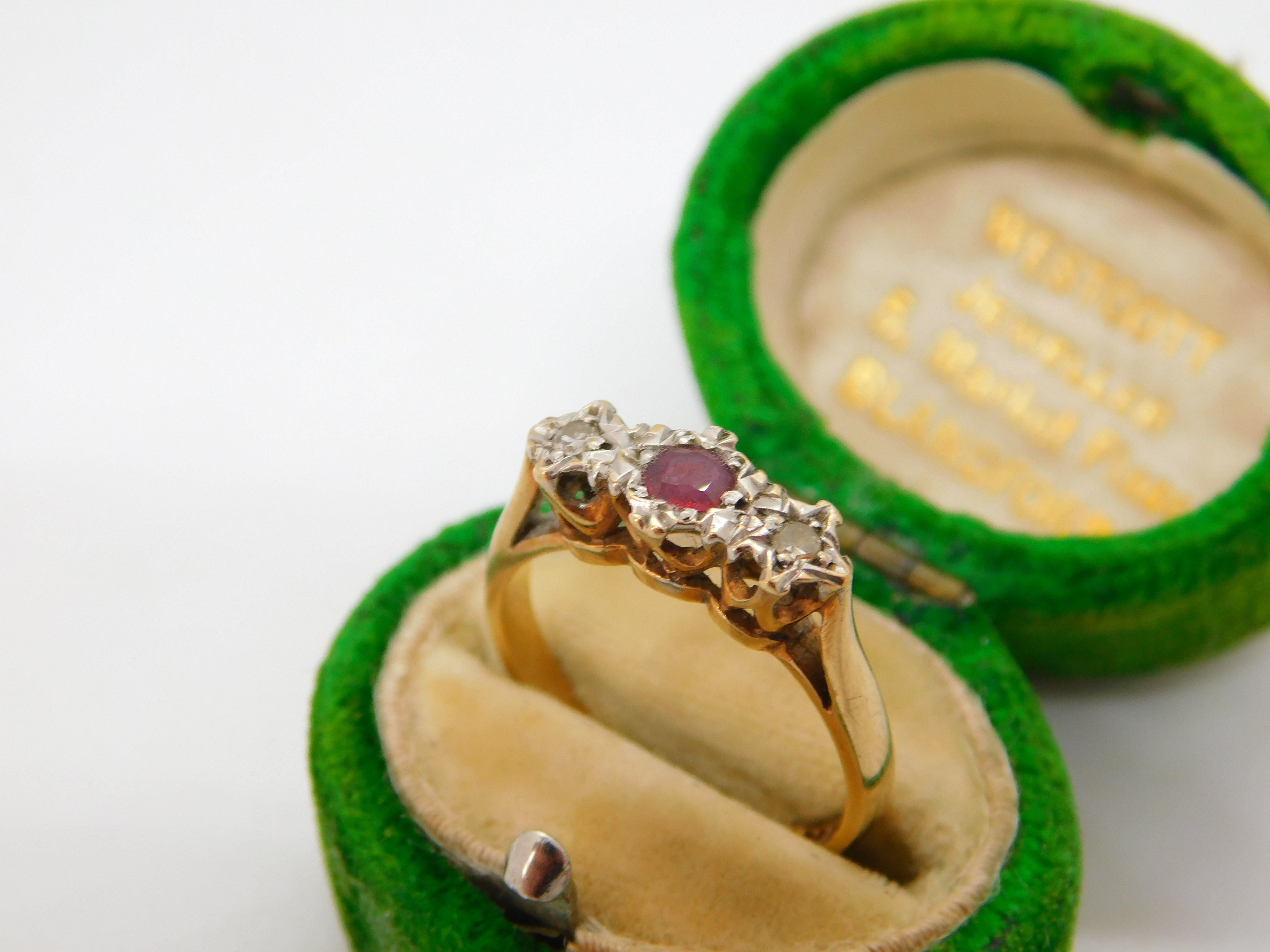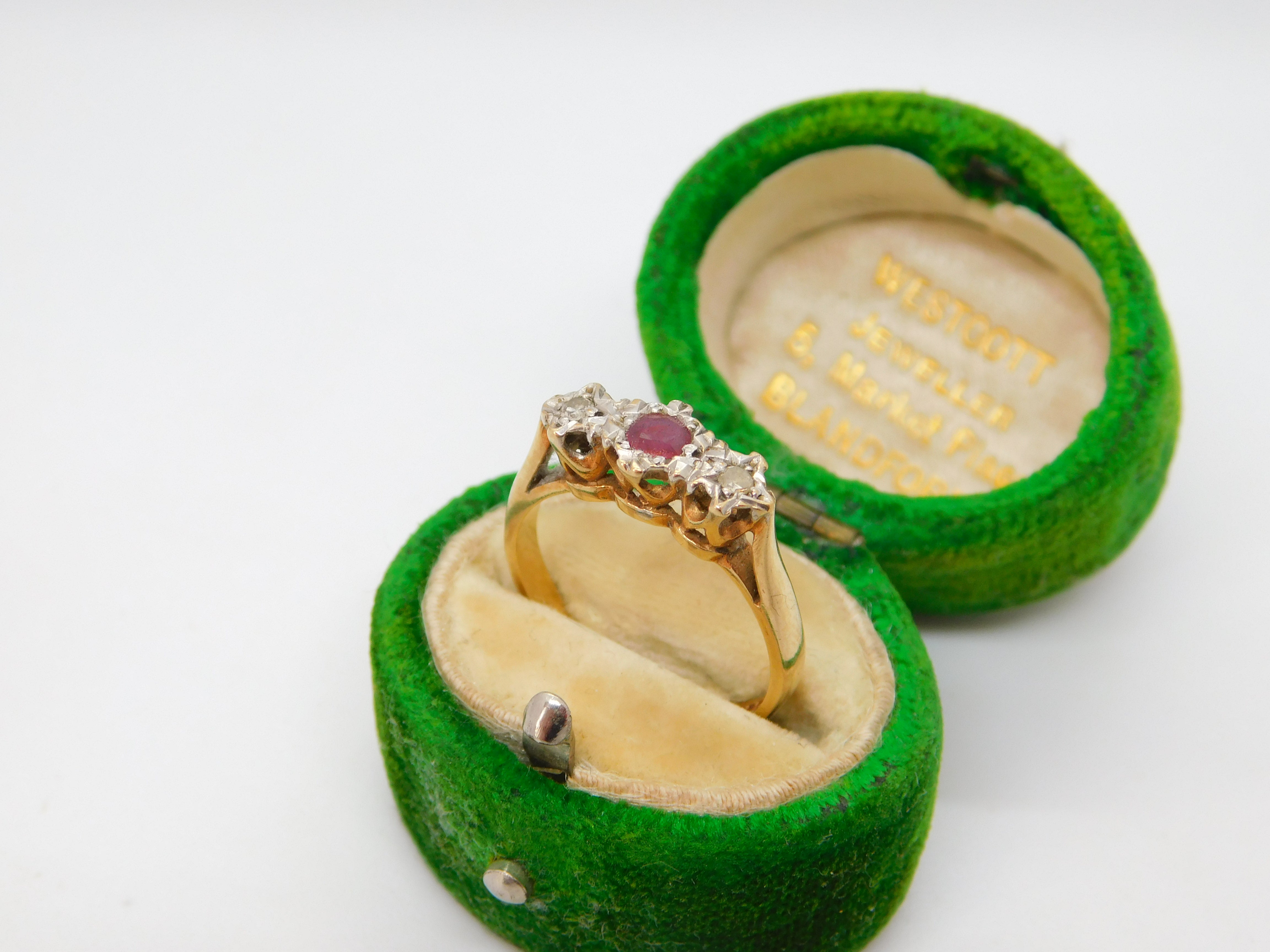 Details: A fantastic and wonderfully designed vintage 9ct yellow gold dress ring set with two diamonds flanking a central ruby hallmarked Birmingham 1977 to the interior. This is a wonderful item that would make a perfect gift or addition to any collection. The BOX pictured is for PRESENTATION ONLY and is NOT included in the listings but used to frame the pictures unless specifically stated otherwise.