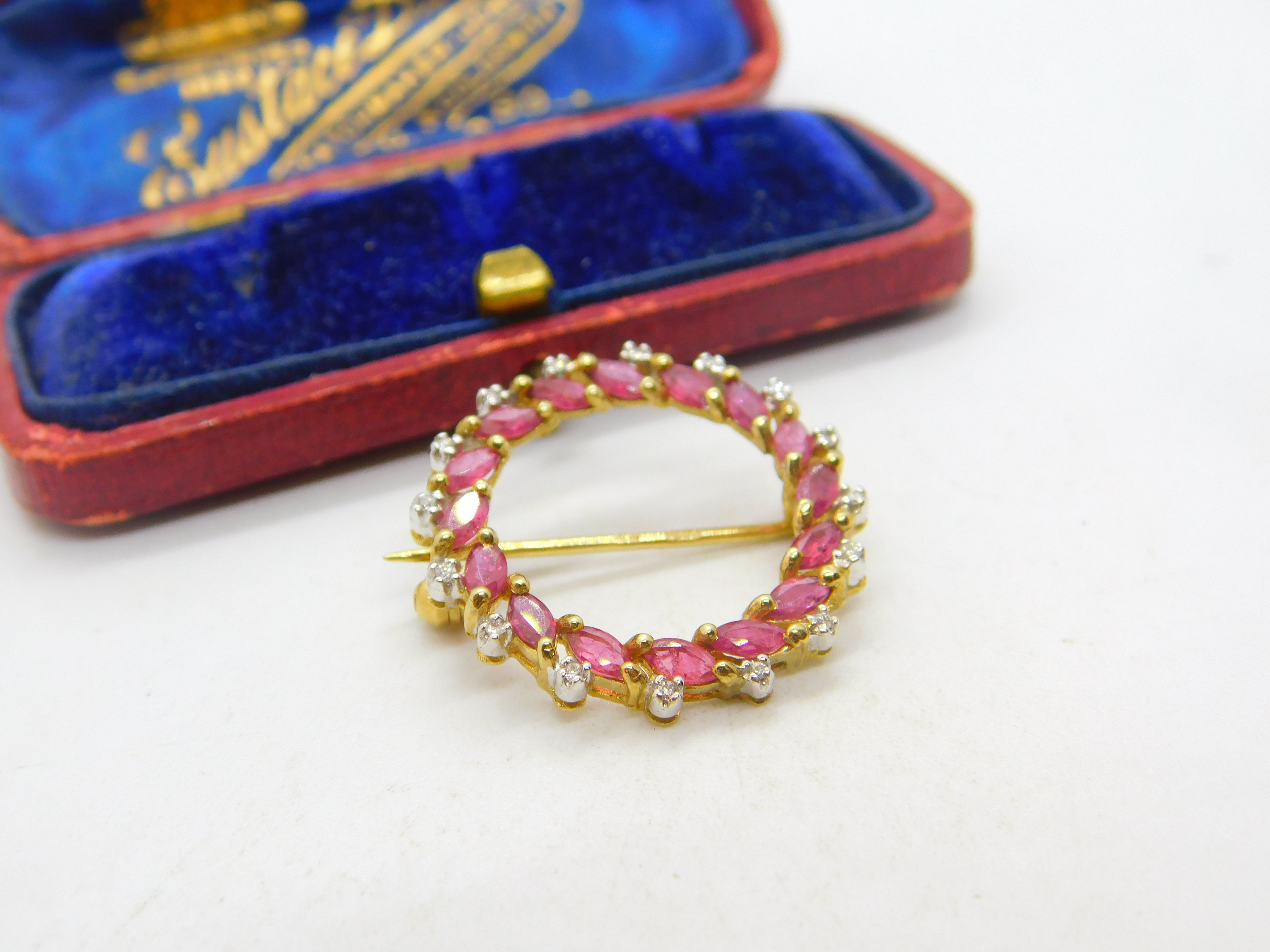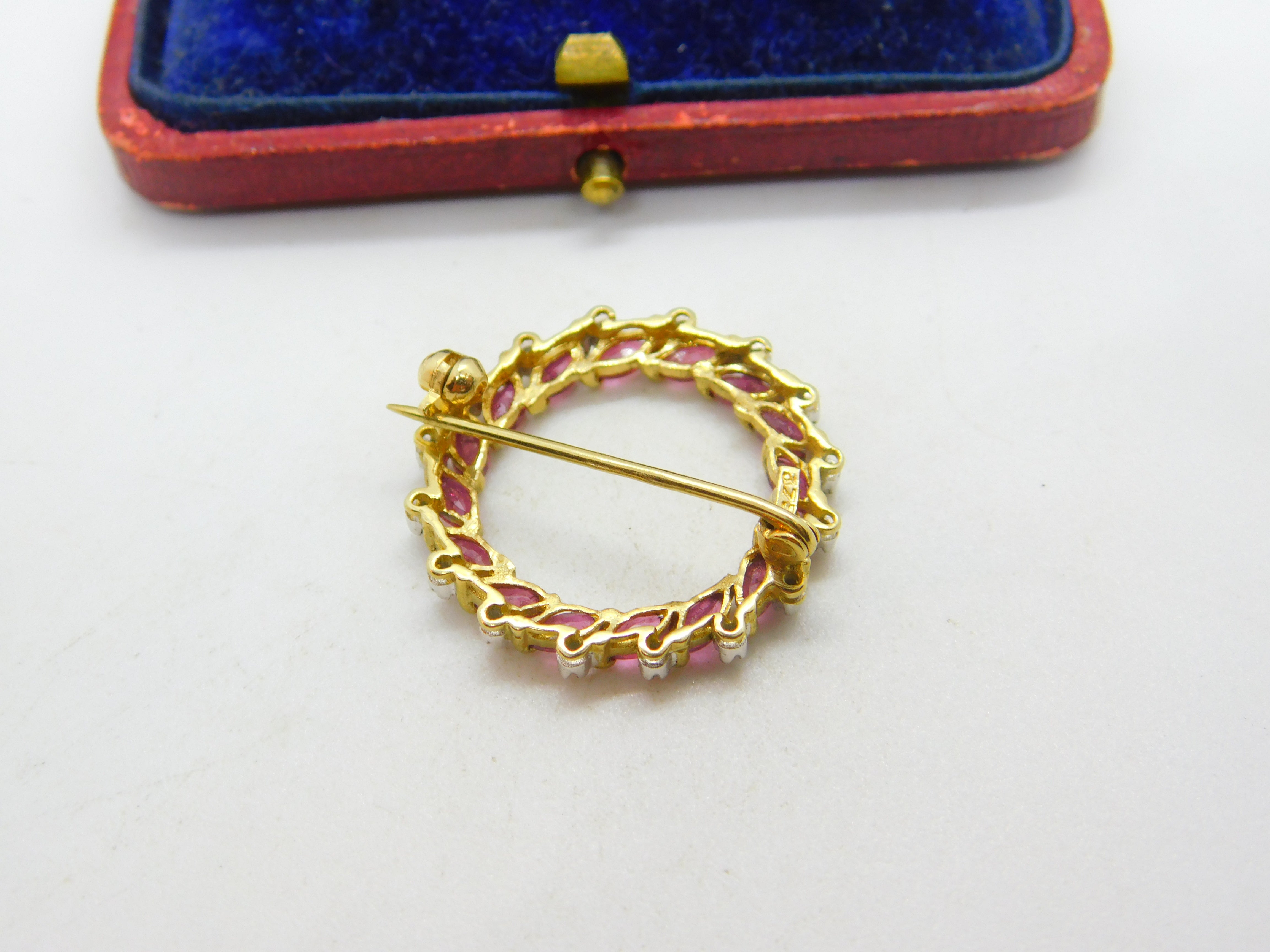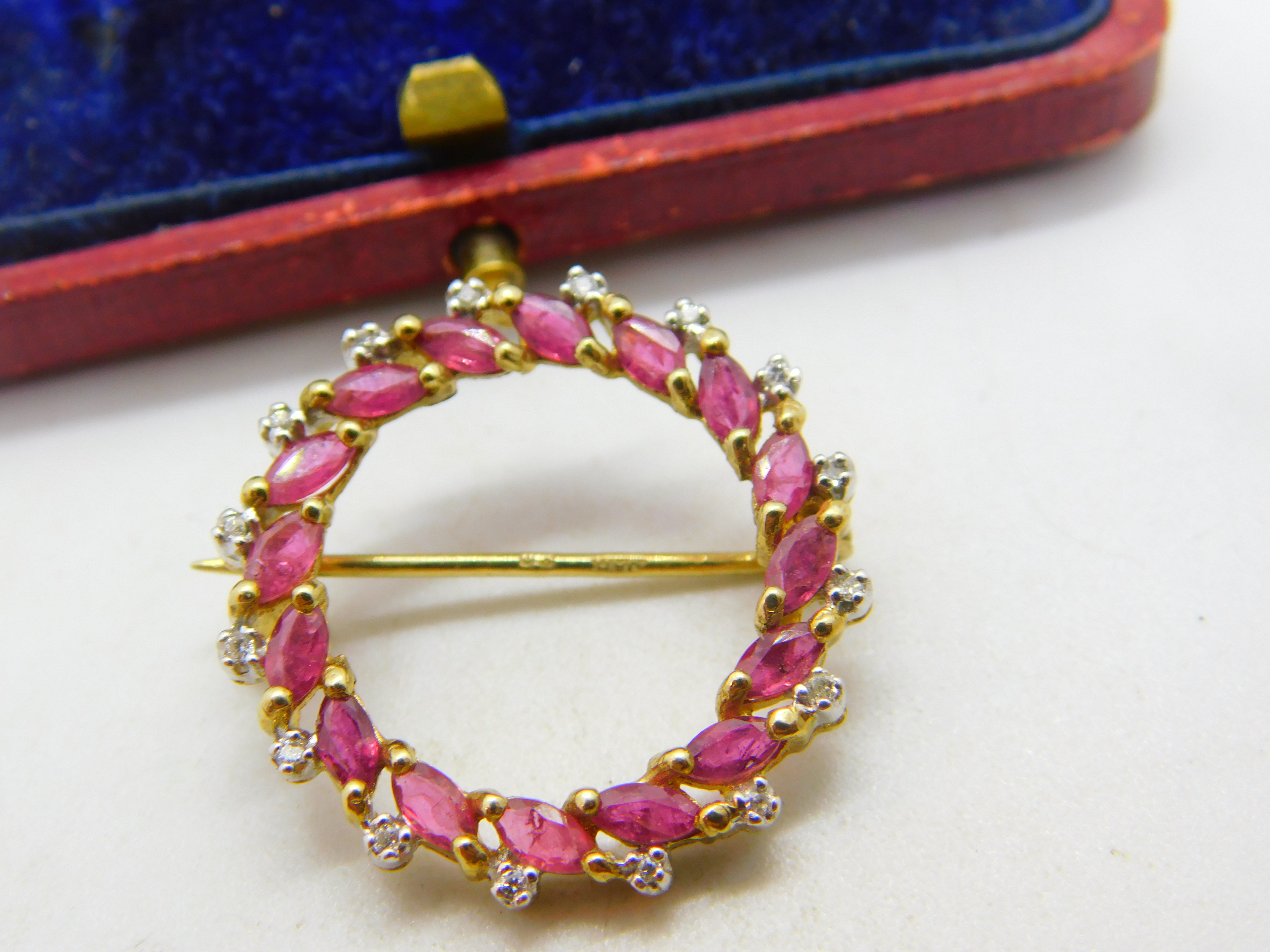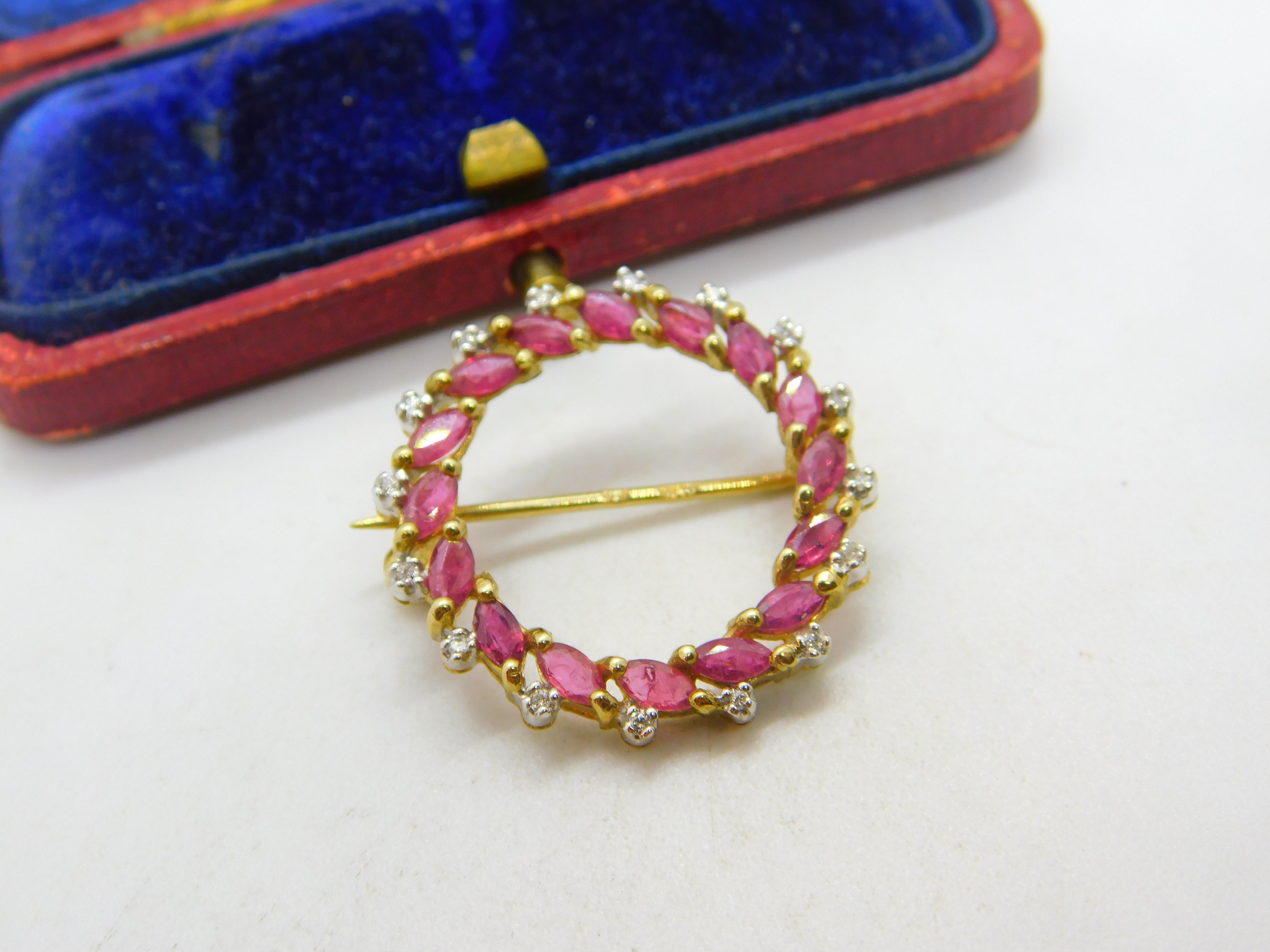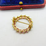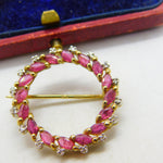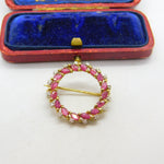 9ct Yellow Gold Ruby & Diamond Wreath Brooch Vintage 1988 Birmingham