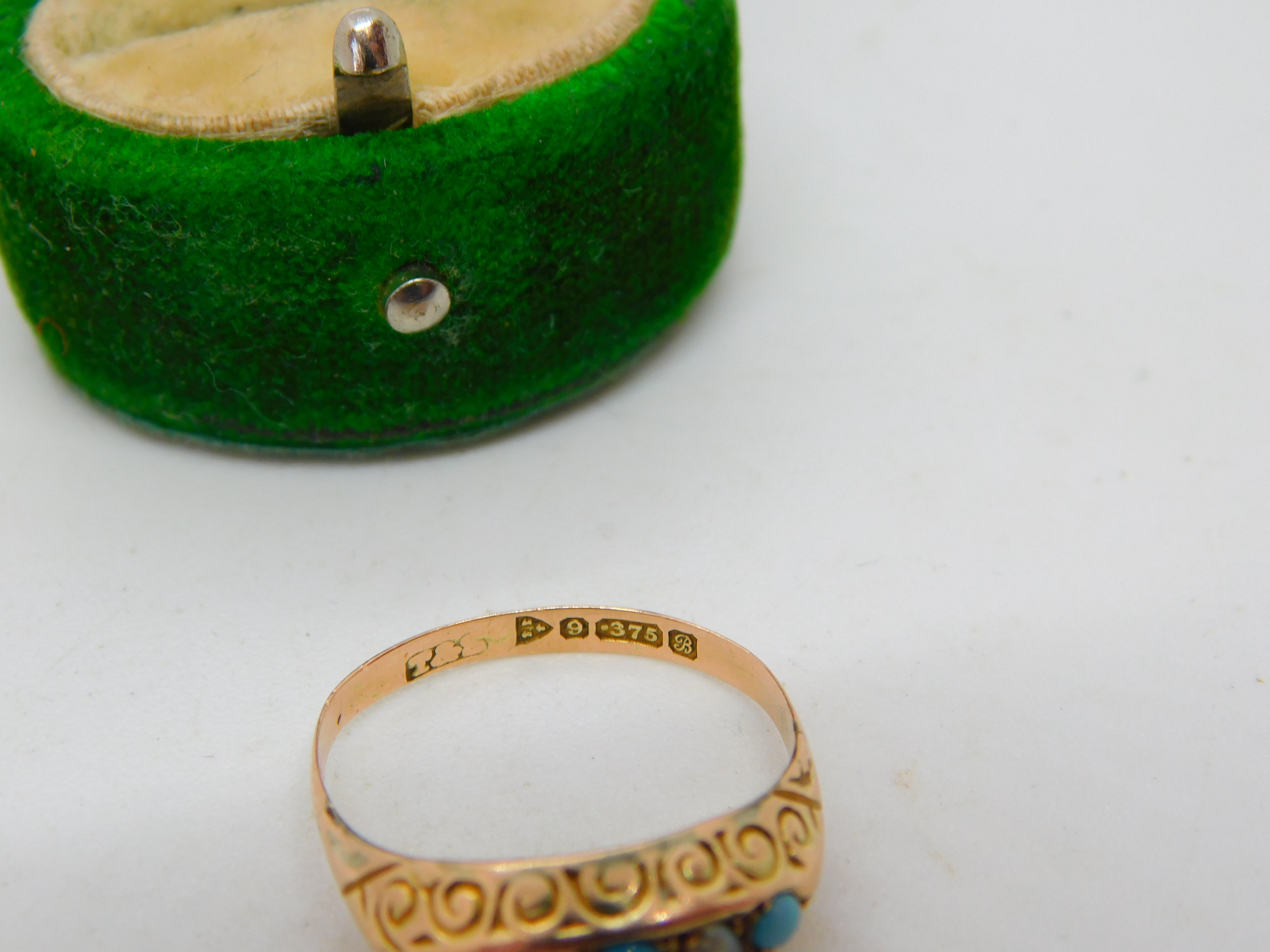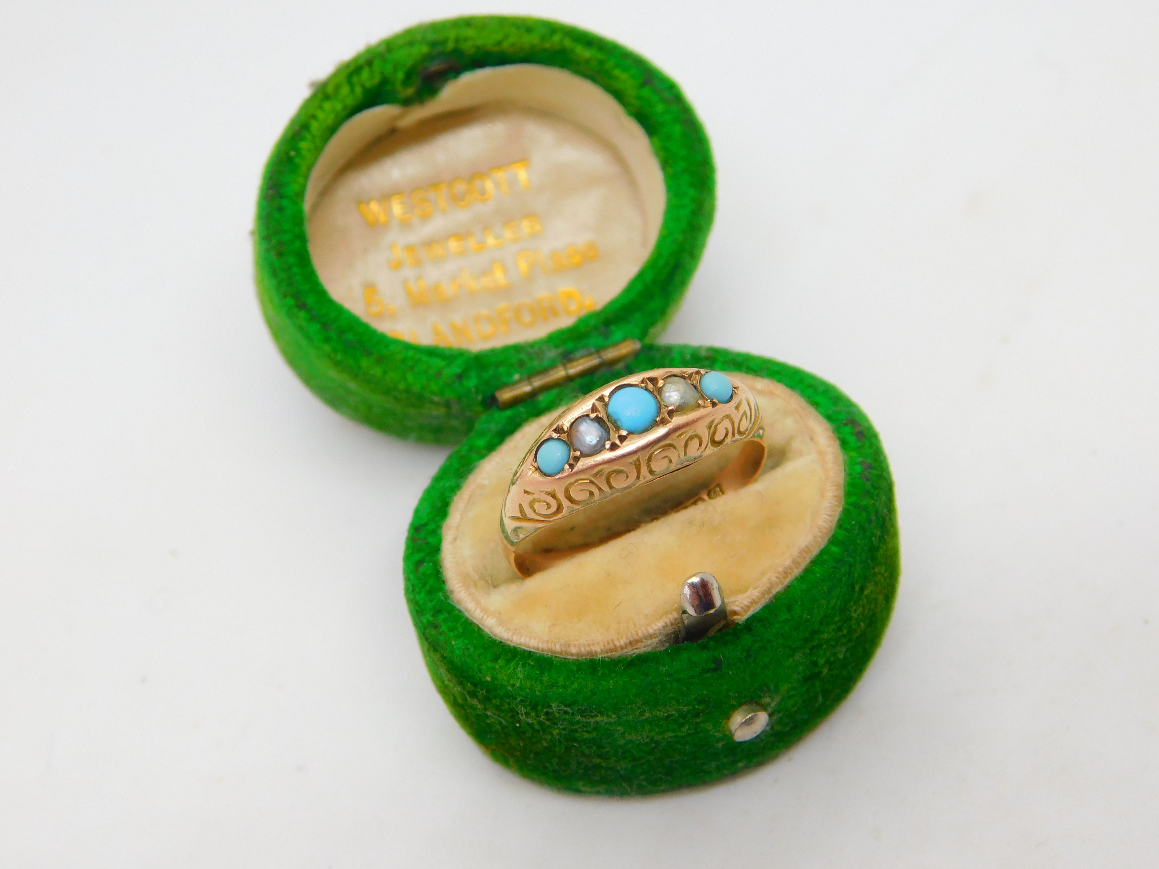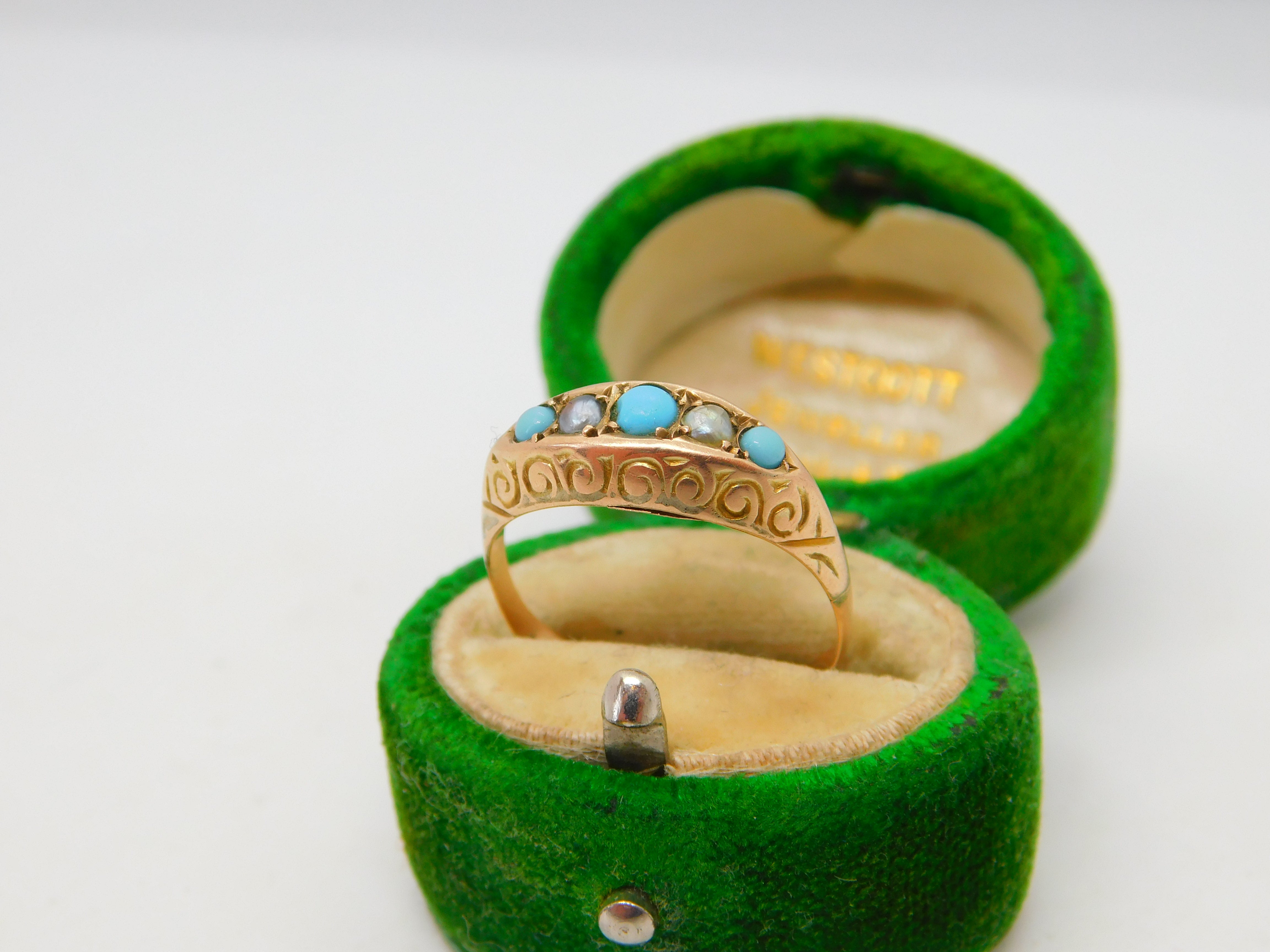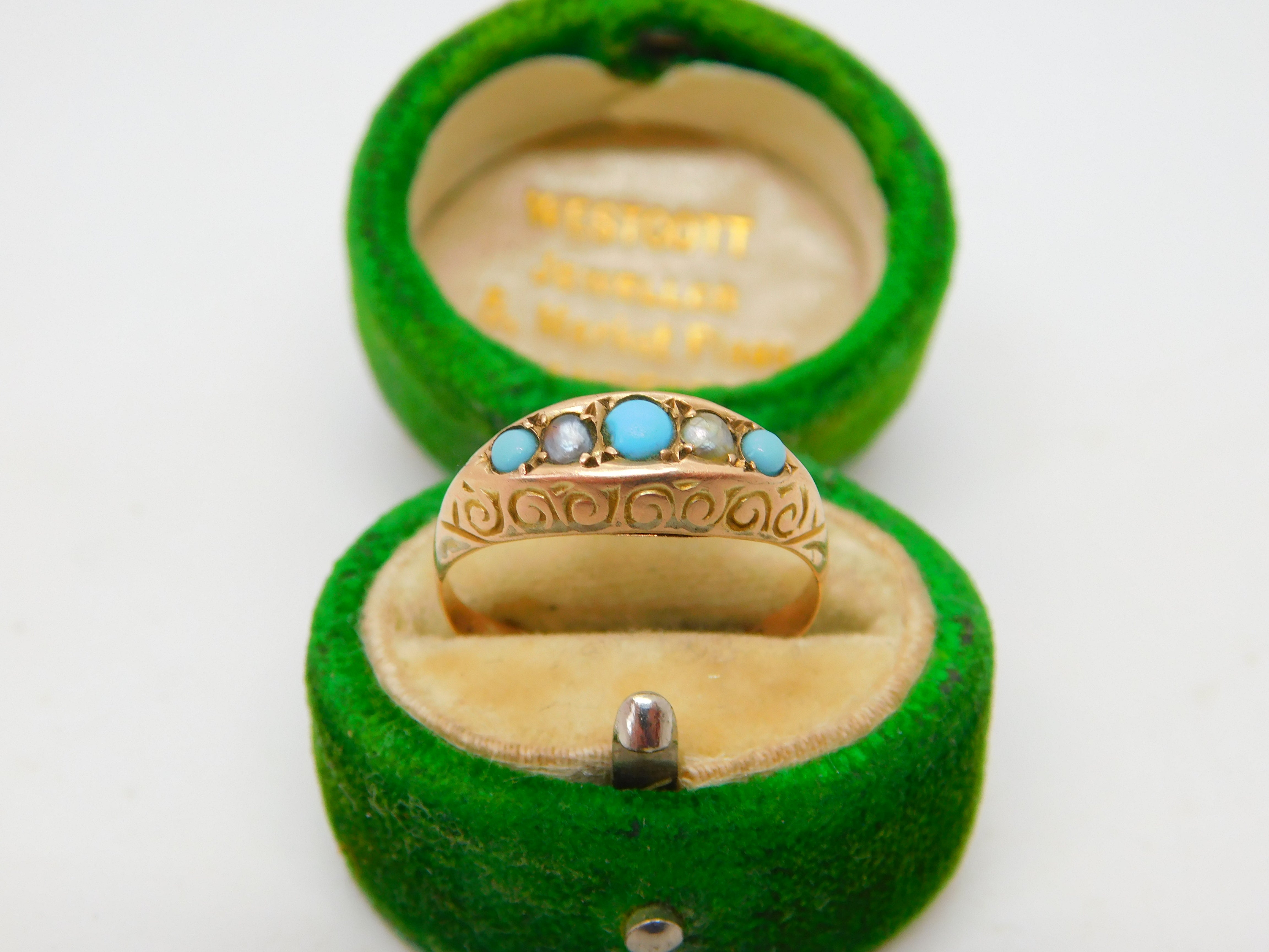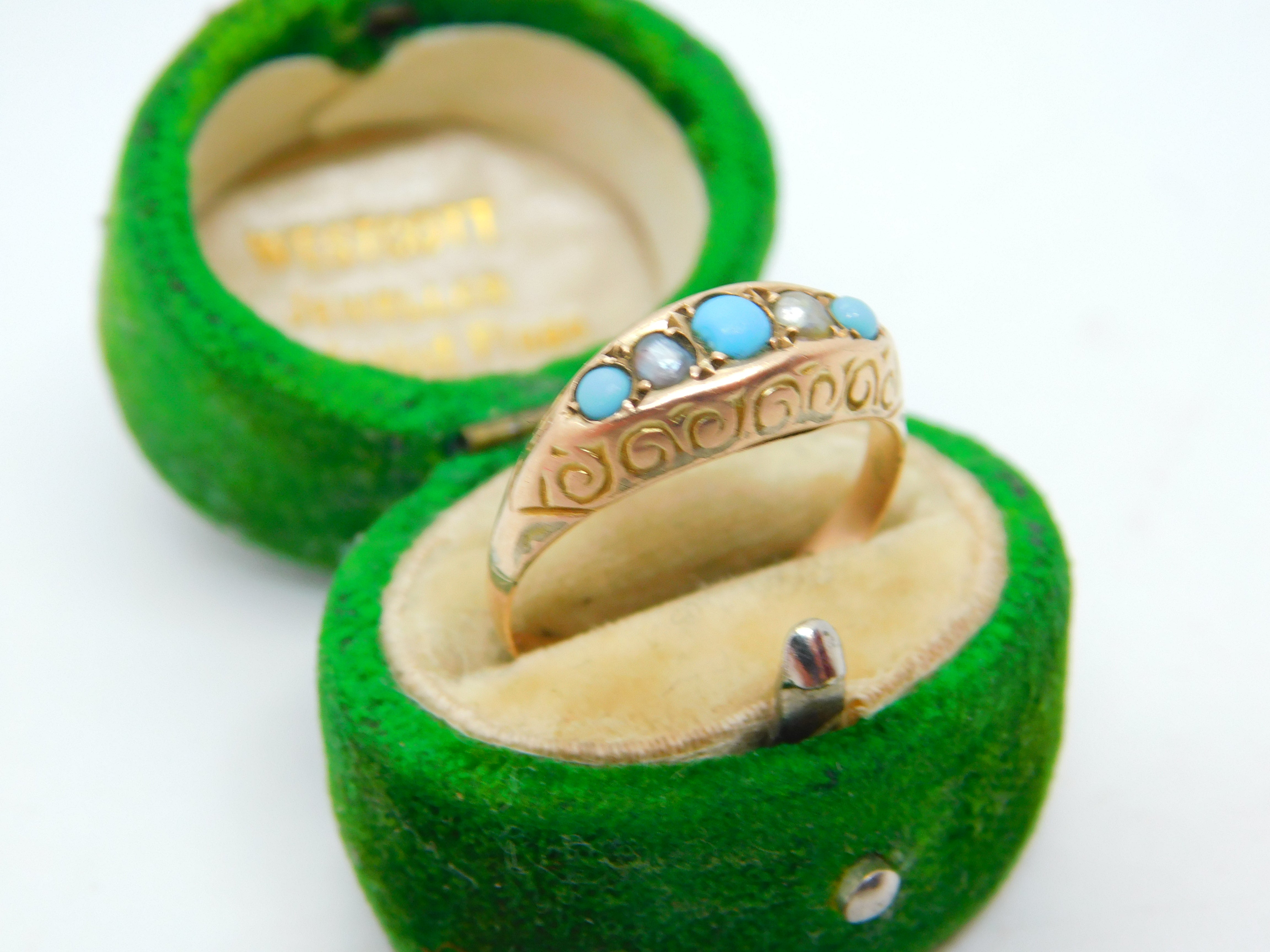 Details: A fantastic and wonderfully designed antique art deco 9ct gold boat ring set with turquoise & seed pearls hallmarked Chester 1917 to the interior band. This is a wonderful item that would make a perfect gift or addition to any collection. The BOX pictured is for PRESENTATION ONLY and is NOT included in the listings but used to frame the pictures unless specifically stated otherwise.
