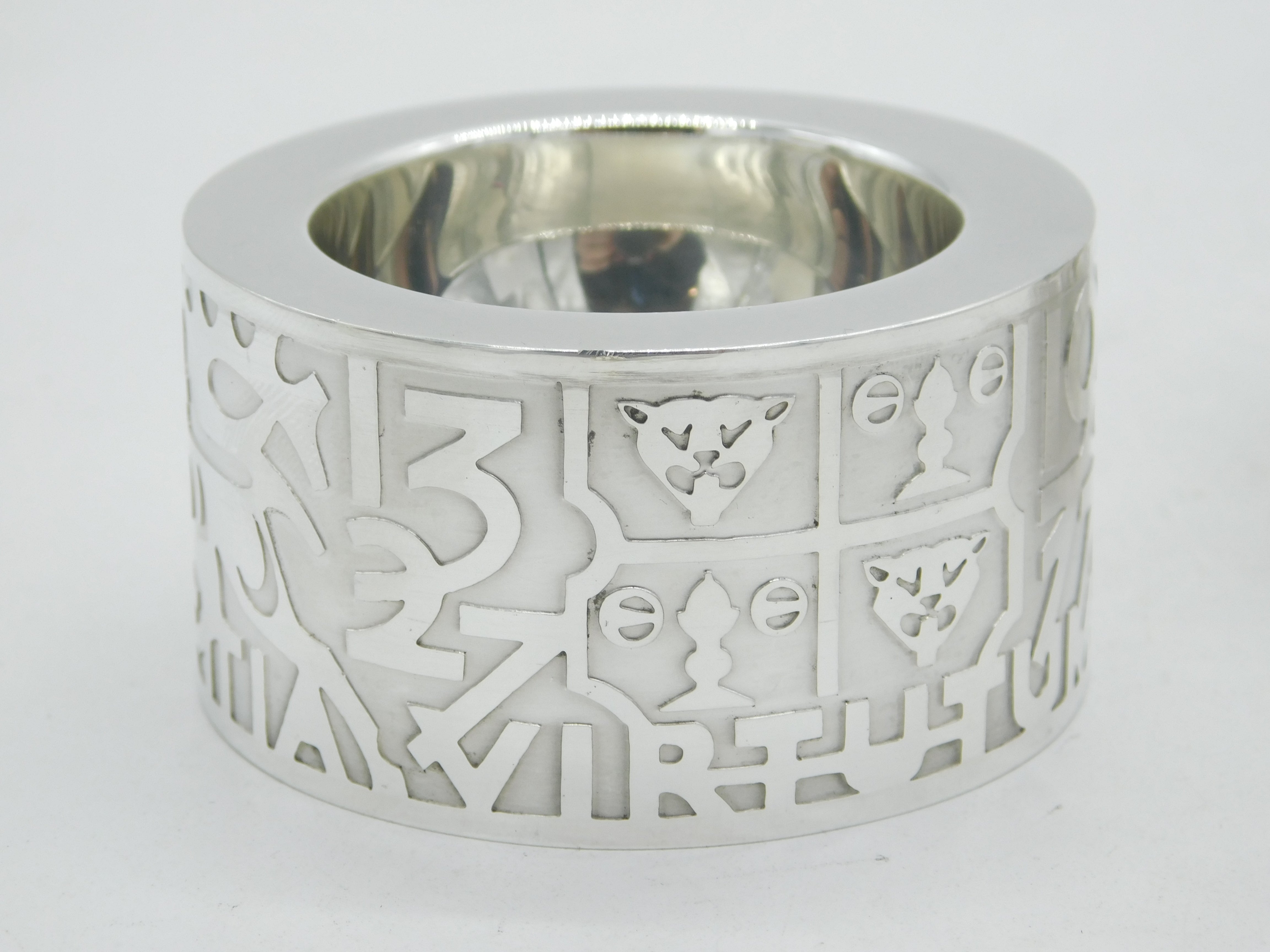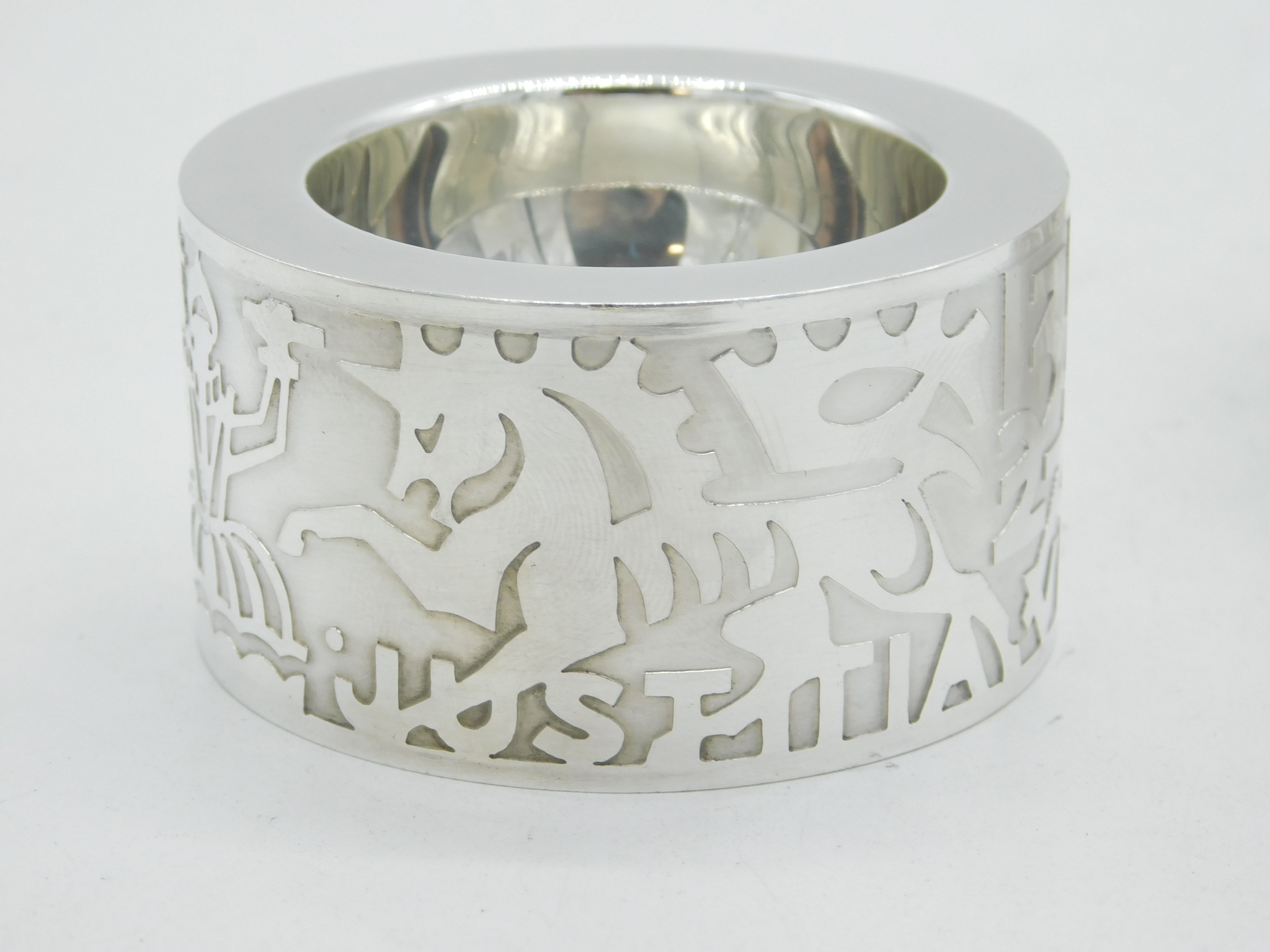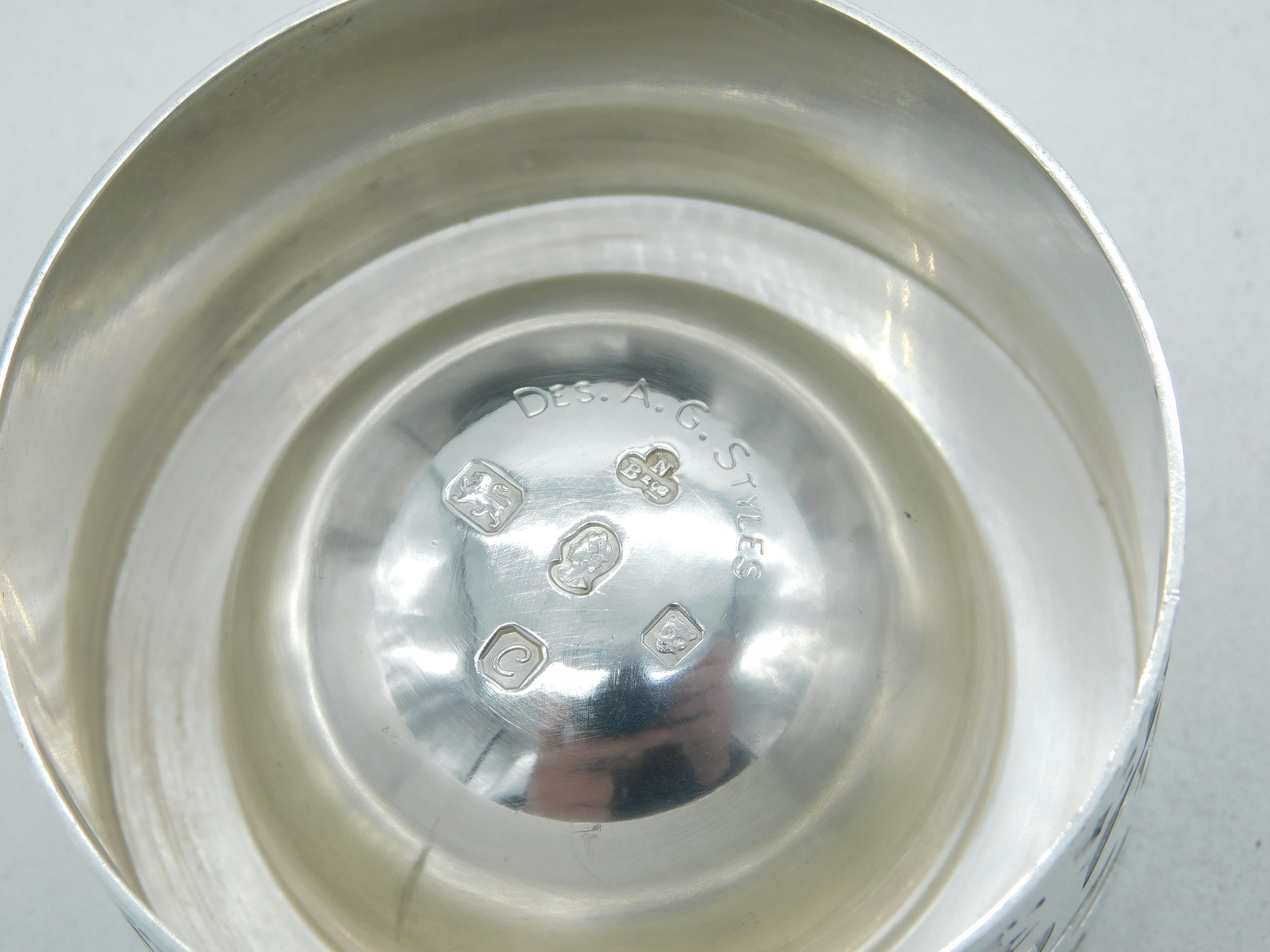 Details: A fantastic and wonderfully designed pair of sterling silver salt cellars with lovely intricate applied decorations, designed by Les A G Styles for Nayler Brothers, hallmarked London 1977 to the base and to the spoons. These salt cellars were commissioned to commemorate the 650th anniversary of the Goldsmiths Company in the year 1977. This is a wonderful item that would make a perfect gift or addition to any collection. We are more than happy to provide XRF reports for items upon request.