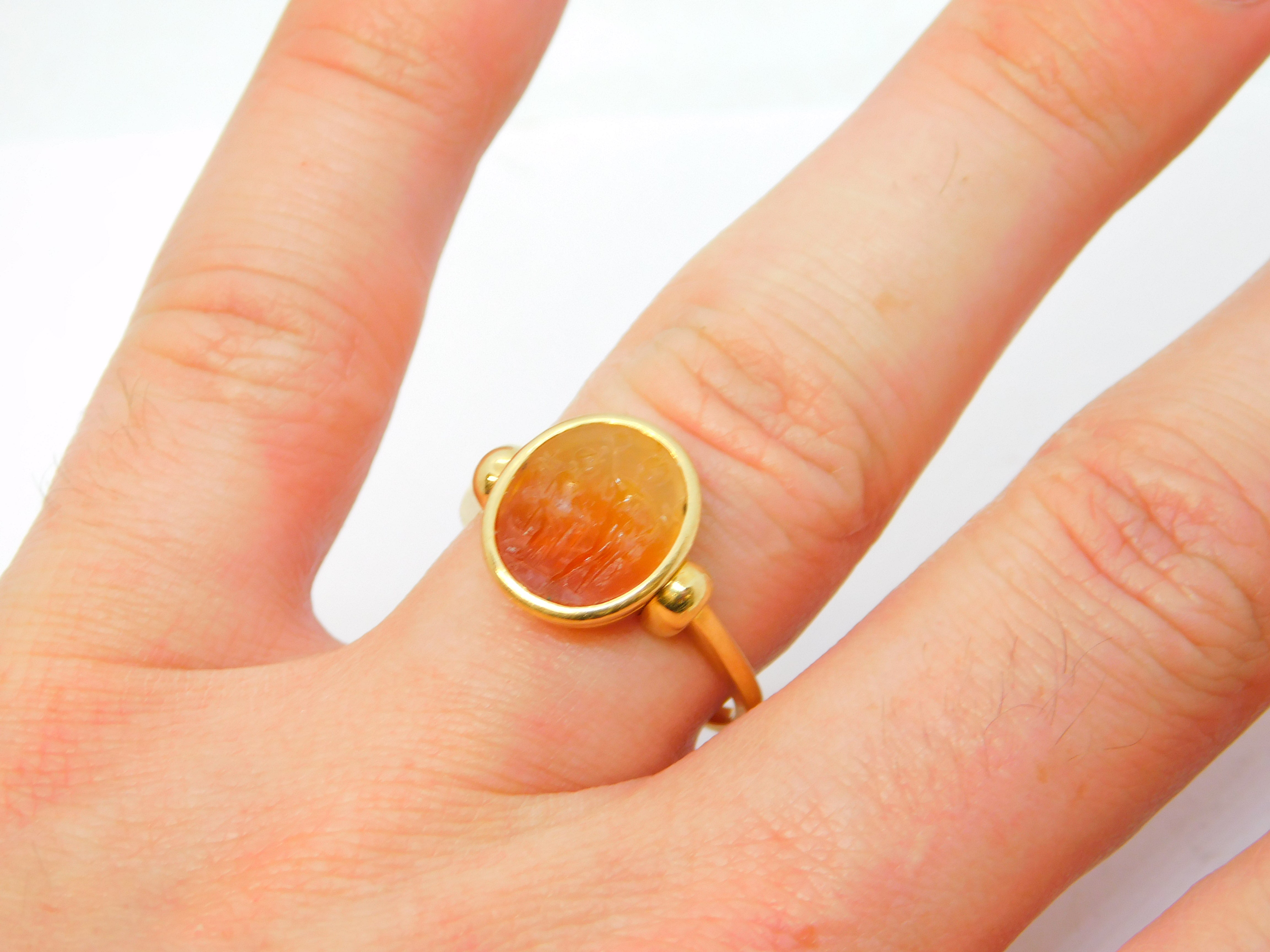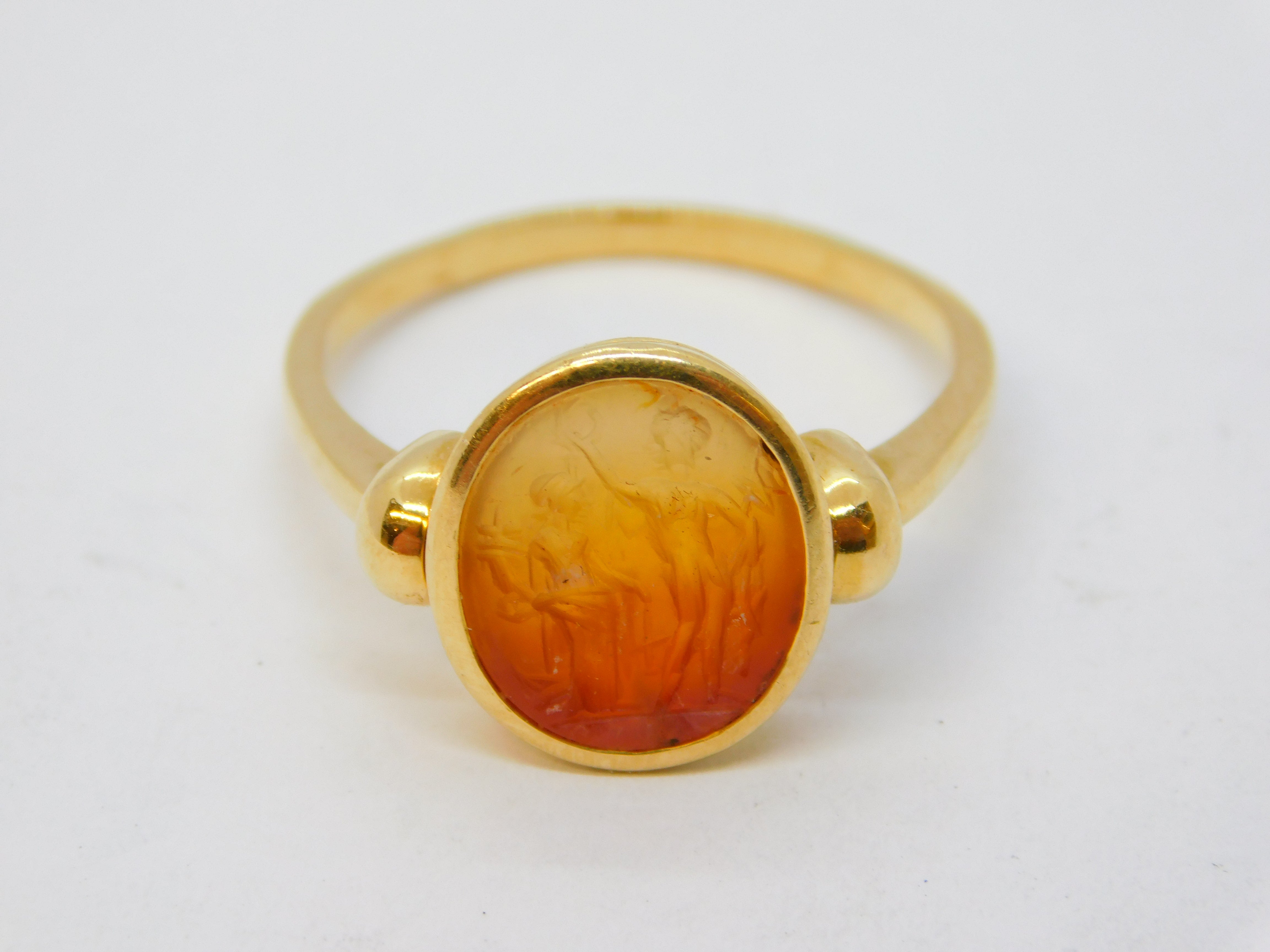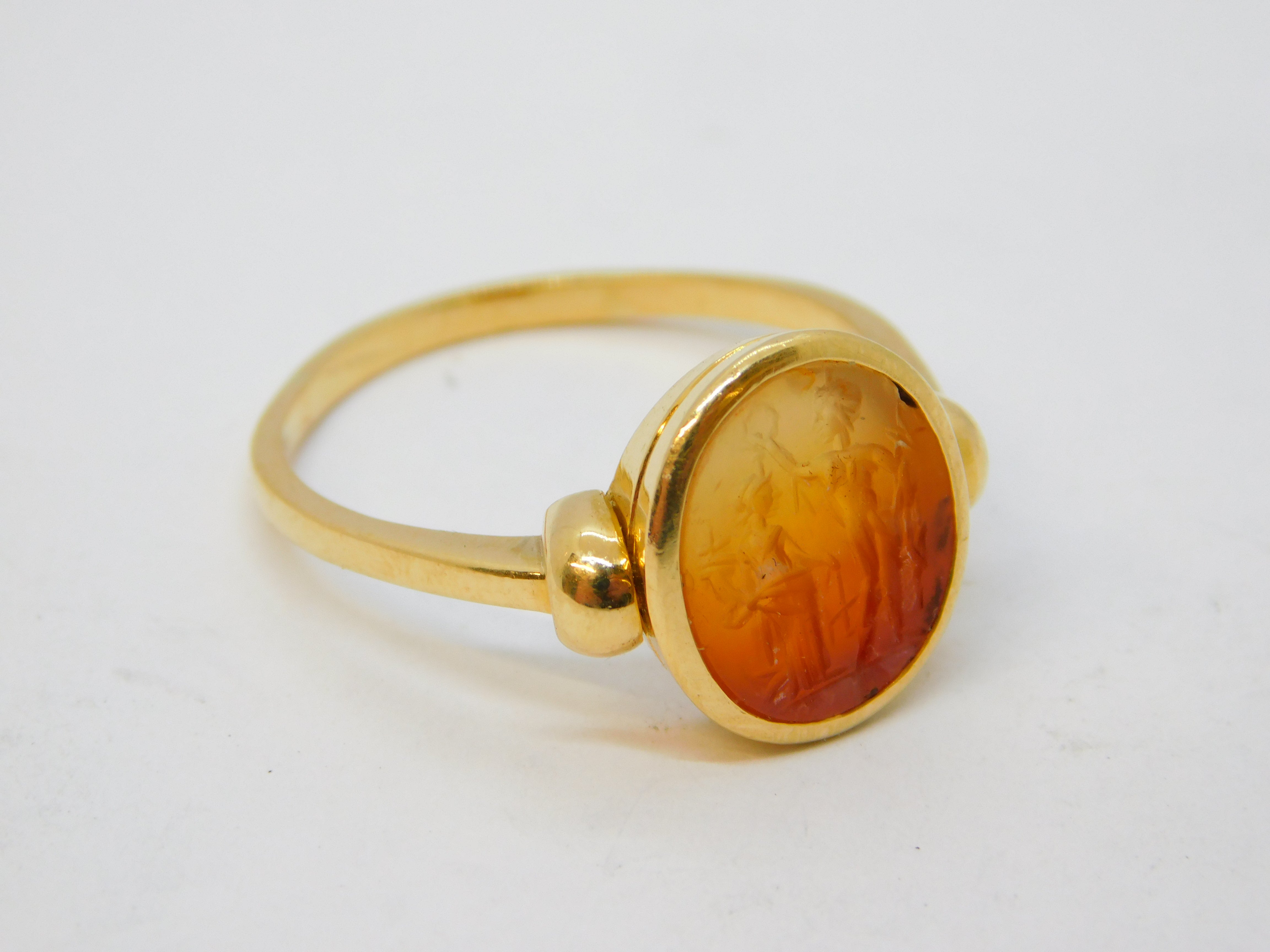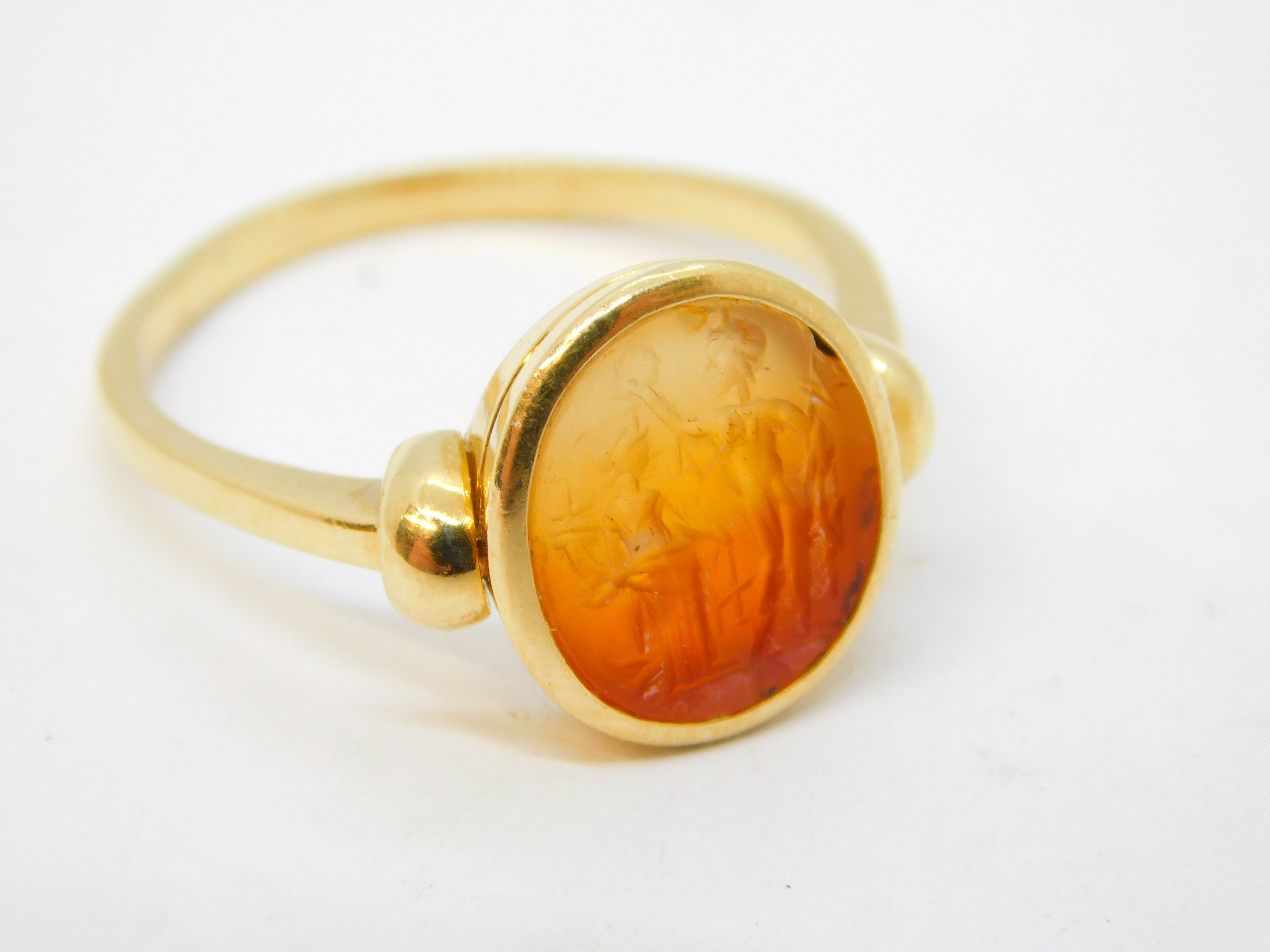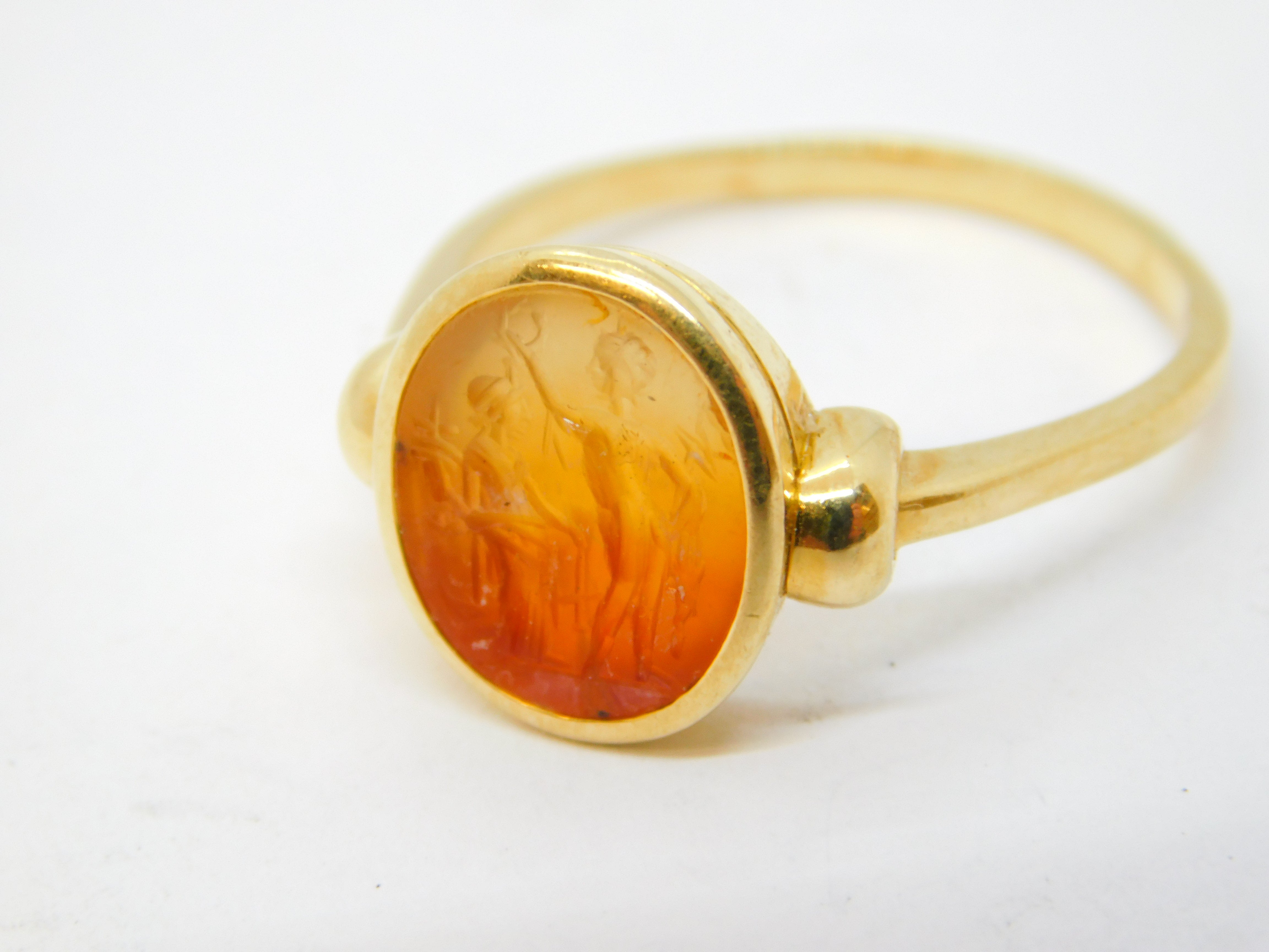 Details: A superb ancient Roman ornately carved red agate intaglio or cameo depicting the Dioscuri: Castor & Pollux in beautiful vivid detail, likely dating from the 1st or 2nd century BC. The ring mount is 18ct yellow gold and is most likely a later roman style edition, possibly from the early-Victorian grand tour era. The gold has been XRF tested as it is unmarked. The intaglio is in excellent condition and the ring itself is truly wonderful. This is a wonderful item that would make a perfect gift or addition to any collection. We are more than happy to provide XRF reports for items upon request.