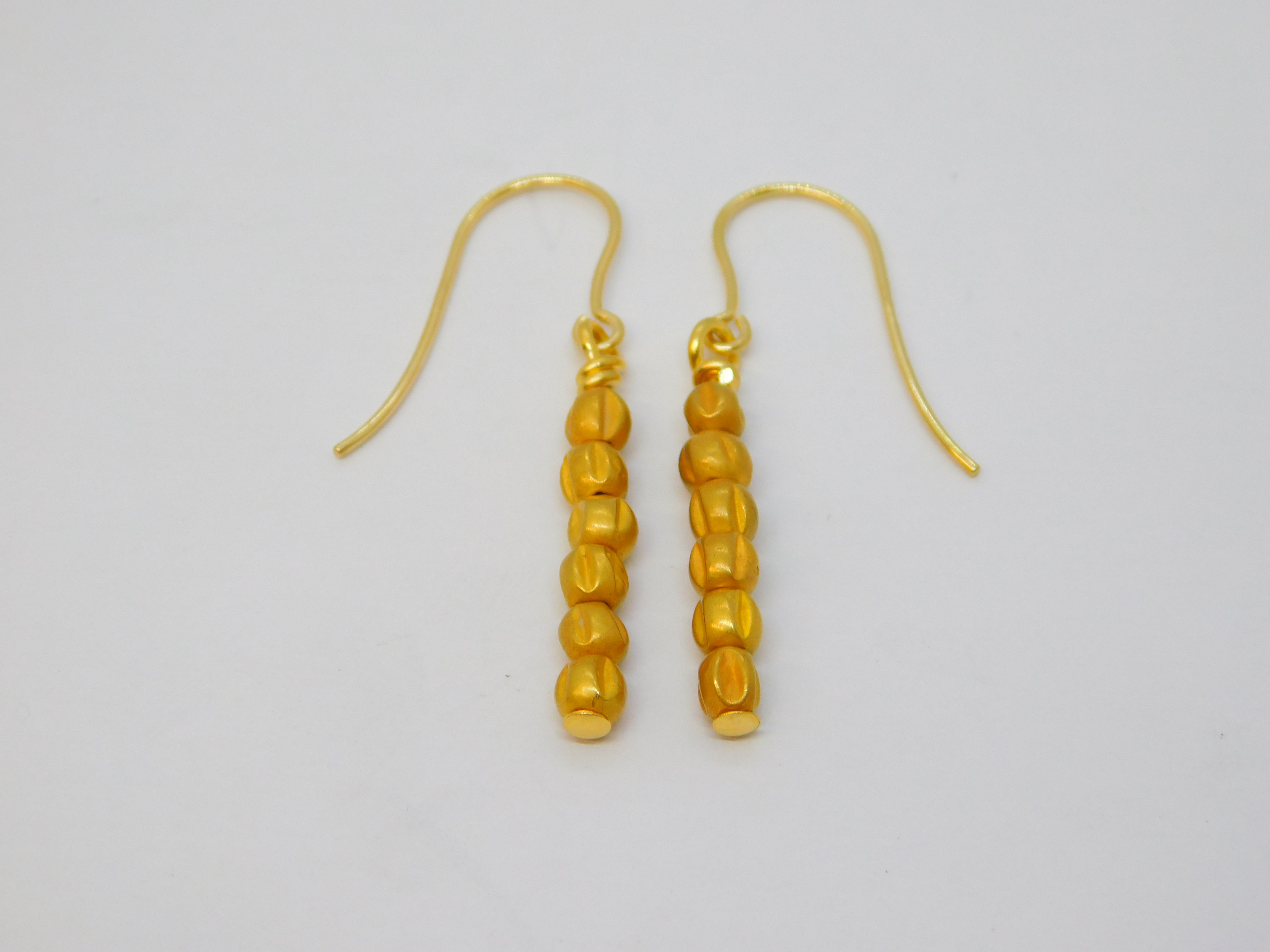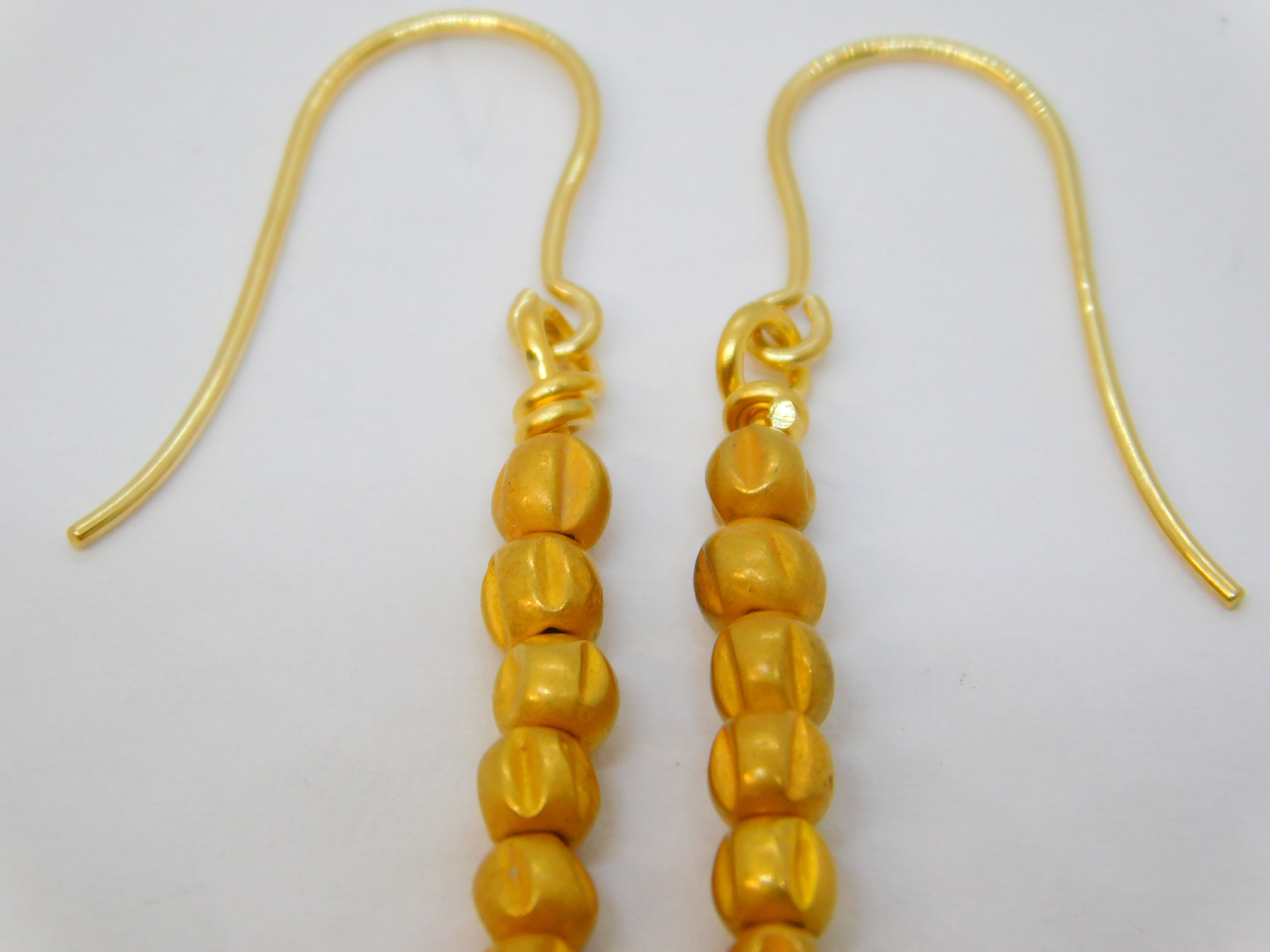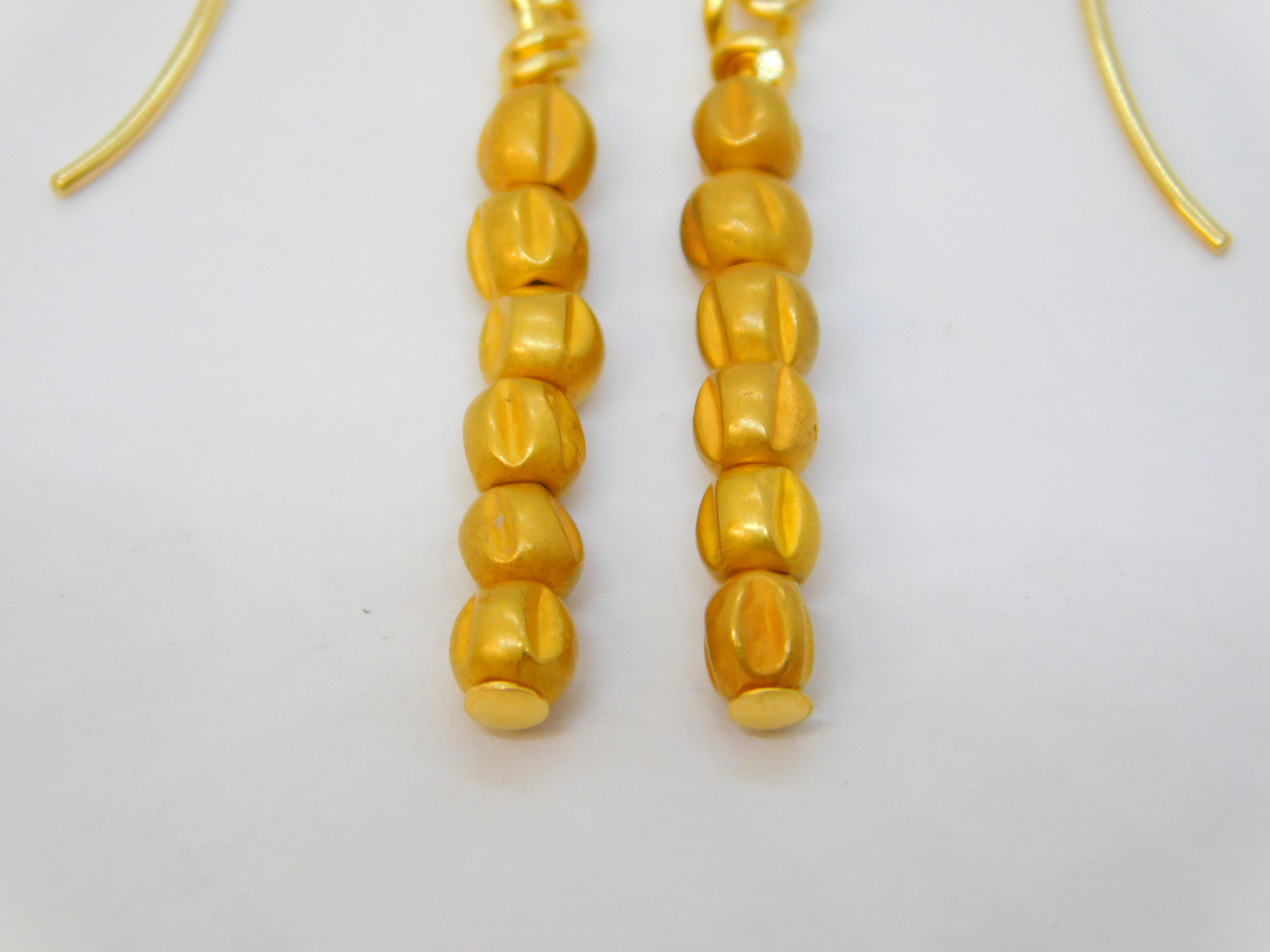 Details: A fantastic and wonderfully designed pair of beaded drop earrings consisting of six 24ct pure gold beads believed to be Roman set on contemporary 9ct yellow gold ear wires, the gold has all been XRF tested as there are no marks. This is a wonderful item that would make a perfect gift or addition to any collection.