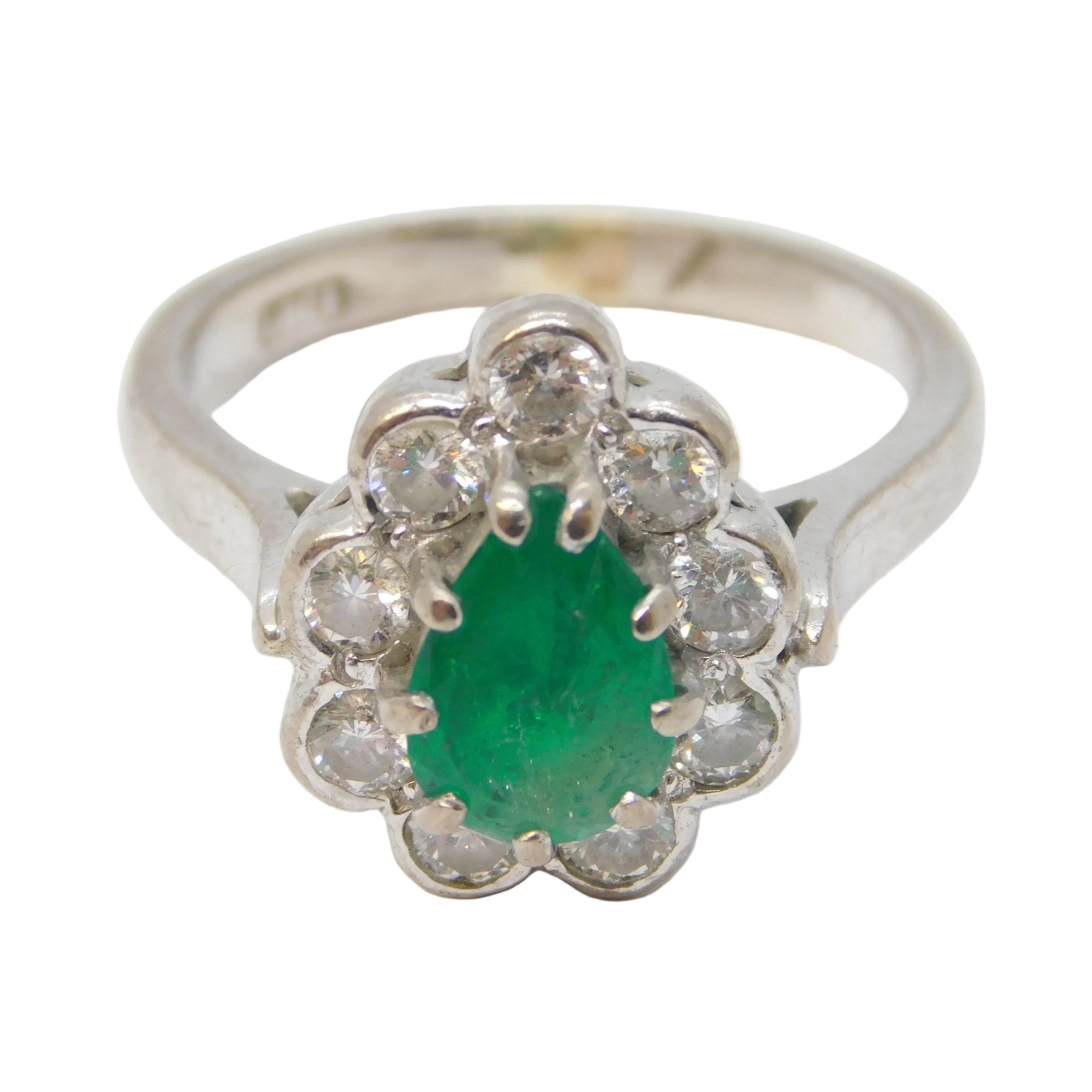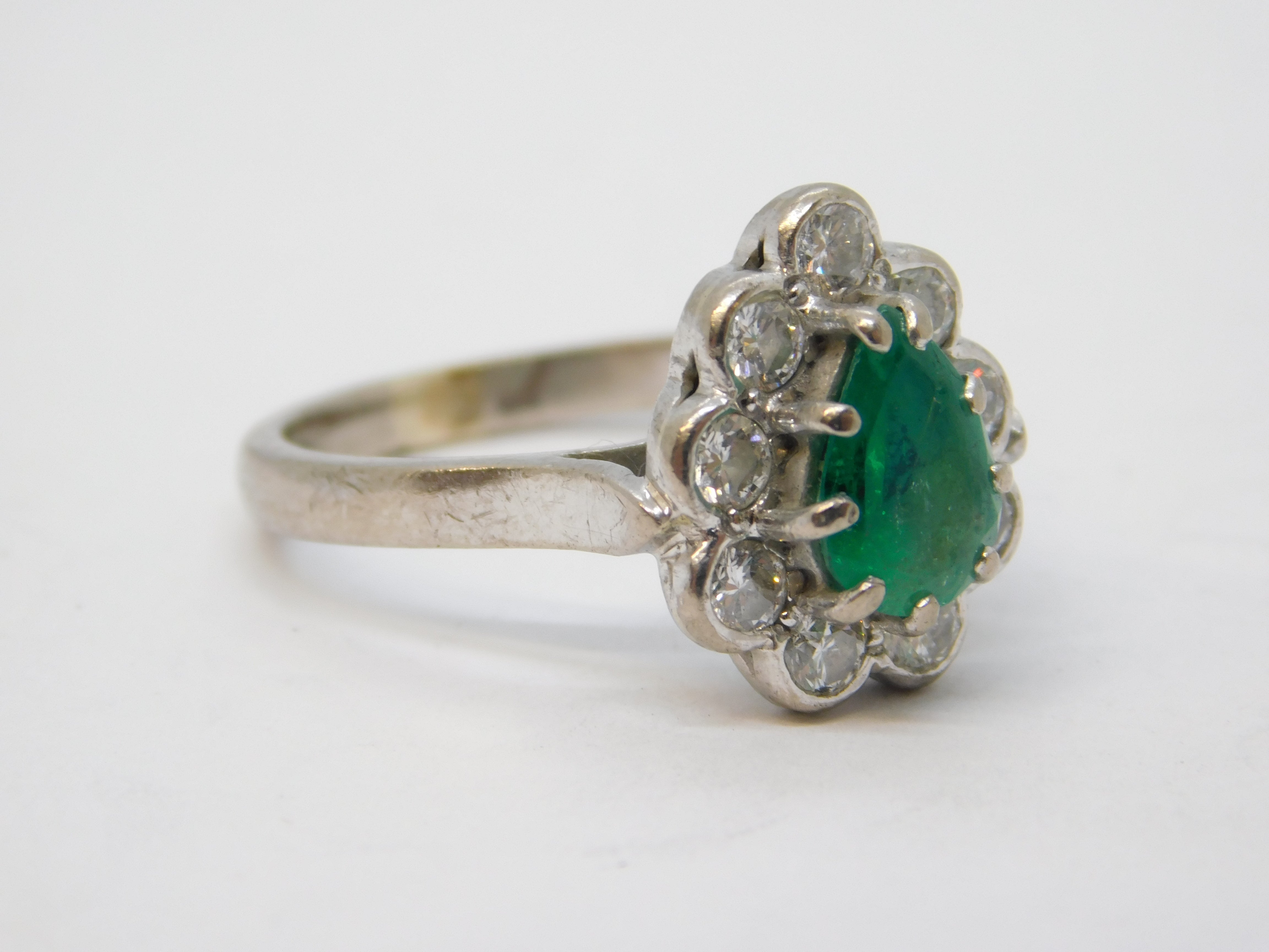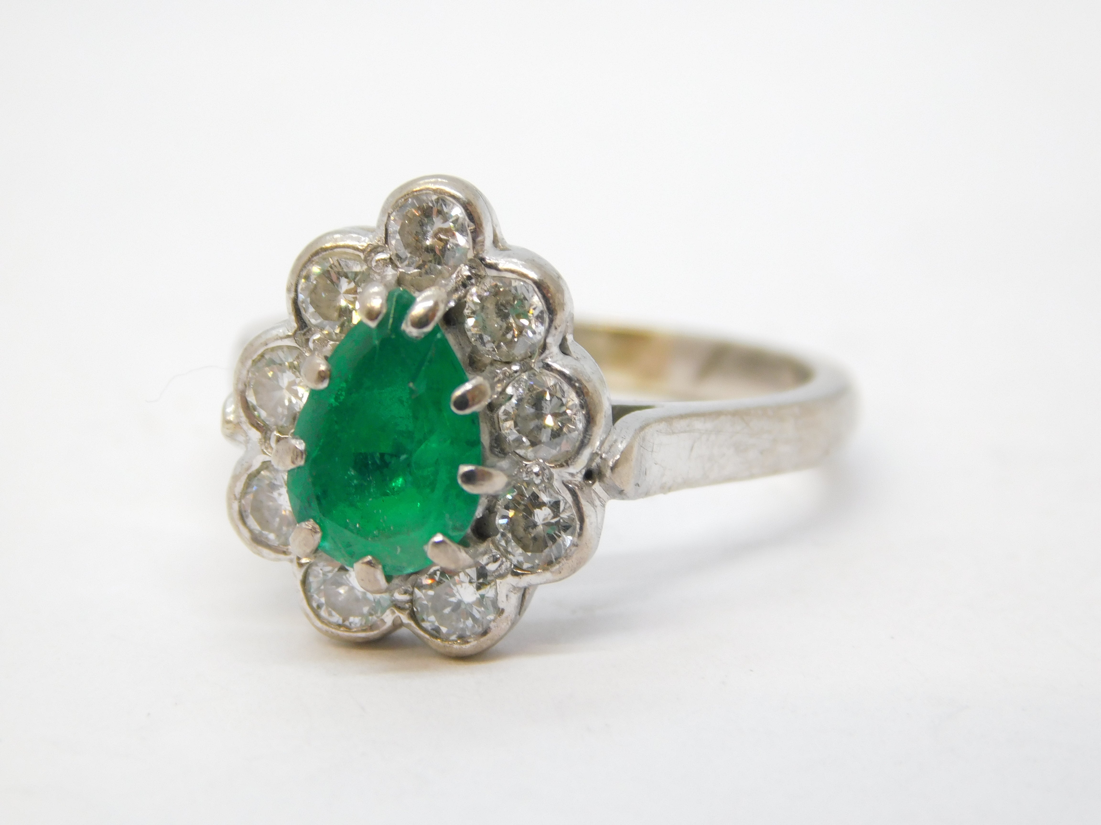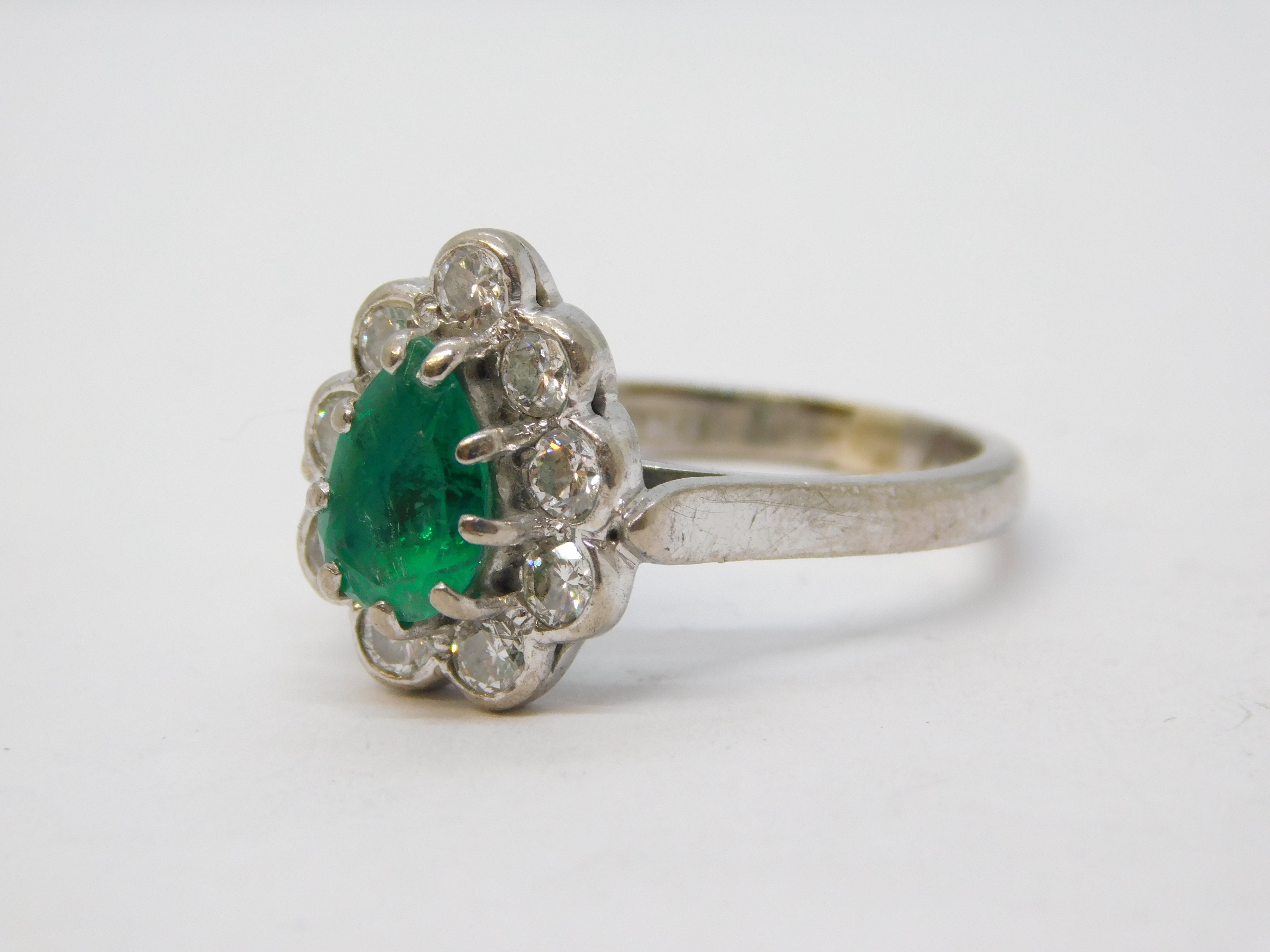 Details: A fantastic and wonderfully designed antique art deco 18ct white gold engagement ring set with a natural 1ct pear-cut columbian emerald flanked by nine brilliant cut diamonds (total diamond weight approximately 1ct). The ring is hallmarked '18ct' to the interior band and all the stones have been machine tested. The ring has been resized to the back of the shank but is otherwise in lovely order. Beautiful clarity and colour to all of the stones, with the ring truly glittering in the light. This is a wonderful item that would make a perfect gift or addition to any collection. We are more than happy to provide XRF reports for items upon request.