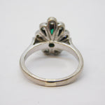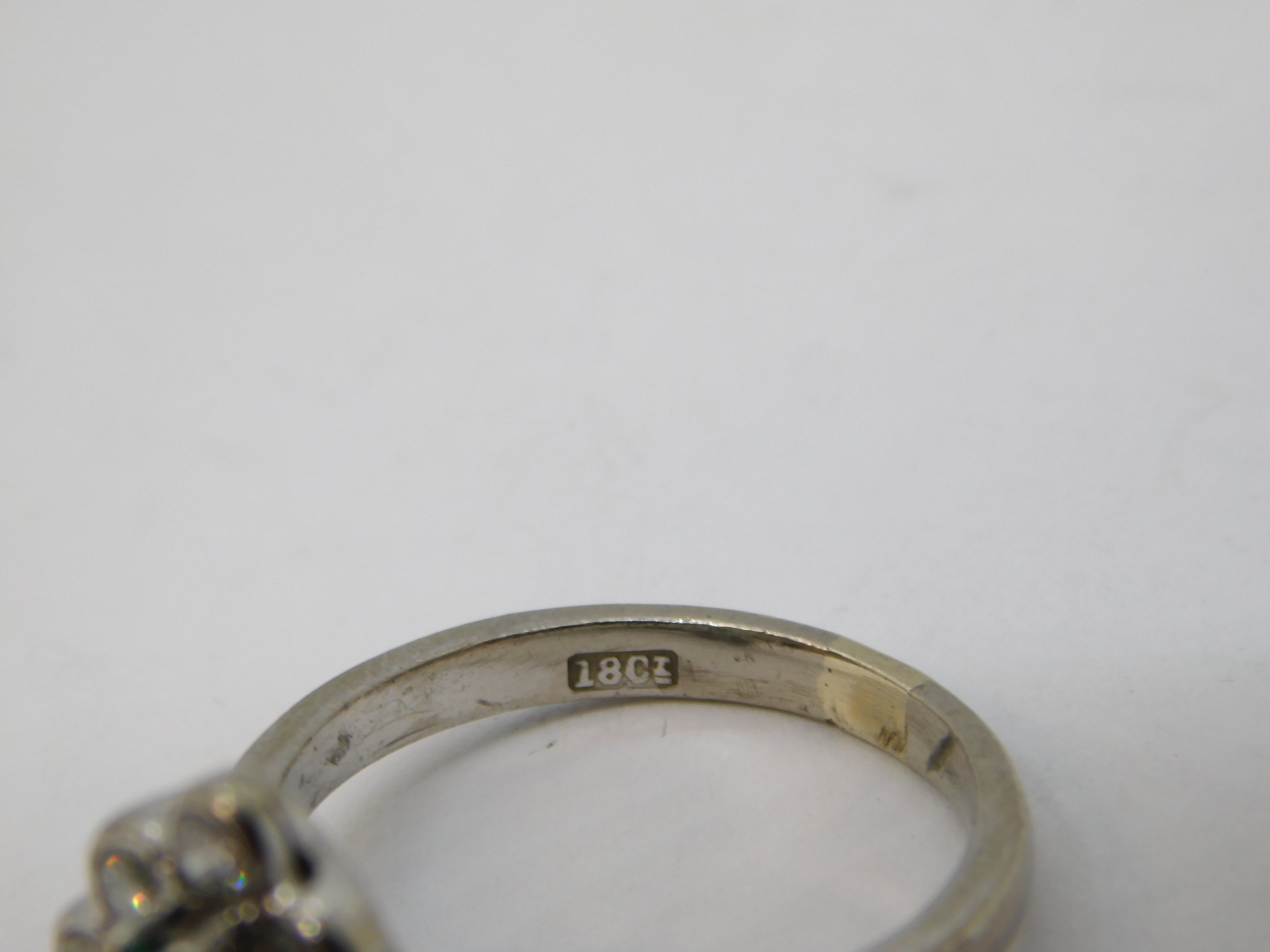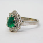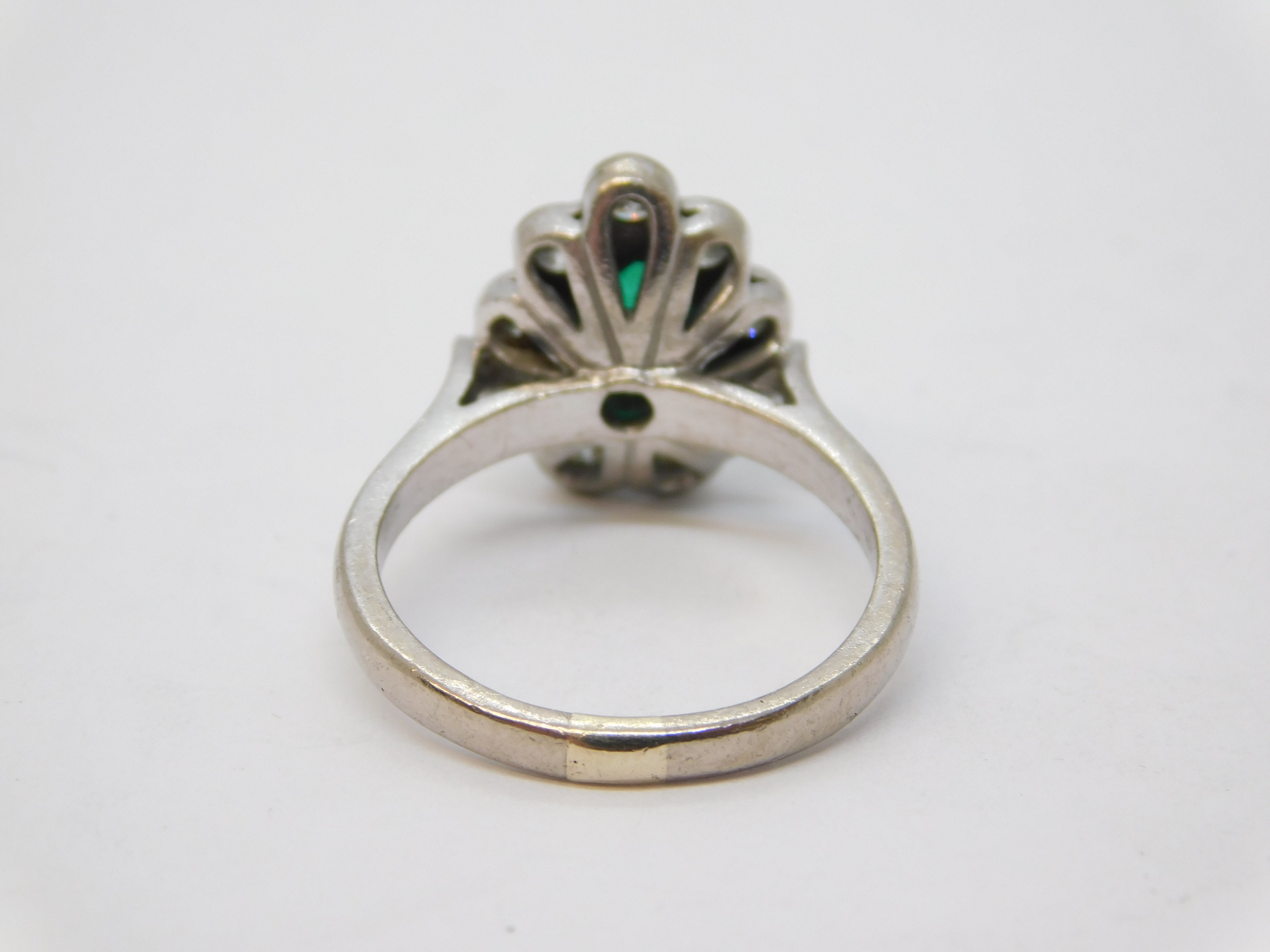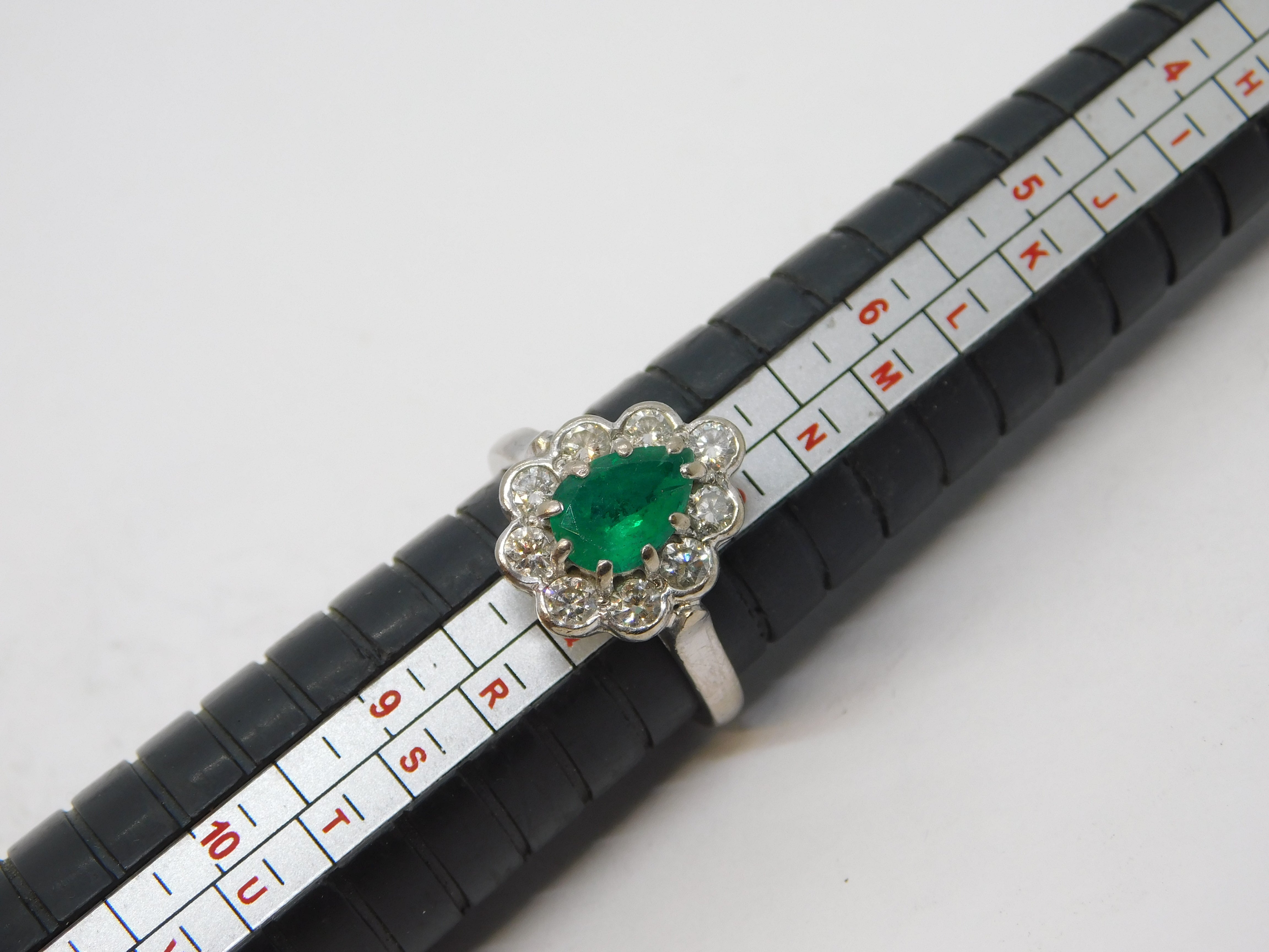 Details: A fantastic and wonderfully designed antique art deco 18ct white gold engagement ring set with a natural 1ct pear-cut columbian emerald flanked by nine brilliant cut diamonds (total diamond weight approximately 1ct). The ring is hallmarked '18ct' to the interior band and all the stones have been machine tested. The ring has been resized to the back of the shank but is otherwise in lovely order. Beautiful clarity and colour to all of the stones, with the ring truly glittering in the light. This is a wonderful item that would make a perfect gift or addition to any collection. We are more than happy to provide XRF reports for items upon request.