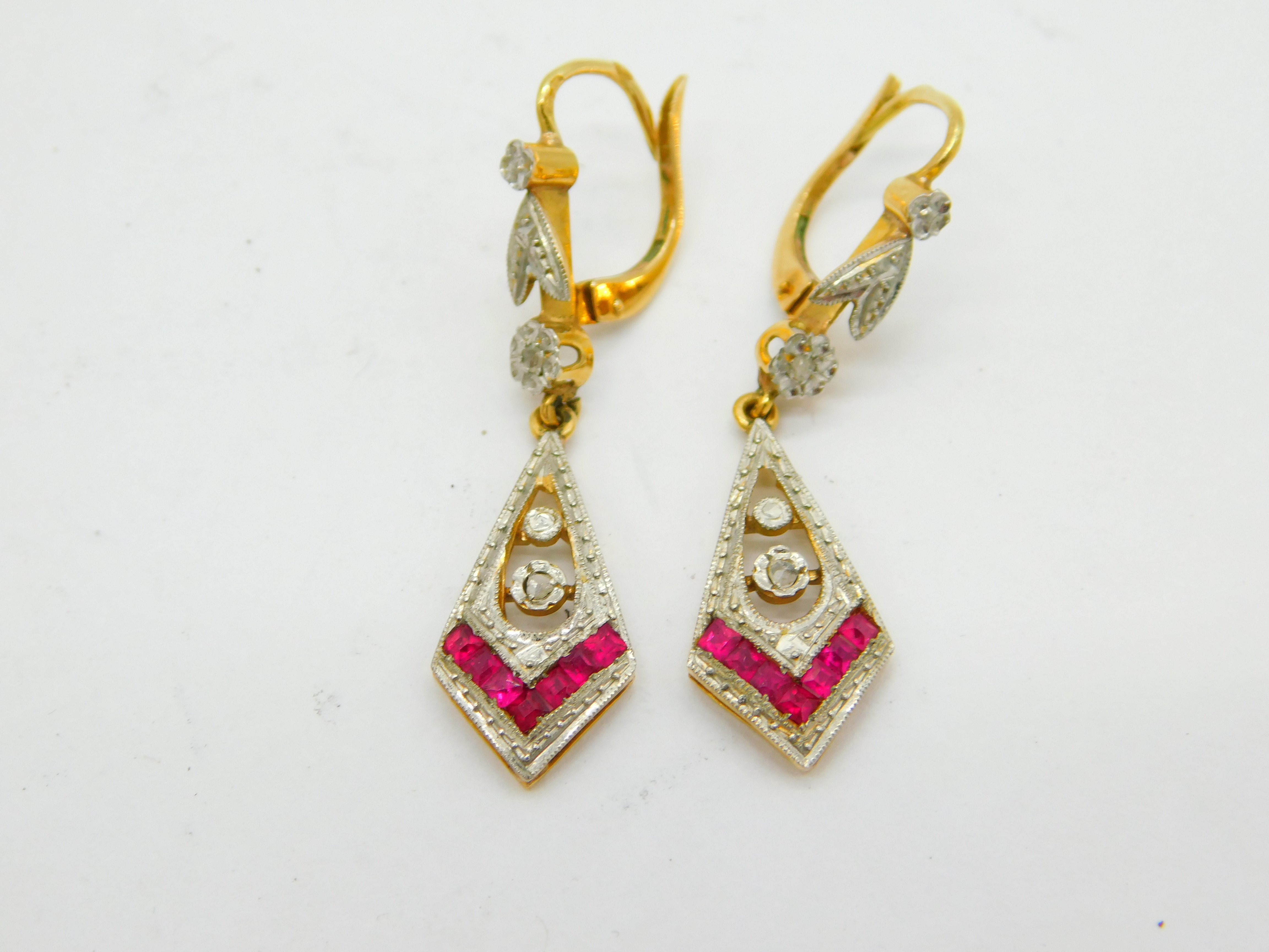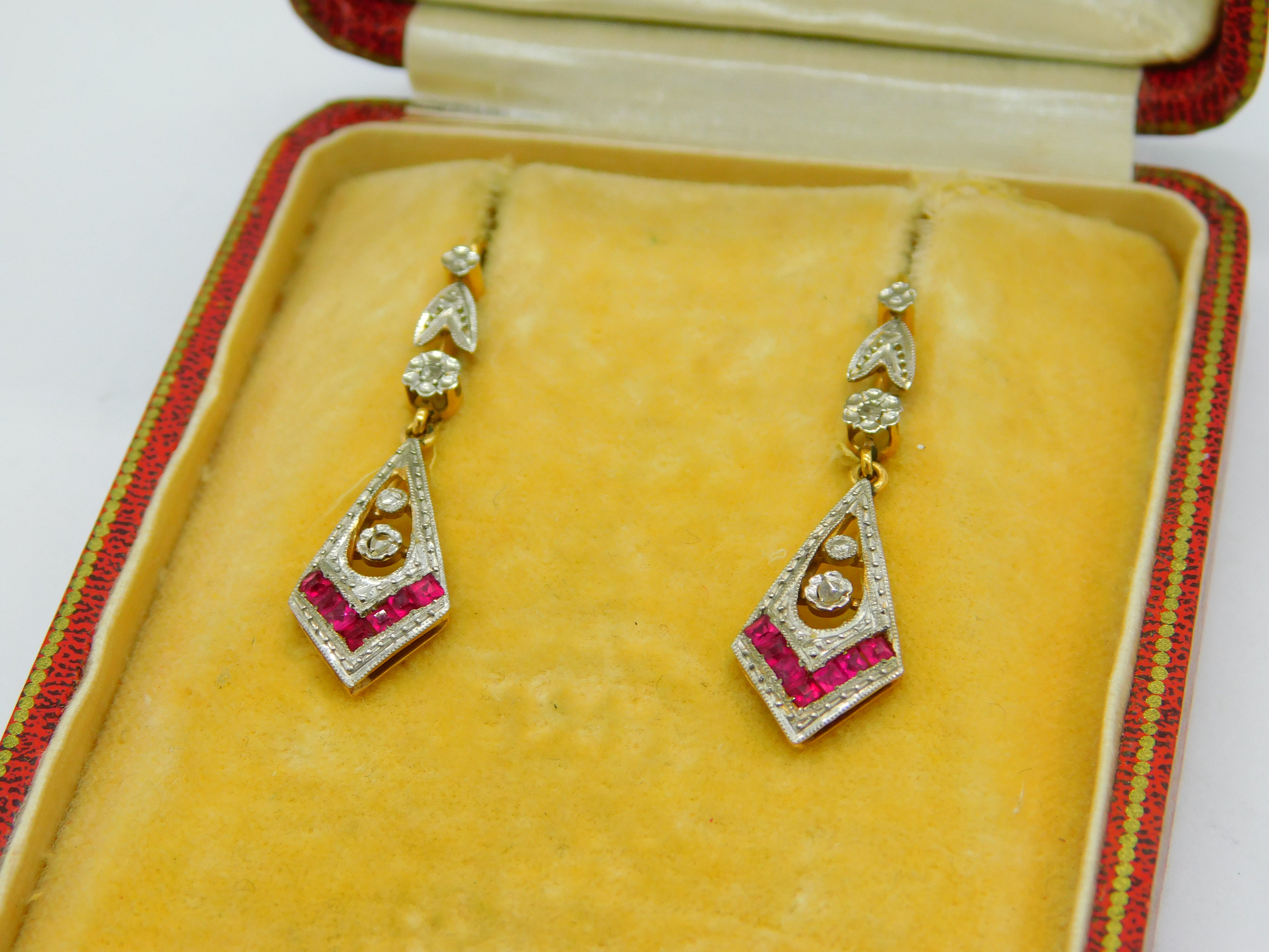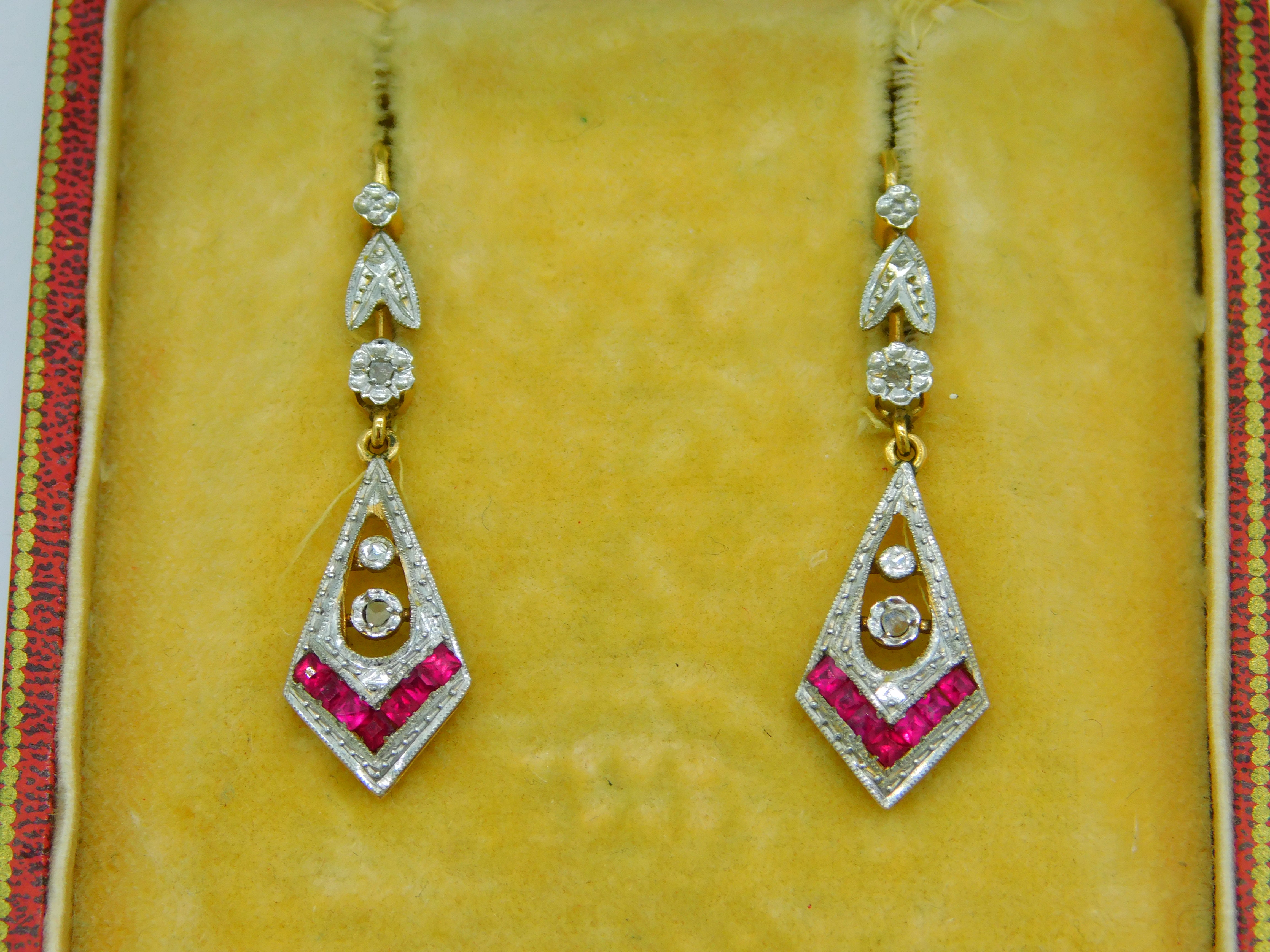 Details: A fantastic and wonderfully designed pair of antique early 20th century French 18ct yellow gold & platinum drop drop earrings set with old-cut diamonds and square cut rubies finished with a true art deco flourish. Included within the original box marked 'A La Comete D'or' by P. Simon Fabricant of 28 Boulevard Barbes, Paris c1920s. The gold is hallmarked and has been XRF tested, all the stones have been tested. This is a wonderful item that would make a perfect gift or addition to any collection. We are more than happy to provide XRF reports for items upon request.