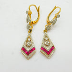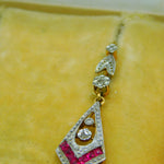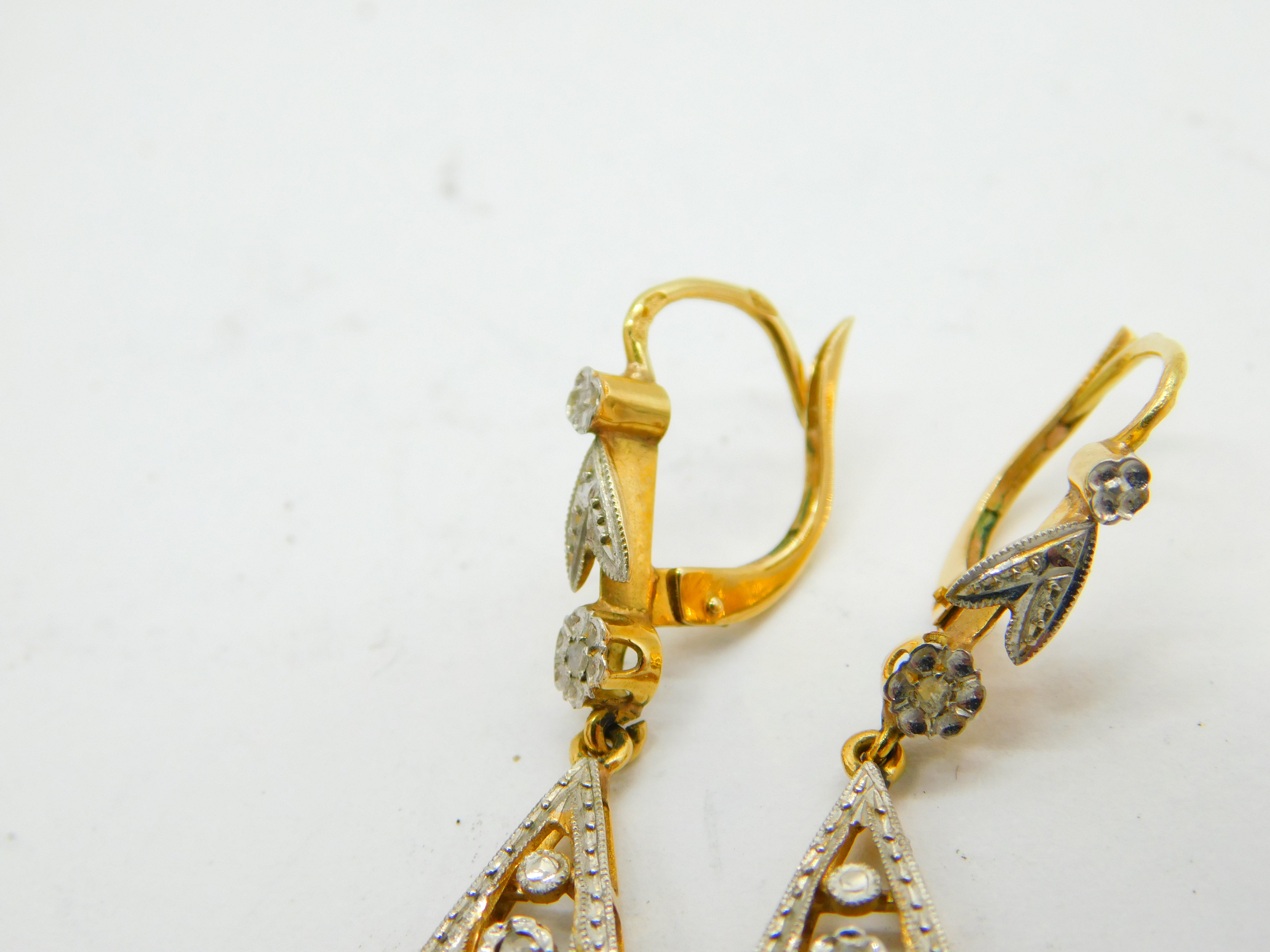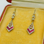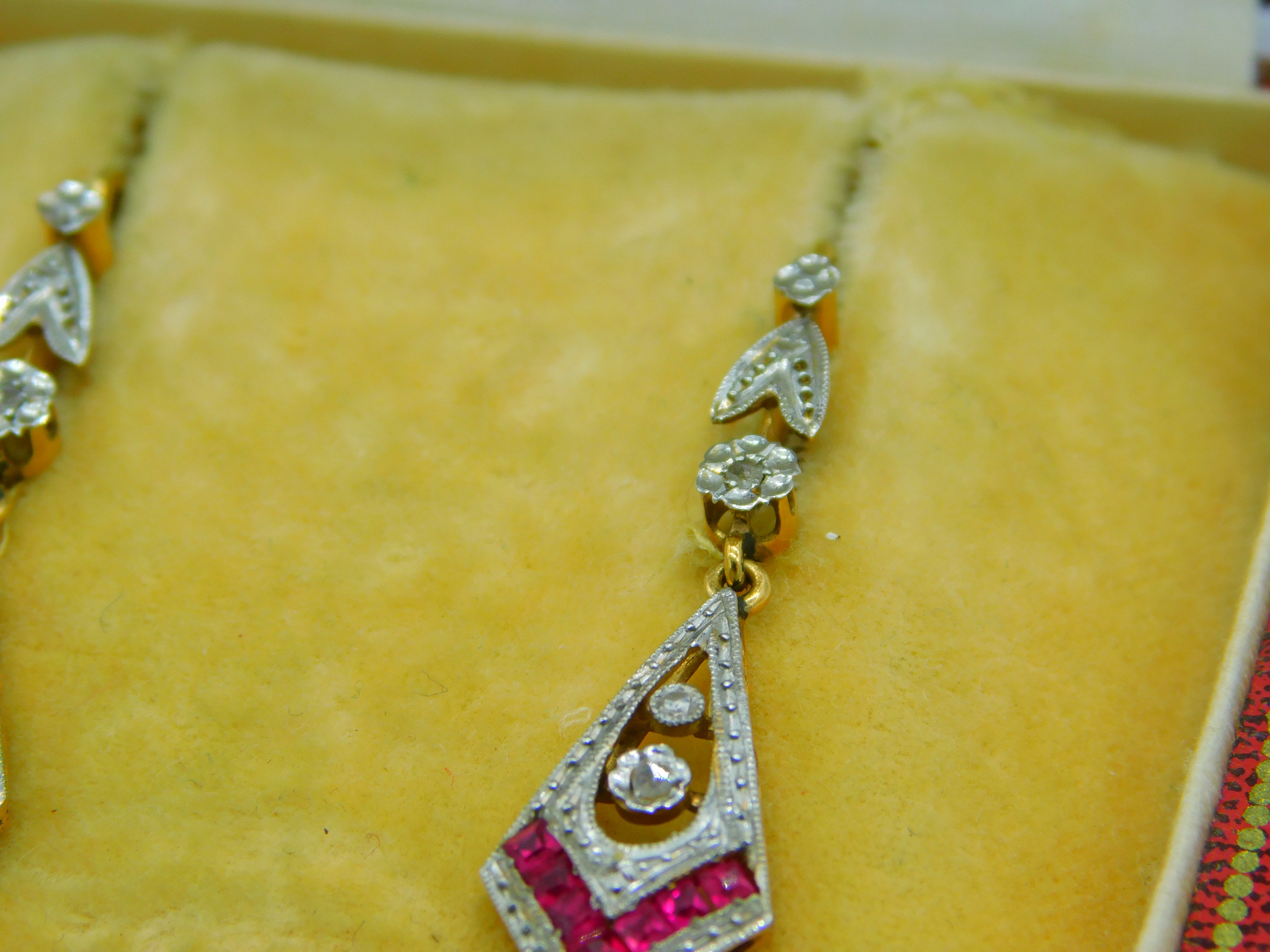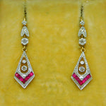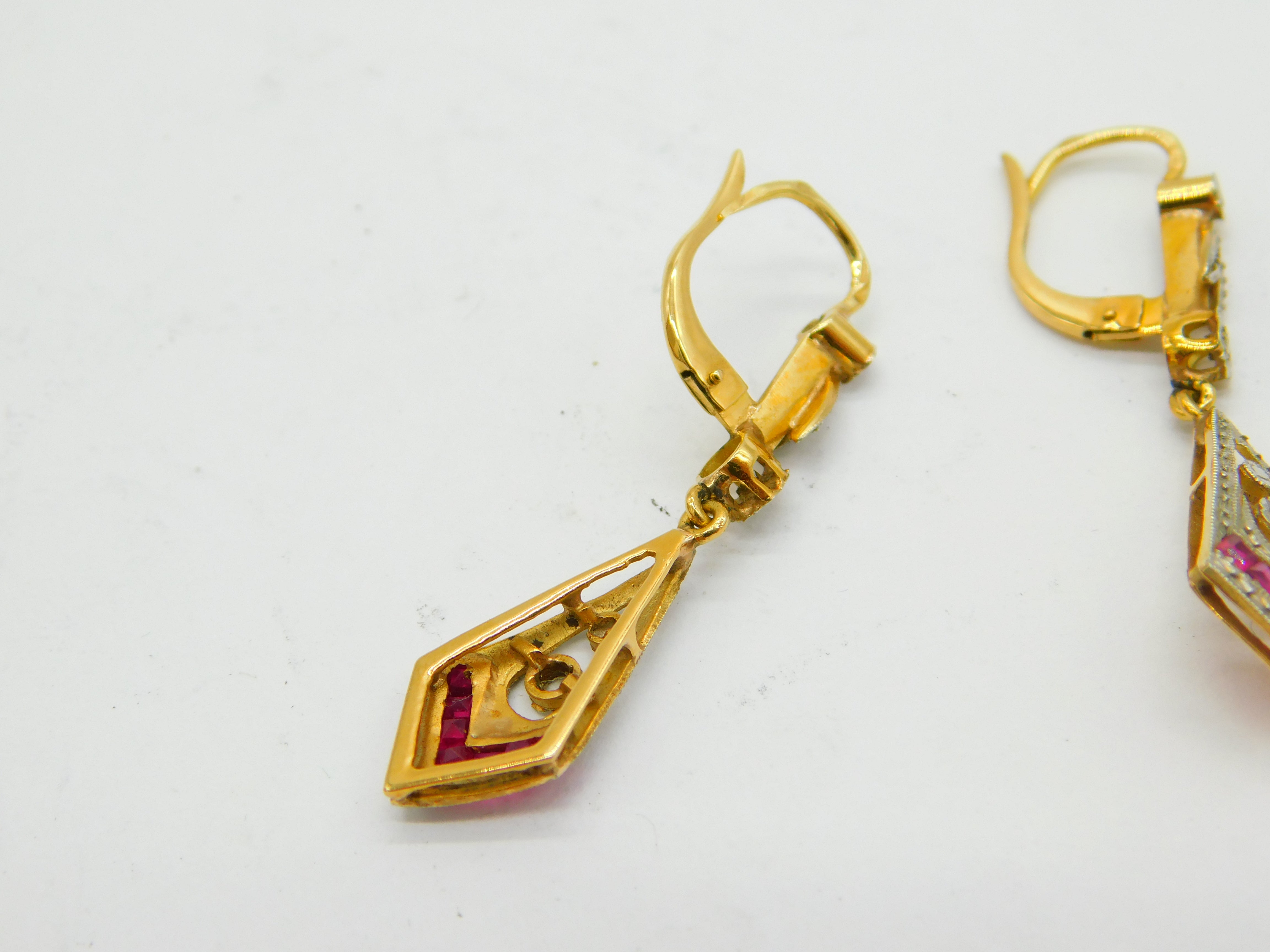 Details: A fantastic and wonderfully designed pair of antique early 20th century French 18ct yellow gold & platinum drop drop earrings set with old-cut diamonds and square cut rubies finished with a true art deco flourish. Included within the original box marked 'A La Comete D'or' by P. Simon Fabricant of 28 Boulevard Barbes, Paris c1920s. The gold is hallmarked and has been XRF tested, all the stones have been tested. This is a wonderful item that would make a perfect gift or addition to any collection. We are more than happy to provide XRF reports for items upon request.