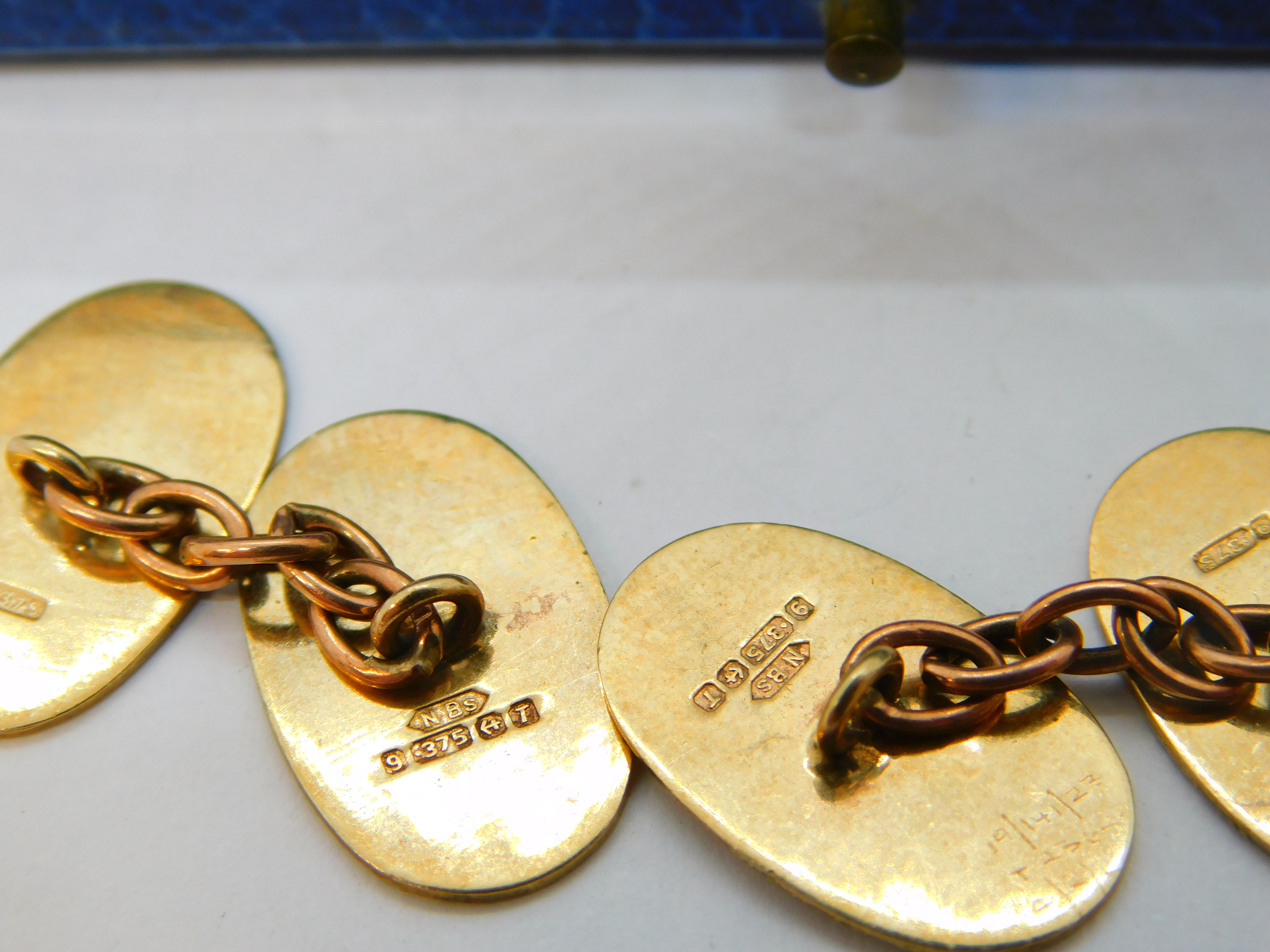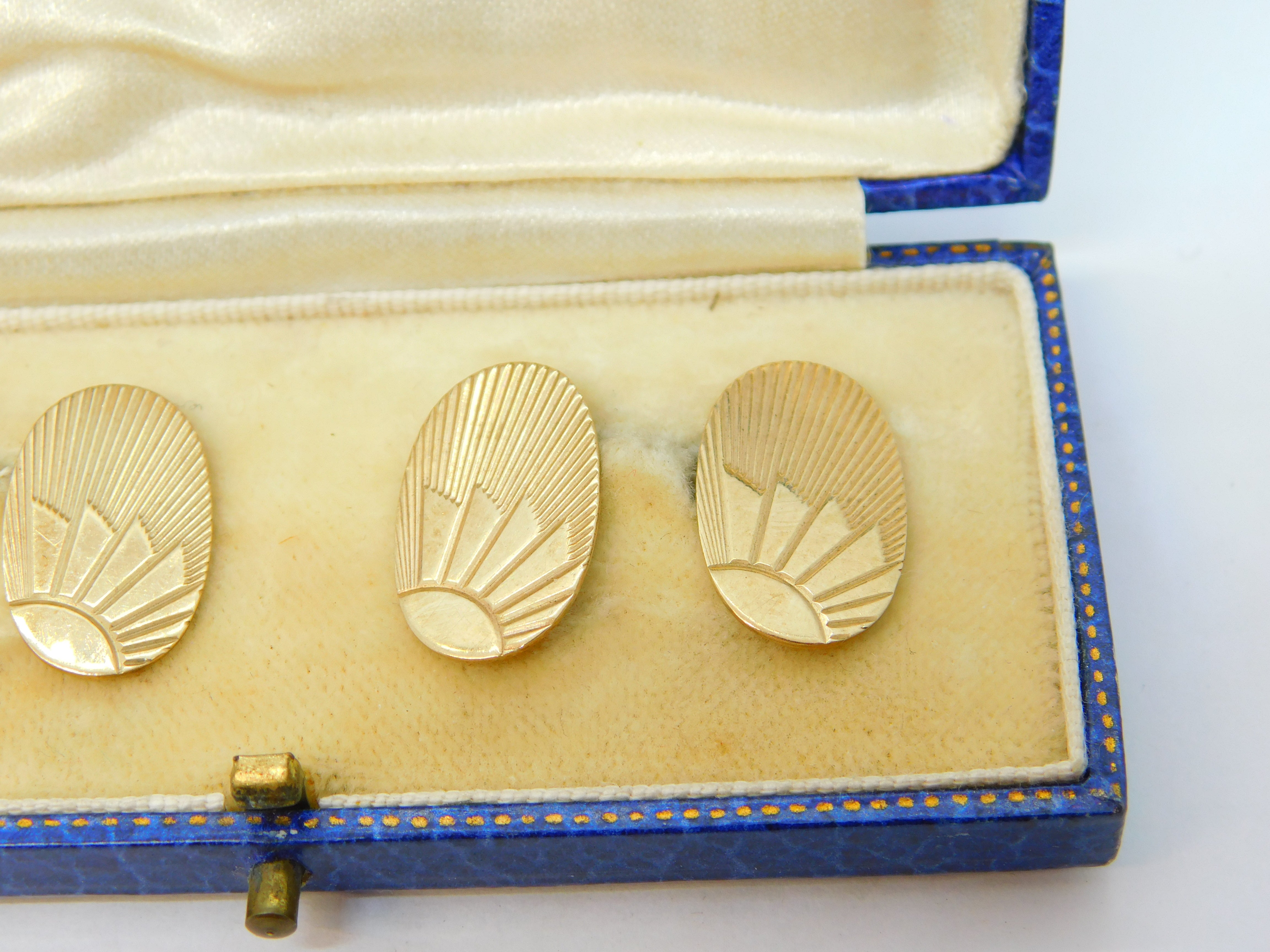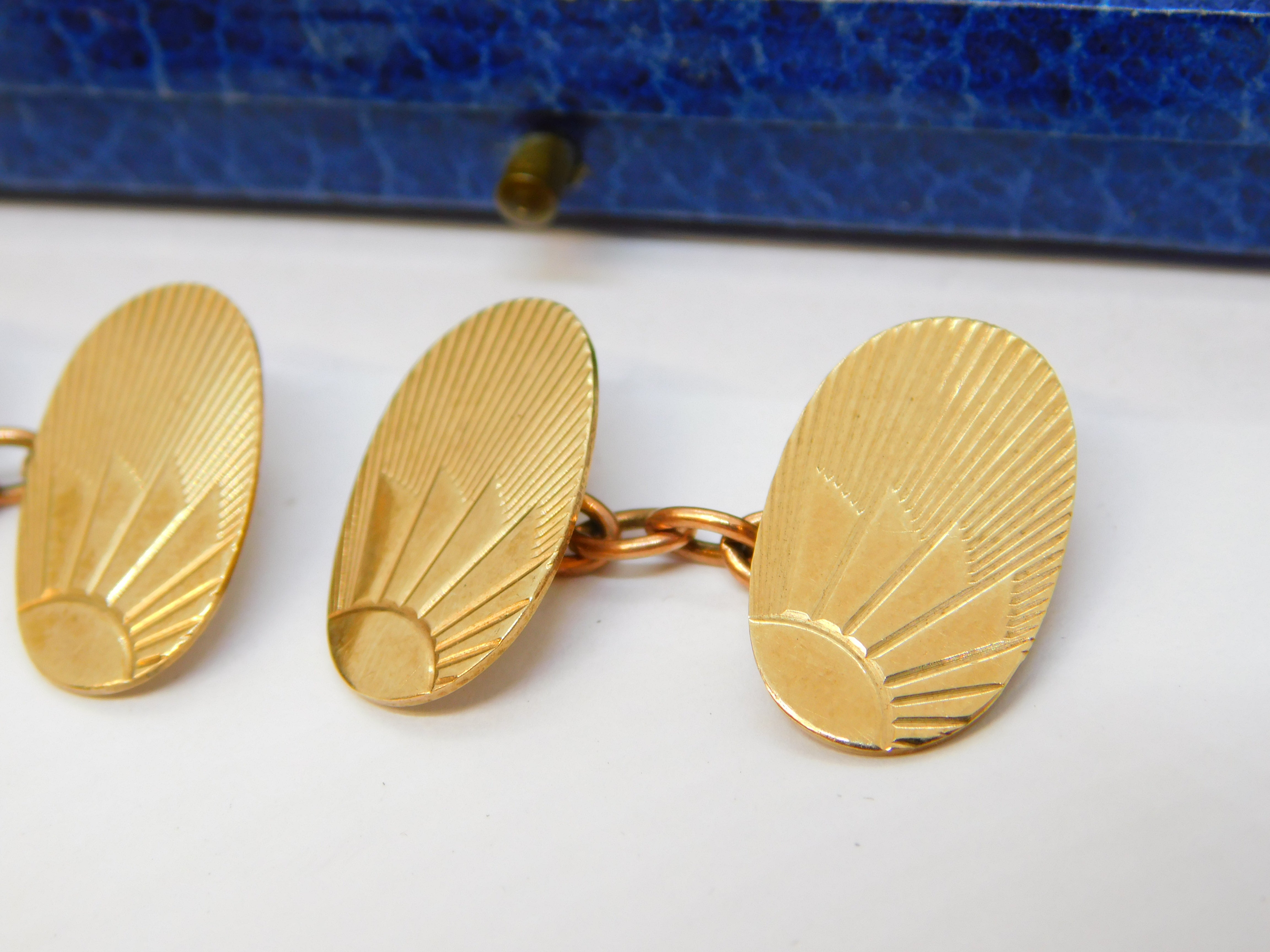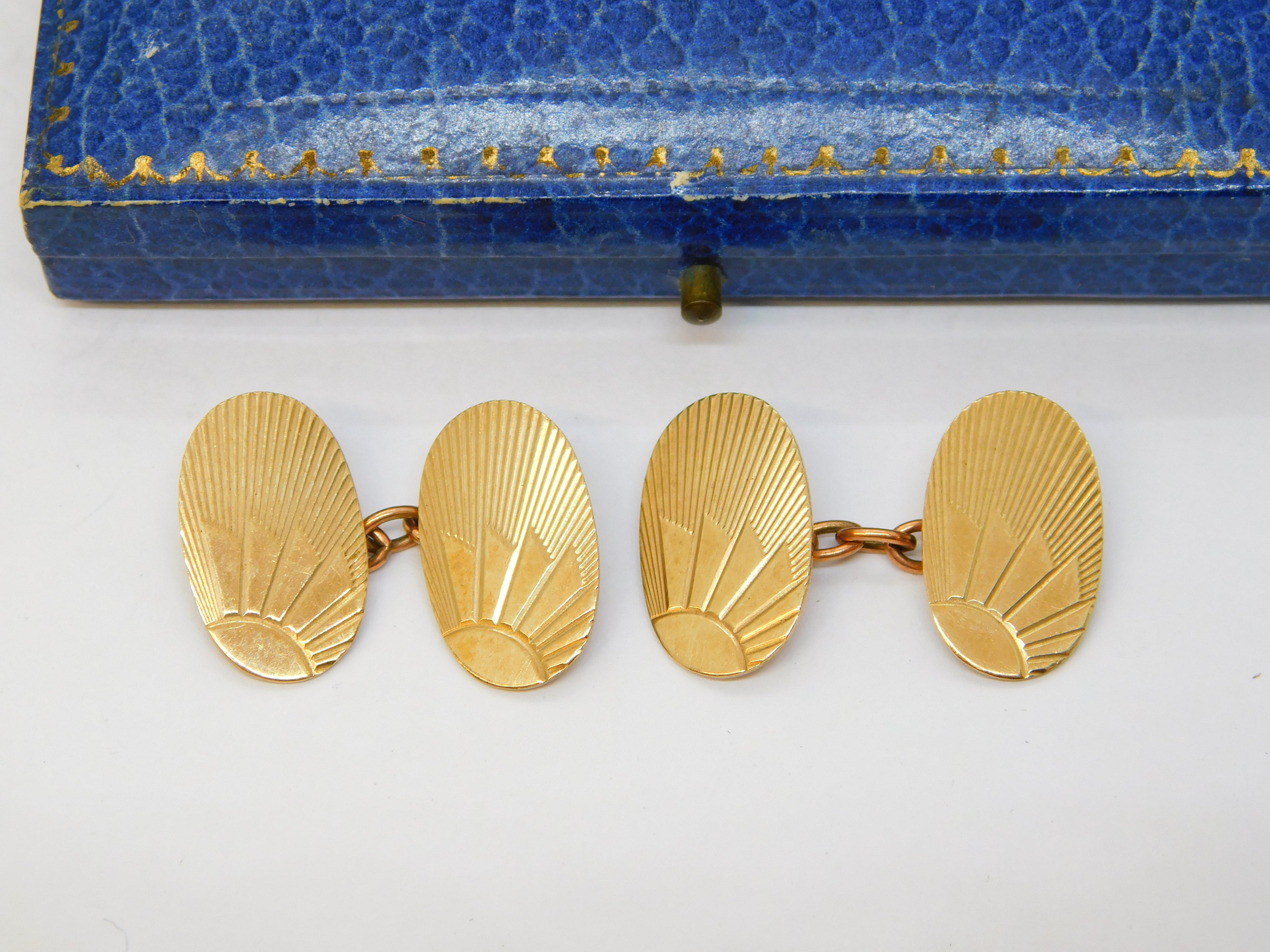 Details: A fantastic and wonderfully designed vintage boxed 9ct yellow gold rising sun pattern gents cufflinks with lovely detailing hallmarked Birmingham 1968 to the reverse, lovely blue tooled leather box. This is a wonderful item that would make a perfect gift or addition to any collection. We are more than happy to provide XRF reports for items upon request.