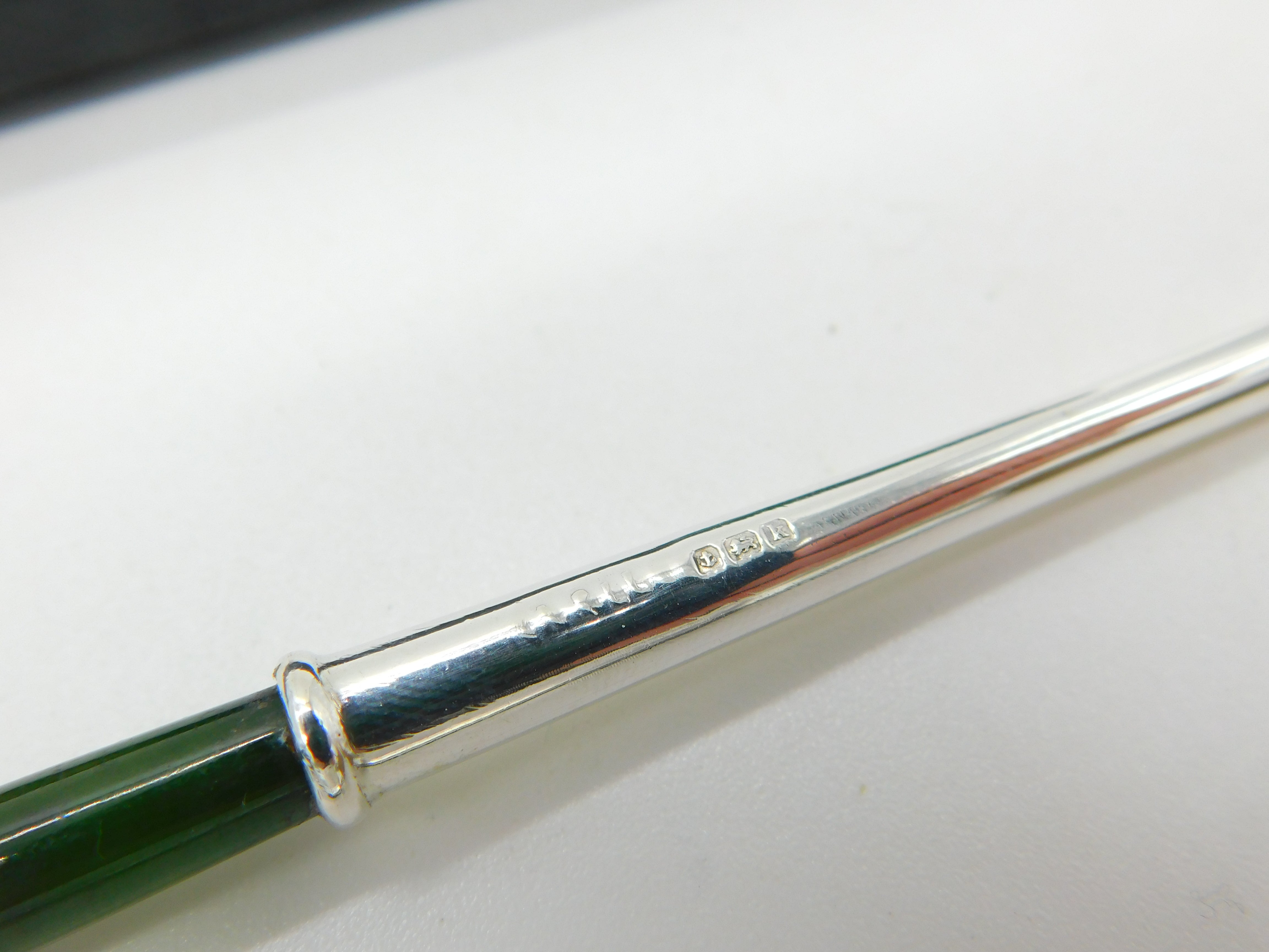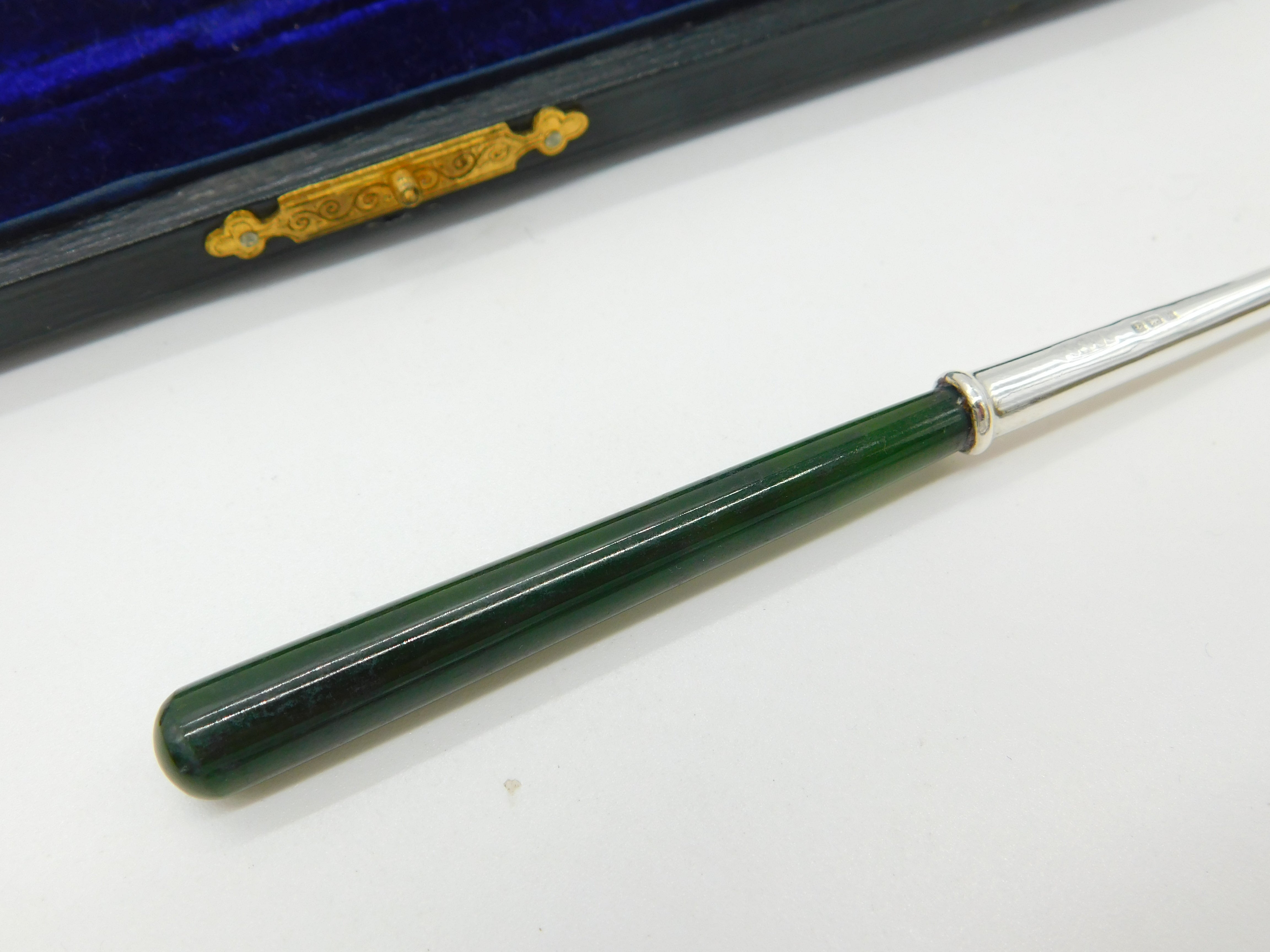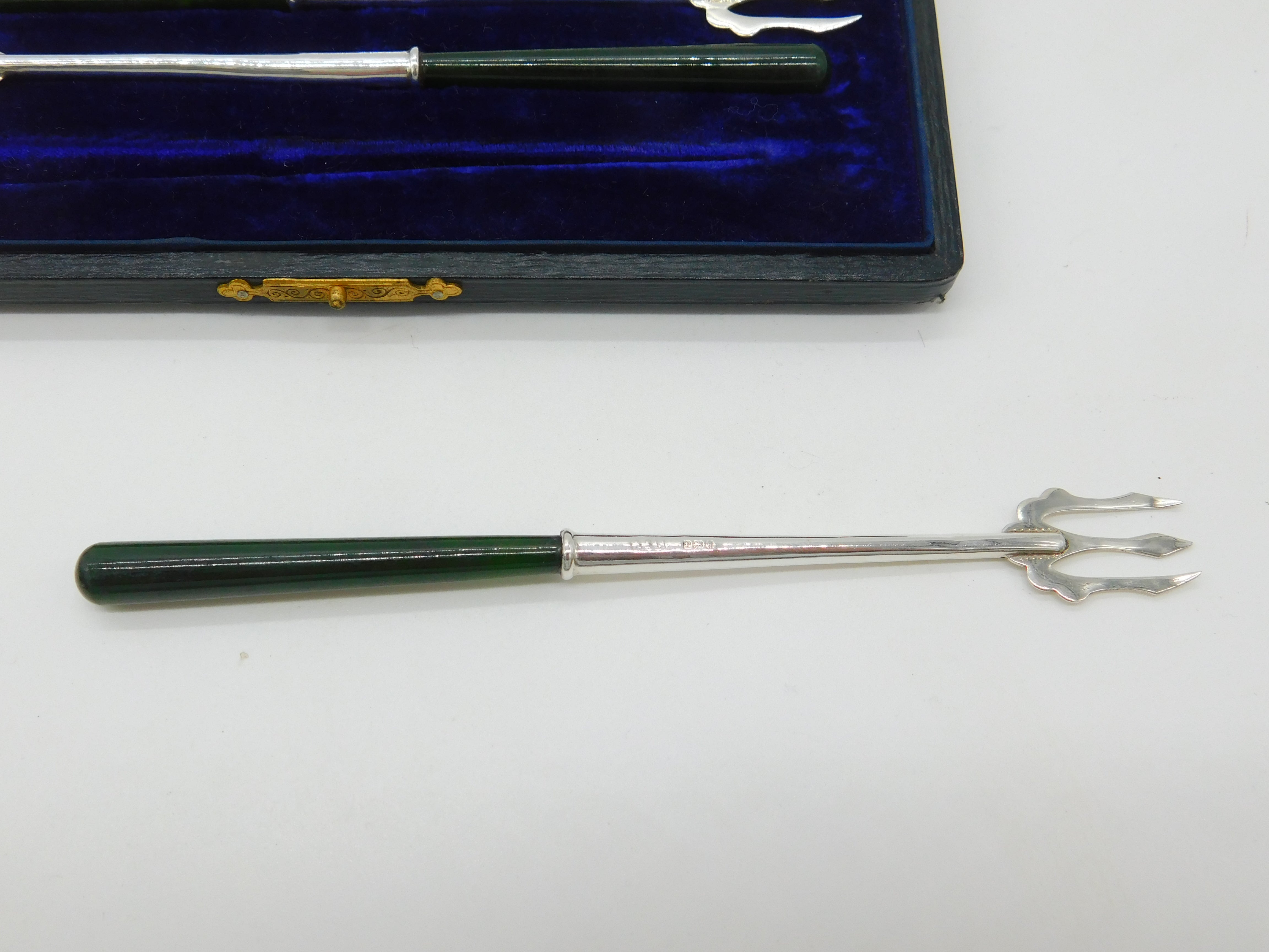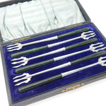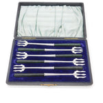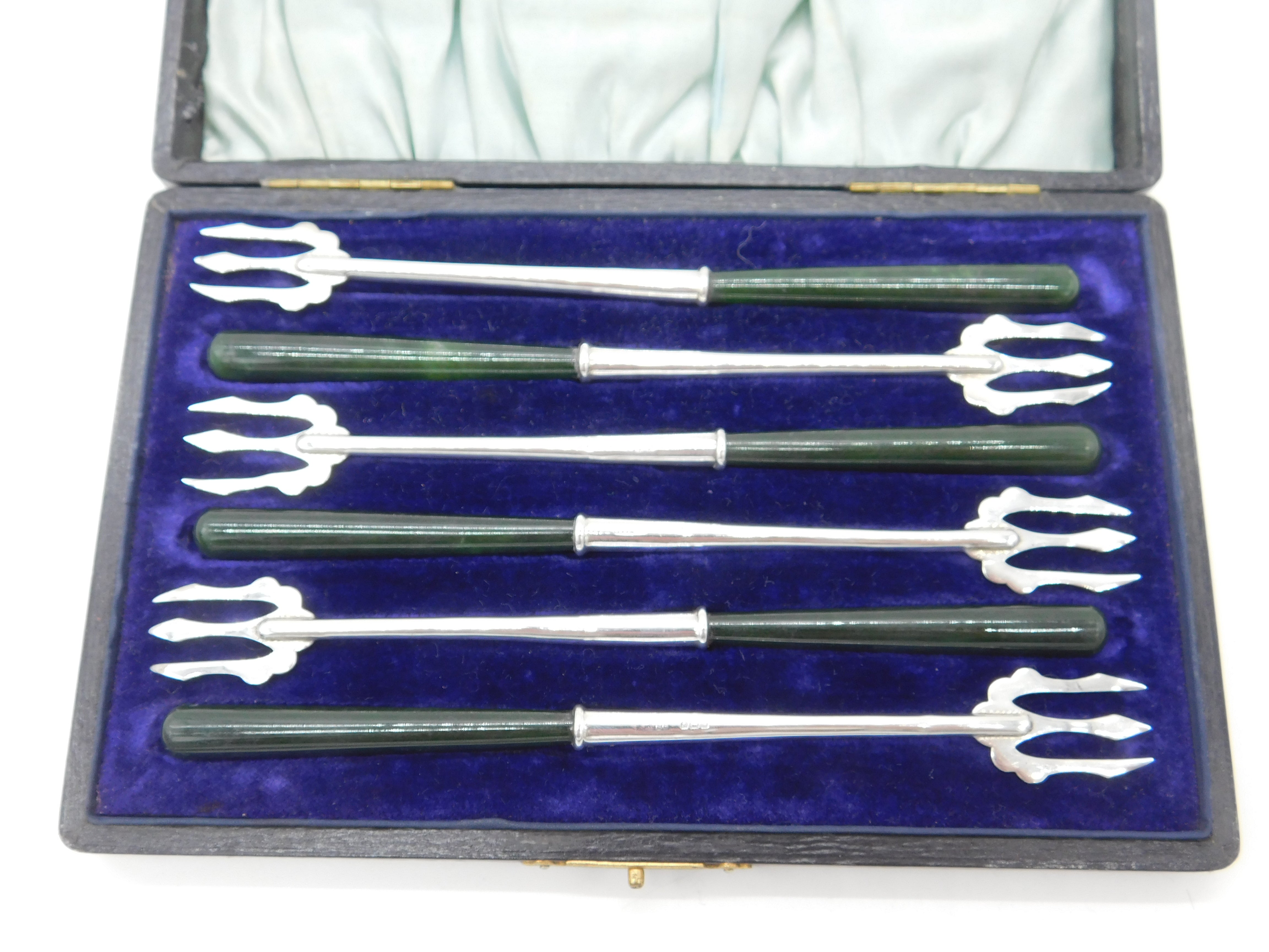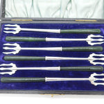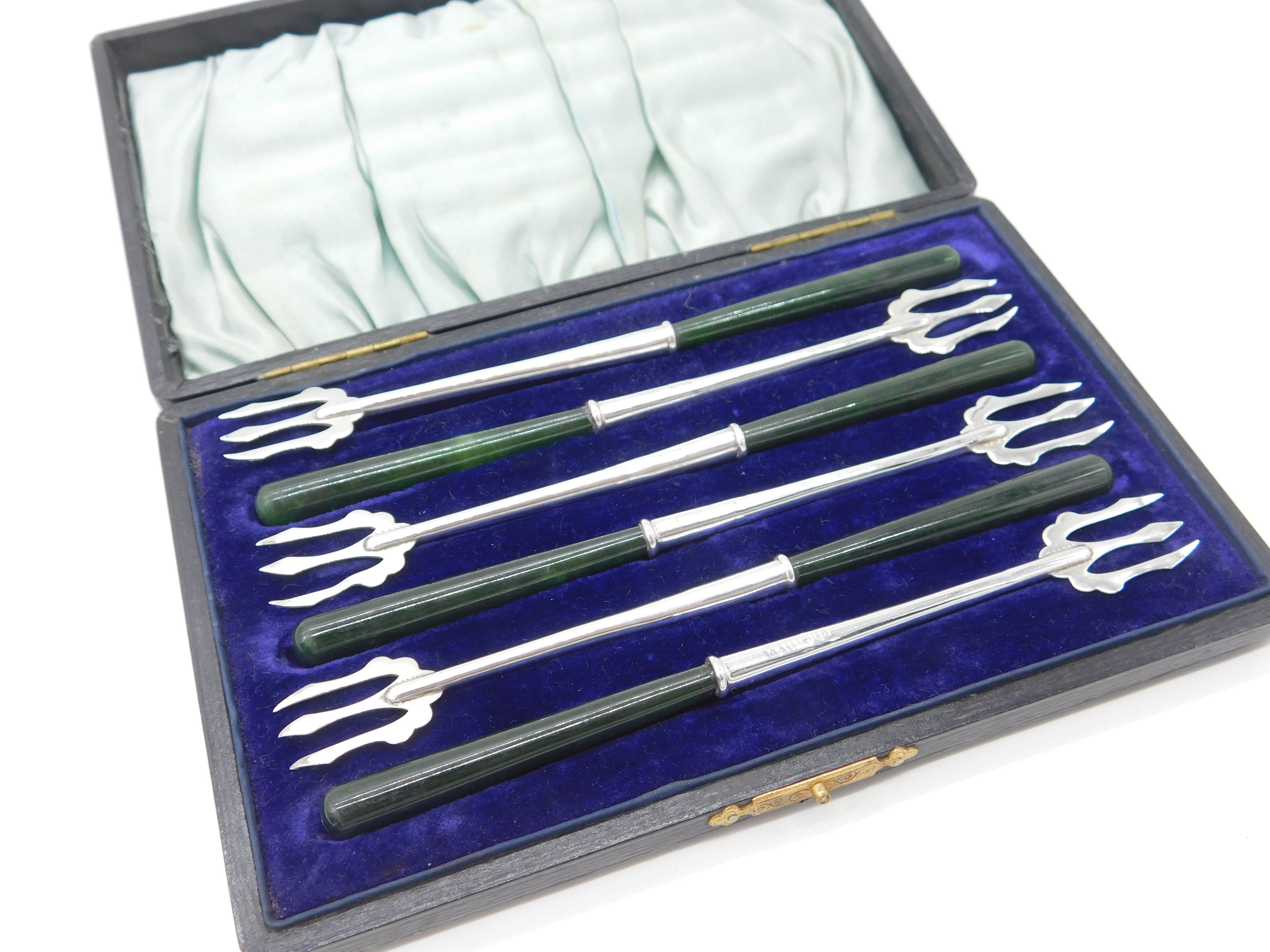 Boxed Set of Edwardian Sterling Silver & Nephrite Jade Pastry Forks Antique 1909