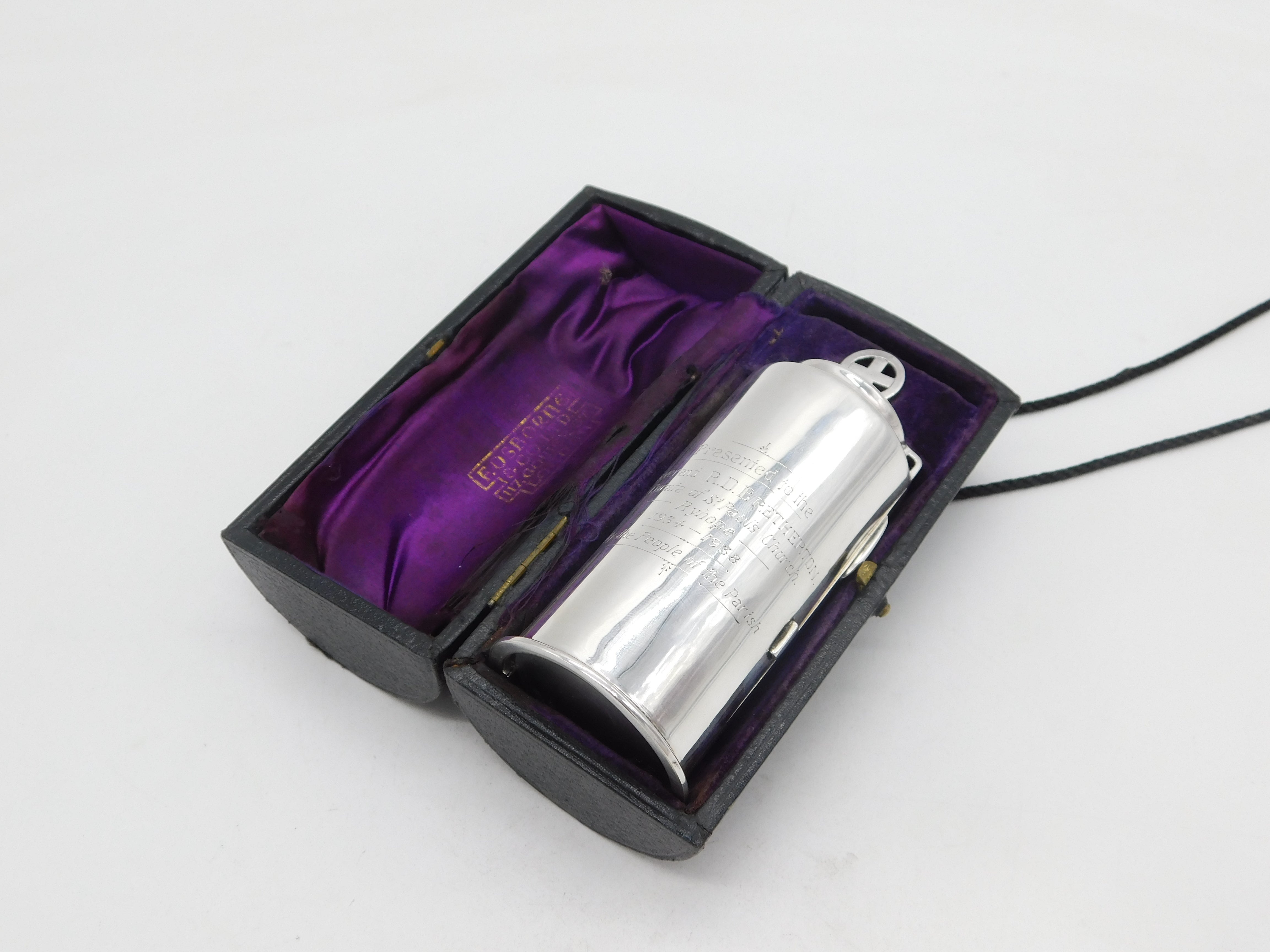 Details: A fantastic and wonderfully designed antique art deco sterling silver travelling ecclesiastical communion set to include miniature communion chalice, paten and wafer box held within a lovely case. The silver is all individually hallmarked for London 1937 by F Osborne & Co Ltd. Included within the original fitted box with string necklace. This is a wonderful item that would make a perfect gift or addition to any collection. We are more than happy to provide XRF reports for items upon request.