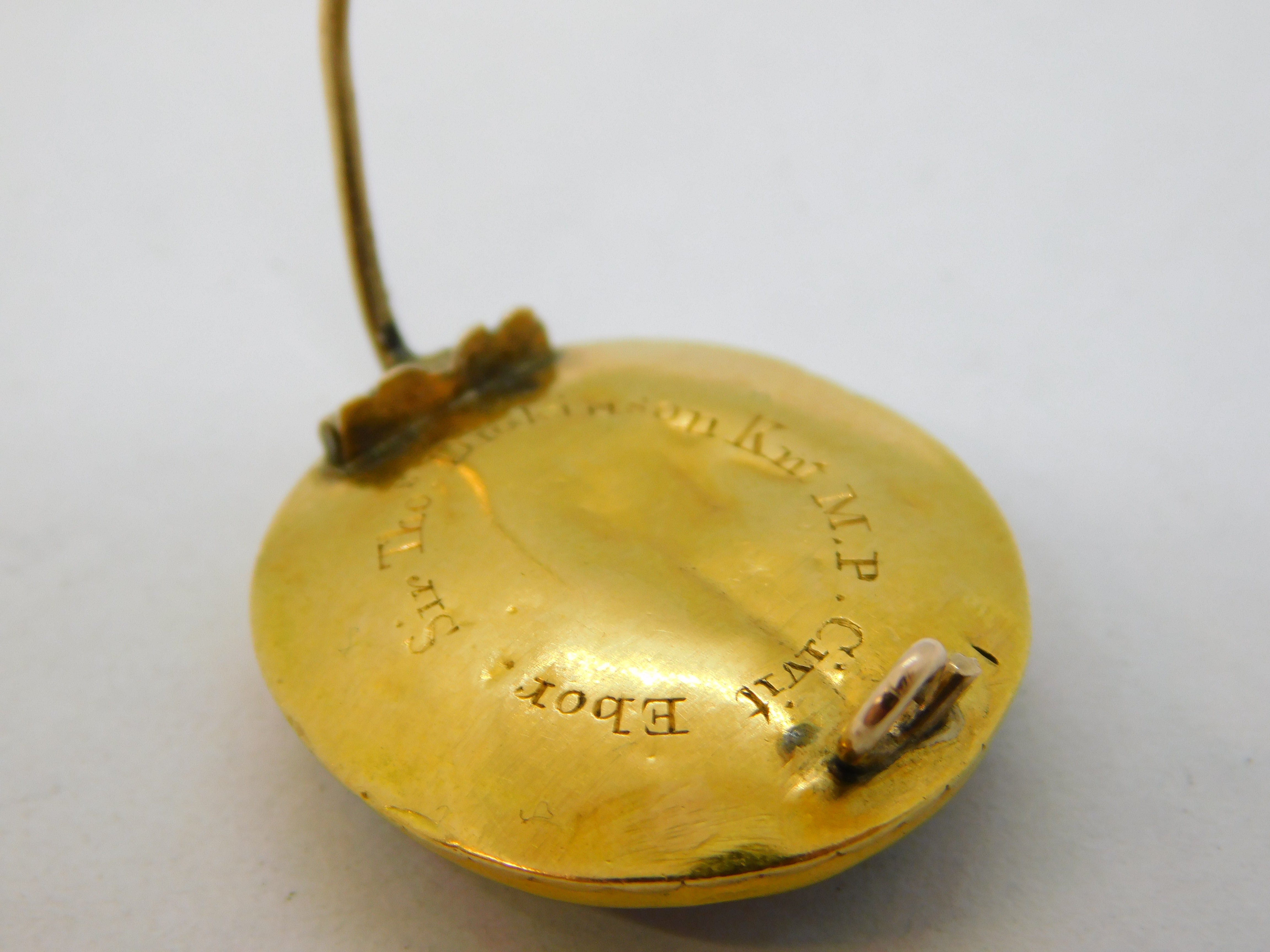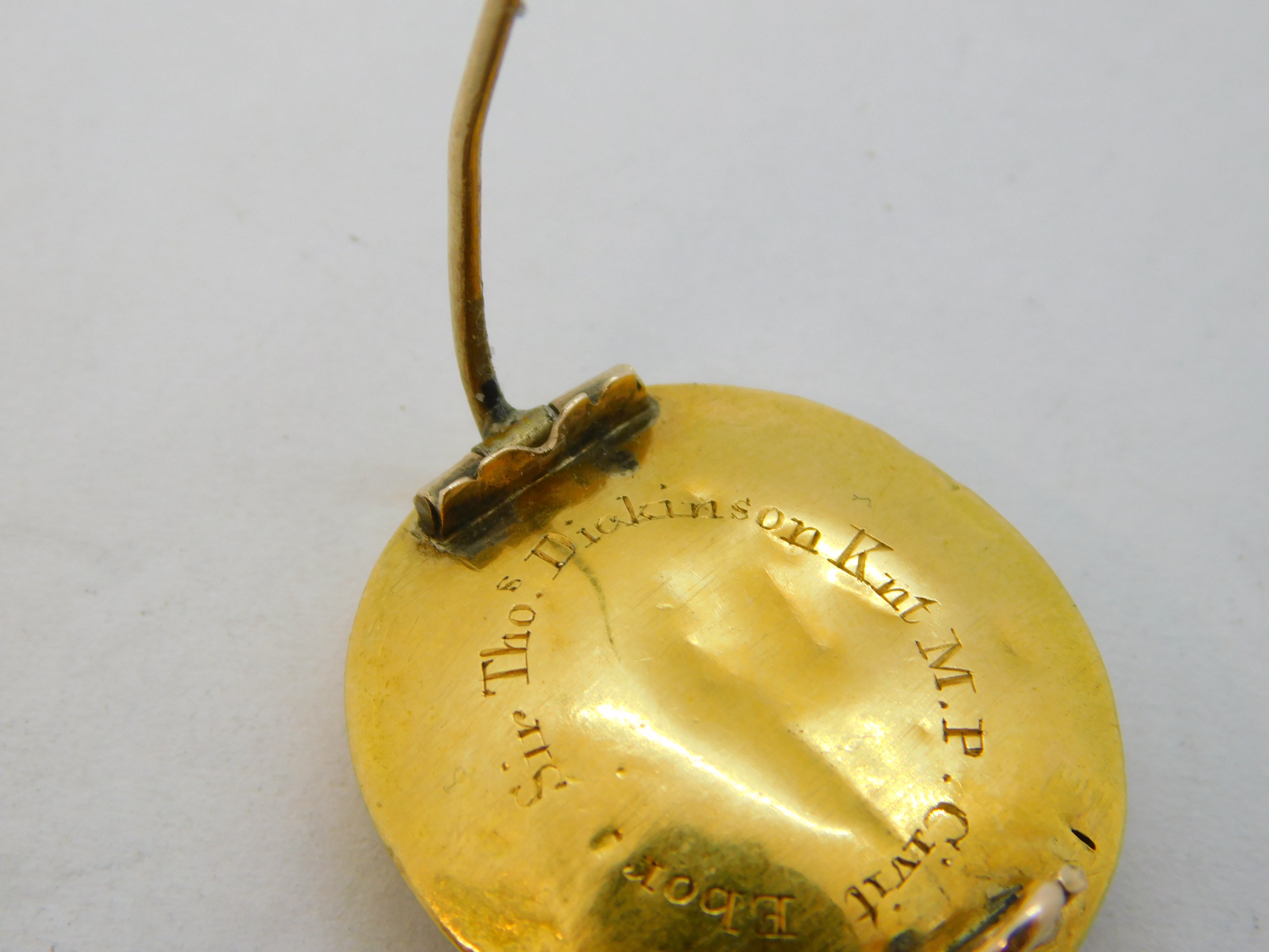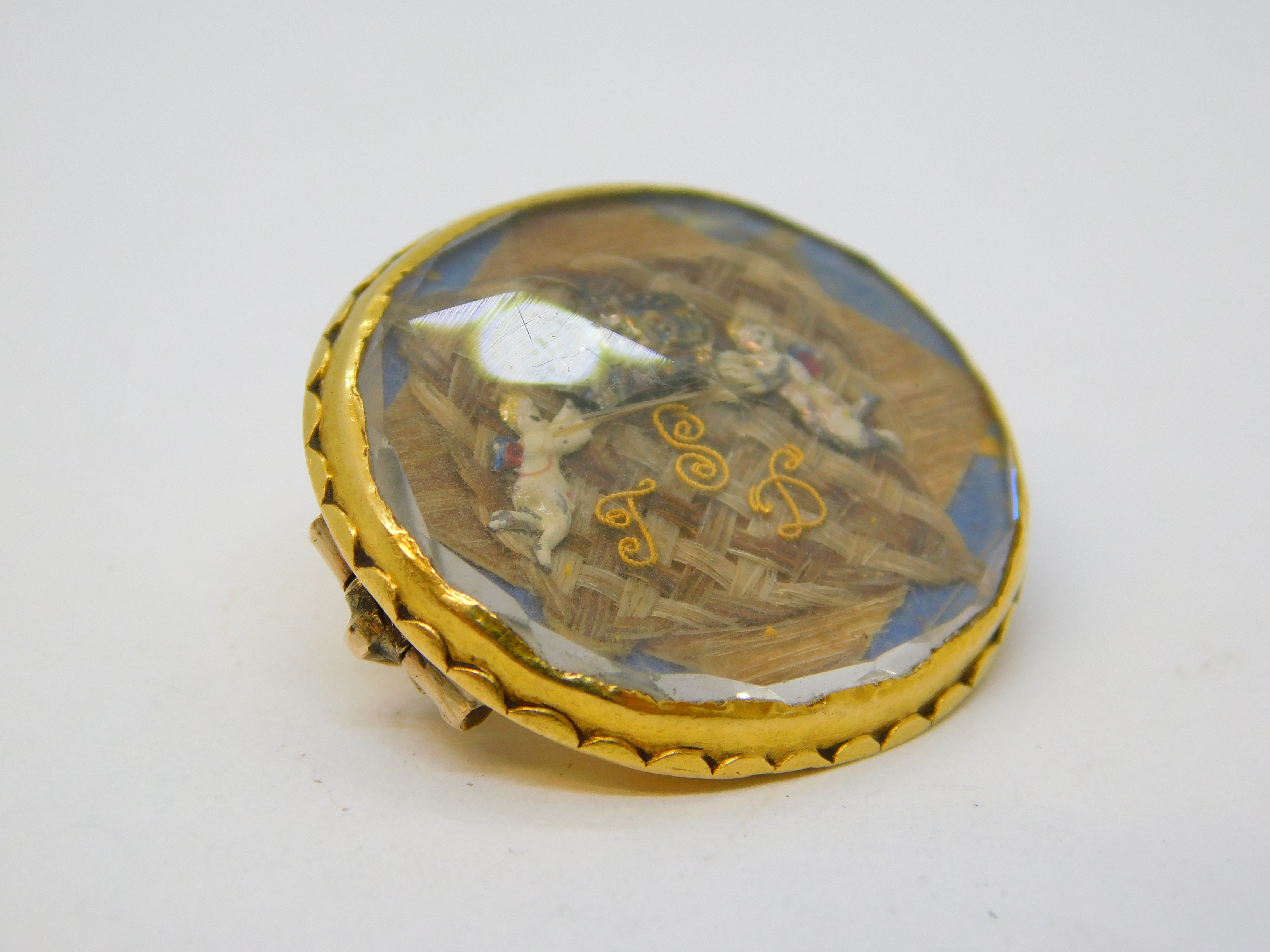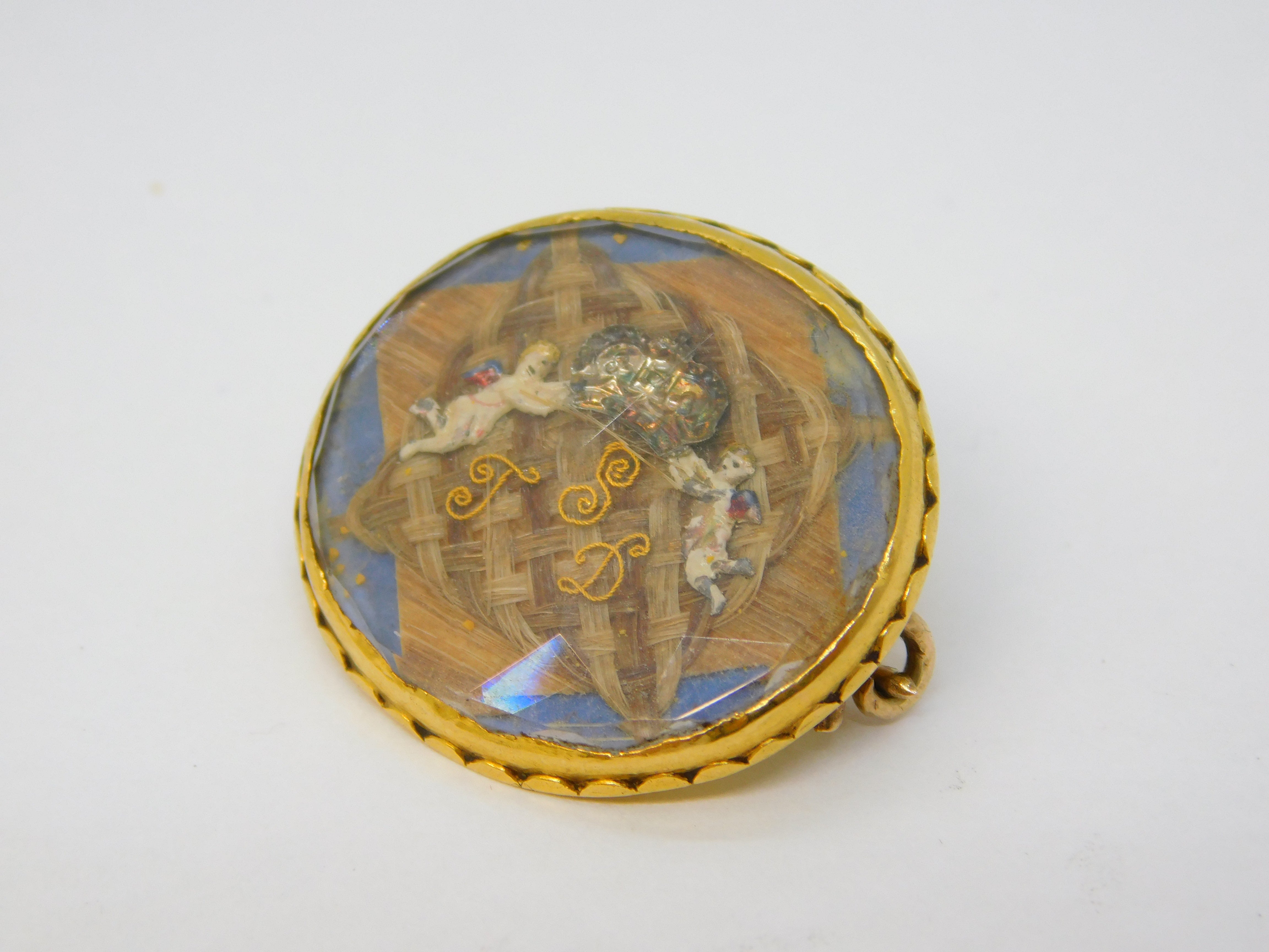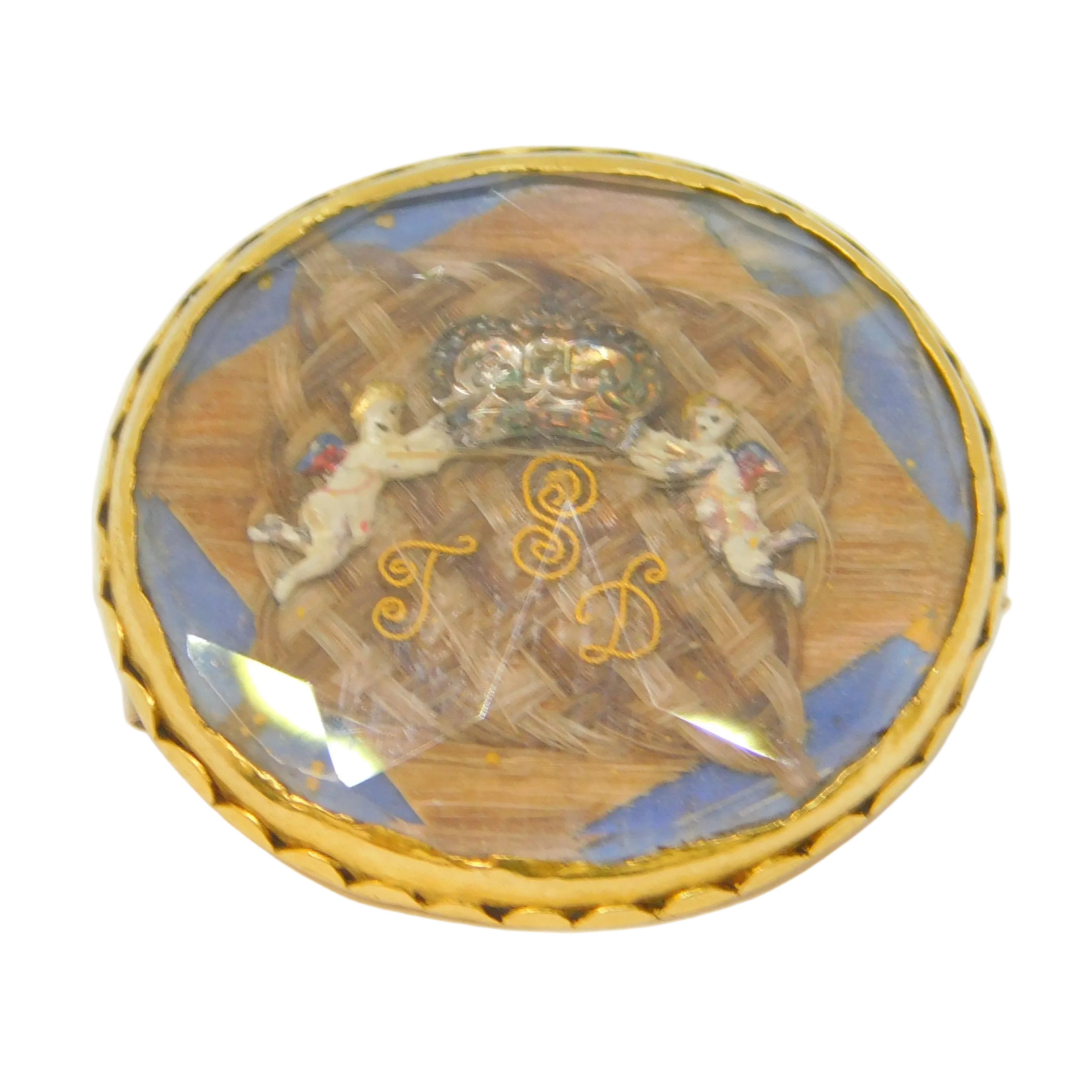 Details: A stunning high-carat gold commonwealth period stewart crystal mourning brooch with a square hairwork section overlain with gold initials reading 'S.T.D' for Sir Thomas Dickenson the Lord Mayor of York for two terms in 1656 & 1657, unusually knighted by Oliver Cromwell. Dickinson was also a prominent merchant and politician in the commonwealth government, a close confident of Cromwell himself. The initials are flanked by two cherubs holding a crown, a symbol that was forbidden by Cromwell adding further intrigue to the brooch. The stewart crystal is mounted in high-carat gold that tests as 18ct-20ct. The reverse of the brooch bears the inscription 'Sir Thos Dickinson Knt M.P Civit Ebor'. This is a superb example of early jewellery and truly a museum quality example with excellent provenance.