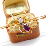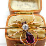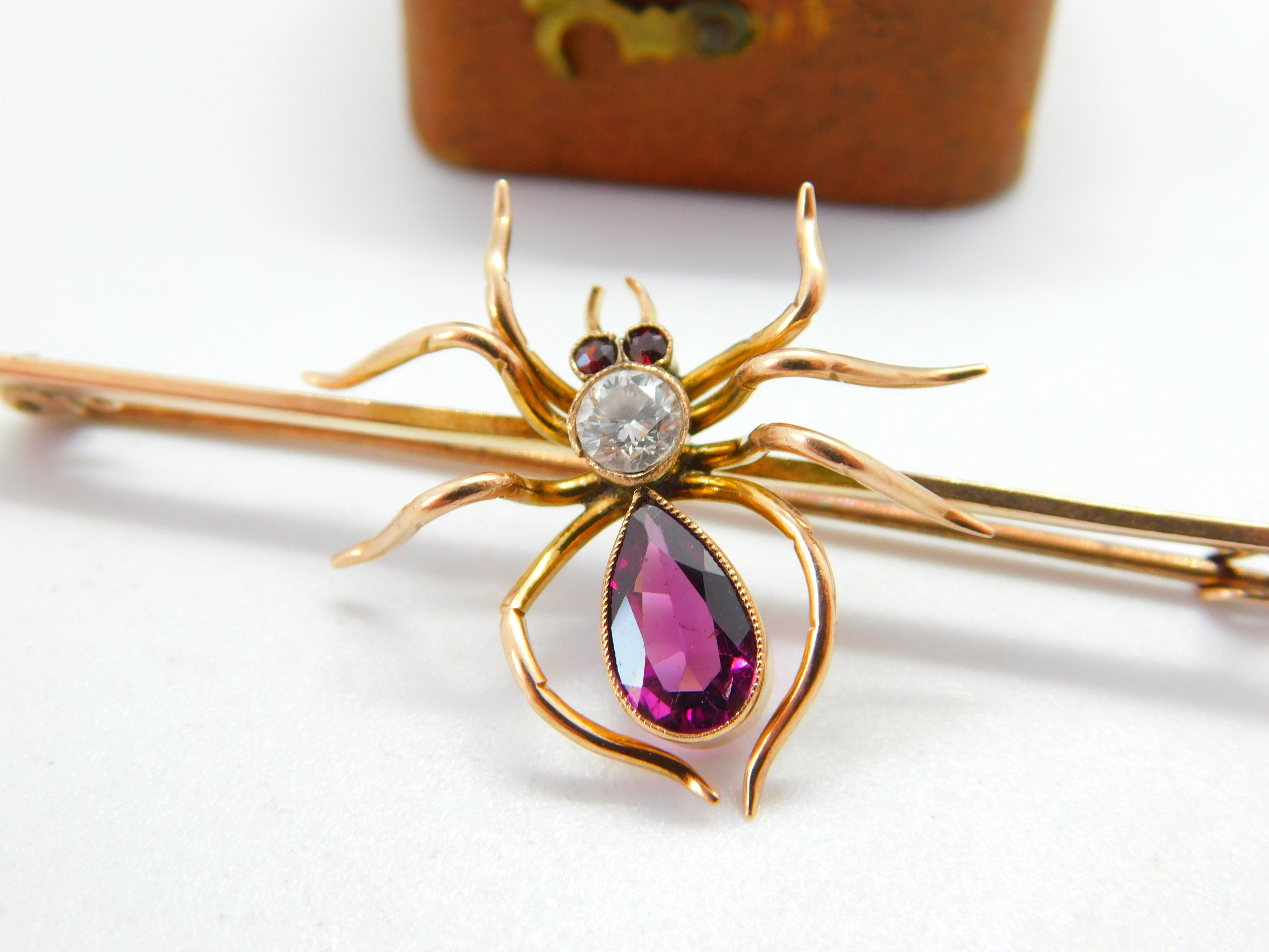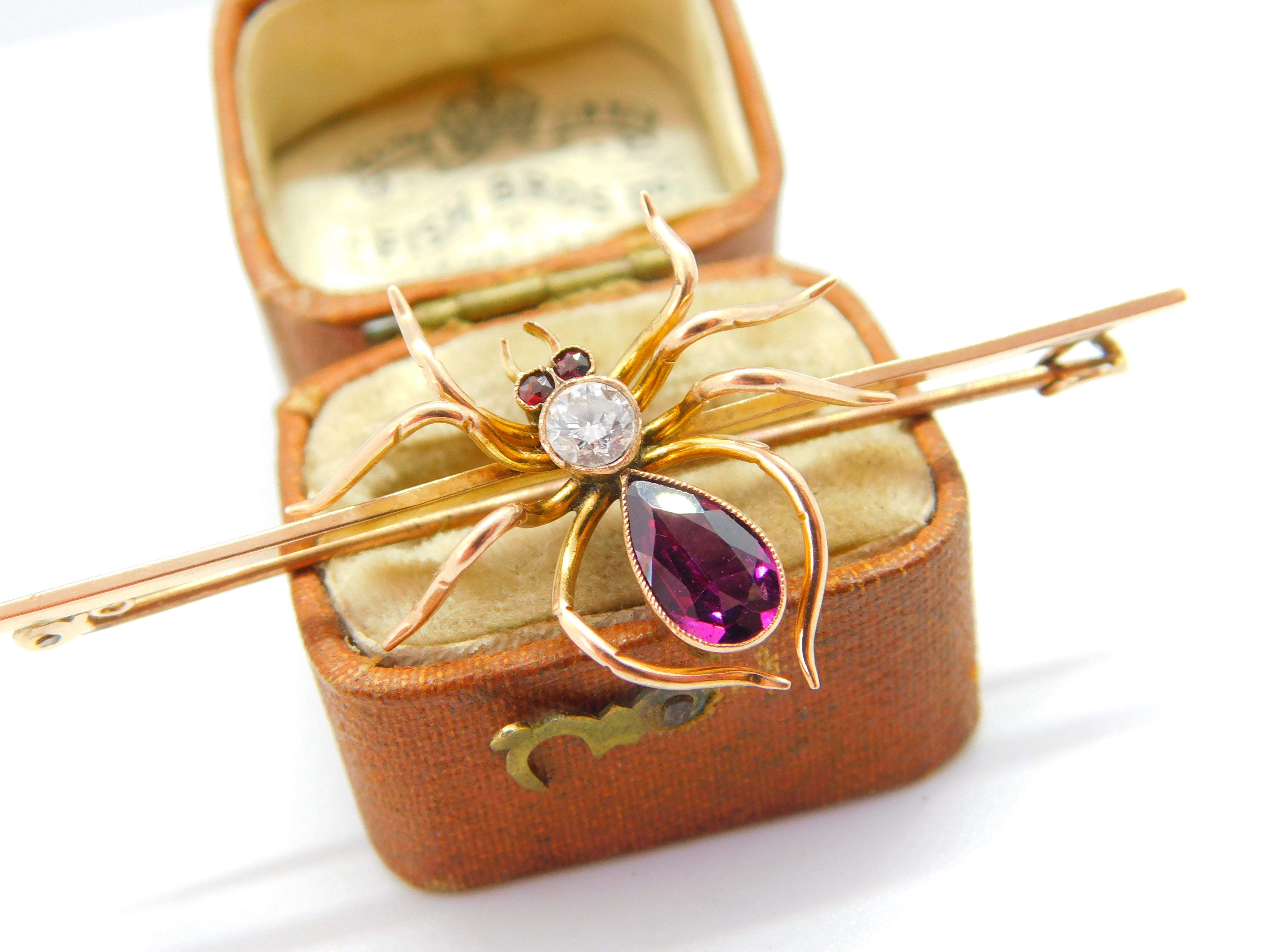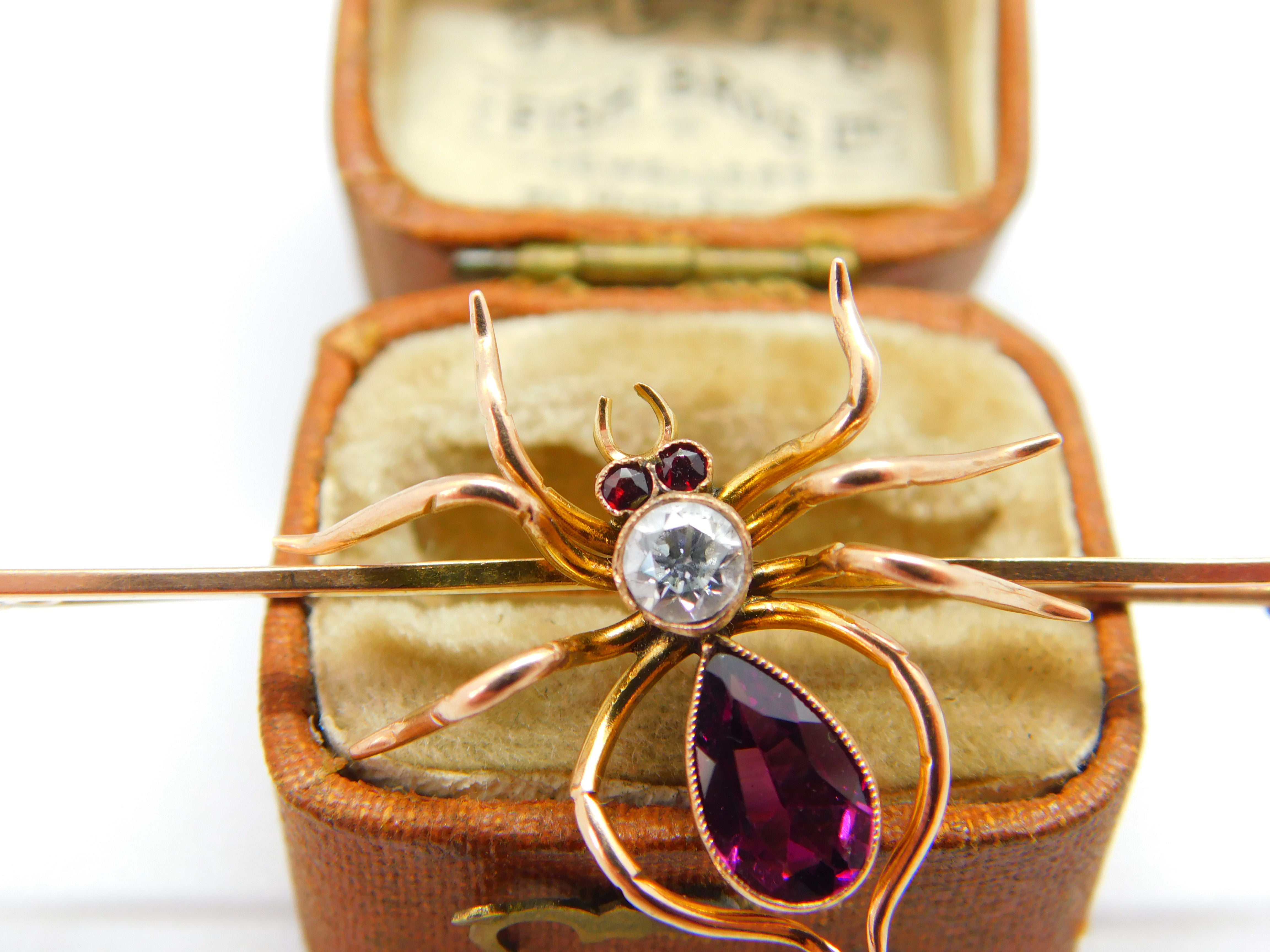 Details: A fantastic and wonderfully designed antique Edwardian 9ct yellow gold suffragette inscent spider brooch set with central 0.2ct natural diamond alongside pear cut almandine garnet stamped '9ct' to the reverse. The stones have all been tested. This brooch is a charming example of edwardian suffrage jewellery often crafted as fundraising for the movement. This is a wonderful item that would make a perfect gift or addition to any collection. The BOX pictured is for PRESENTATION ONLY and is NOT included in the listings but used to frame the pictures unless specifically stated otherwise.
