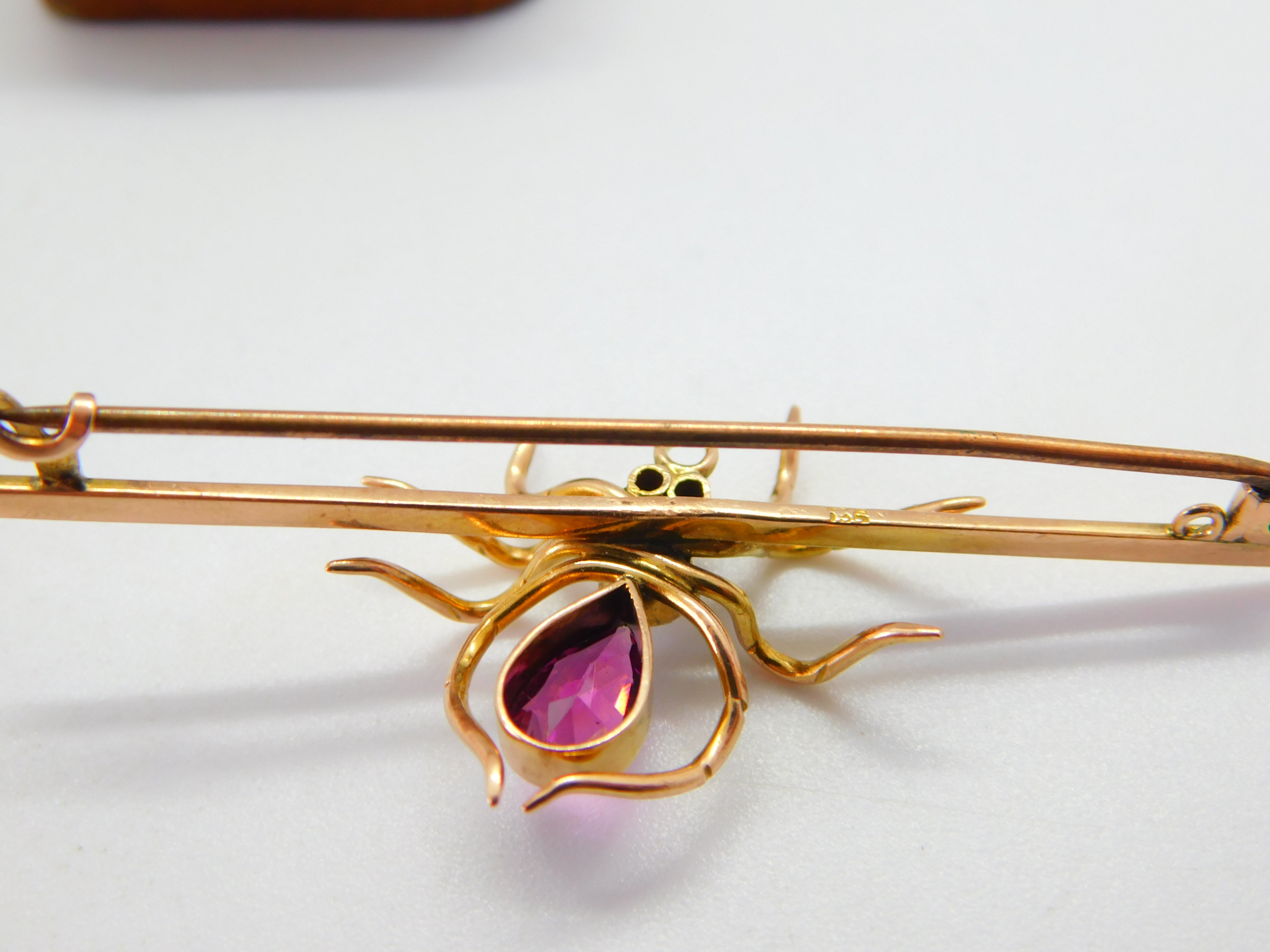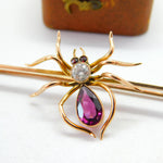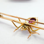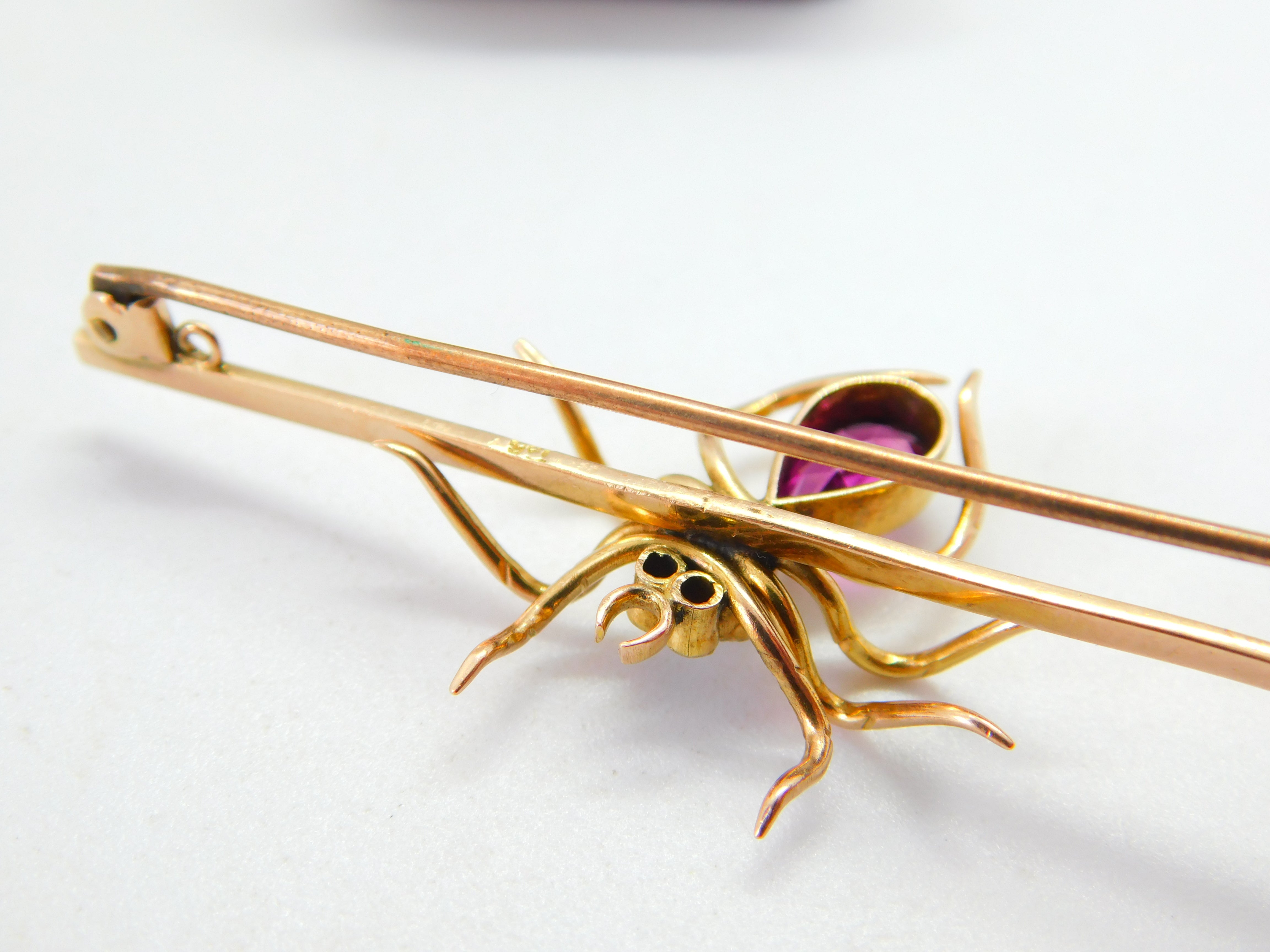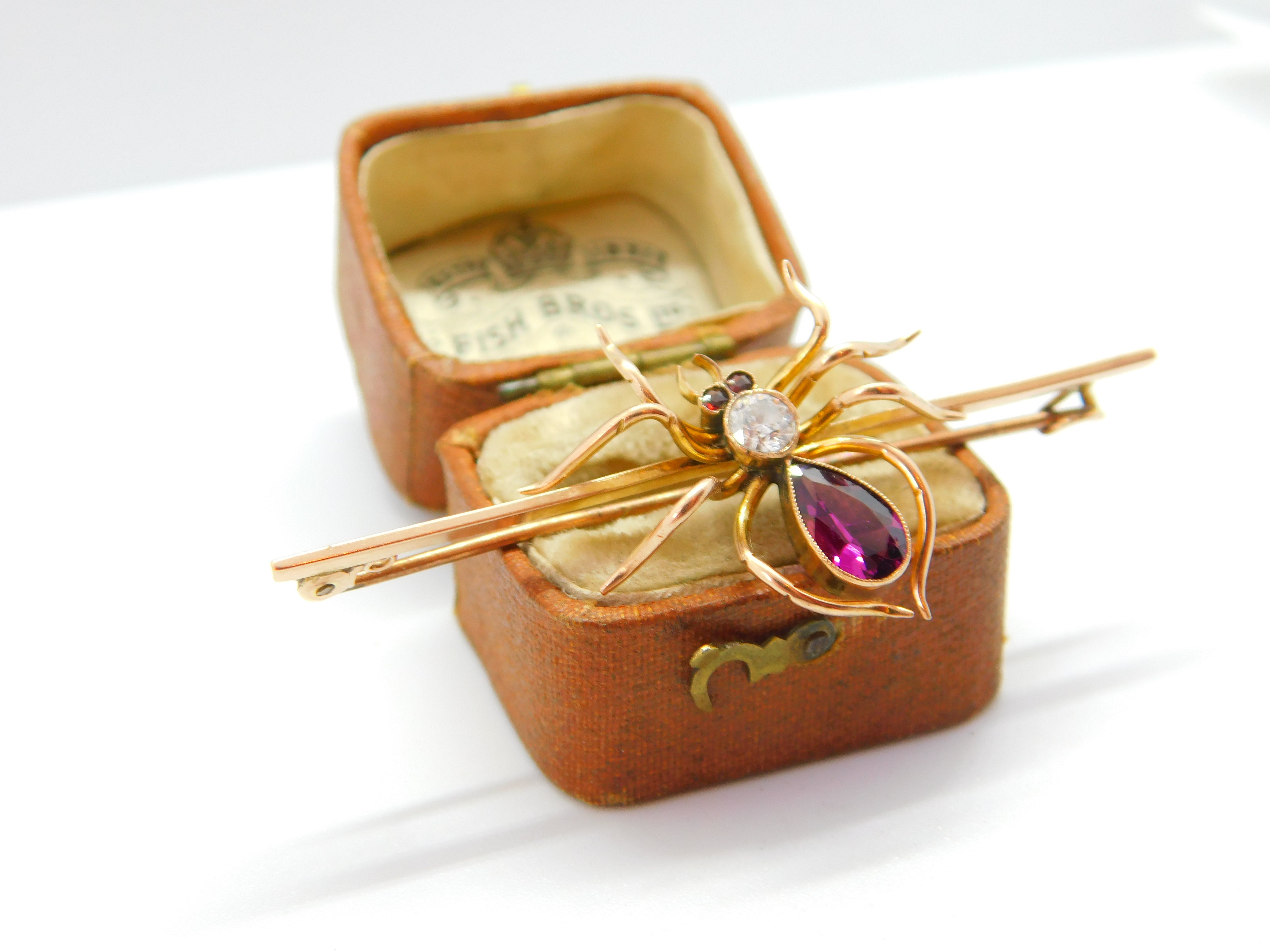 Details: A fantastic and wonderfully designed antique Edwardian 9ct yellow gold suffragette inscent spider brooch set with central 0.2ct natural diamond alongside pear cut almandine garnet stamped '9ct' to the reverse. The stones have all been tested. This brooch is a charming example of edwardian suffrage jewellery often crafted as fundraising for the movement. This is a wonderful item that would make a perfect gift or addition to any collection. The BOX pictured is for PRESENTATION ONLY and is NOT included in the listings but used to frame the pictures unless specifically stated otherwise.