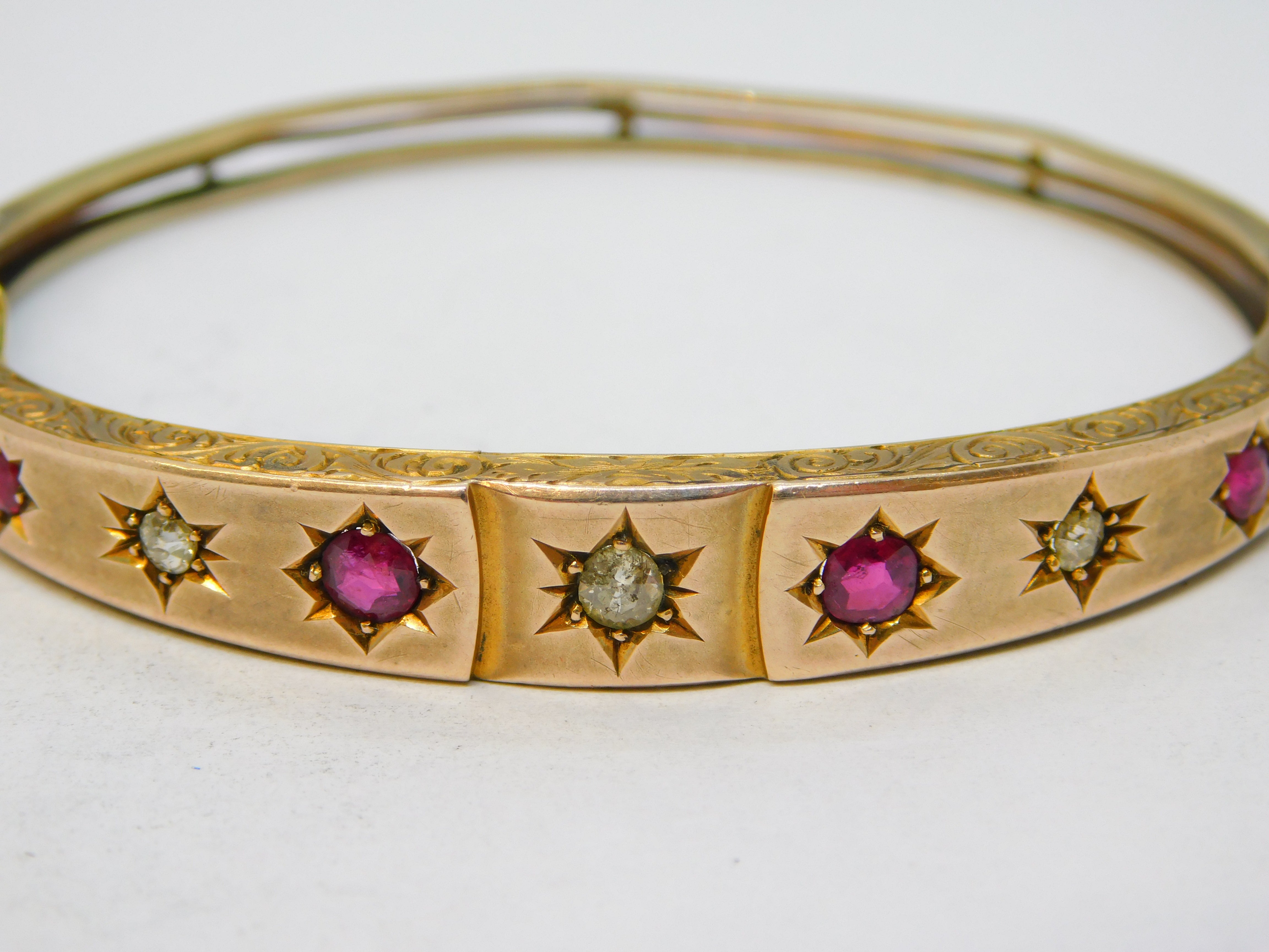 Details: A fantastic and wonderfully designed antique Victorian 9ct yellow gold floral cuff bangle bracelet set with graduating brilliant cut diamonds & rubies, the central diamond approximately 0.2ct, hallmarked '9ct' to the interior and XRF tested. Minor denting to the reverse of the bangle. This is a wonderful item that would make a perfect gift or addition to any collection. We are more than happy to provide XRF reports for items upon request.