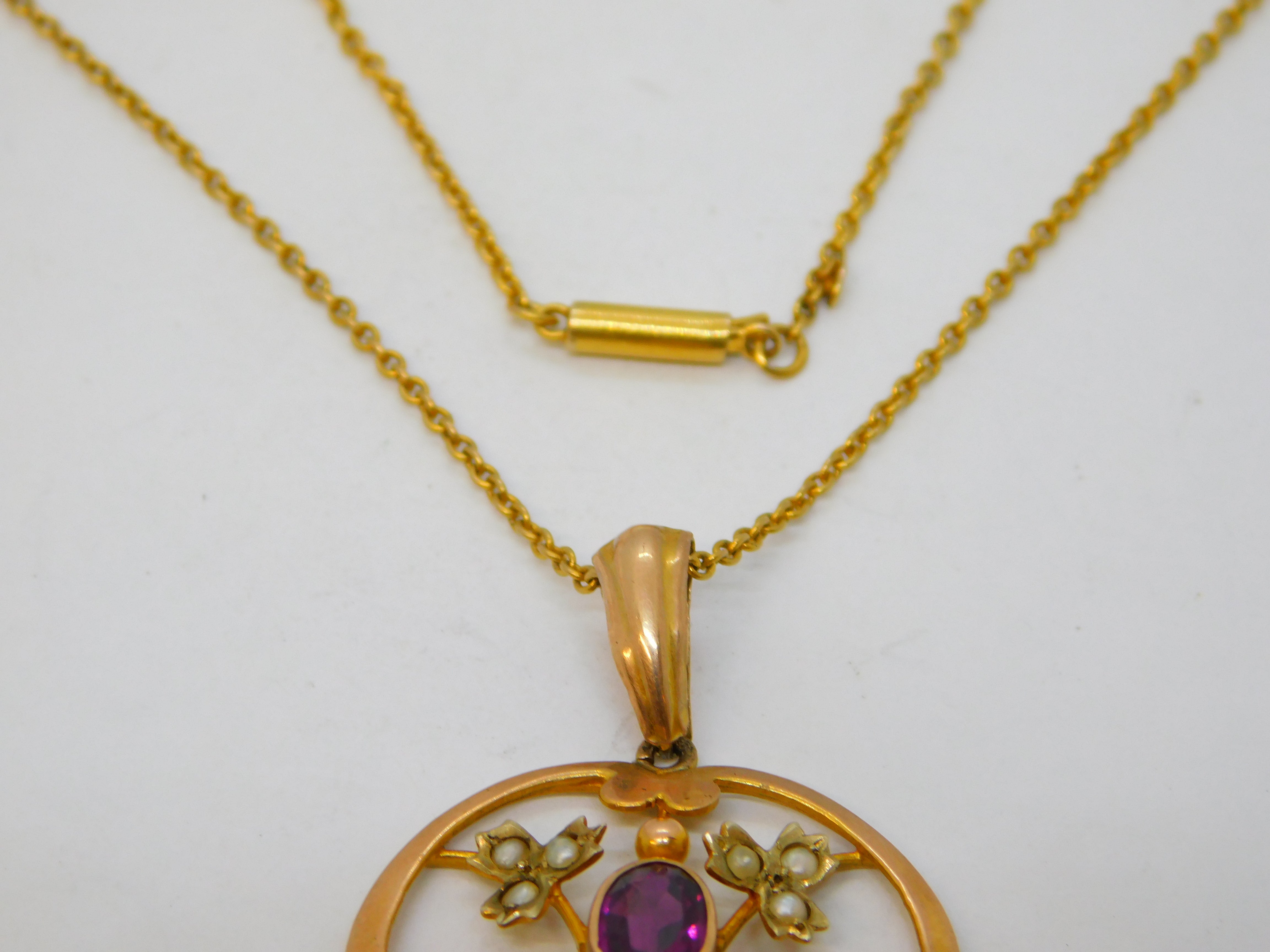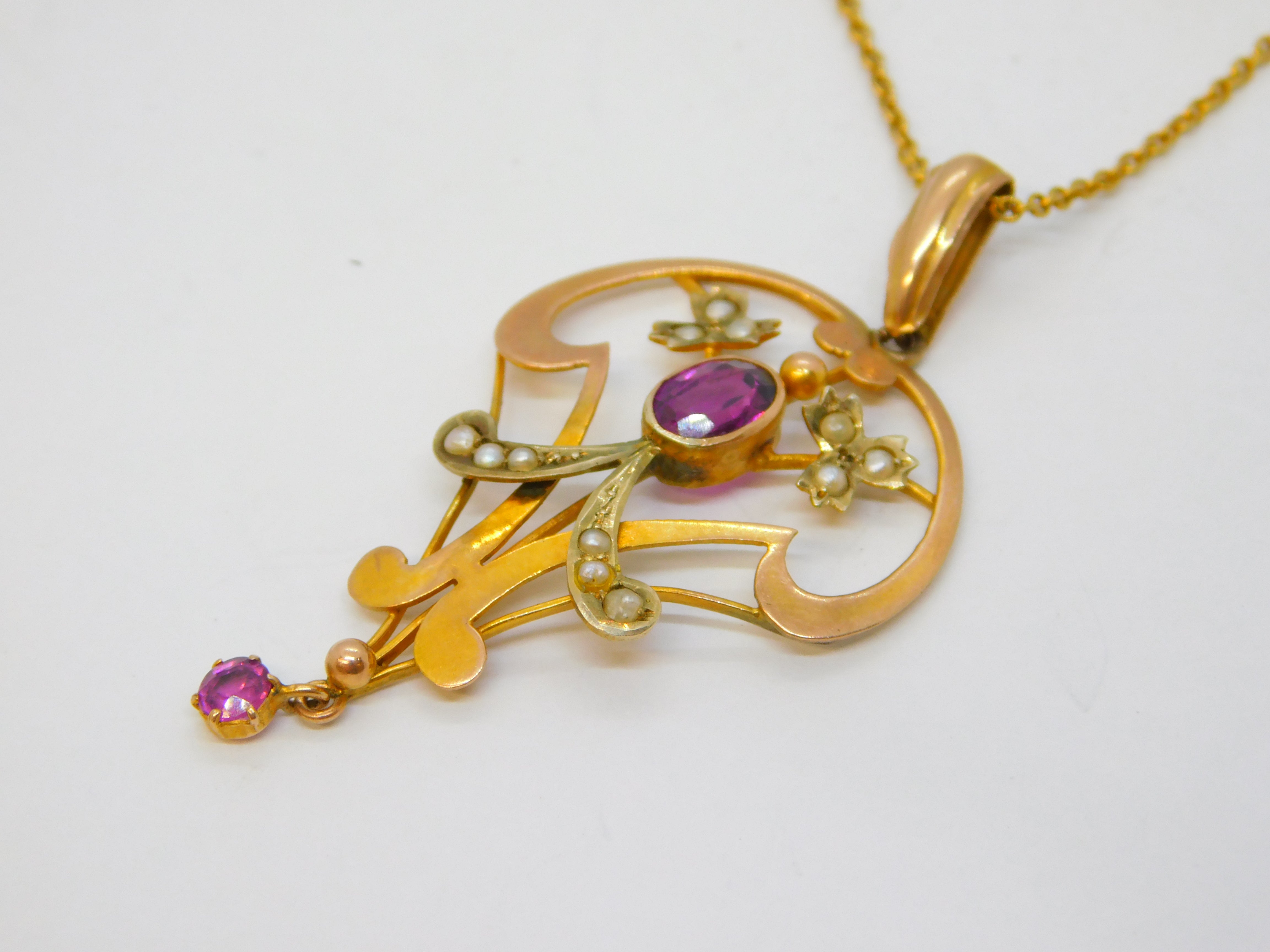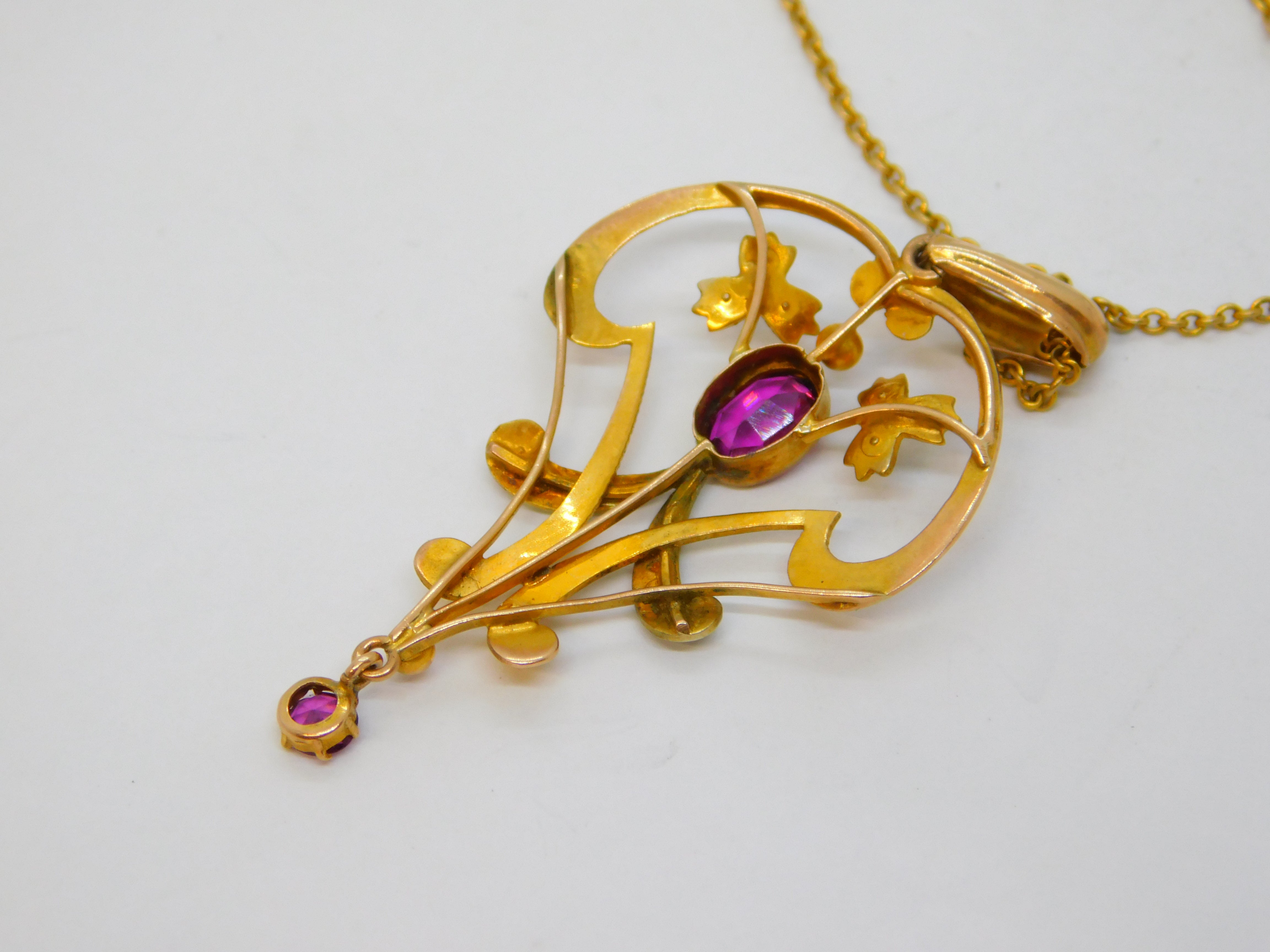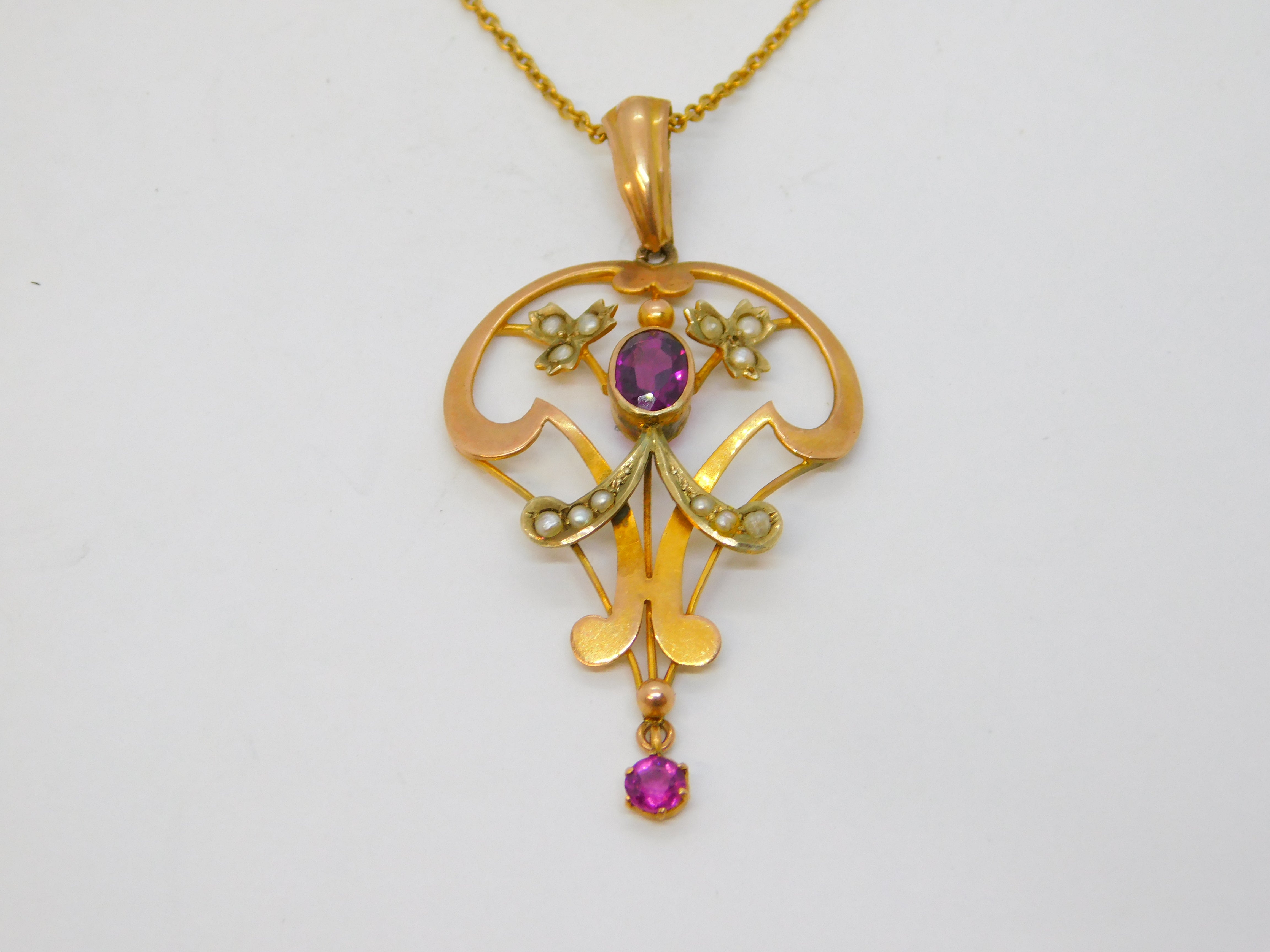 Details: A fantastic and wonderfully designed antique edwardian 9ct yellow gold lavalier drop pendant necklace set with almandine garnets & seed pearls, hallmarked to the chain and XRF tested c1910s. This is a wonderful item that would make a perfect gift or addition to any collection. We are more than happy to provide XRF reports for items upon request.