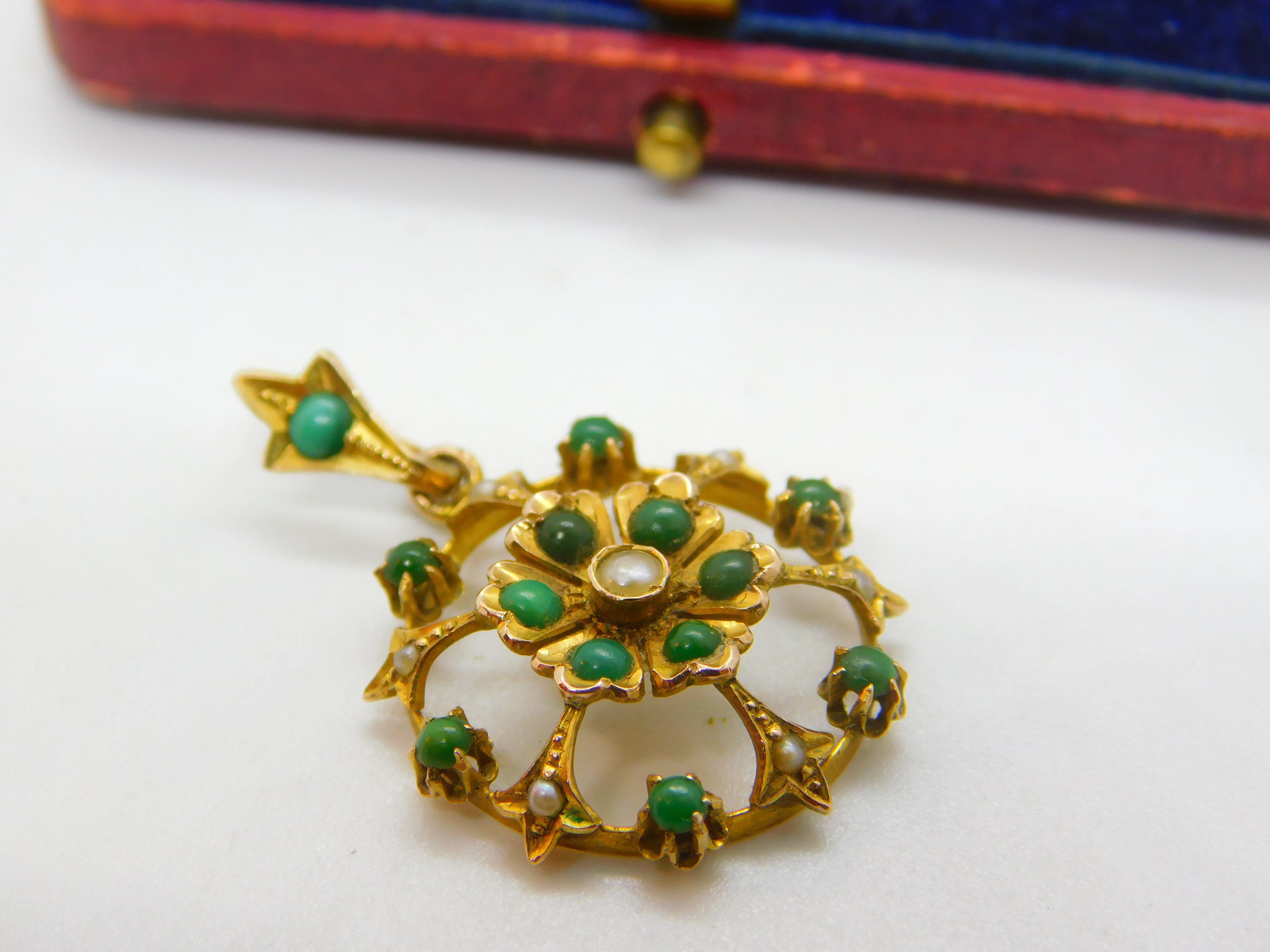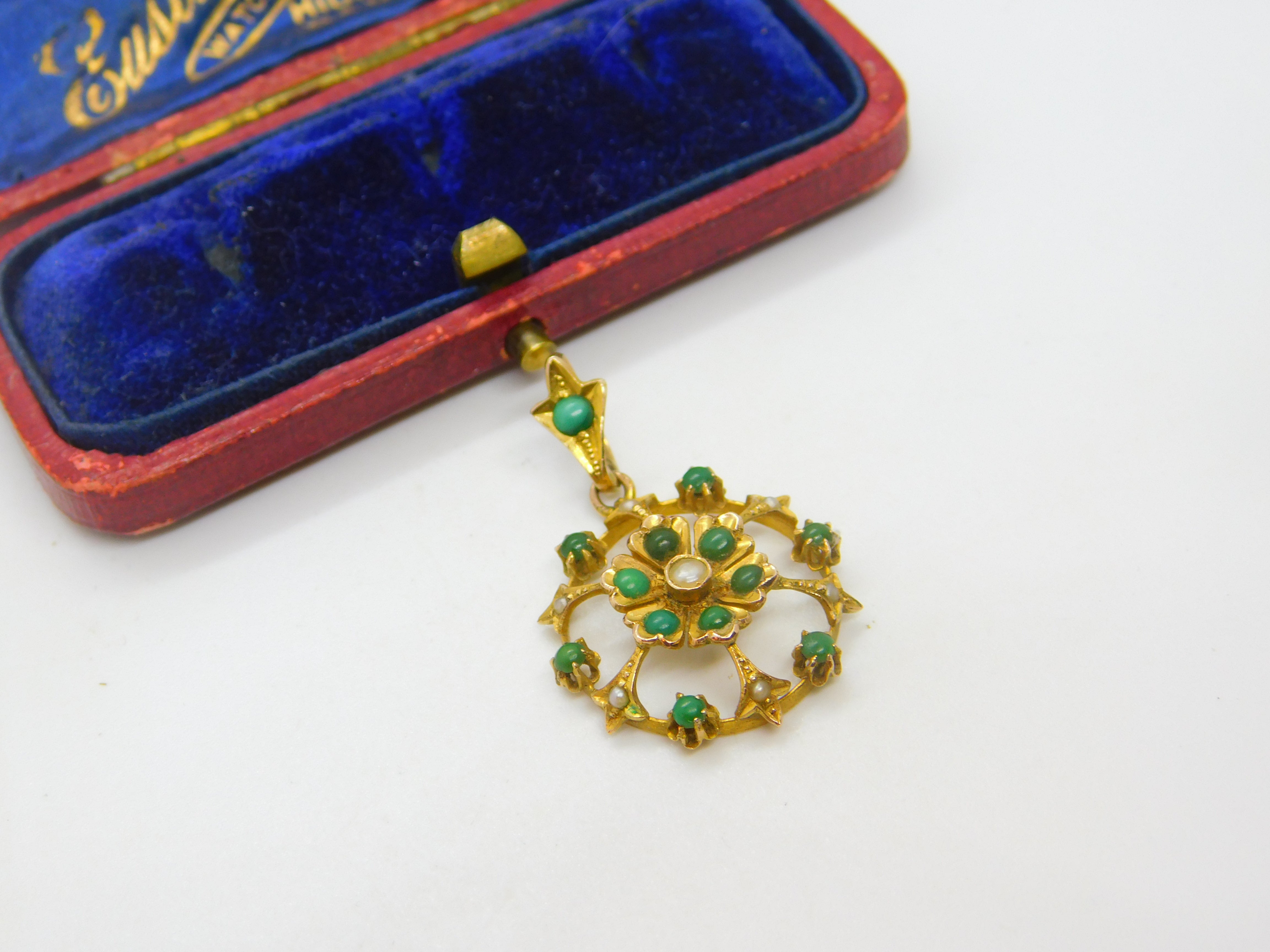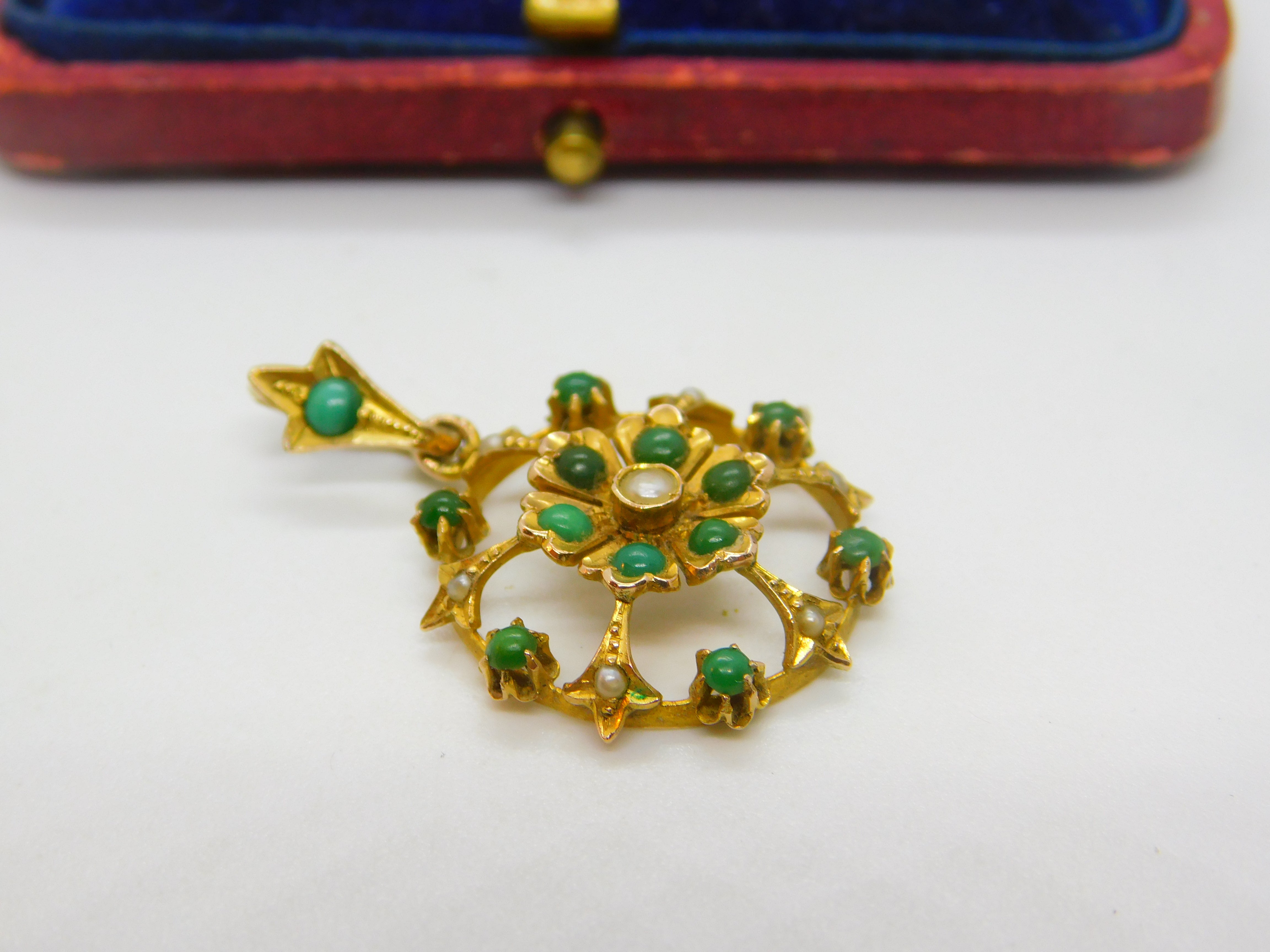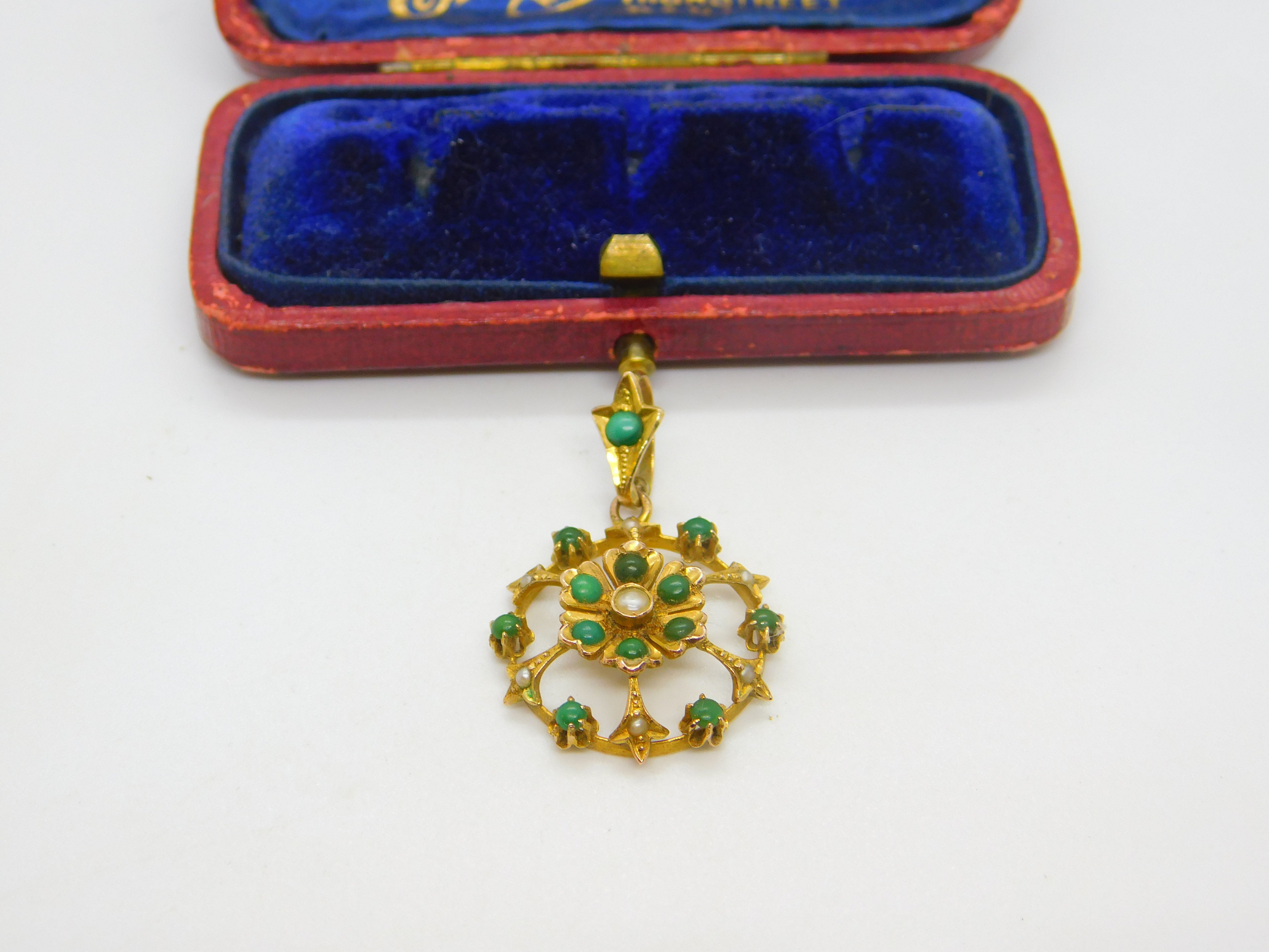 Details: A fantastic and wonderfully designed antique Edwardian 9ct yellow gold floral drop pendant possibly suffragette pendant set with turquoise and seed pearl marked 9ct to the reverse c1910. This is a wonderful item that would make a perfect gift or addition to any collection. The BOX pictured is for PRESENTATION ONLY and is NOT included in the listings but used to frame the pictures unless specifically stated otherwise.