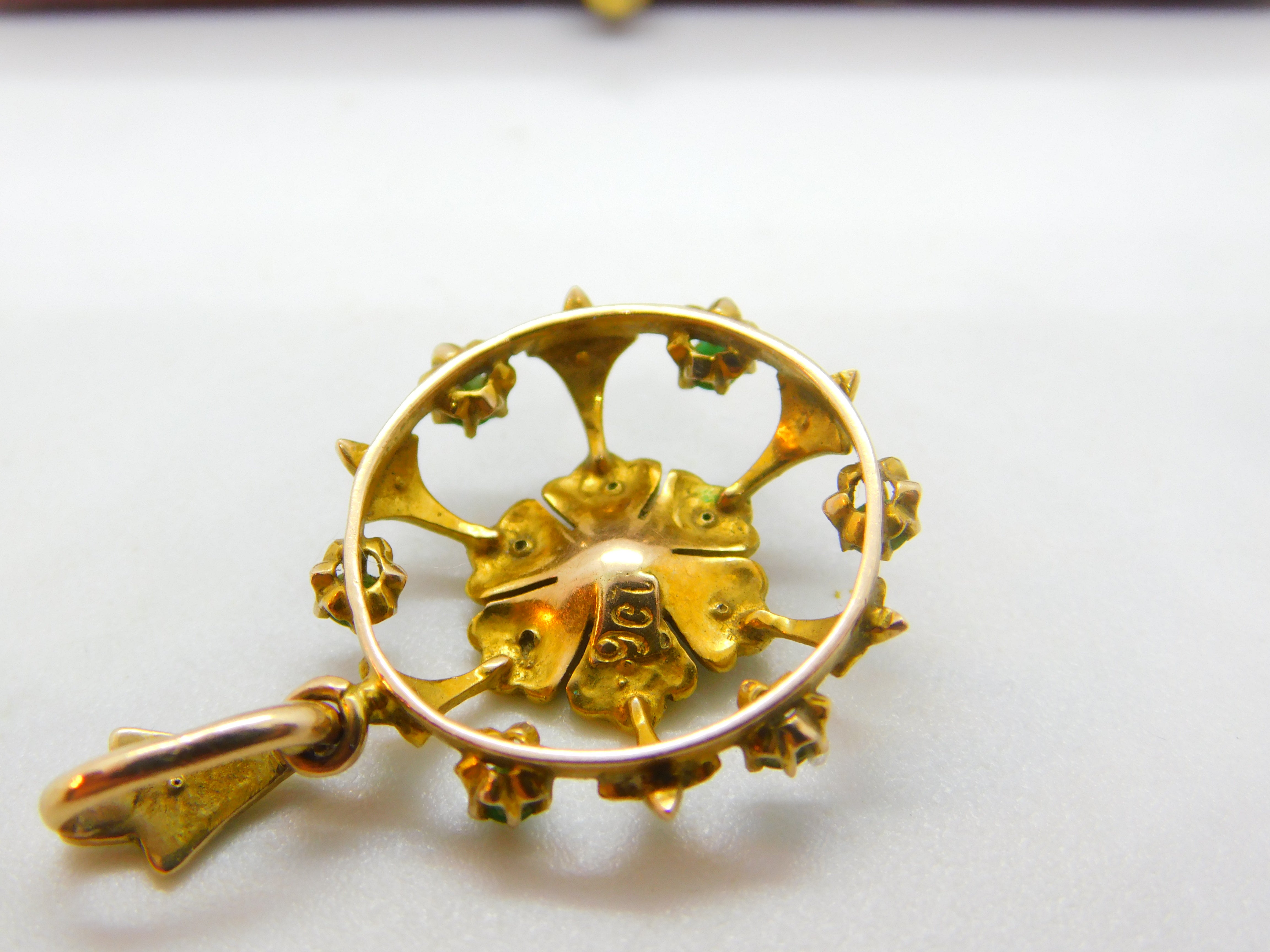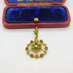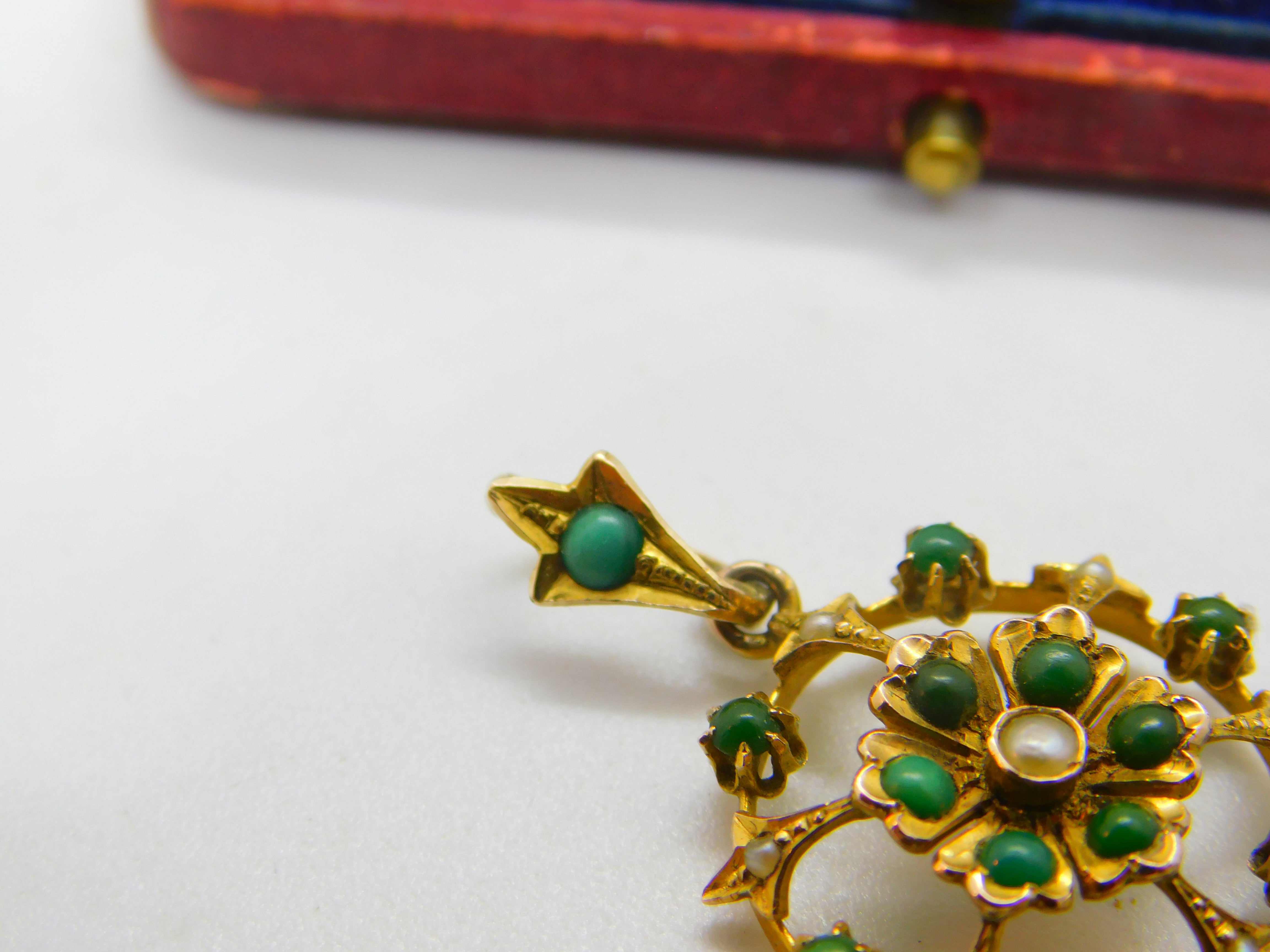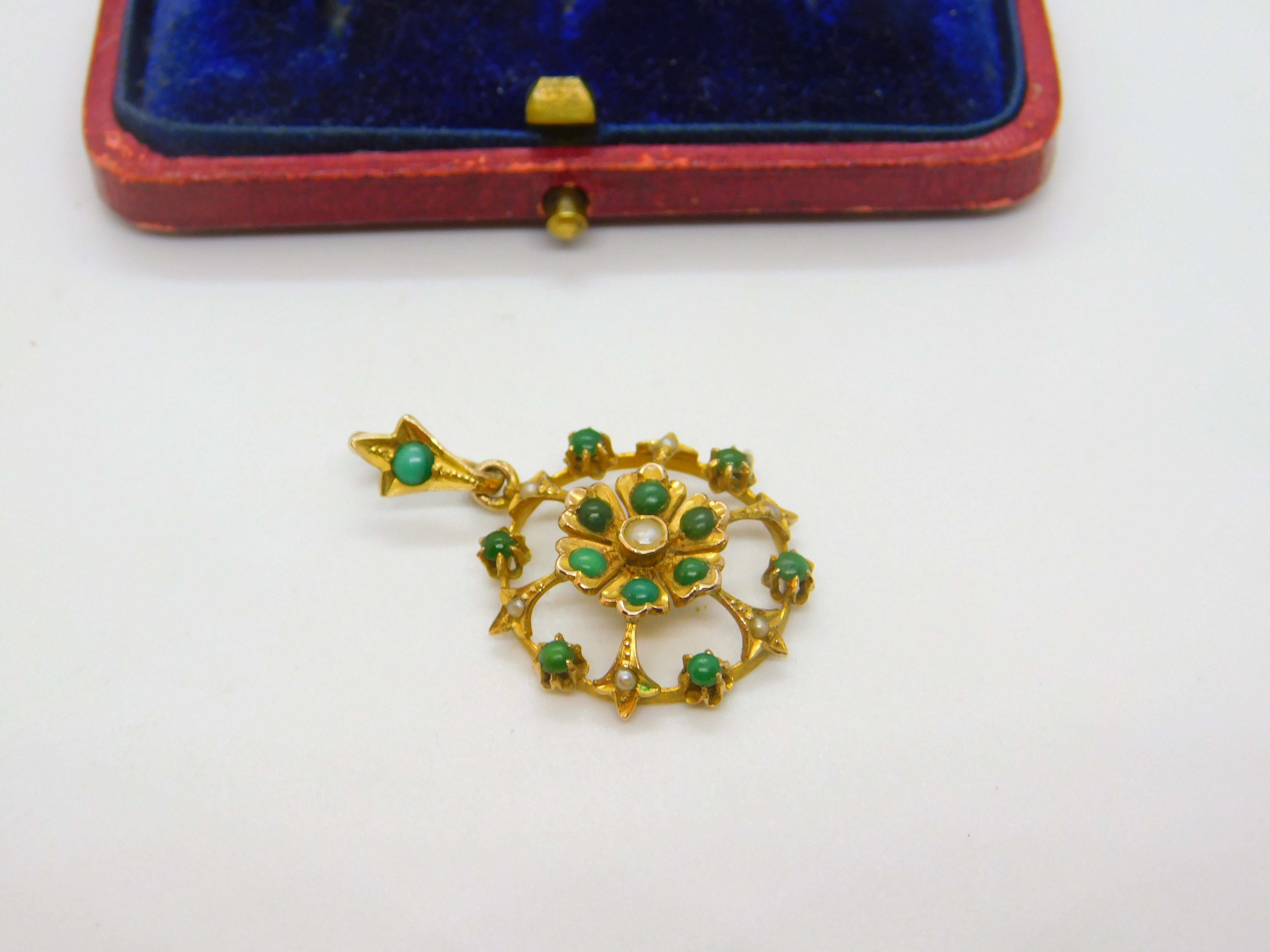 Details: A fantastic and wonderfully designed antique Edwardian 9ct yellow gold floral drop pendant possibly suffragette pendant set with turquoise and seed pearl marked 9ct to the reverse c1910. This is a wonderful item that would make a perfect gift or addition to any collection. The BOX pictured is for PRESENTATION ONLY and is NOT included in the listings but used to frame the pictures unless specifically stated otherwise.