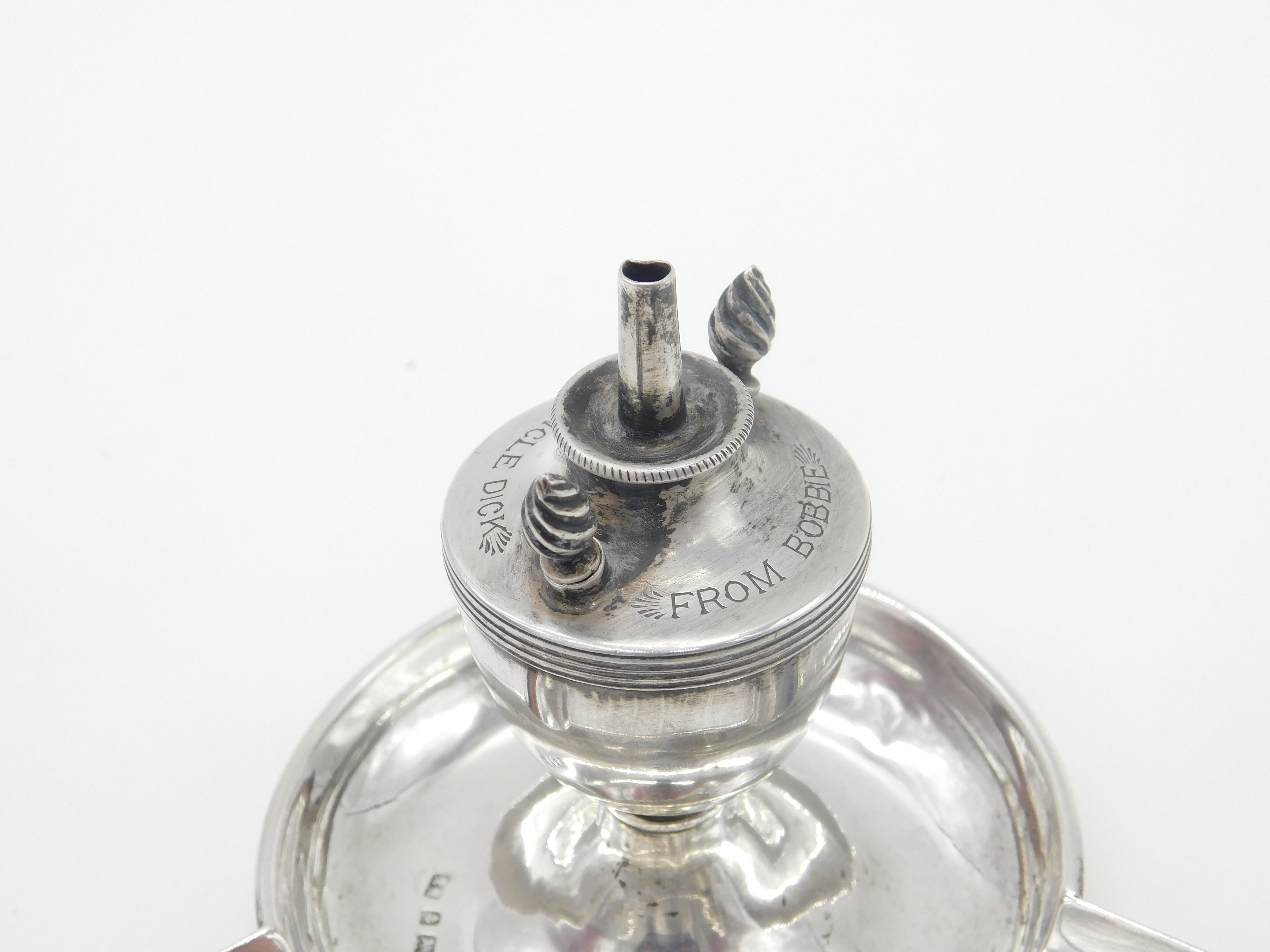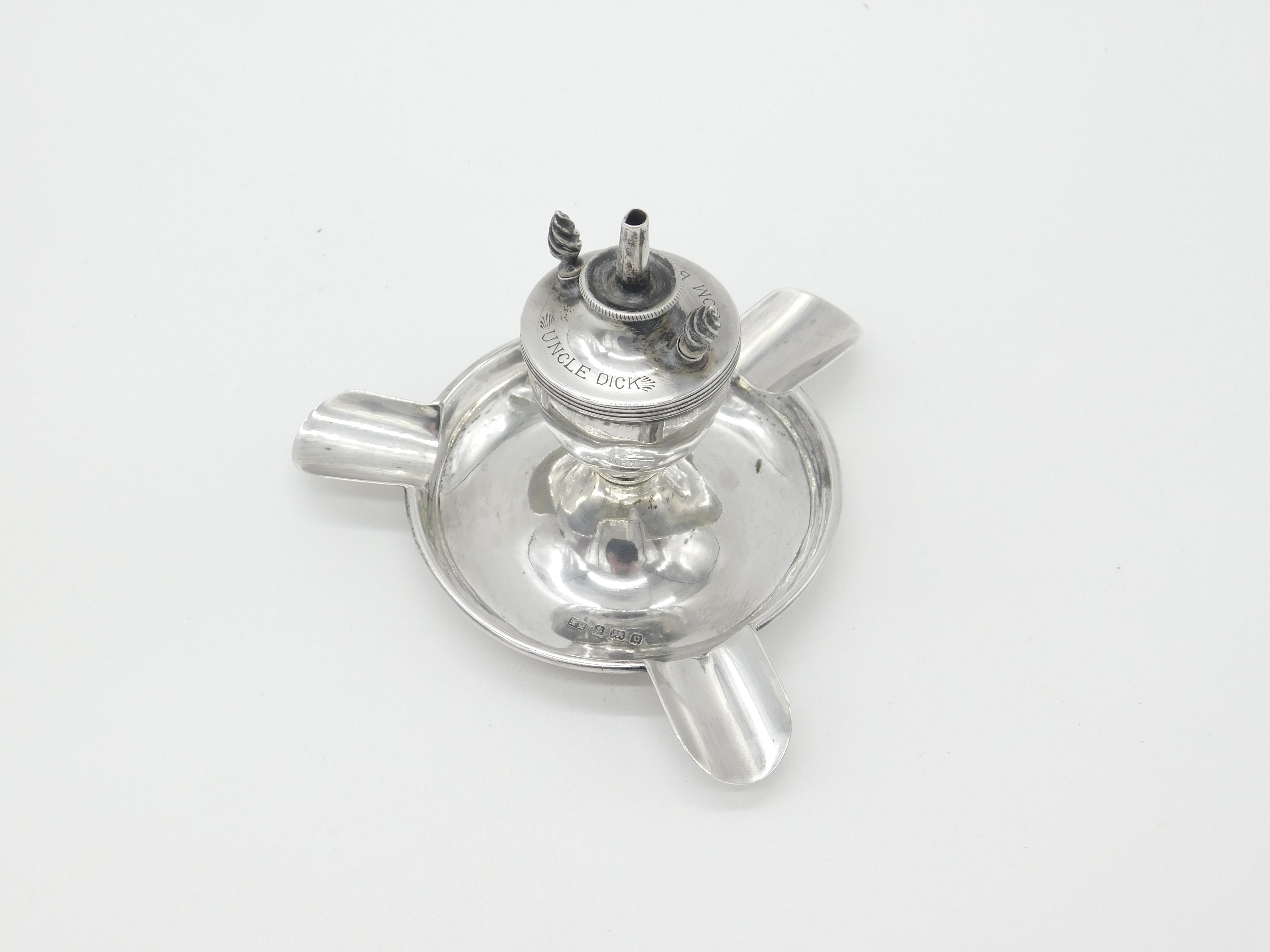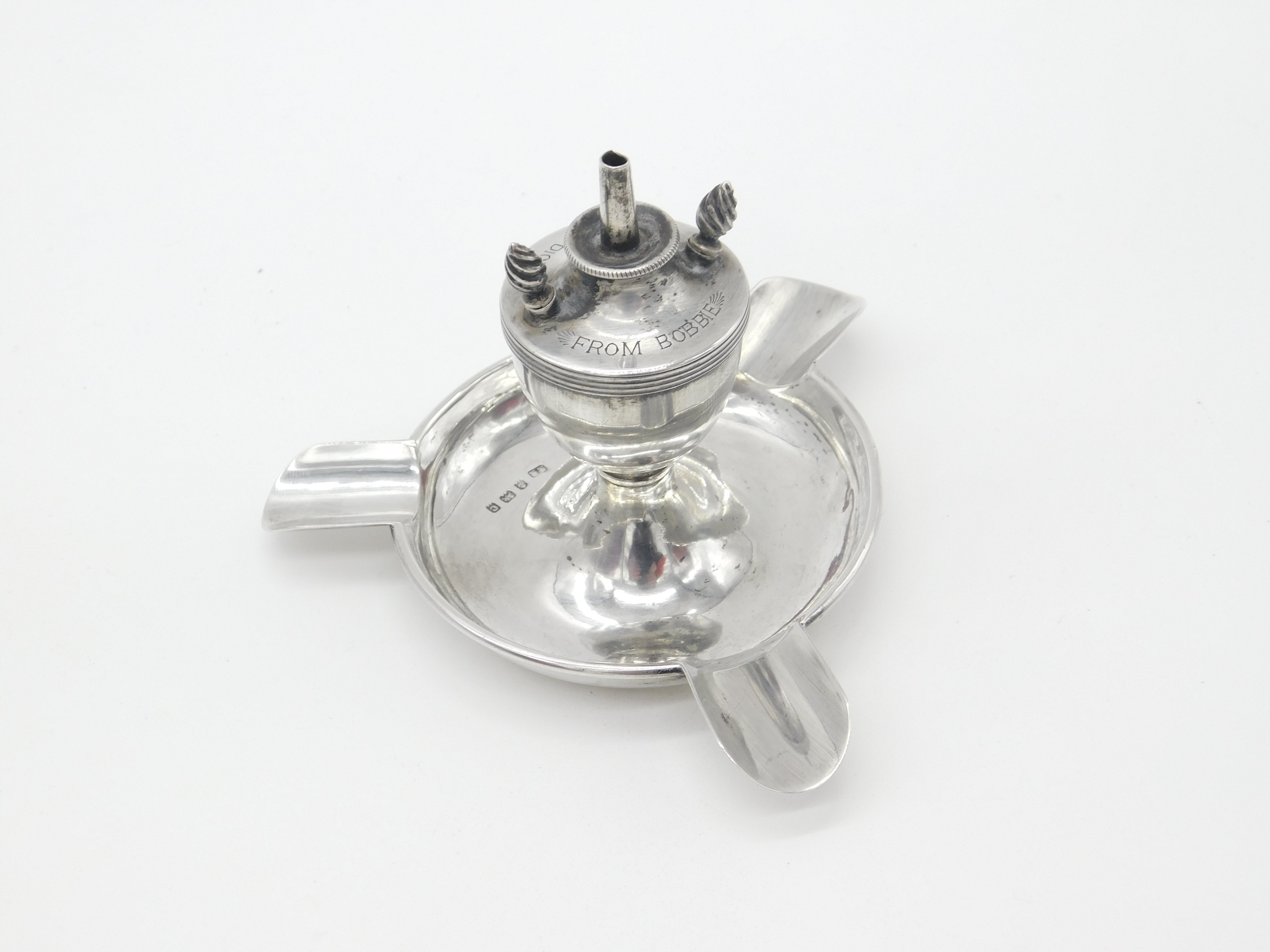 Details: A fantastic and wonderfully designed antique Edwardian sterling silver table or cigar lighter with ashtray formed with three areas for cigarettes hallmarked Birmingham 1902. Engraved Uncle Dick from Bobby to the top and a lovely example. The two wick prongs are slightly bent but generally good. This is a wonderful item that would make a perfect gift or addition to any collection. The BOX pictured is for PRESENTATION ONLY and is NOT included in the listings but used to frame the pictures unless specifically stated otherwise.