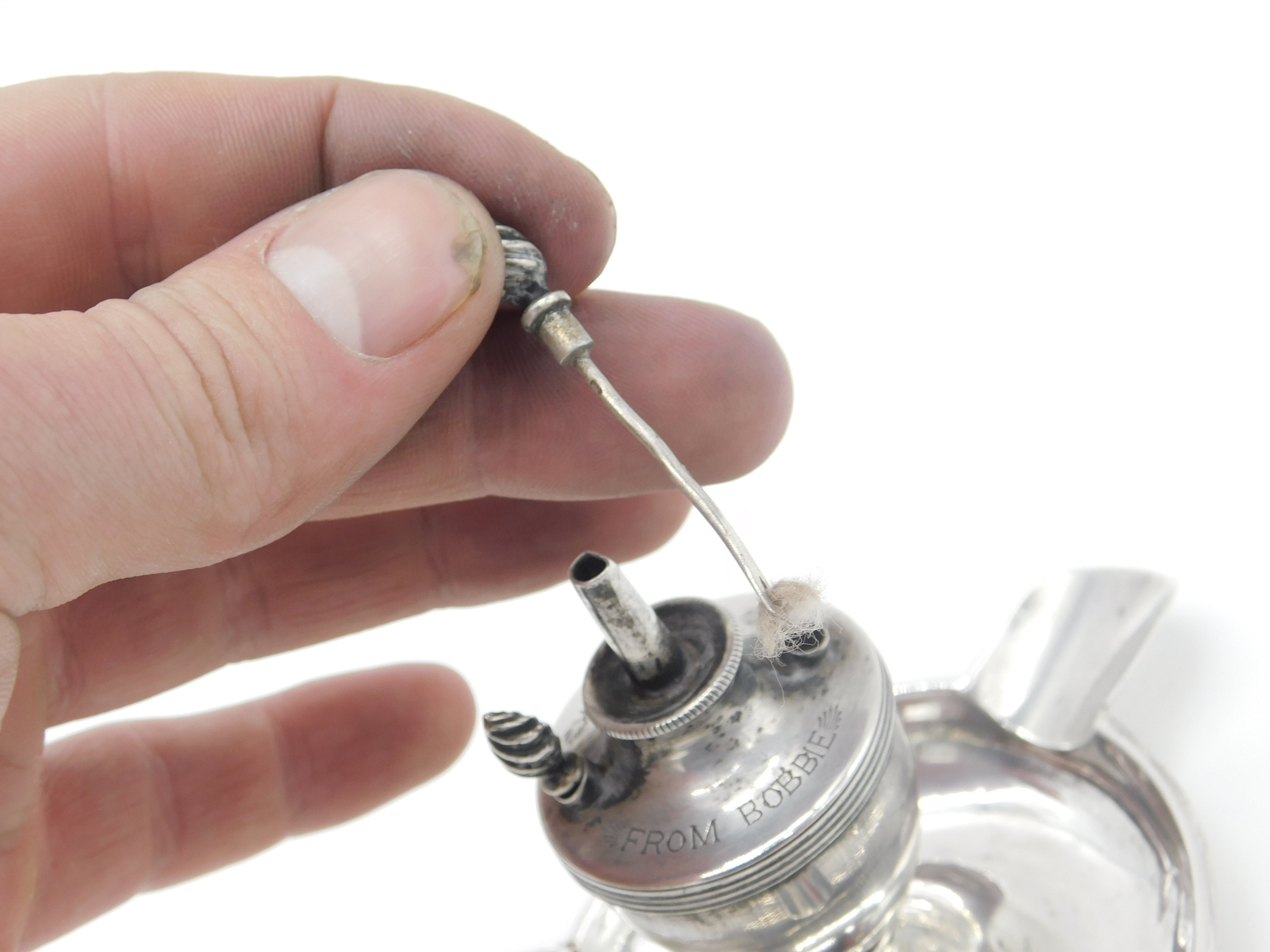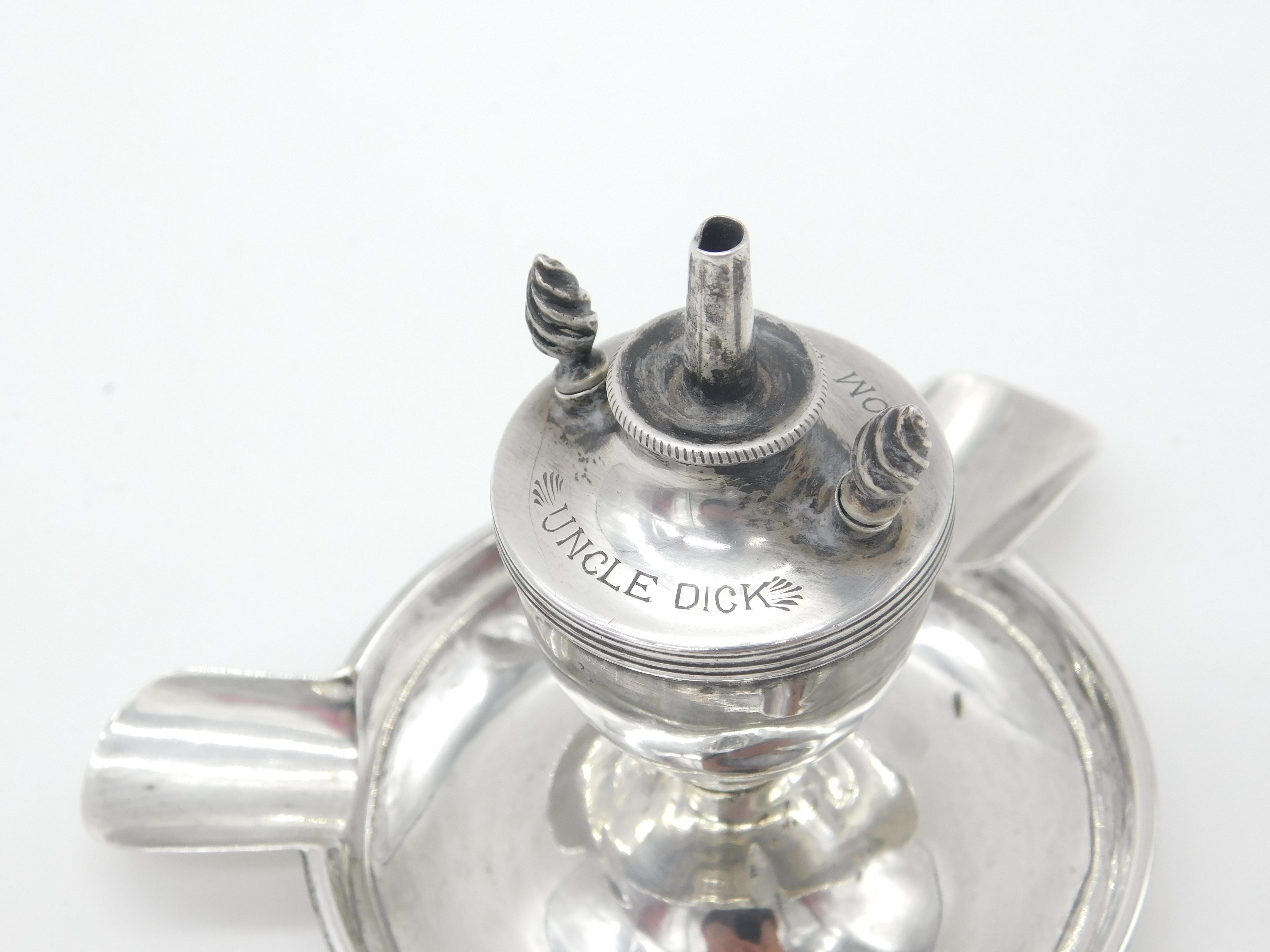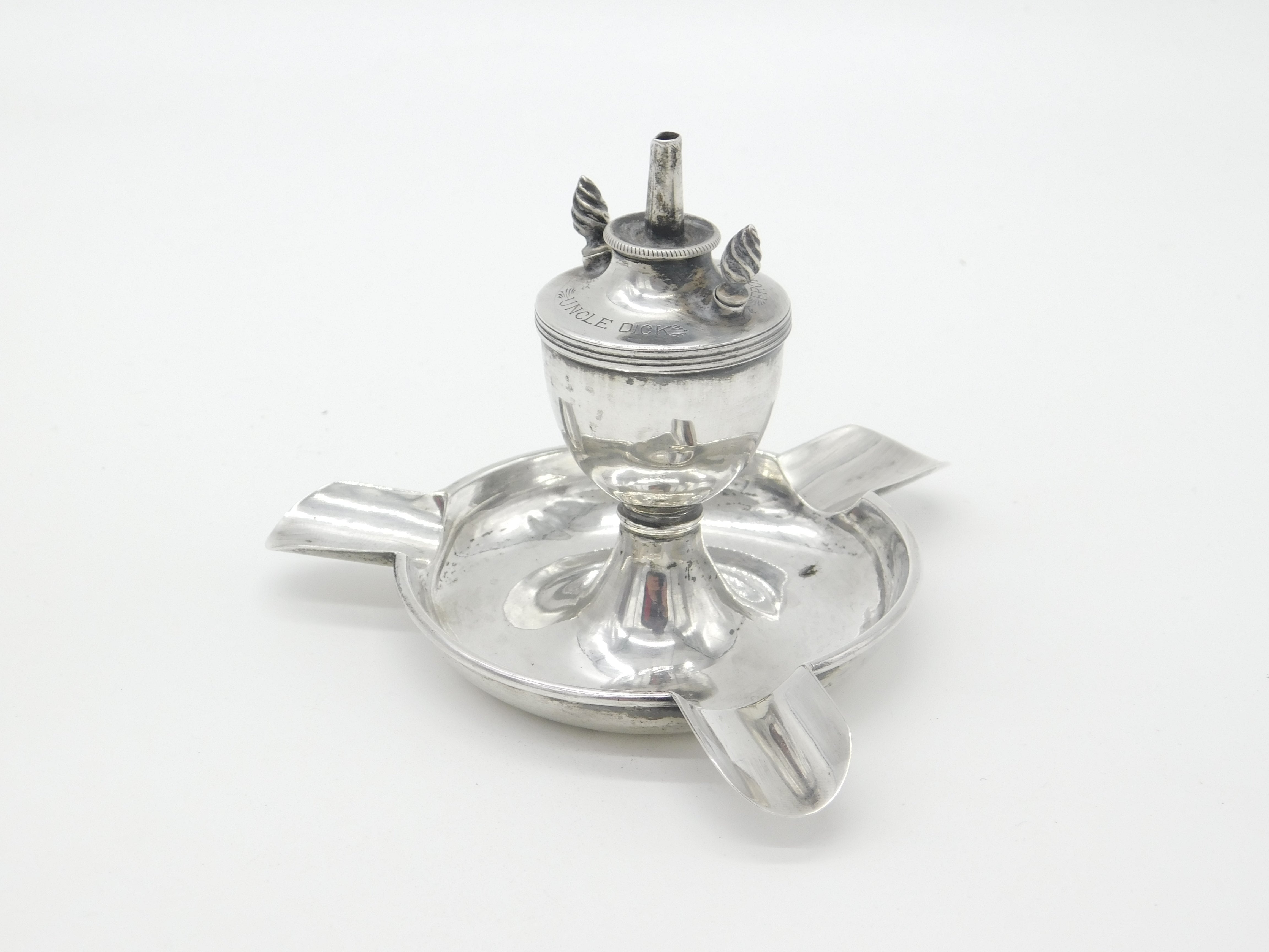 Details: A fantastic and wonderfully designed antique Edwardian sterling silver table or cigar lighter with ashtray formed with three areas for cigarettes hallmarked Birmingham 1902. Engraved Uncle Dick from Bobby to the top and a lovely example. The two wick prongs are slightly bent but generally good. This is a wonderful item that would make a perfect gift or addition to any collection. The BOX pictured is for PRESENTATION ONLY and is NOT included in the listings but used to frame the pictures unless specifically stated otherwise.