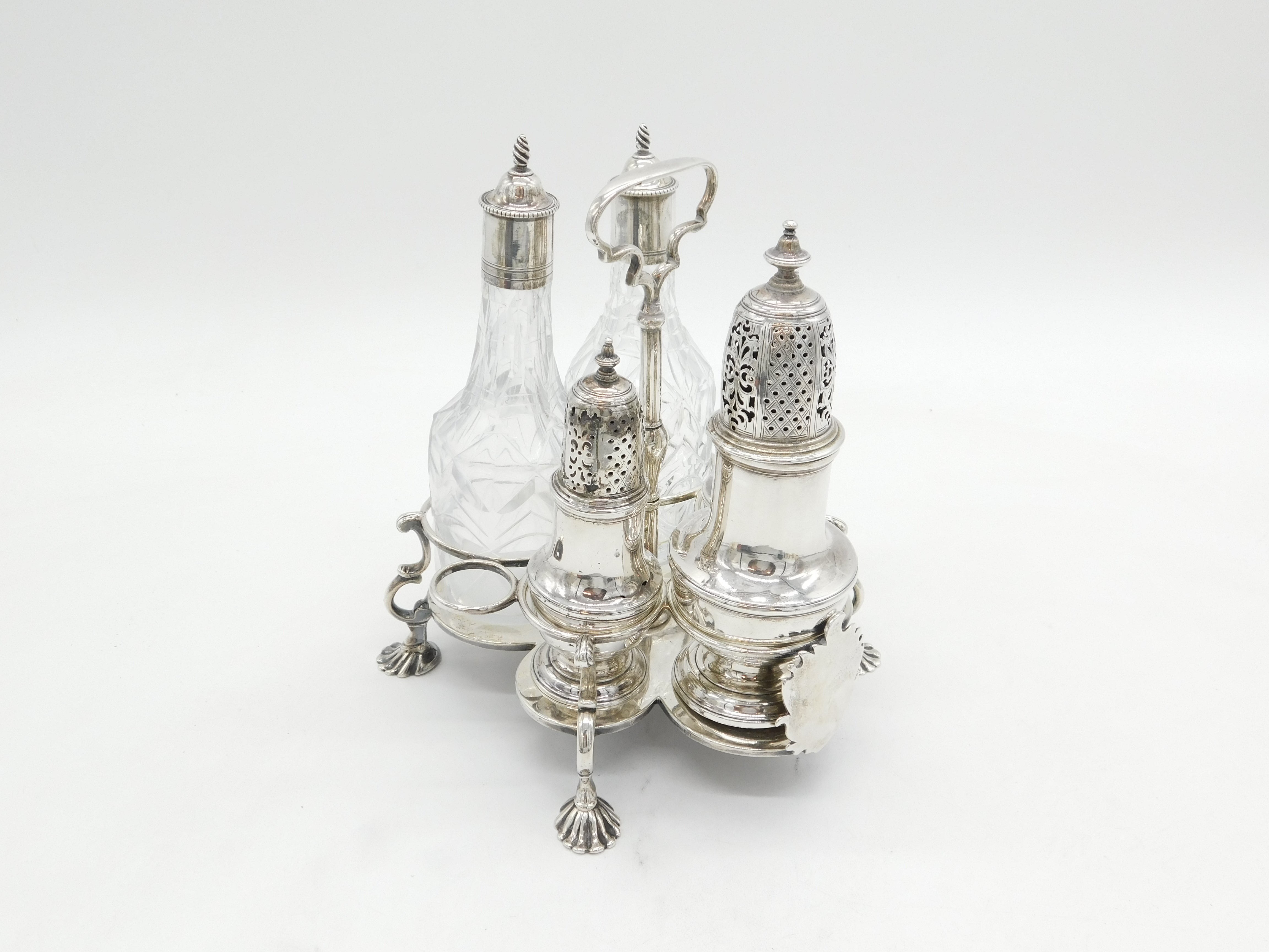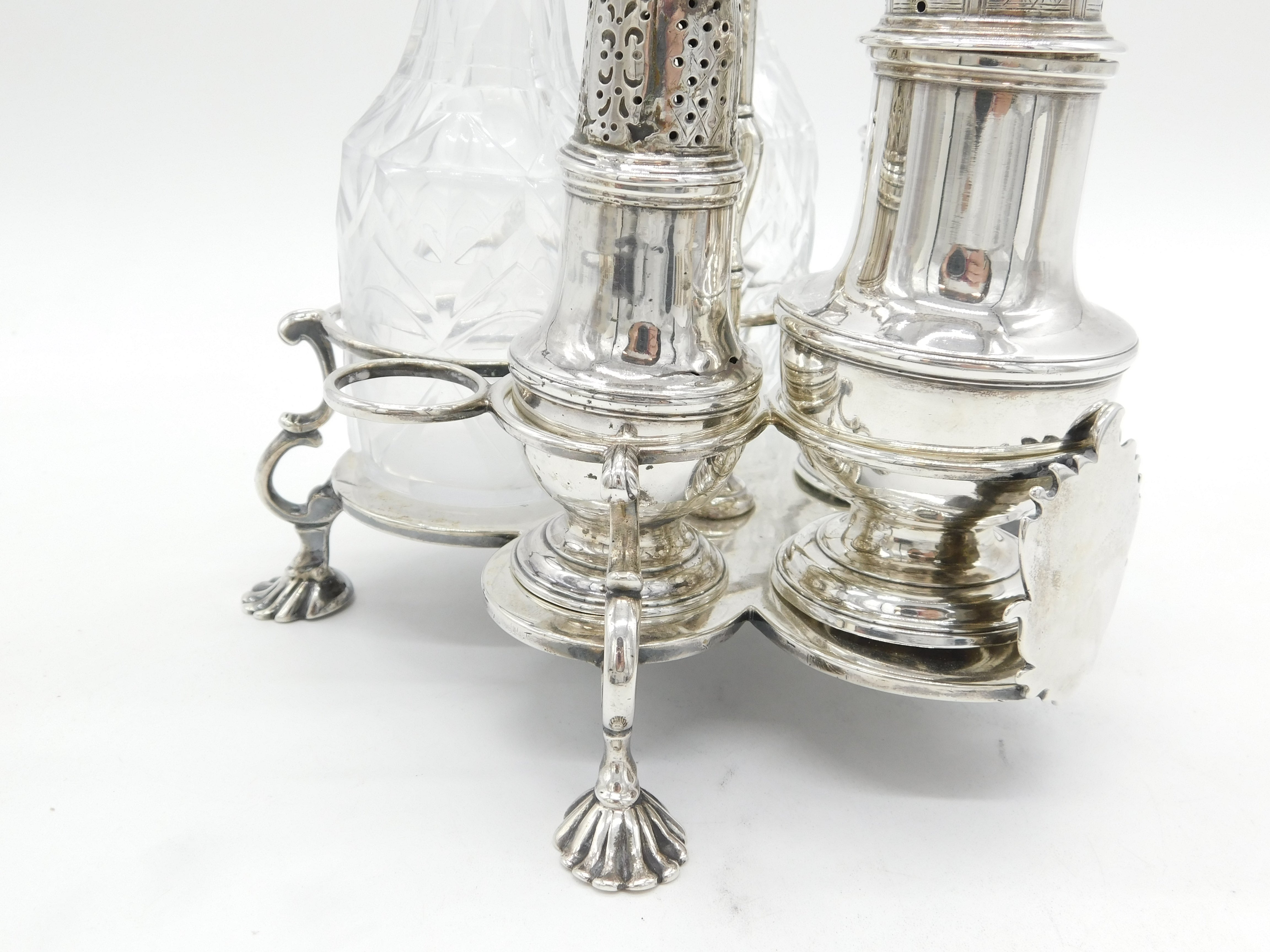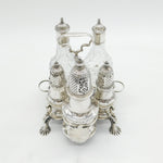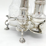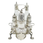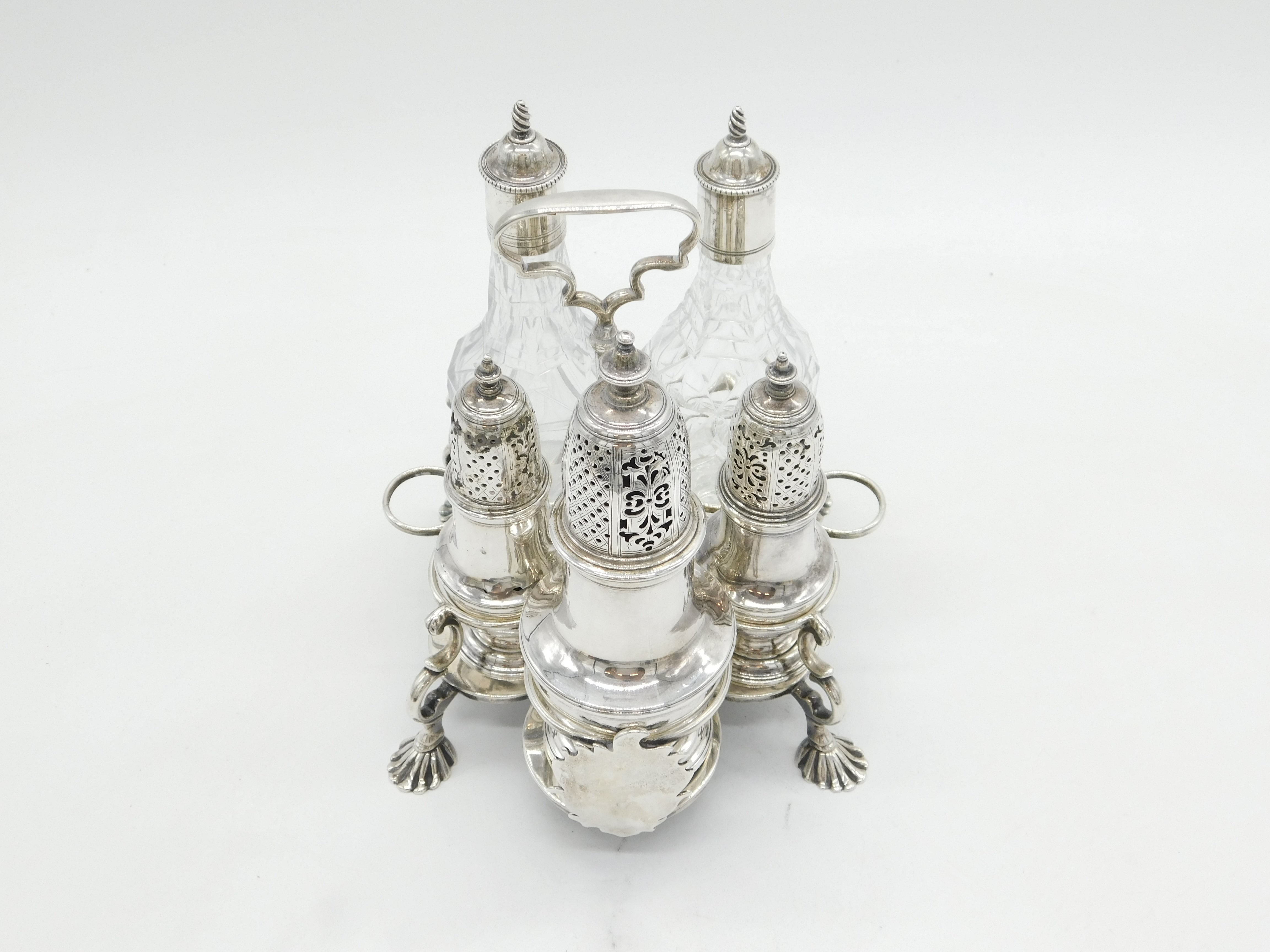 Details: A fantastic and wonderfully designed antique early-Georgian sterling silver complete five-piece cruet set on paw foot stand to include two sterling silver topped cut glass sauce bottles and three further muffineer casters all hallmarked to the bases (the large caster is hallmarked London 1744, while the others are matched), the base of the stand is hallmarked London 1751 by Jabez Daniell. This is a wonderful item that would make a perfect gift or addition to any collection.
