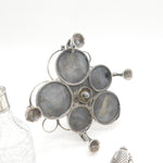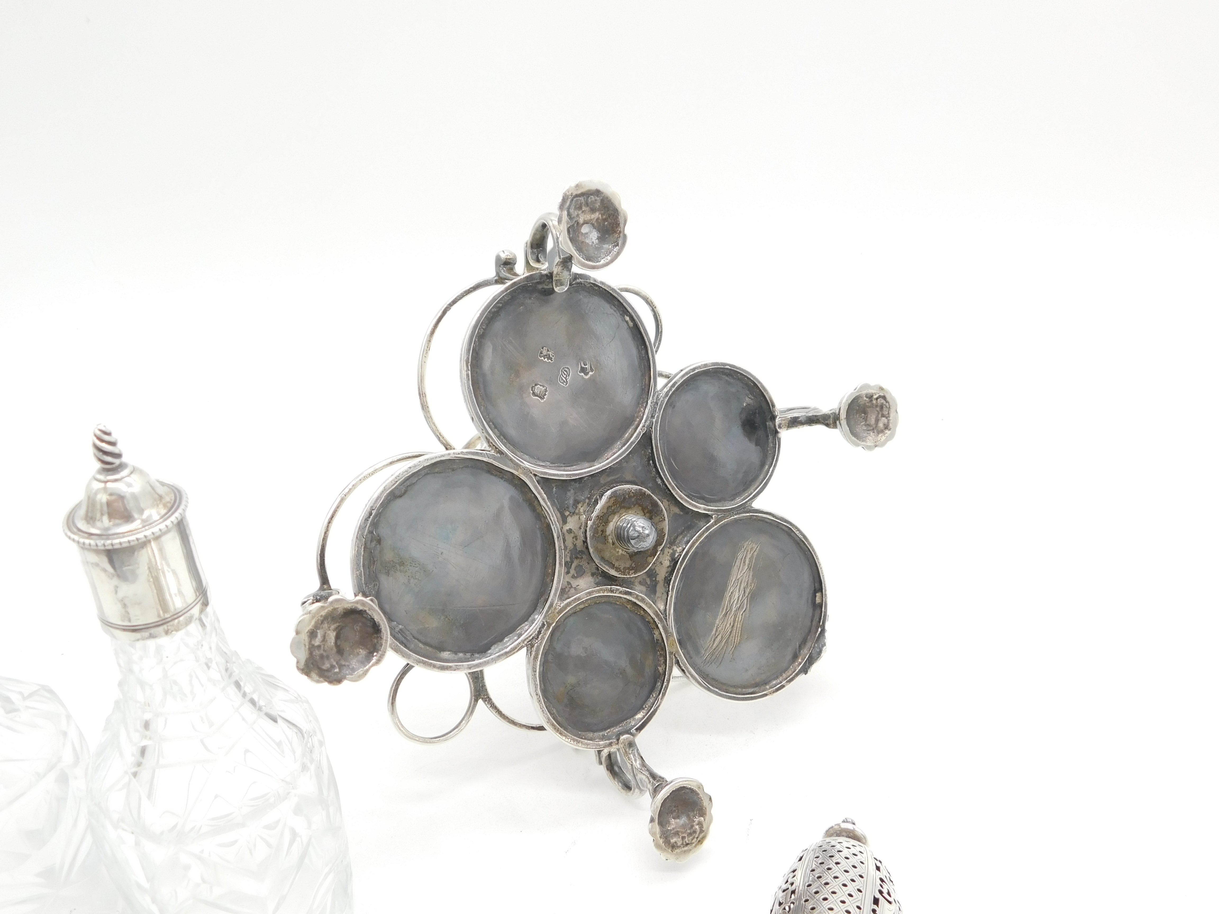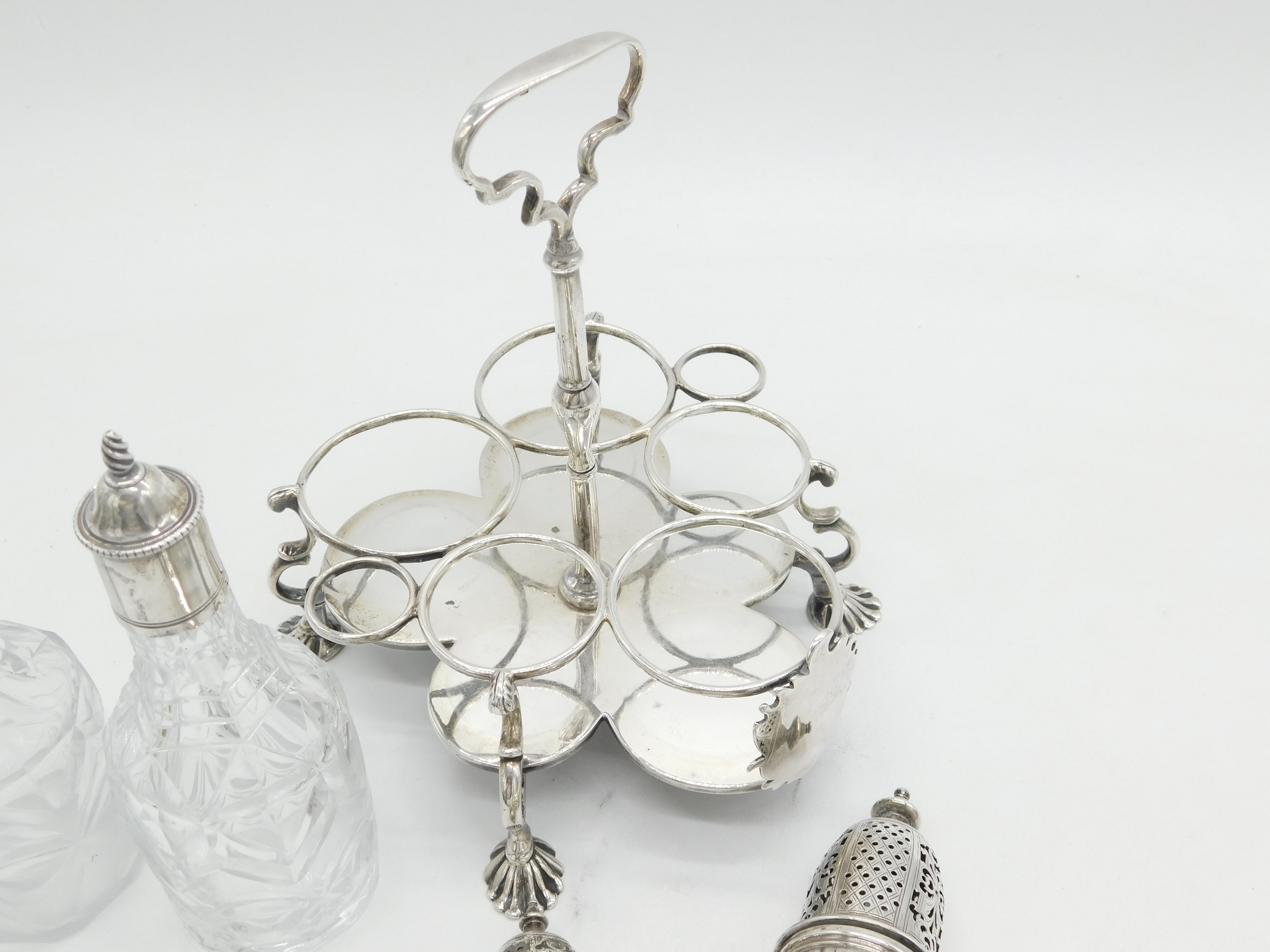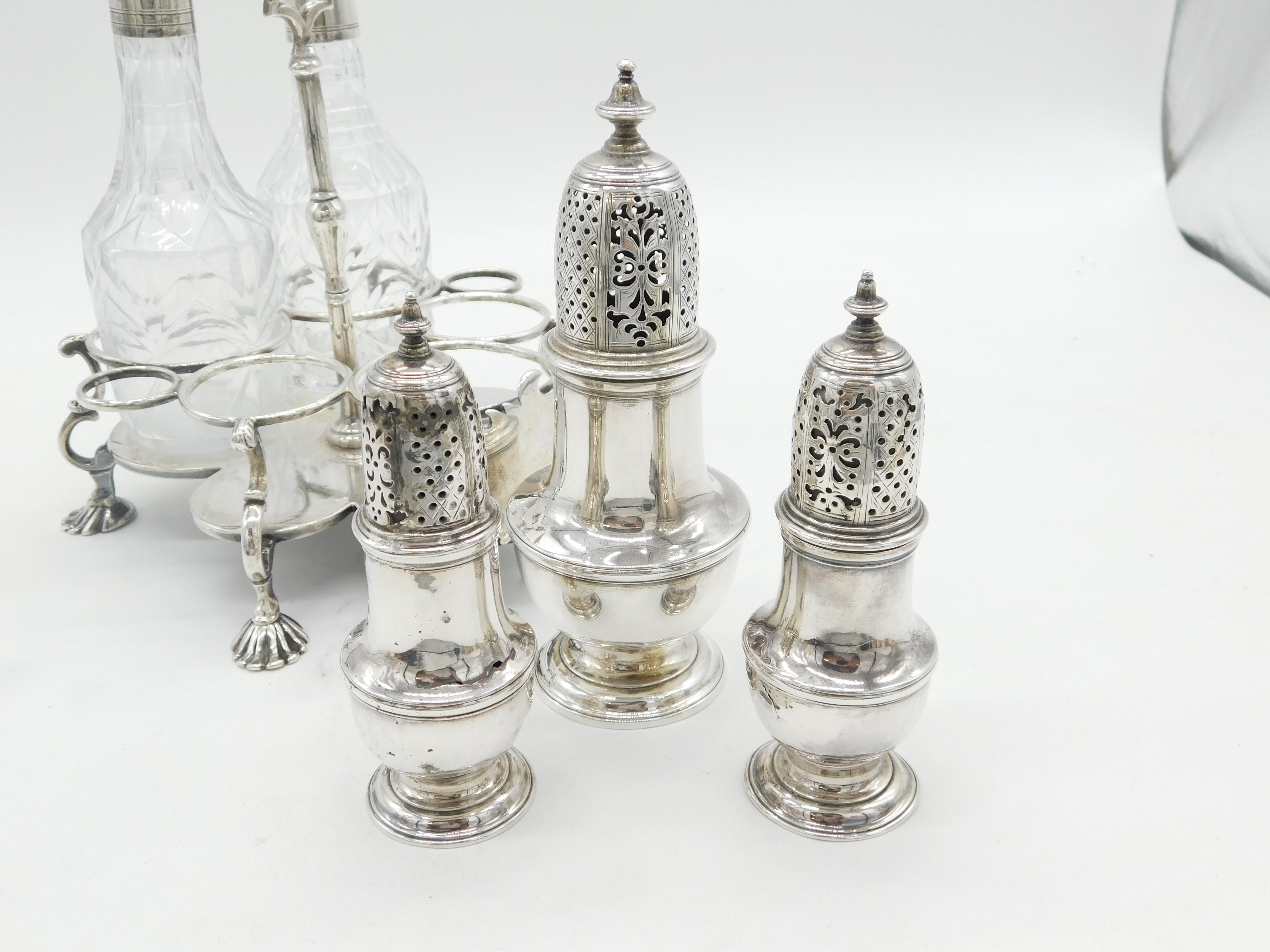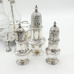 Details: A fantastic and wonderfully designed antique early-Georgian sterling silver complete five-piece cruet set on paw foot stand to include two sterling silver topped cut glass sauce bottles and three further muffineer casters all hallmarked to the bases (the large caster is hallmarked London 1744, while the others are matched), the base of the stand is hallmarked London 1751 by Jabez Daniell. This is a wonderful item that would make a perfect gift or addition to any collection.