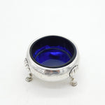 Details: A fantastic and wonderfully designed antique early-georgian sterling silver salt cellar with paw feet, original blue glass liner & floral patterns hallmarked London 1743 David Hennell I. This is a wonderful item that would make a perfect gift or addition to any collection. The BOX pictured is for PRESENTATION ONLY and is NOT included in the listings but used to frame the pictures unless specifically stated otherwise.