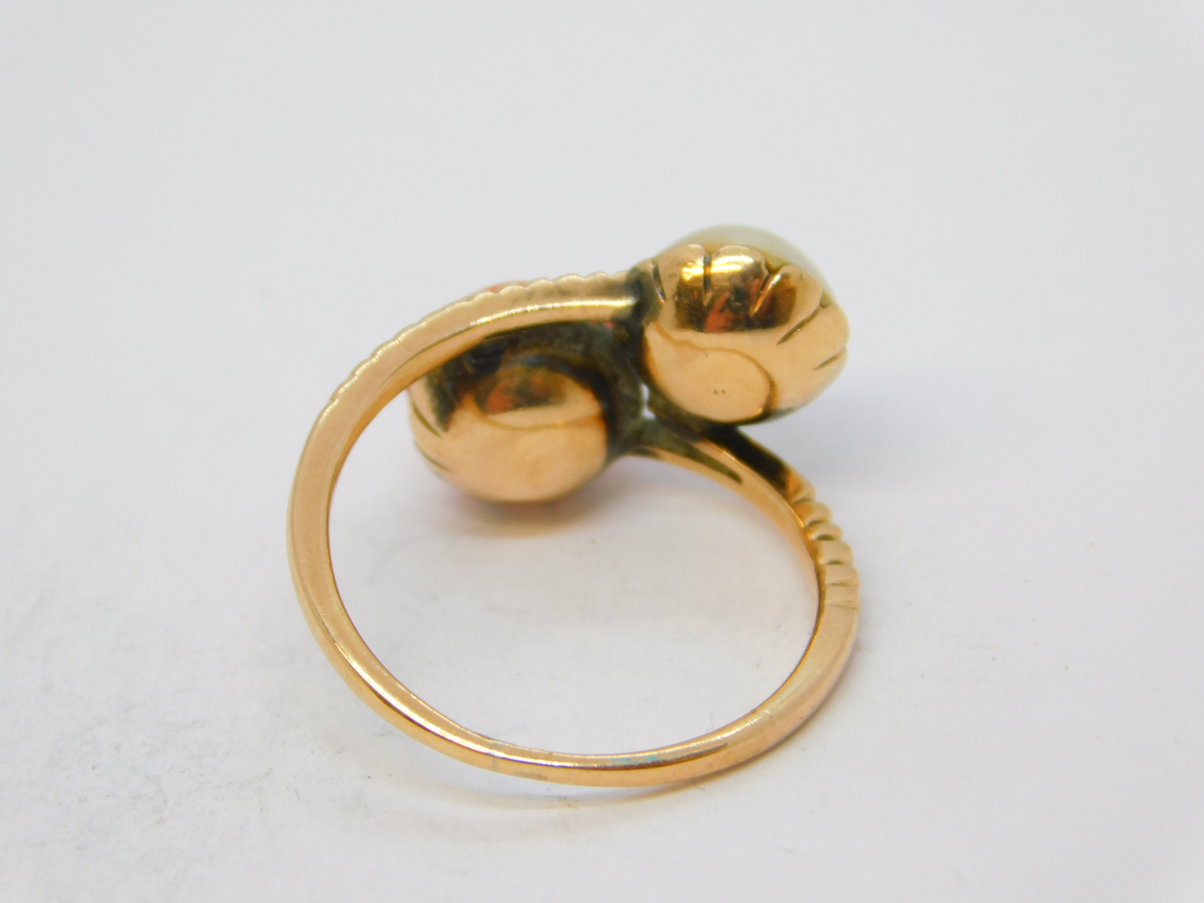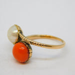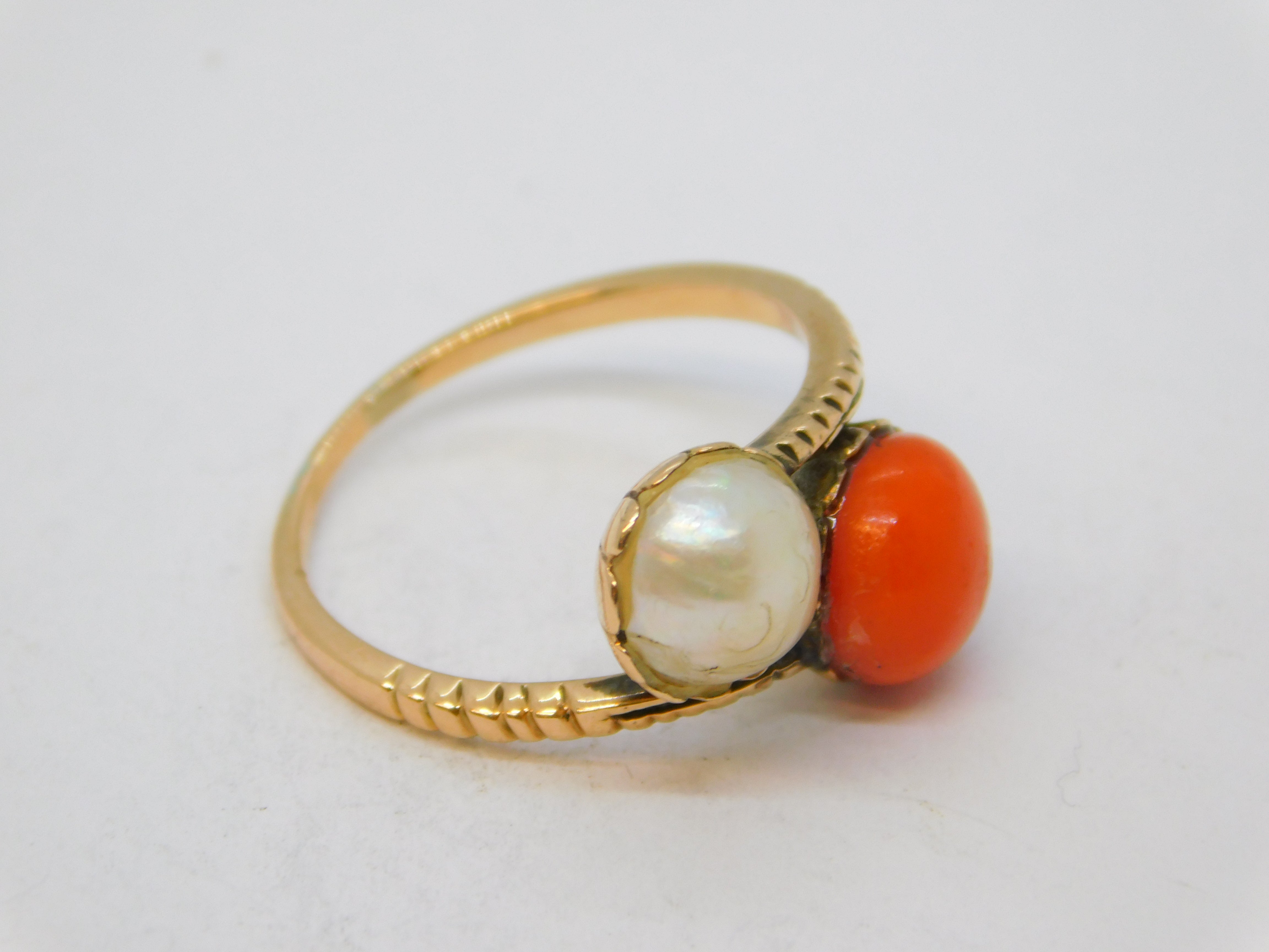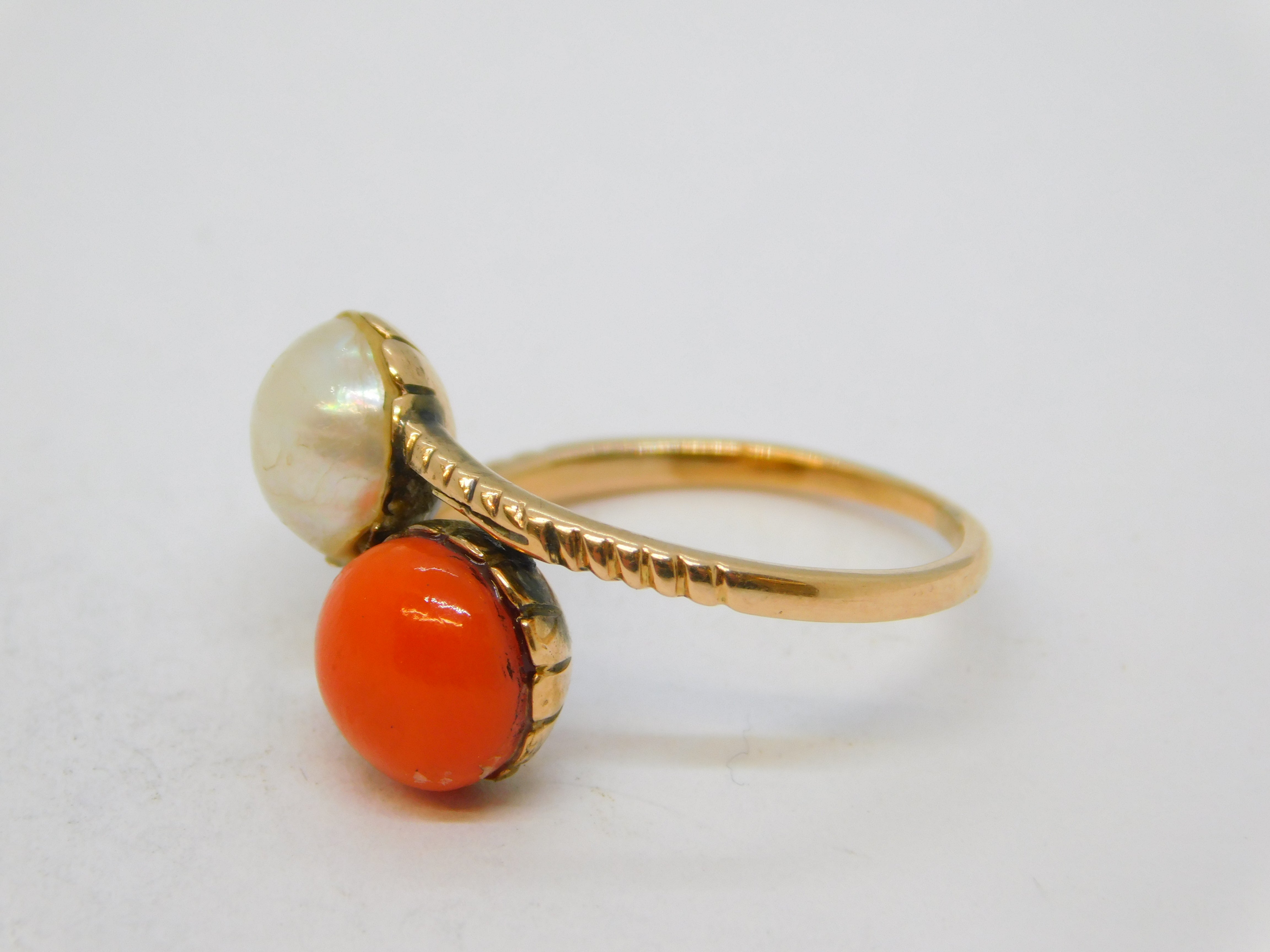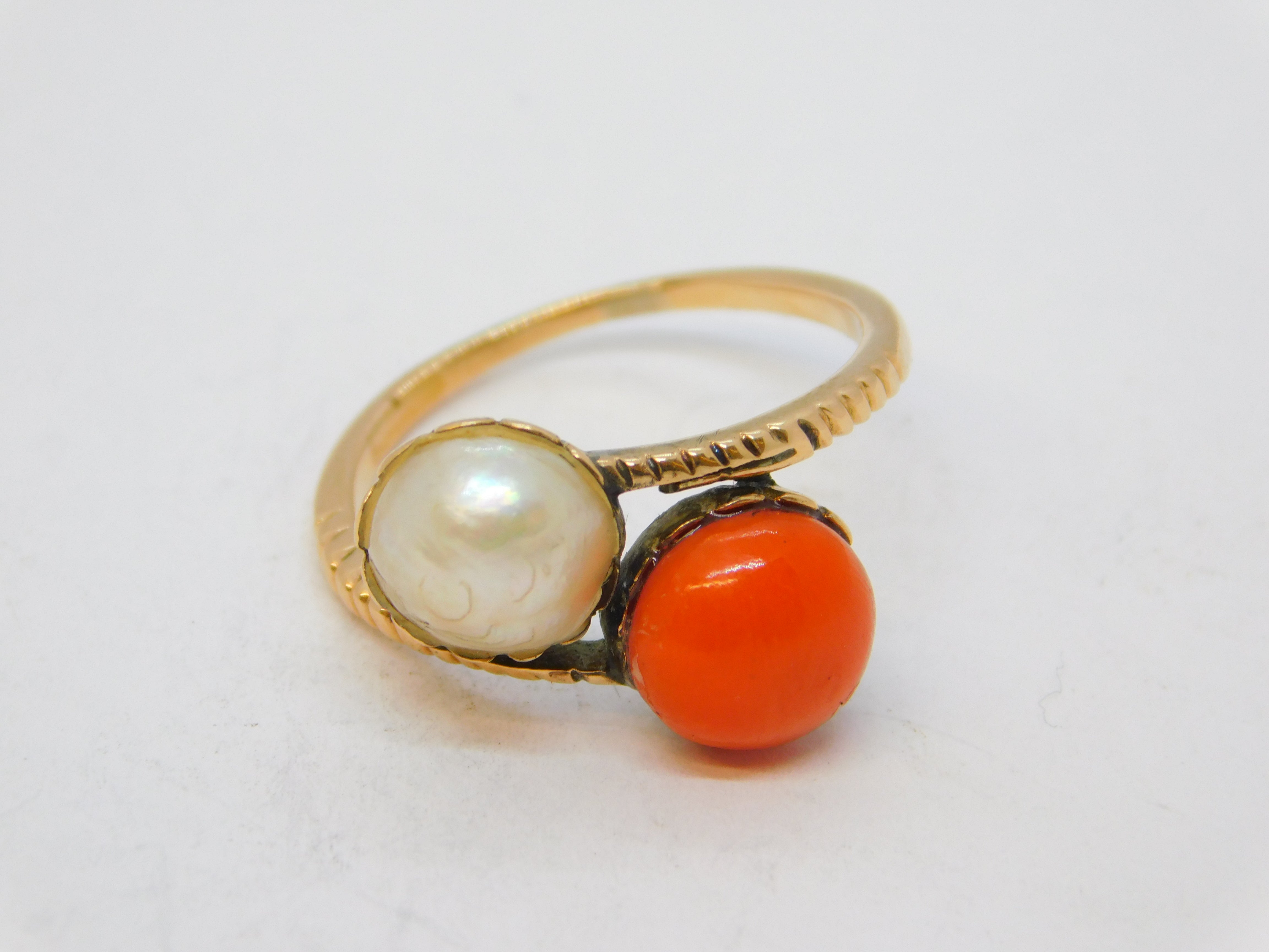 Details: A fantastic and wonderfully designed antique georgian 14ct rose gold 'toi et moi' crossover ring set with natural pearl and red coral c1820s, the gold has been XRF tested as it is unmarked, likely austro-hungarian. This is a wonderful item that would make a perfect gift or addition to any collection. We are more than happy to provide XRF reports for items upon request.