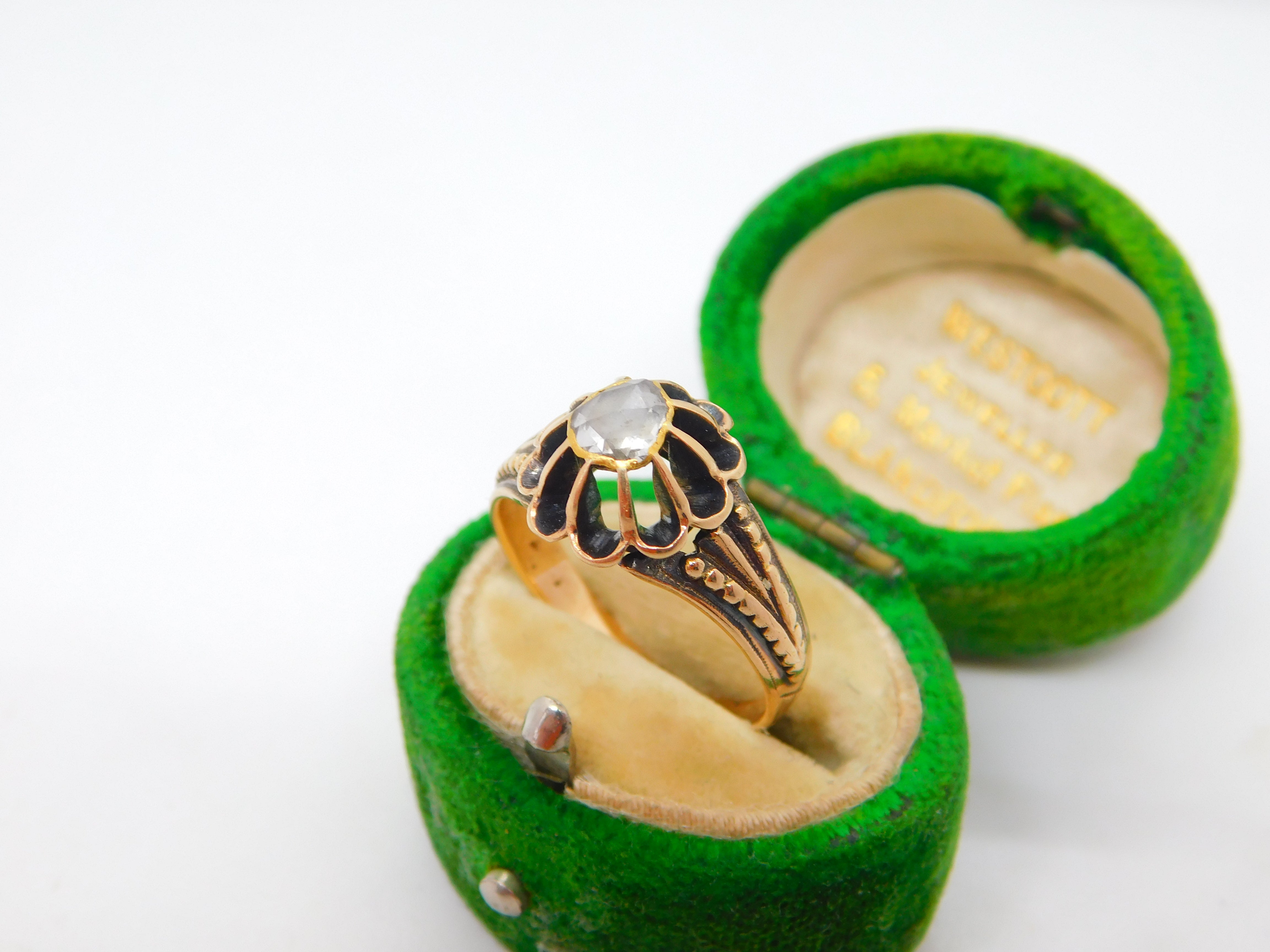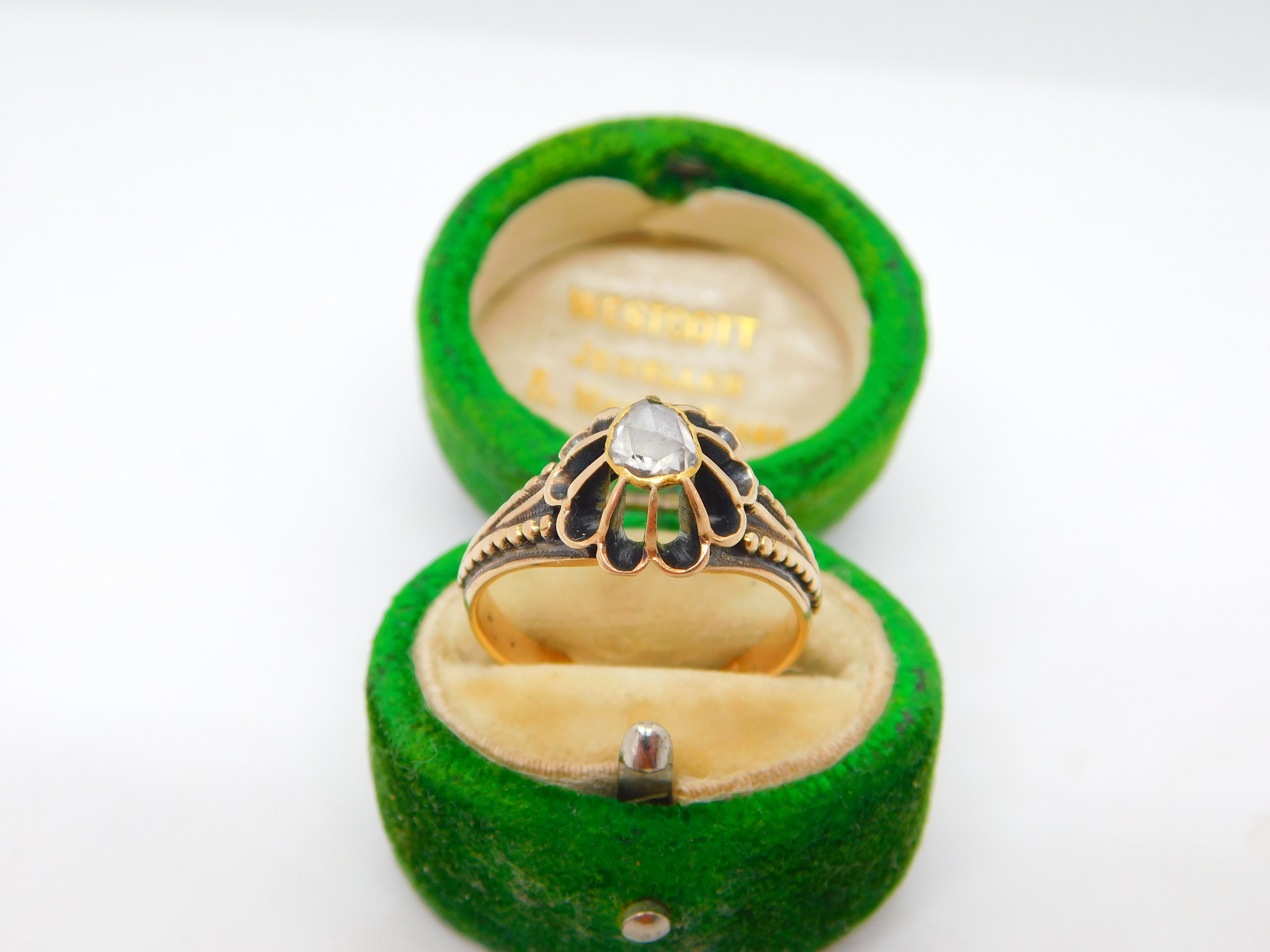 Details: A fantastic and wonderfully designed antique georgian 18ct yellow gold dress ring with lovely floral shoulders set with a central 0.5ct old-cut diamond c1820, the gold and diamond have been tested. This is a wonderful item that would make a perfect gift or addition to any collection. The BOX pictured is for PRESENTATION ONLY and is NOT included in the listings but used to frame the pictures unless specifically stated otherwise.