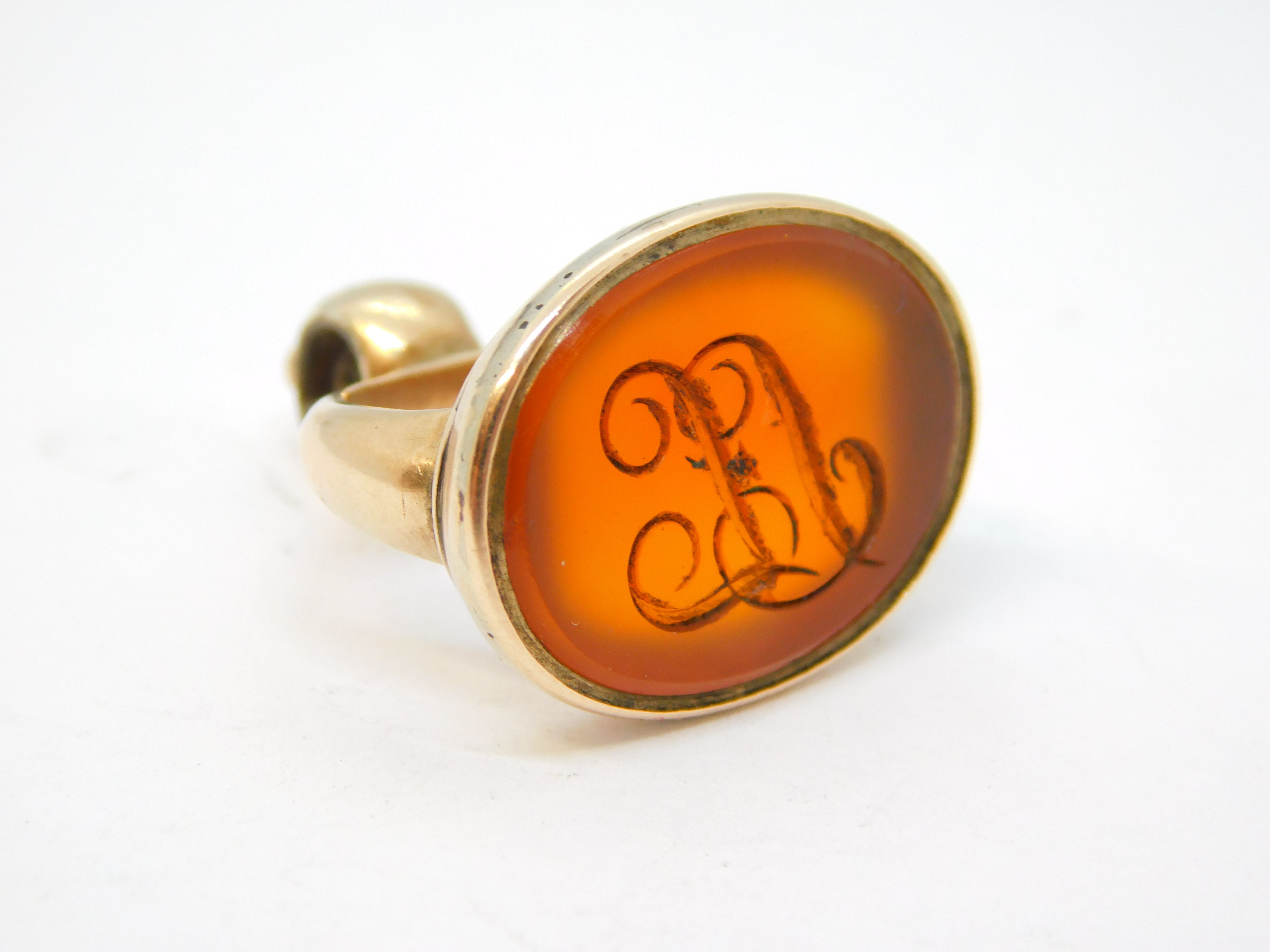 Details: A fantastic and wonderfully designed antique georgian 9ct rose gold fob seal set with carved carnelian agate base with monogram initial intaglio c1820, the gold has been XRF tested please see pictures for report. This is a wonderful item that would make a perfect gift or addition to any collection. We are more than happy to provide XRF reports for items upon request.